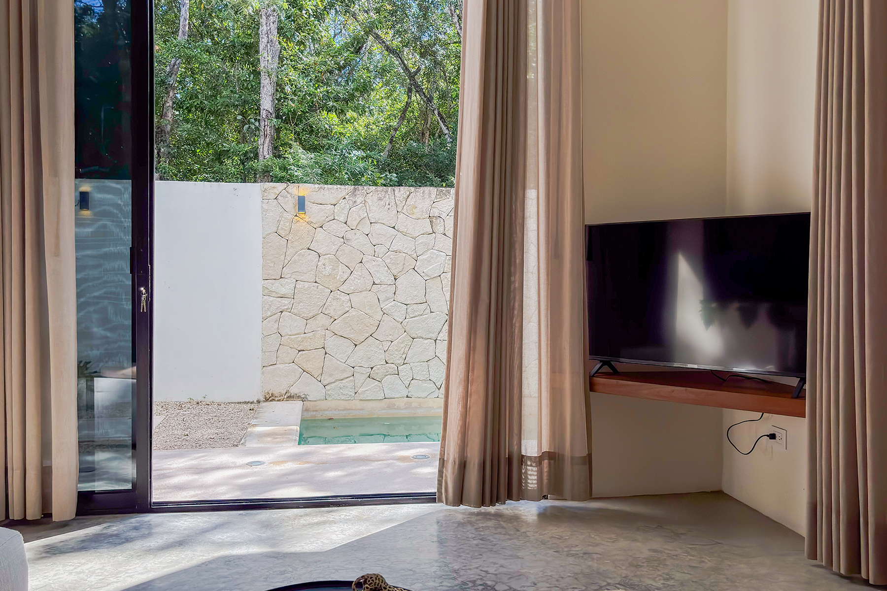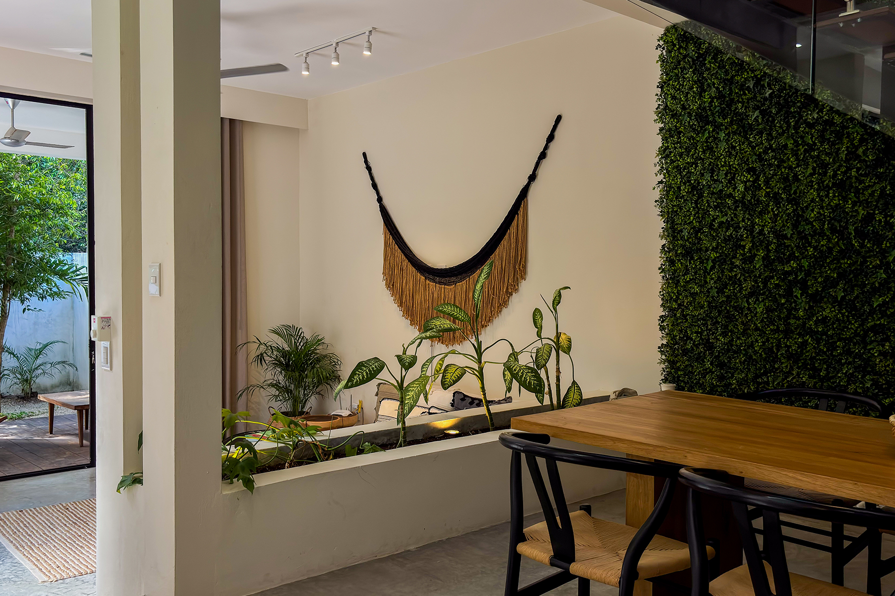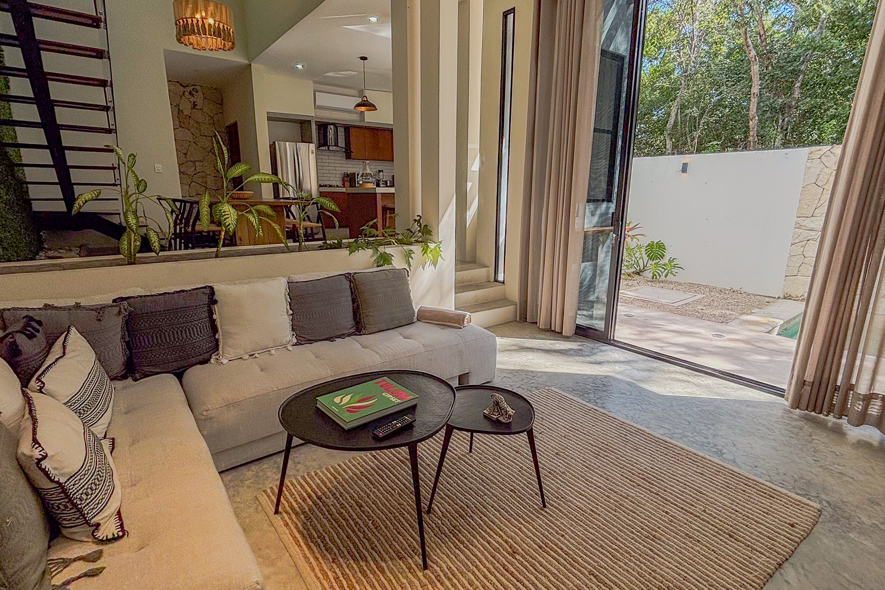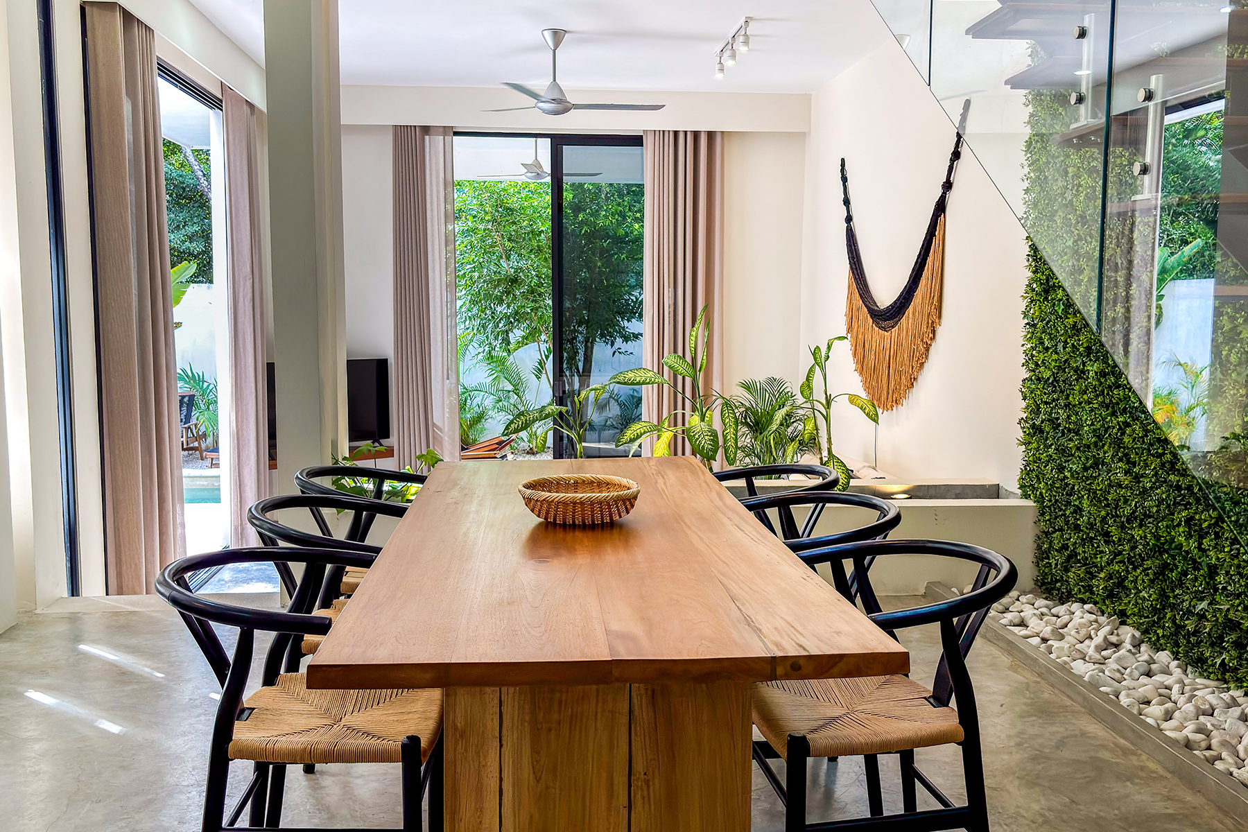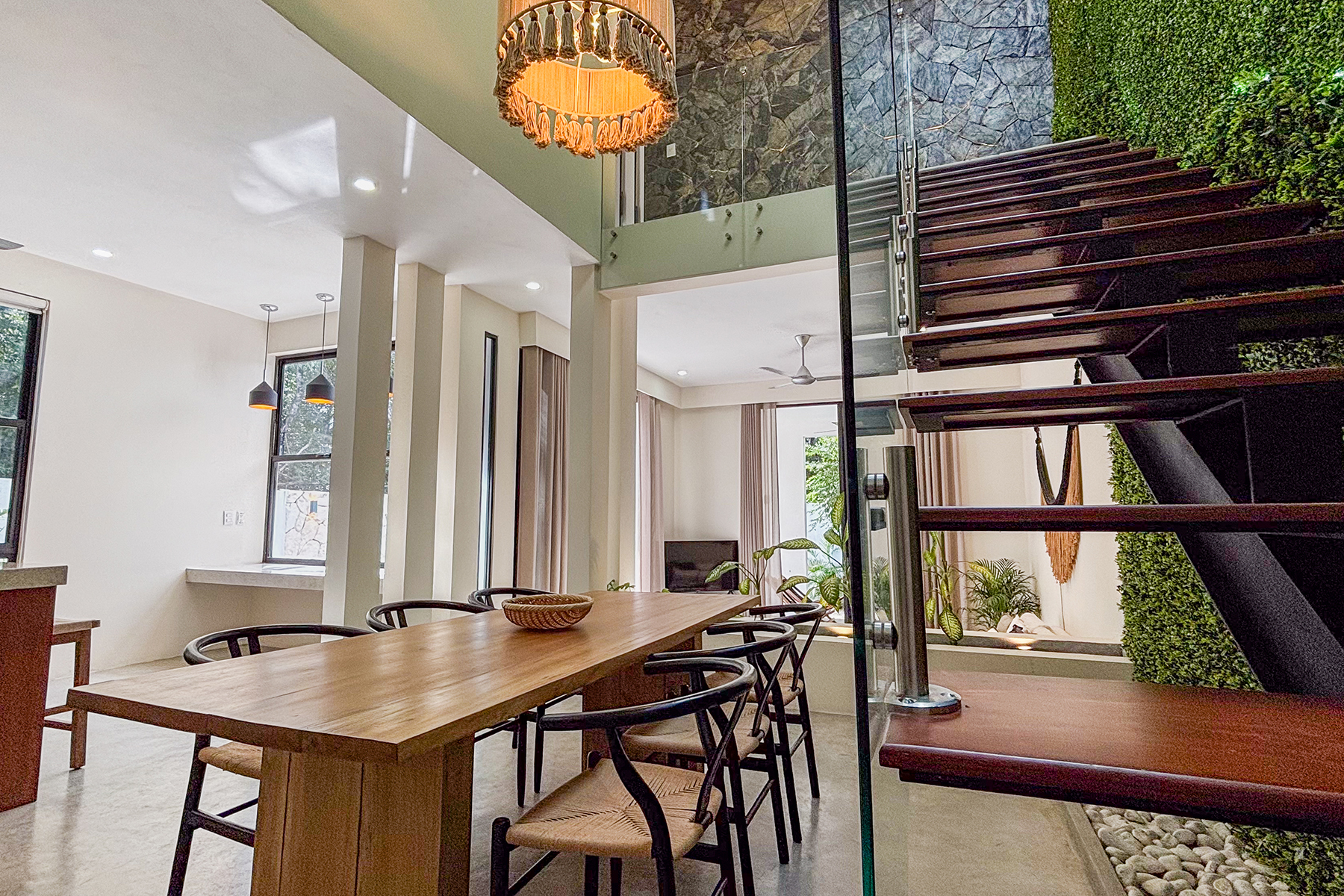The heart of the home is the open-concept living area, where a modern kitchen bar with a dining area merges seamlessly with the lounge. From here, you can admire the spectacular L-shaped pool , strategically designed to be the visual centerpiece from both the kitchen and living room. The ground floor features one half-bathroom for guests. On the second level, you will find 2 spacious bedrooms that offer infinite green views of the jungle, accompanied by 2 full bathrooms with high-quality finishes.