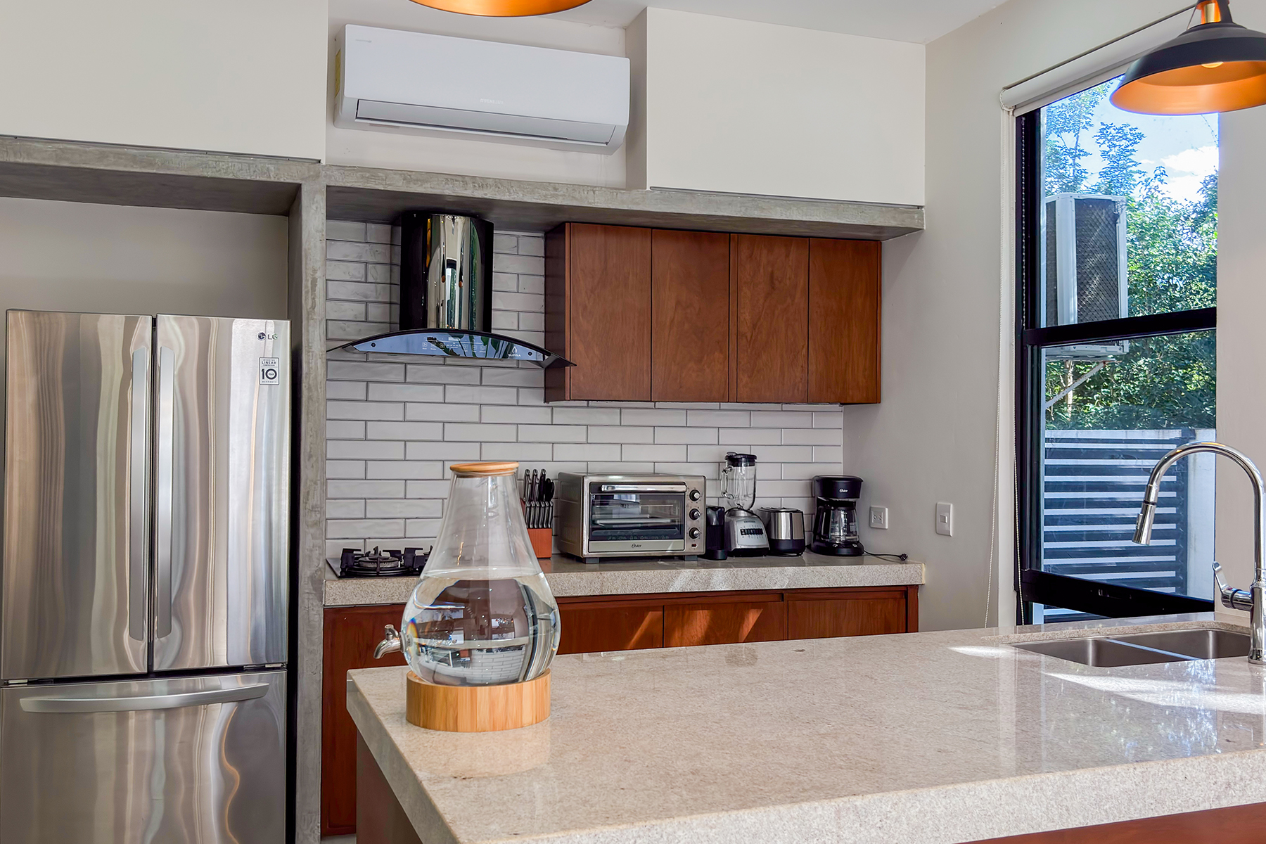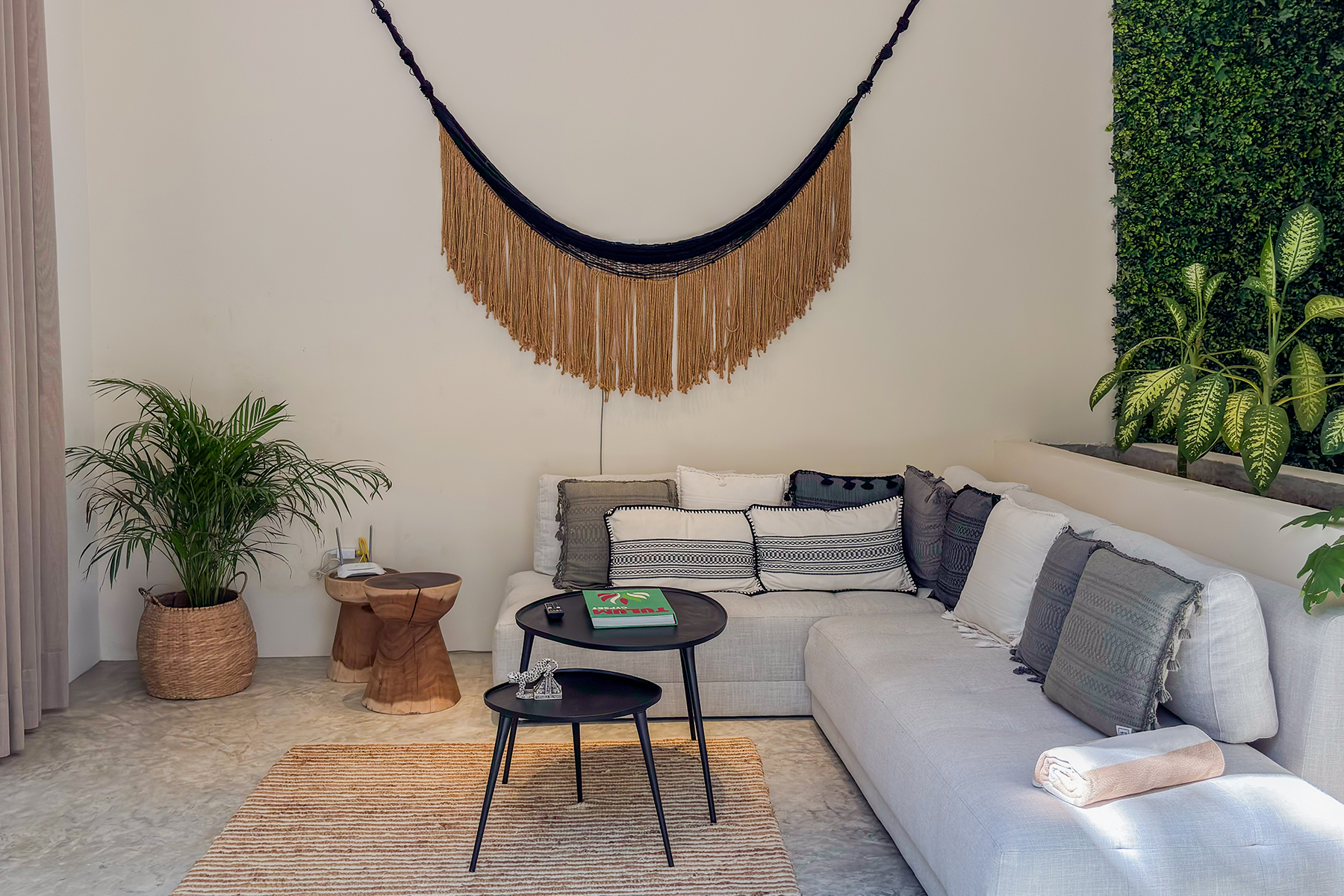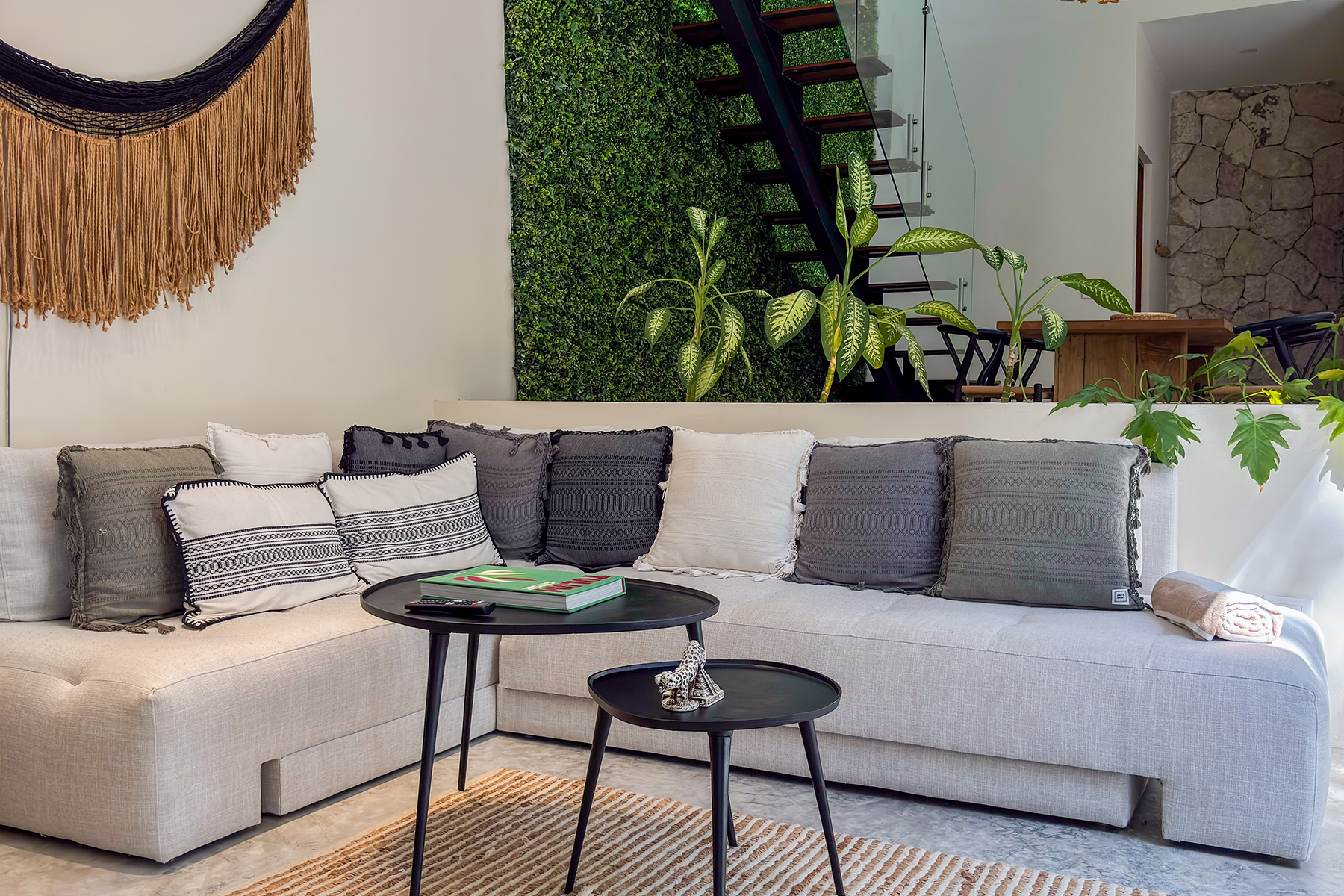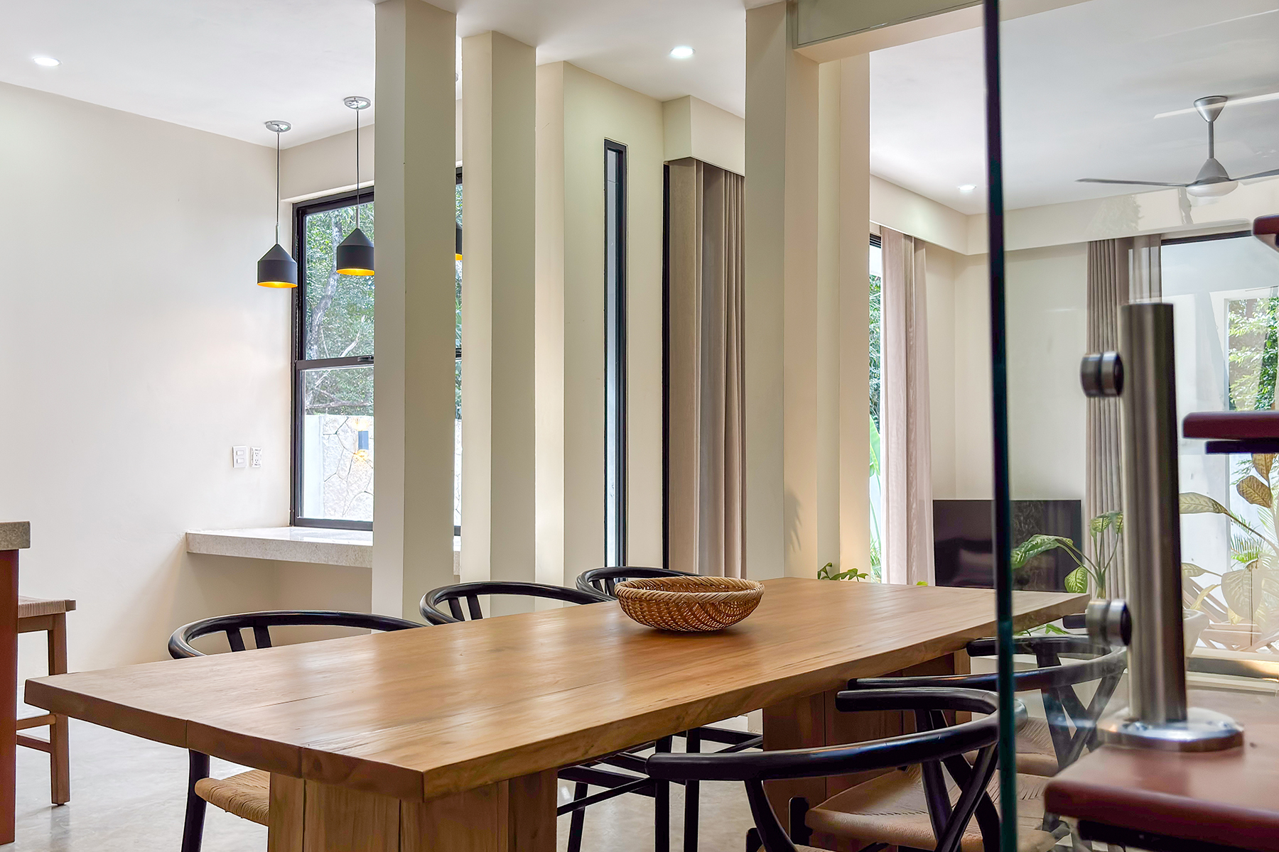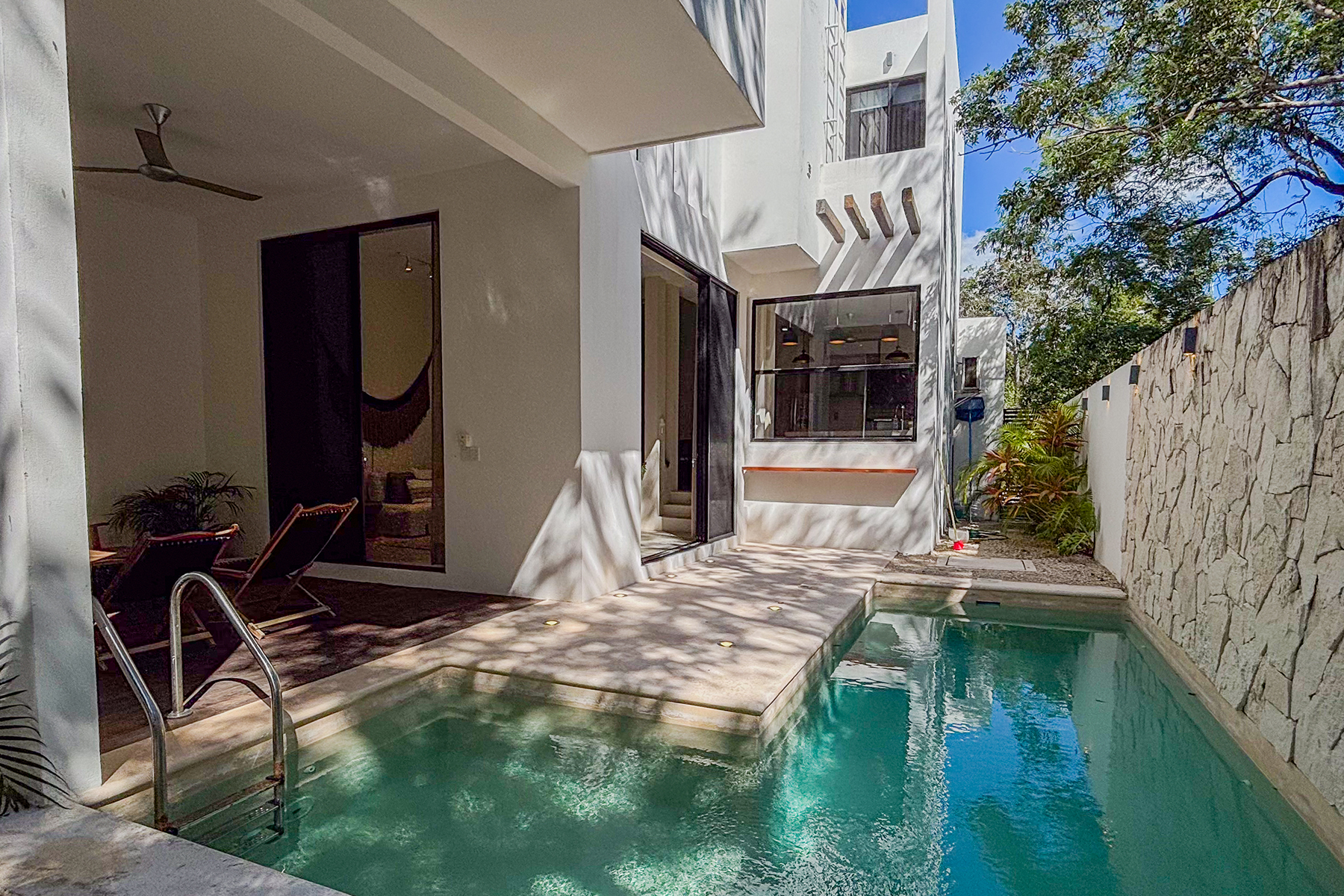 The heart of the home is the open-concept living area, where a modern kitchen bar with a dining area merges seamlessly with the lounge. From here, you can admire the spectacular L-shaped pool , strategically designed to be the visual centerpiece from both the kitchen and living room. The ground floor features one half-bathroom for guests. On the second level, you will find 2 spacious bedrooms that offer infinite green views of the jungle, accompanied by 2 full bathrooms with high-quality finishes.