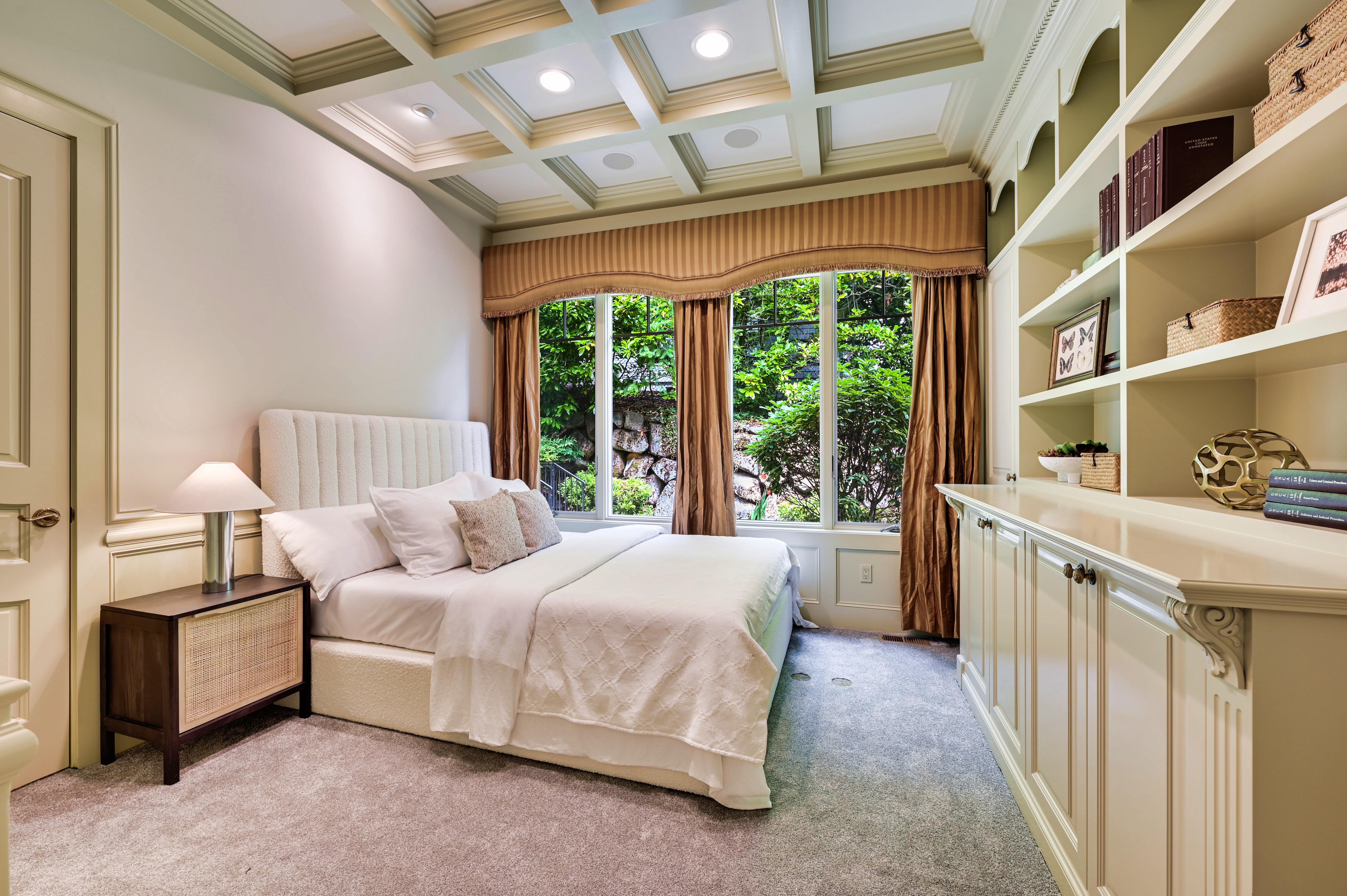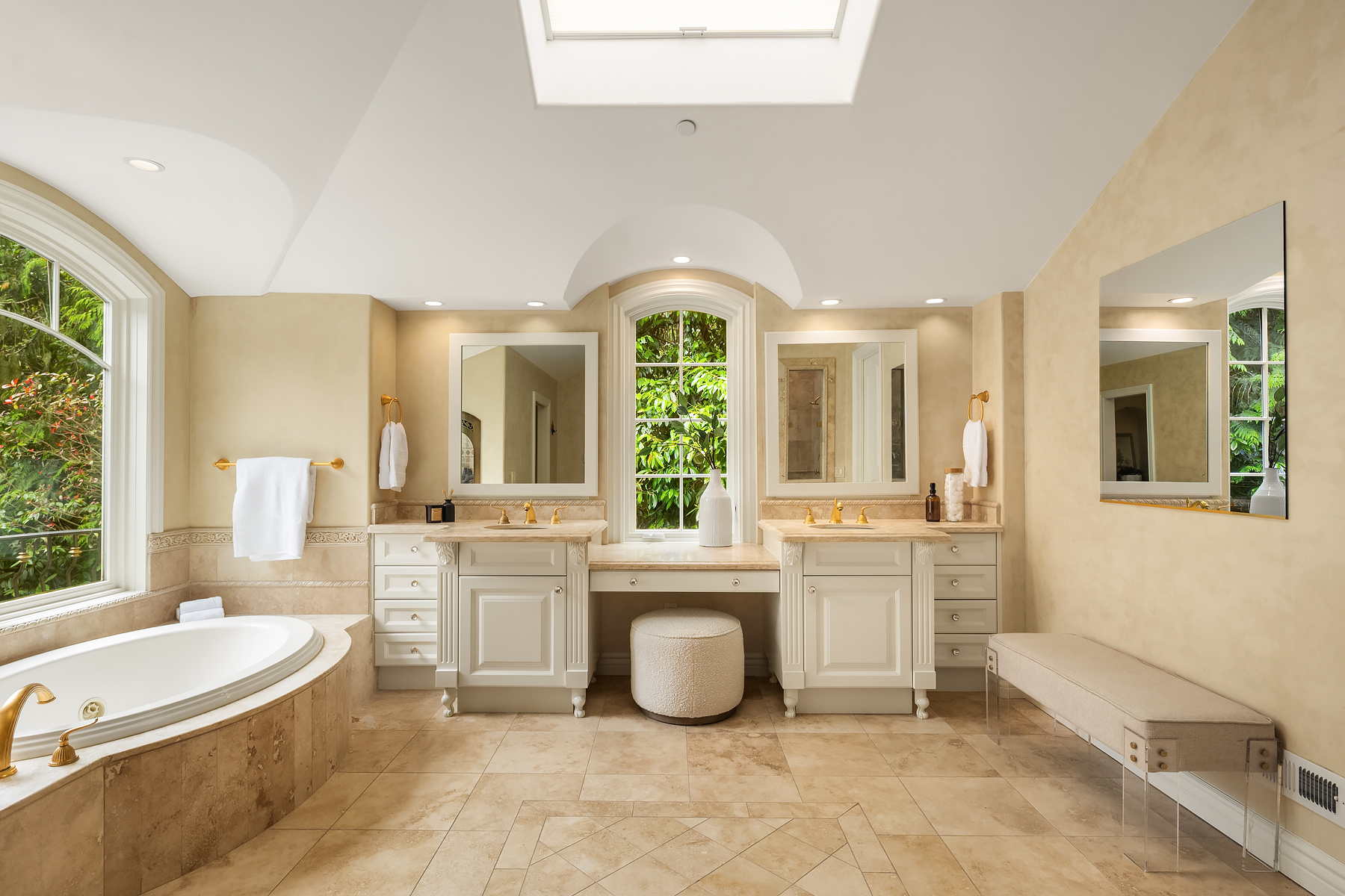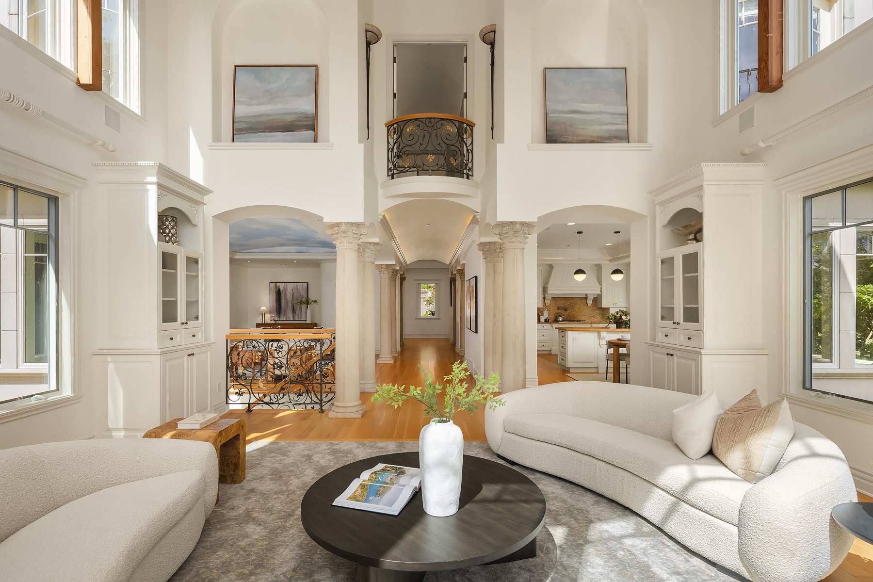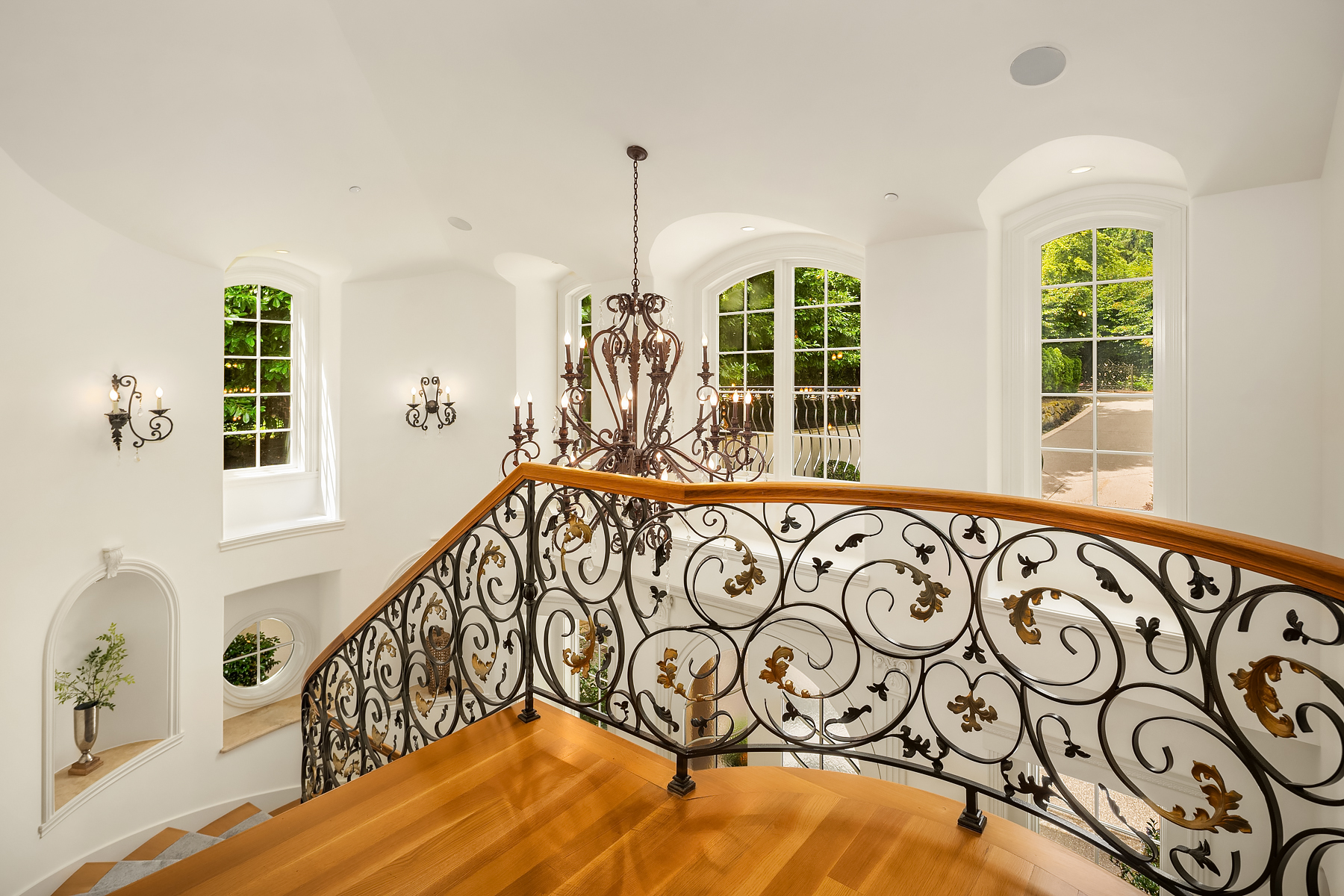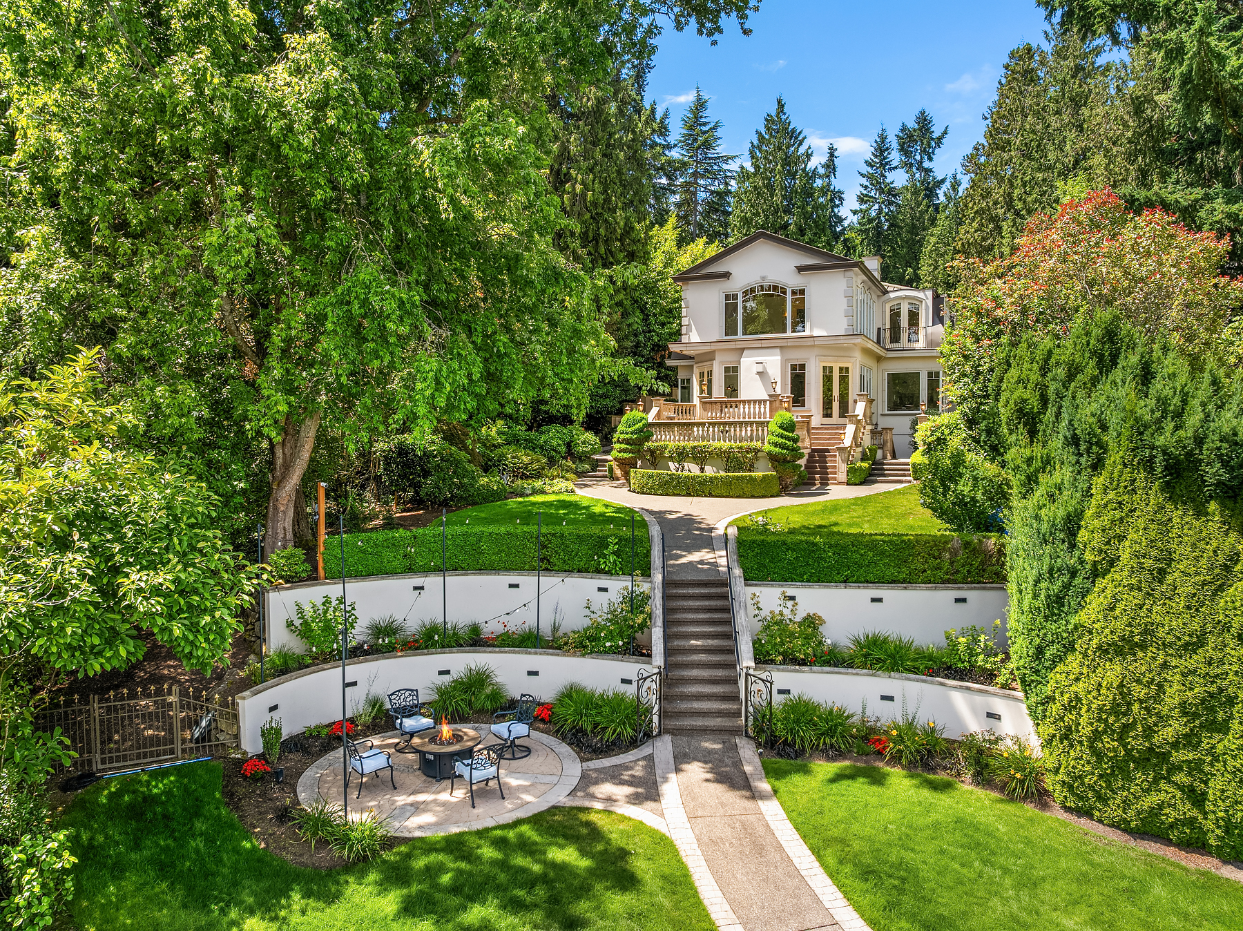 A distinctive gated estate in one of the nation’s most coveted neighborhoods. This Mediterranean-style residence features cathedral ceilings, Italian columns, and French doors opening to serene patios and a 200-ft dock with year-round moorage. Gorgeous wrought iron railings, crystal chandeliers, and a whole-house sound system add to the refined ambiance. Each bedroom is an ensuite. Downstairs offers relaxation with a wine cellar, spa, cold bar and terraces. Chef’s kitchen is outfitted with brand-name appliances. Curved design flows through the lush, landscaped grounds of this Lake Washington shore house. Mature trees, vibrant blooms, and curated shrubs welcome visits from blue herons and bald eagles. Fountain, BBQ island, firepit, dog run.