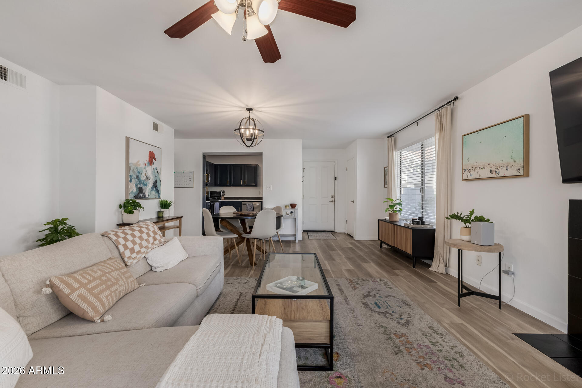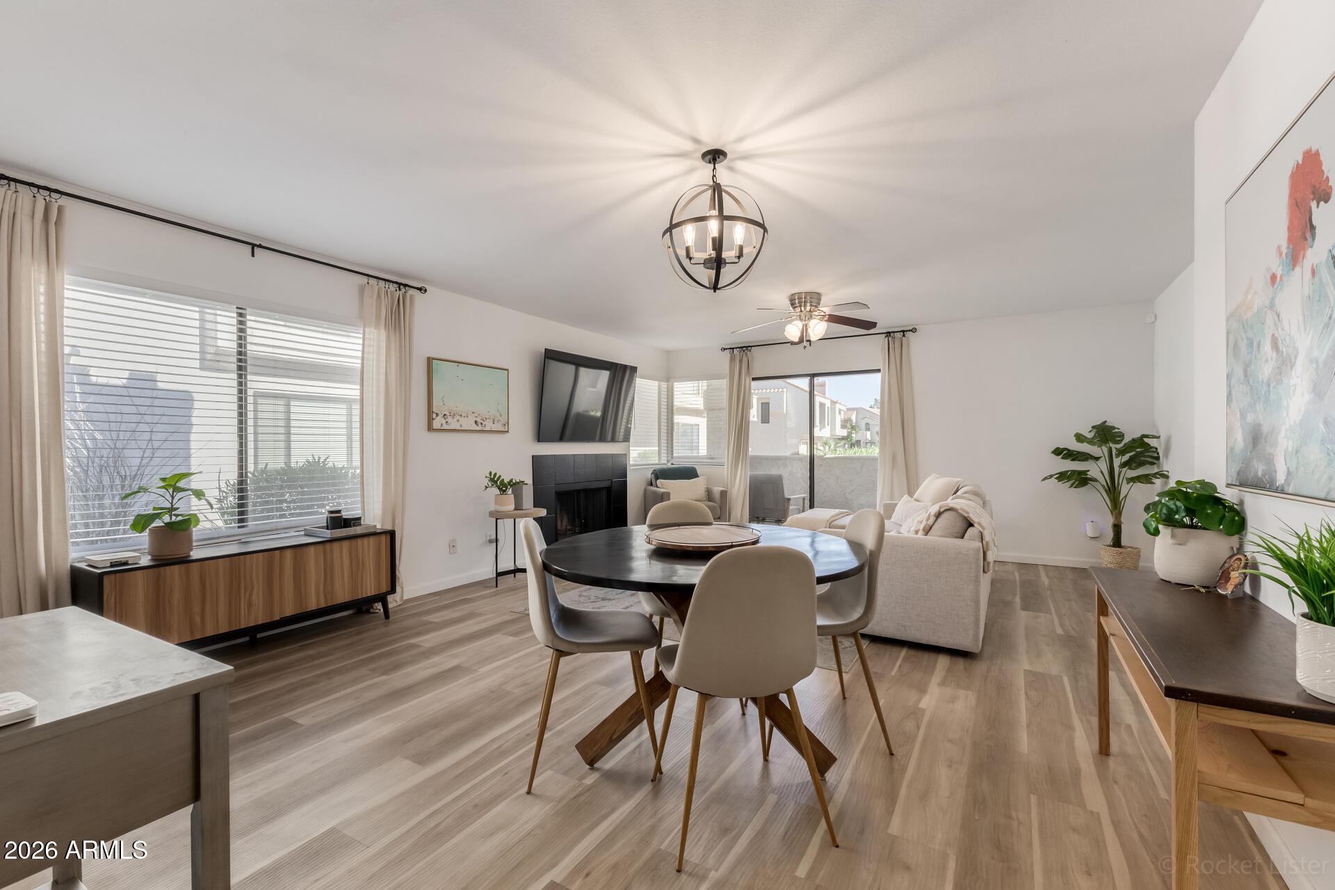Charming single-level condo in a gated Scottsdale Ranch community offering comfort and lifestyle. Inside you'll find open living areas with wood-style flooring, neutral paint, modern lighting, and a cozy wood-burning fireplace. The U-shaped kitchen features stainless steel appliances, generous counter space, and ample cabinetry. The primary suite offers two spacious closets and a private bath with tiled shower. A stacked laundry closet adds everyday convenience. Relax on the private patio with storage room. The 1-car garage provides secure parking, plus plenty of guest parking out front. Community amenities include a pool, BBQ areas, grassy spaces, scenic water features, walking paths, and a workout gym. Scottsdale Ranch walking paths are just outside the gate.