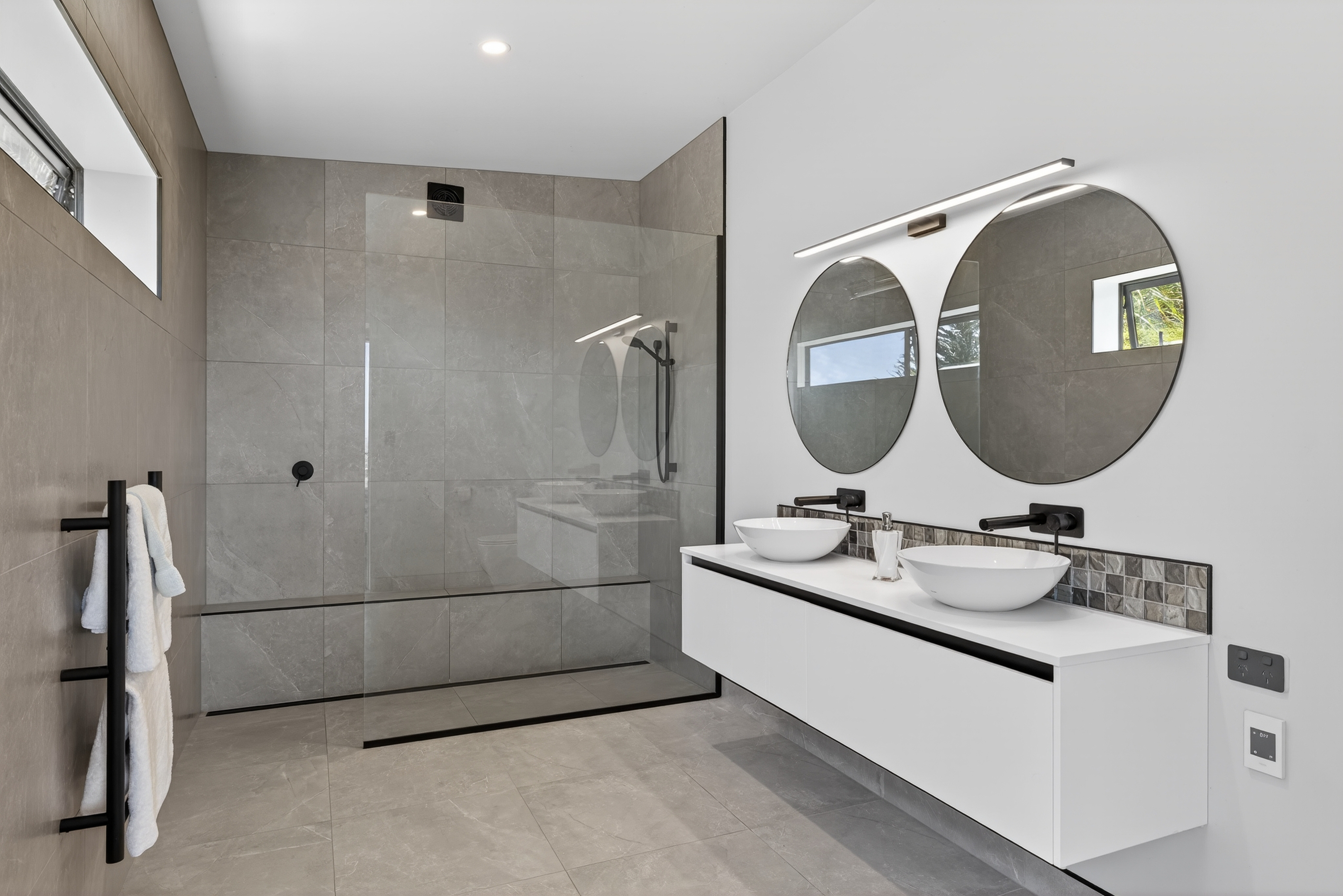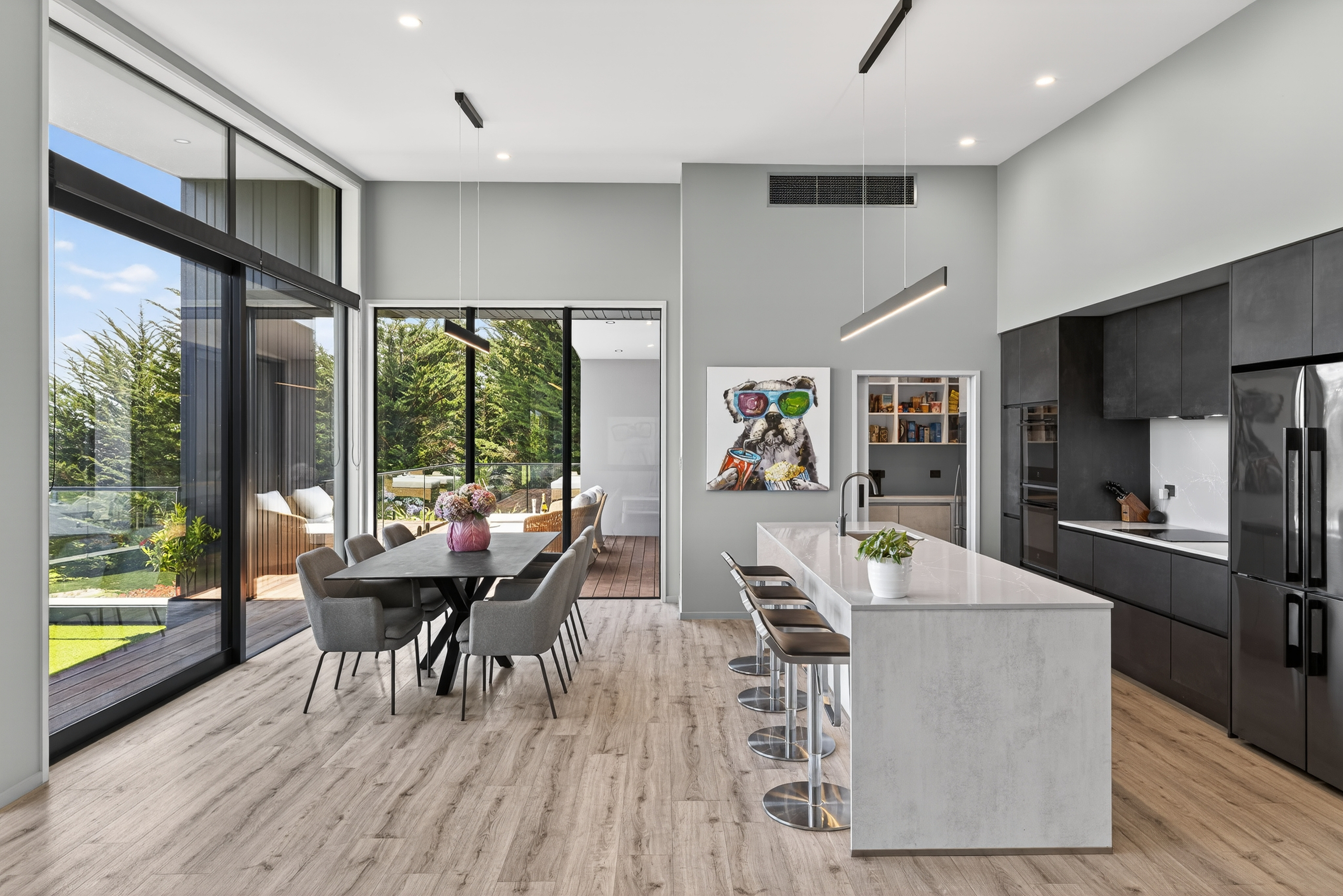 The kitchen is designed with function firmly in mind, featuring engineered stone benchtops, double ovens, and an induction cooktop. A discreet scullery supports daily use and larger gatherings alike, allowing the main space to remain uncluttered and composed. Living areas extend seamlessly to sheltered outdoor terraces, creating protected spaces for entertaining that balance outlook with a strong sense of privacy.