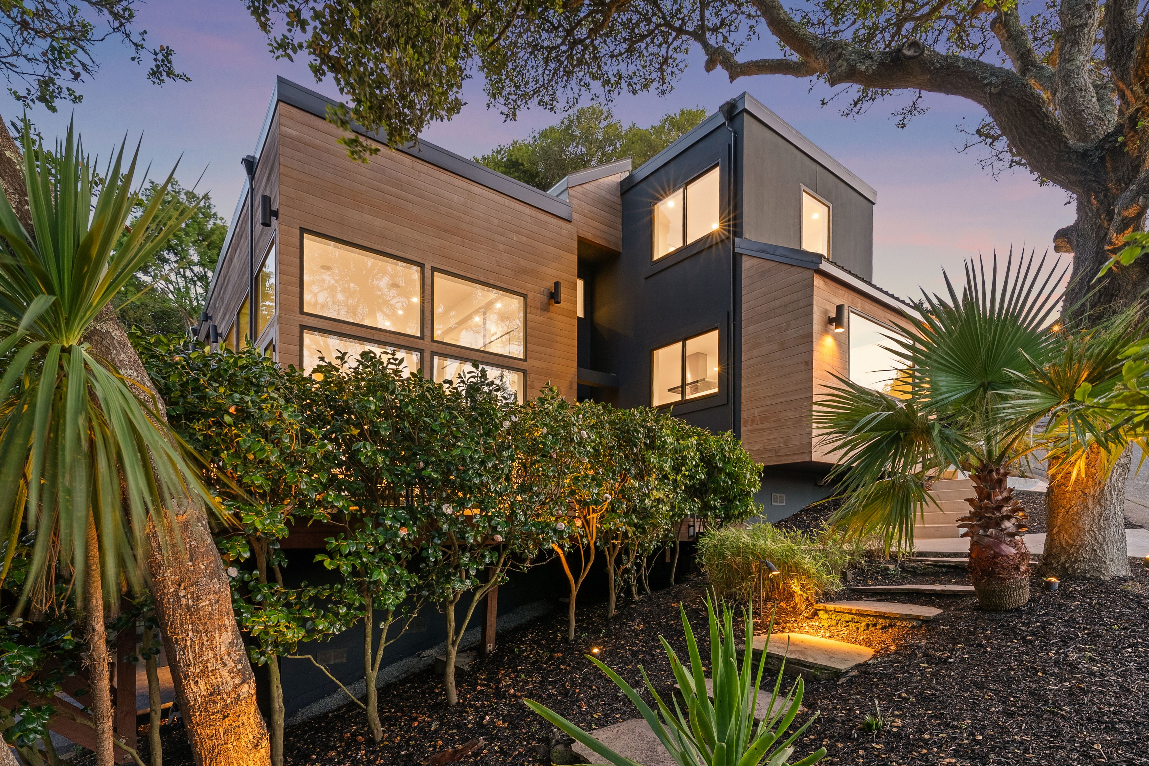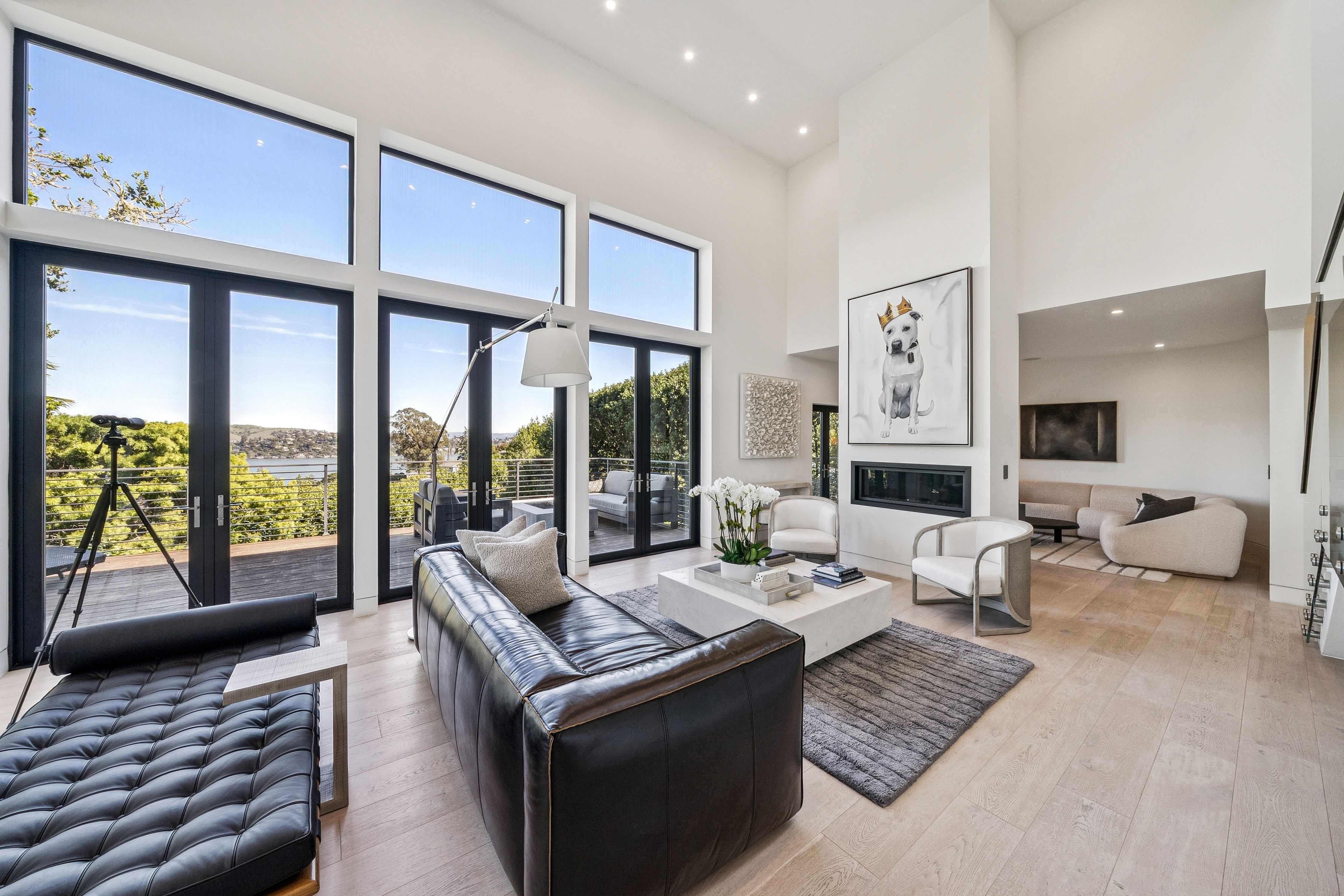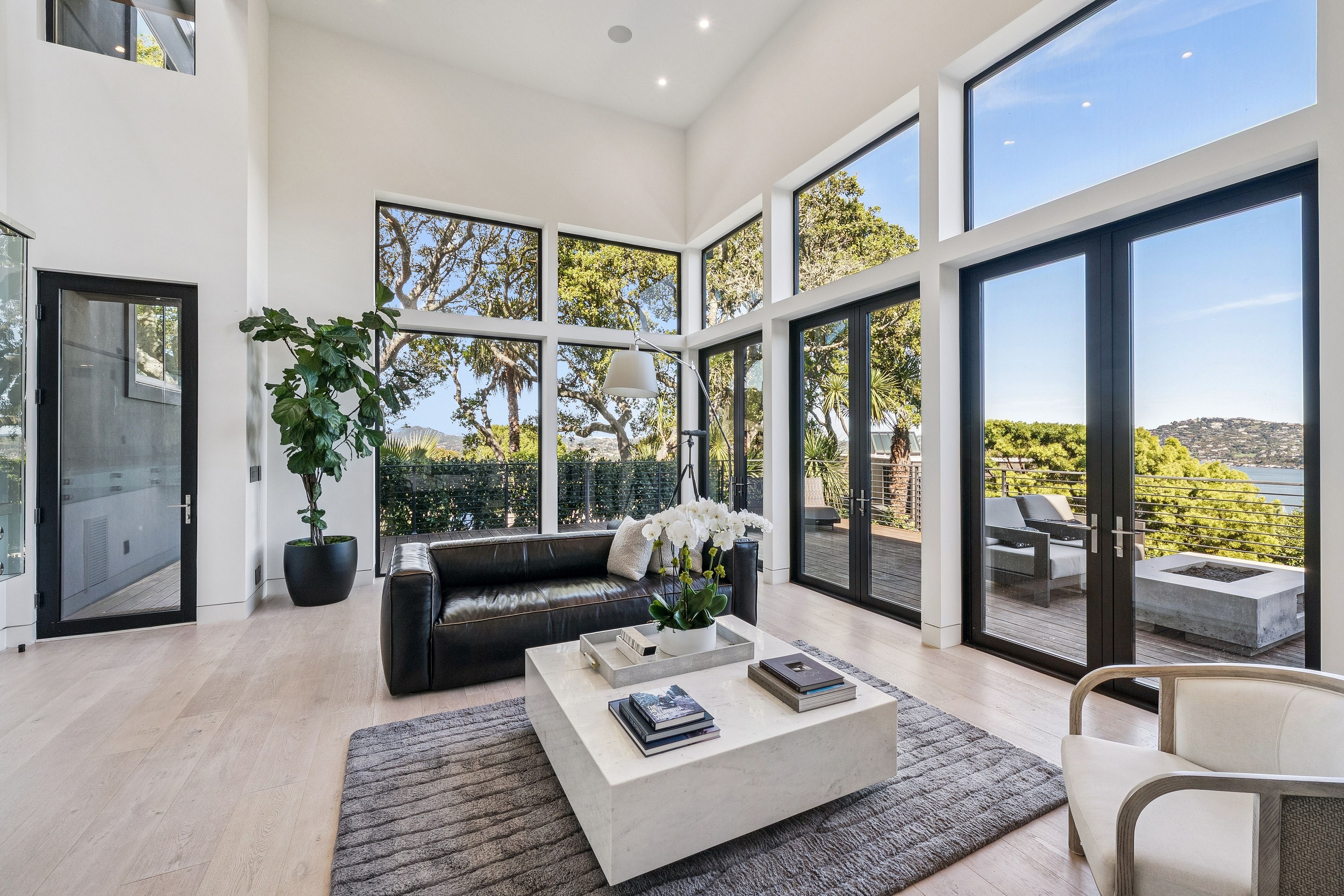 Set at the end of a quiet cul-de-sac on a private third-acre lot; yet just minutes to the waterfront, Caledonia Street shops and restaurants, and the Golden Gate Bridge for a dream commute. Entering this Sausalito sanctuary wrapped in warm cedar siding feels like stepping into framed art; gallery-like walls of glass, soaring ceilings, skylights pouring in natural light and glass railings throughout. A minimalist gas fireplace defines the main living space, with a separate family room tucked behind, perfect for cozy movie night. Both enjoy direct access to the wrap-around Redwood deck with tranquil Richardson Bay and lush greenery views.Up a few steps, the designer chef’s kitchen is anchored by a dramatic Mount Tam view window with ever-changing vistas. A gorgeous waterfall Calacatta quartz island is built for effortless entertaining and everyday use, paired with custom Porcelanosa cabinetry and top-of-the-line Wolf and Sub-Zero appliances, including double oven, dual-zone wine refrigerator, and a built-in barista station. The loft-style dining area captures serene Bay views and opens through French doors to the back patio, while overlooking the sunken living room, a true architectural centerpiece. Also on this level: an en-suite guest room, chic powder room and full-size laundry closet.Upstairs, the primary suite is a true retreat with expansive water, marina, and Tiburon ridgeline views, plus a spa-like bath featuring a soaking tub, continuous shower, and marble floating vanity, along with a well-appointed walk-in closet. Additionally on this level is a bedroom with Mount Tam views and a flex office or fourth bedroom, plus a third full bathroom with the same clean, modern finishes. A two-car garage (currently styled as an elevated workout studio), plus a separate parking deck complete this exceptional offering. Purchased in 2020 and used part-time, the home presents in pristine, like-new condition . . . where you can move right in and start enjoying the Sausalito lifestyle at its finest~
