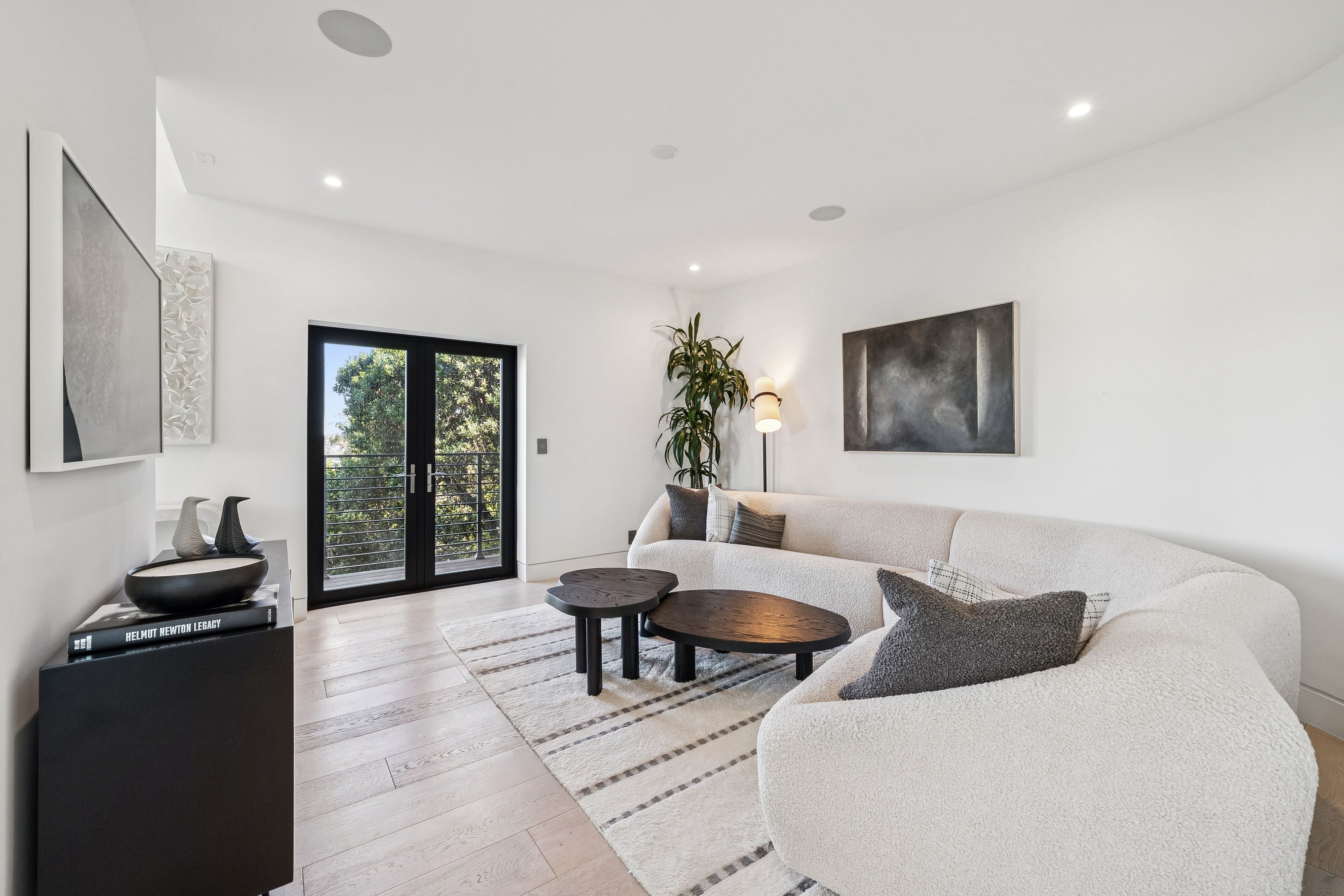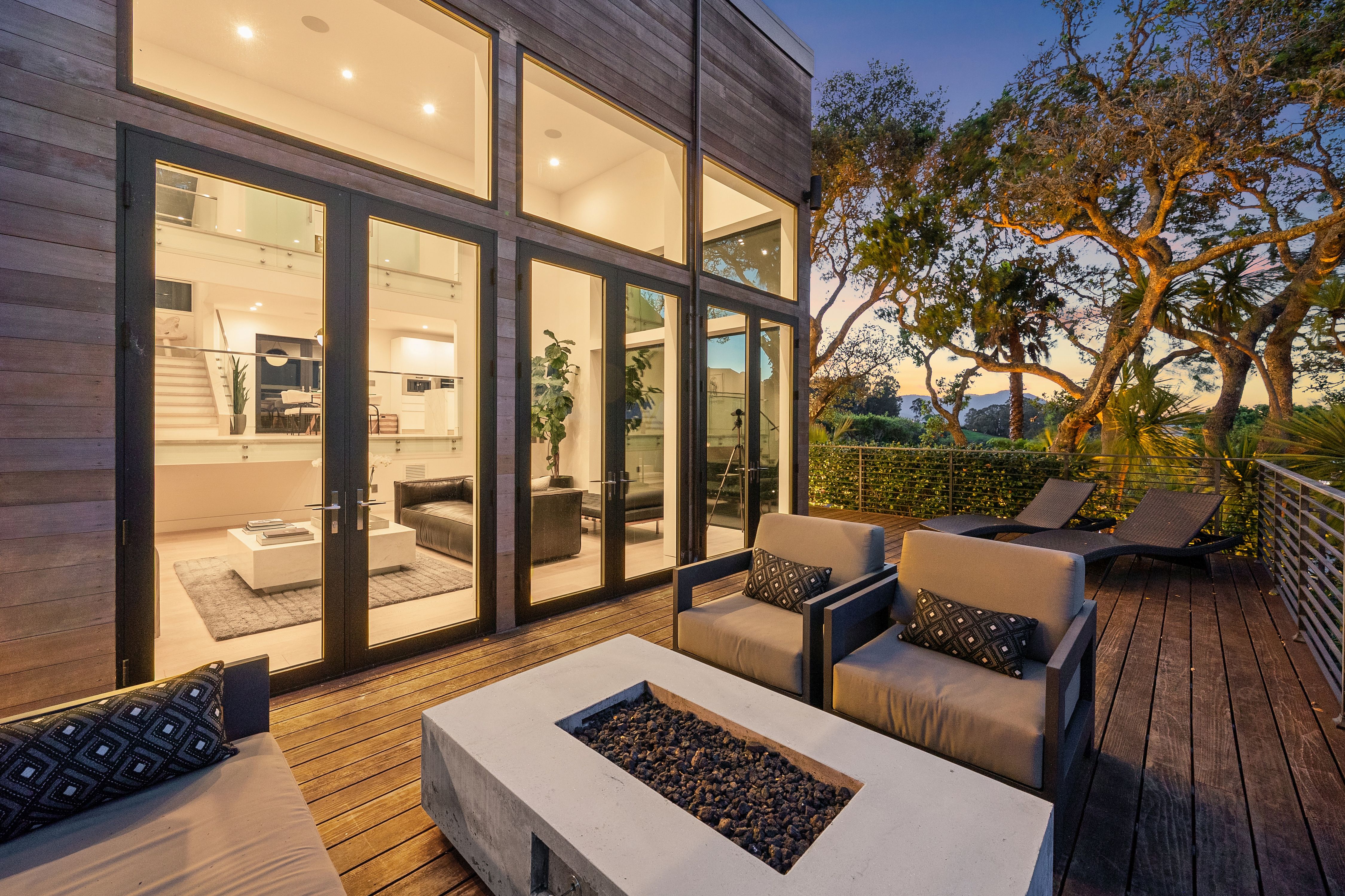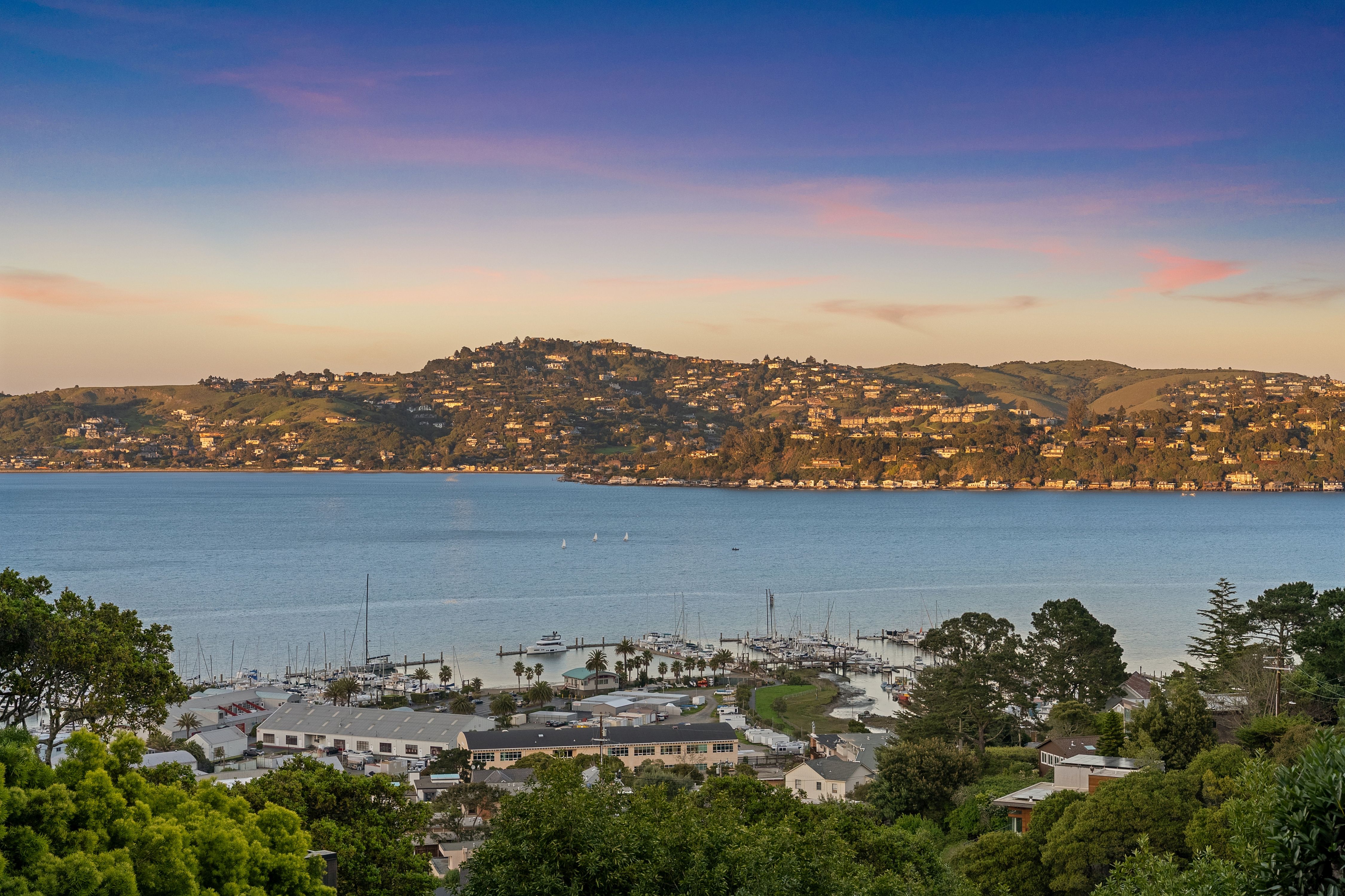 Set at the end of a quiet cul-de-sac on a private third-acre lot; yet just minutes to the waterfront, Caledonia Street shops and restaurants, and the Golden Gate Bridge for a dream commute. Entering this Sausalito sanctuary wrapped in warm cedar siding feels like stepping into framed art; gallery-like walls of glass, soaring ceilings, skylights pouring in natural light and glass railings throughout. A minimalist gas fireplace defines the main living space, with a separate family room tucked behind, perfect for cozy movie night. Both enjoy direct access to the wrap-around Redwood deck with tranquil Richardson Bay and lush greenery views.Up a few steps, the designer chef’s kitchen is anchored by a dramatic Mount Tam view window with ever-changing vistas. A gorgeous waterfall Calacatta quartz island is built for effortless entertaining and everyday use, paired with custom Porcelanosa cabinetry and top-of-the-line Wolf and Sub-Zero appliances, including double oven, dual-zone wine refrigerator, and a built-in barista station. The loft-style dining area captures serene Bay views and opens through French doors to the back patio, while overlooking the sunken living room, a true architectural centerpiece. Also on this level: an en-suite guest room, chic powder room and full-size laundry closet.Upstairs, the primary suite is a true retreat with expansive water, marina, and Tiburon ridgeline views, plus a spa-like bath featuring a soaking tub, continuous shower, and marble floating vanity, along with a well-appointed walk-in closet. Additionally on this level is a bedroom with Mount Tam views and a flex office or fourth bedroom, plus a third full bathroom with the same clean, modern finishes. A two-car garage (currently styled as an elevated workout studio), plus a separate parking deck complete this exceptional offering. Purchased in 2020 and used part-time, the home presents in pristine, like-new condition . . . where you can move right in and start enjoying the Sausalito lifestyle at its finest~