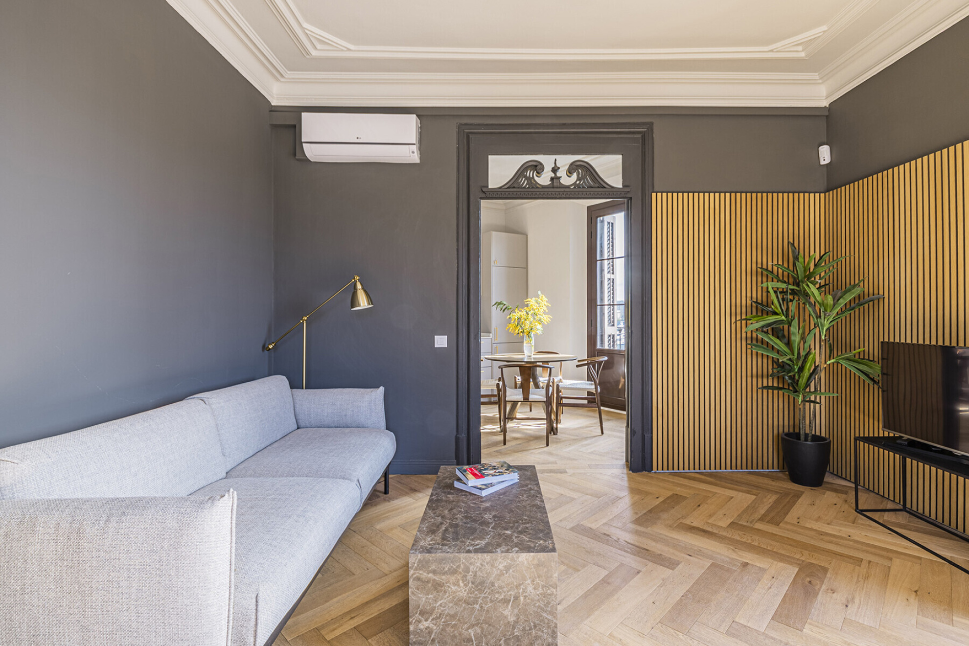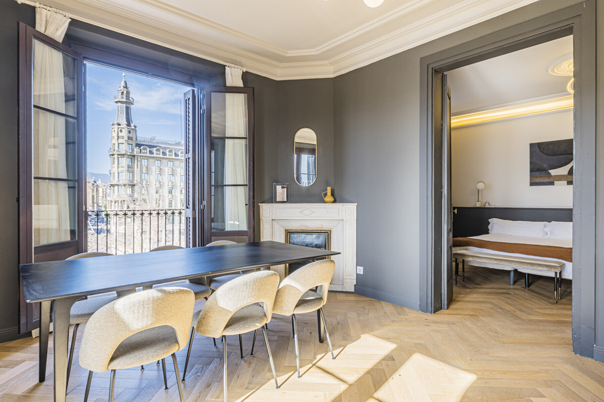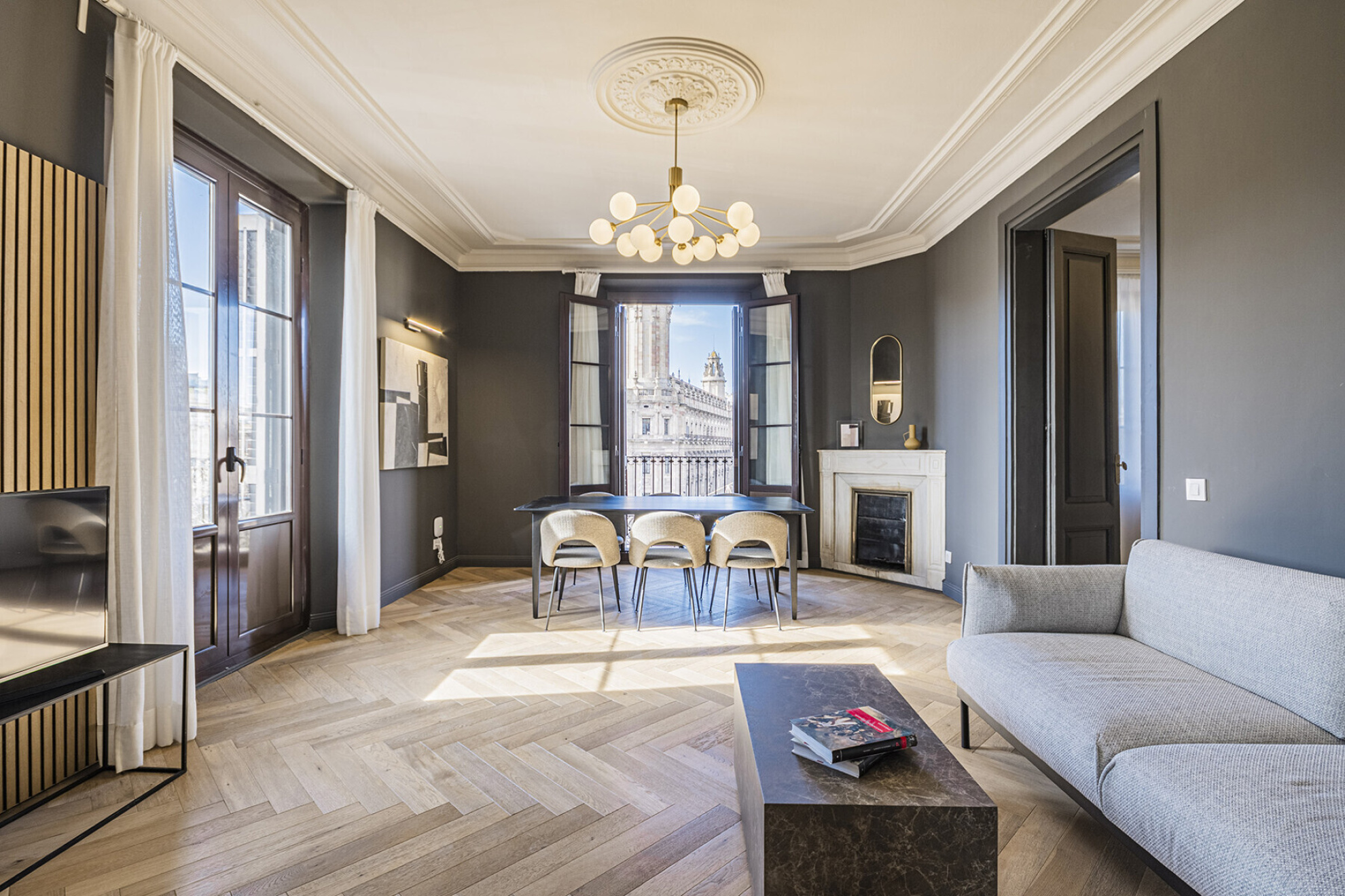 Beautiful corner apartment completely renovated of 92 m2 overlooking the Port Vell in the Born neighborhood. It has a sophisticated and bright living room with high ceilings with a window overlooking the Port Vell and another one overlooking Via Laietana. The kitchen is semi-open to a nice dining room with views of the port. It also has 2 spacious double bedrooms, 1 bathroom with shower and 1 toilet.The property has parquet floors, double glazed windows, heating system and air conditioning by aerothermal. It is located in a refurbished royal estate with elevator and concierge, large terrace with swimming pool, barbecue area, chill out and solarium, highlighting the incomparable and wonderful views of the Port Vell, La Ciutat Vella, Montjuic, Tibidabo. Sold furnished.