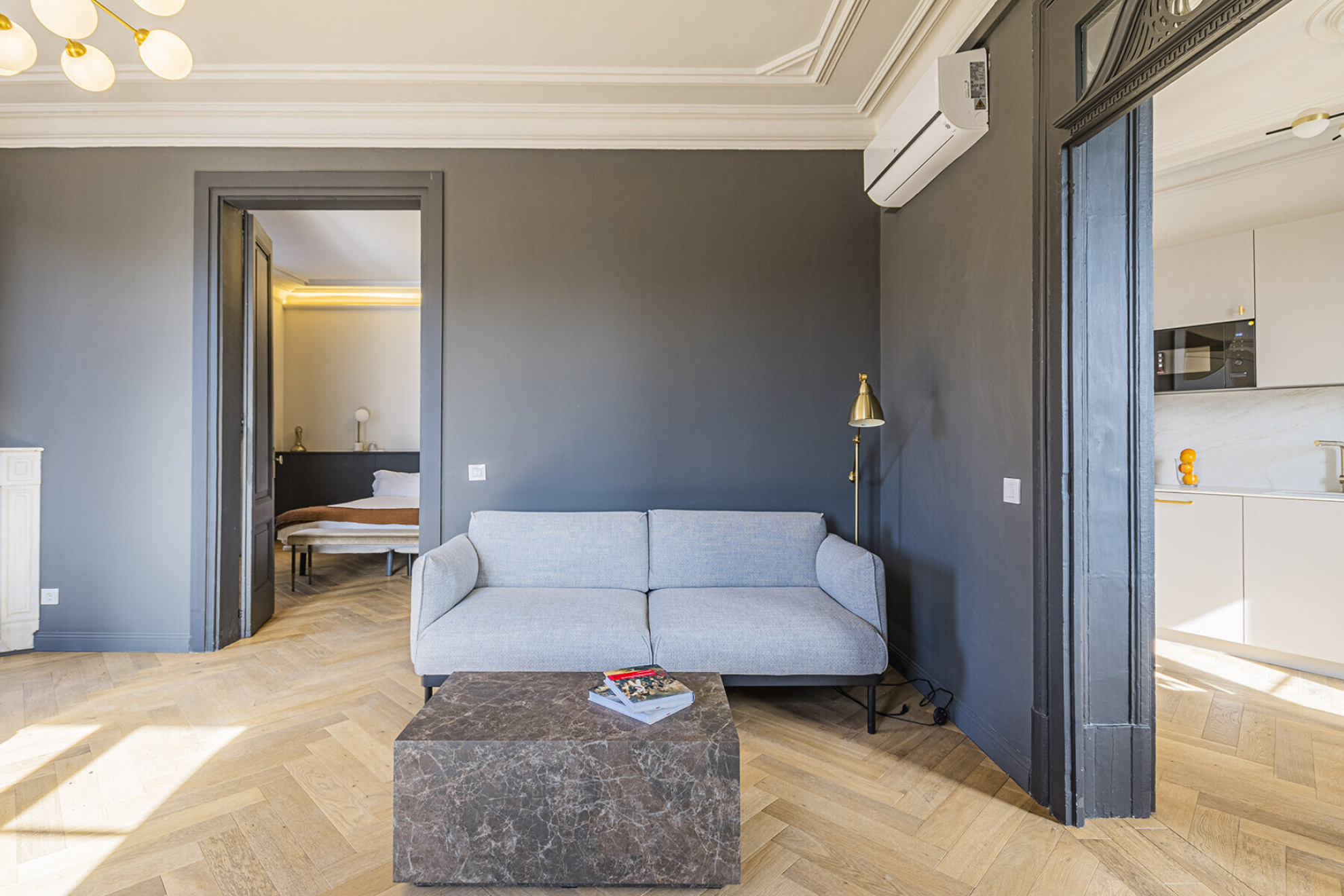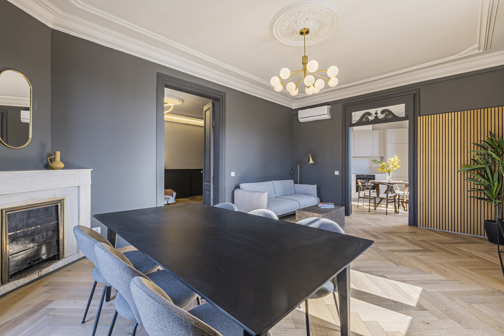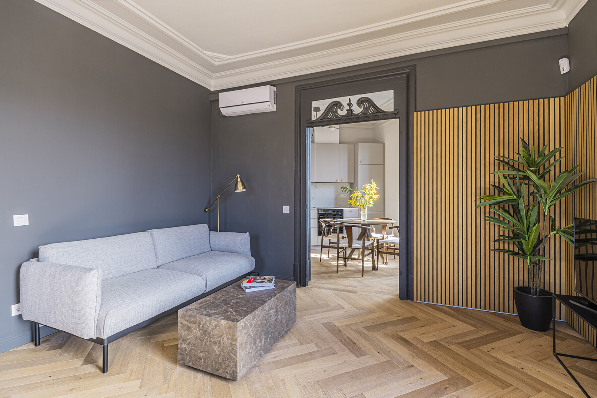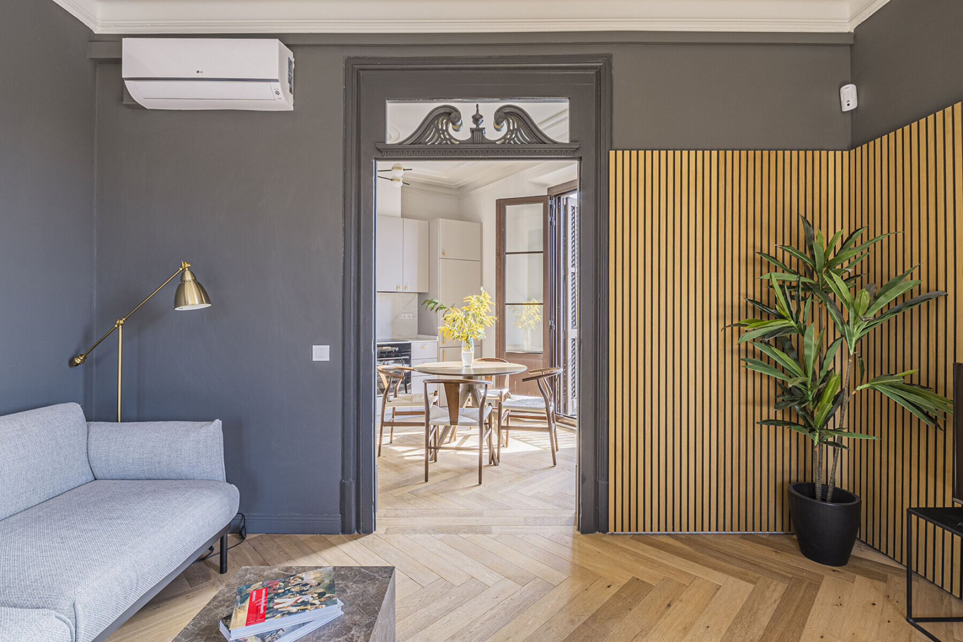 Beautiful corner apartment completely renovated of 92 m2 overlooking the Port Vell in the Born neighborhood. It has a sophisticated and bright living room with high ceilings with a window overlooking the Port Vell and another one overlooking Via Laietana. The kitchen is semi-open to a nice dining room with views of the port. It also has 2 spacious double bedrooms, 1 bathroom with shower and 1 toilet.The property has parquet floors, double glazed windows, heating system and air conditioning by aerothermal. It is located in a refurbished royal estate with elevator and concierge, large terrace with swimming pool, barbecue area, chill out and solarium, highlighting the incomparable and wonderful views of the Port Vell, La Ciutat Vella, Montjuic, Tibidabo. Sold furnished.