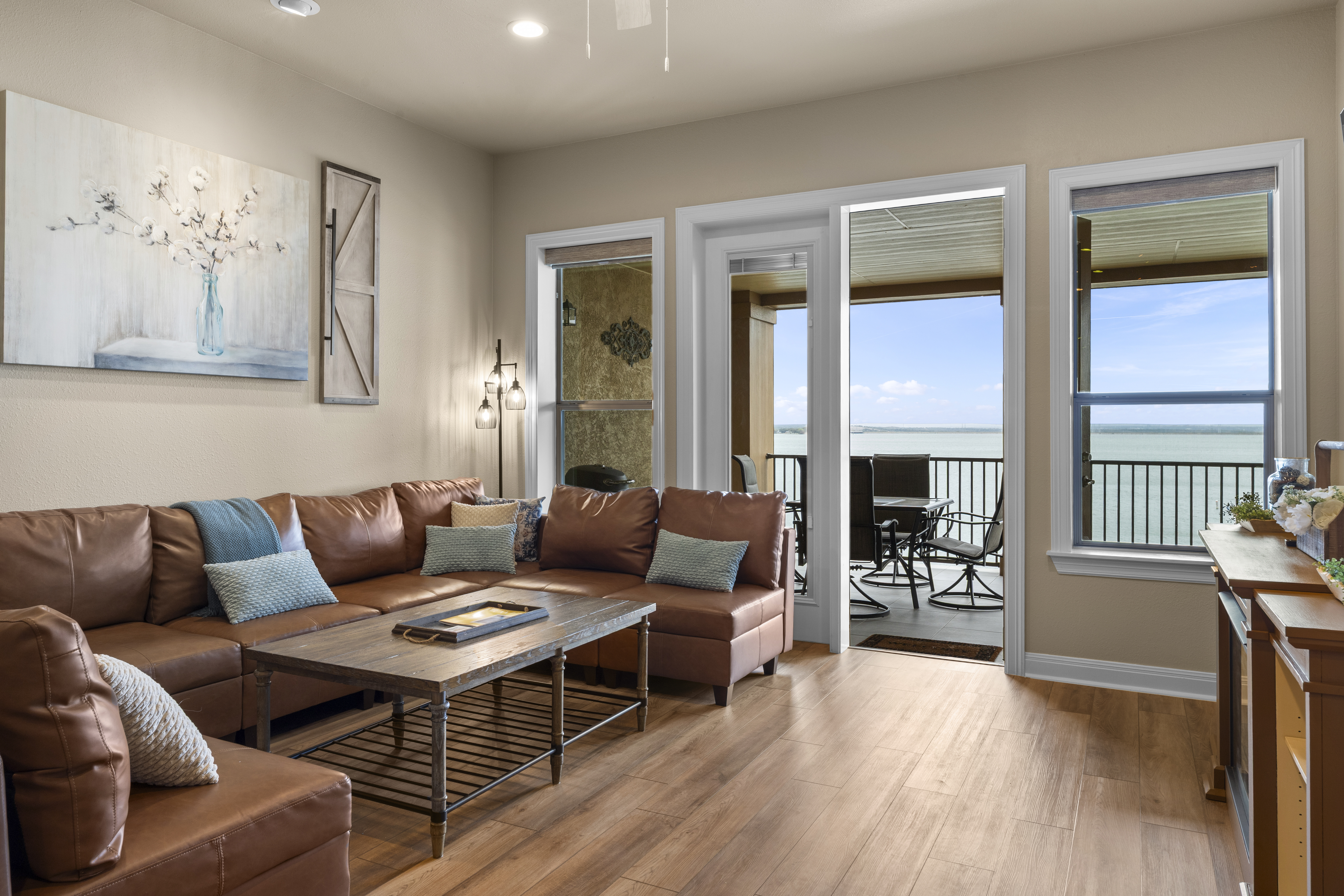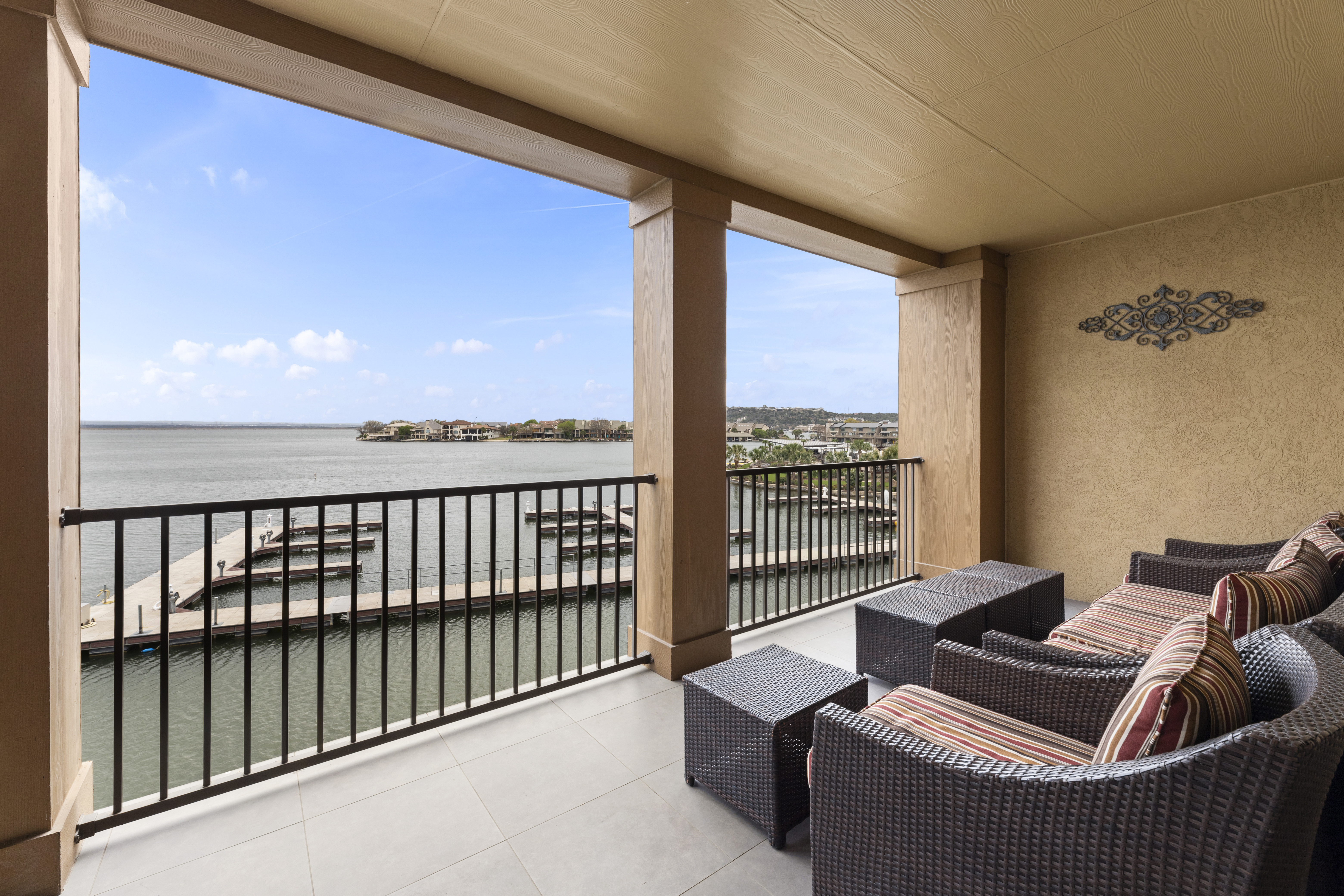 Lakefront living at The Waters at Horseshoe Bay Resort in this fully furnished 3-bedroom, 2-bath second-floor condo overlooking constant-level Lake LBJ. The open floorplan features a spacious living area and a granite-counter kitchen with breakfast bar. Large windows and French doors fill the home with natural light and lead to a private covered balcony with lake views. The primary suite offers balcony access, while two additional bedrooms provide space for guests, a home office, or additional sleeping accommodations. This lock-and-leave condo includes elevator access, covered assigned parking, and low-maintenance ownership, making it ideal as a weekend getaway, full-time residence, or short-term rental investment. Recent updates include a new A/C system and hot water heater (approximately 1 year old). Community amenities include a lakeside boardwalk, resort-style pool, outdoor kitchen and grilling areas, fishing docks, and additional storage for water gear, offering a true Lake LBJ lifestyle.
