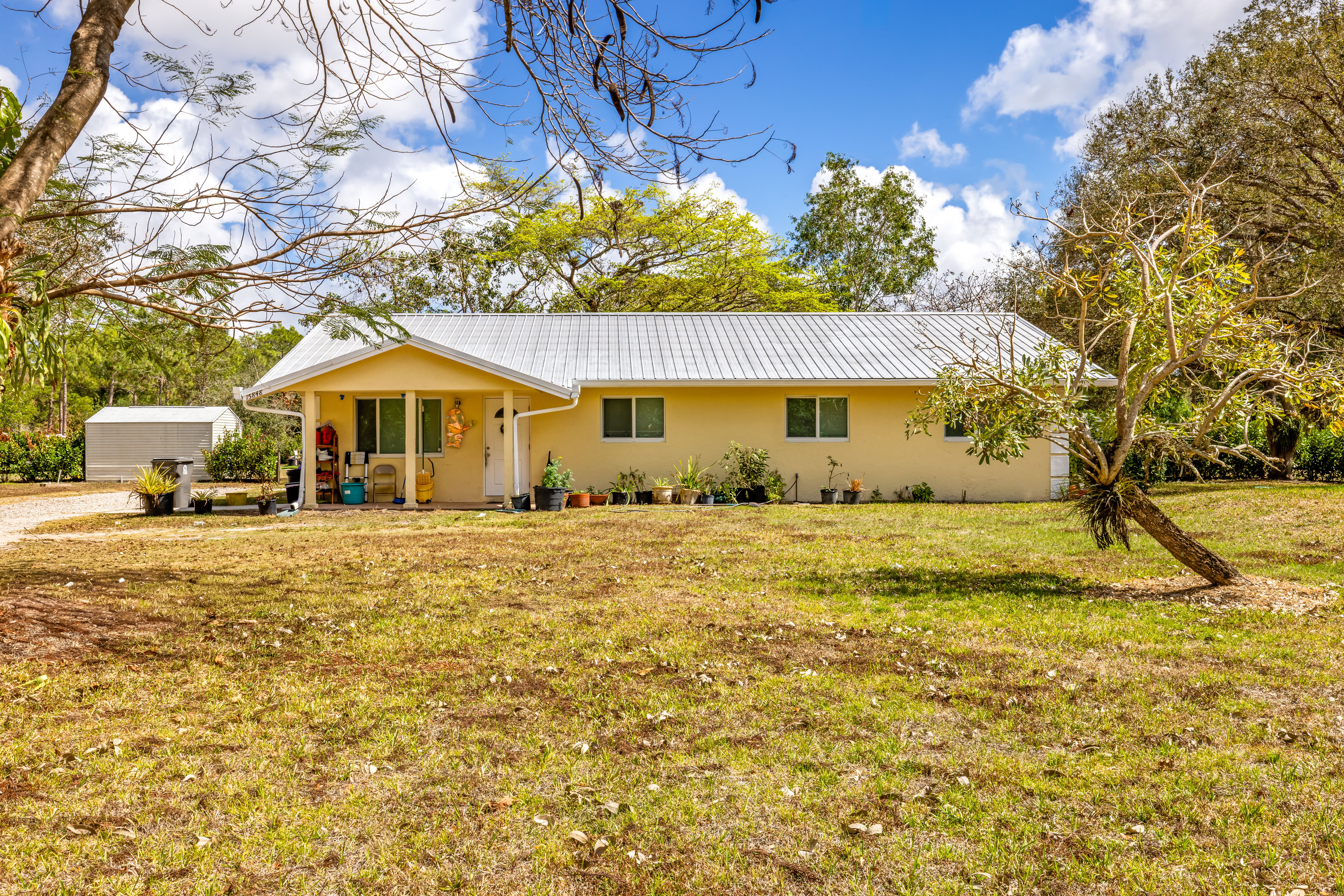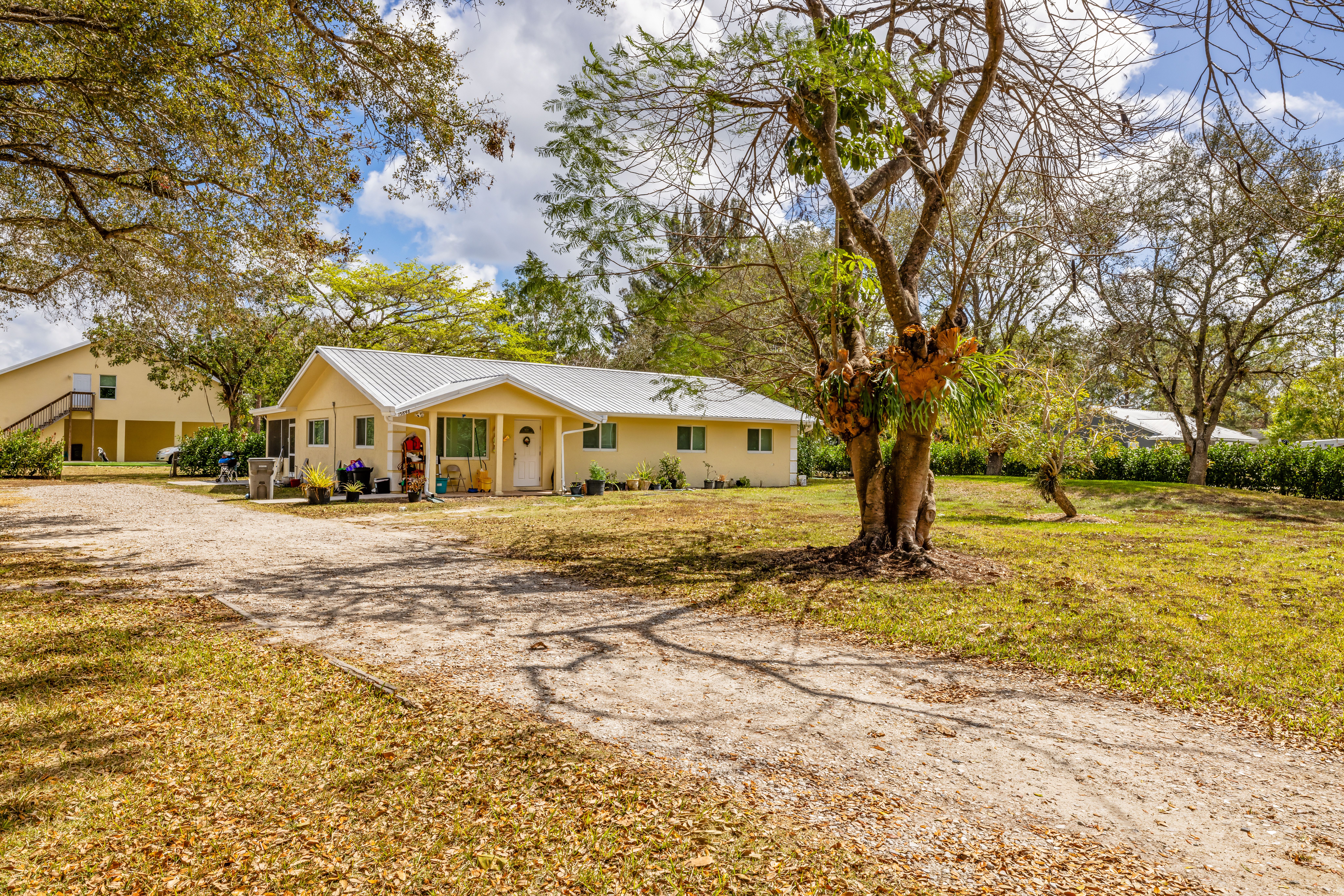 Set on 2.5 fully fenced acres in Jupiter Farms, this versatile property features a 3 bedroom/ 2bathroom main home and a substantial secondary structure ideal for additional living space, hobbies, or income potential. Main residence offers over 1,700 square foot with tile flooring throughout, a spacious living area, and updated kitchen and bathrooms. The primary suite includes an ensuite bath with cabana access. Additional highlights include a large utility/laundry room, impact windows, a wired security system, and a covered screened patio perfect for outdoor living. Built in 2015, the secondary structure features a 544 square foot one-bedroom apartment, a 1,242 square foot air-conditioned garage with roll-up door and epoxy flooring, and 192 square foot of storage, all with a separate entrance. Powered by a 150-gallon propane tank and generator, the building is also designed to allow additional garage bays or horse stalls. A rare Jupiter Farms opportunity offering privacy, flexibility, and space just minutes from Jupiter.