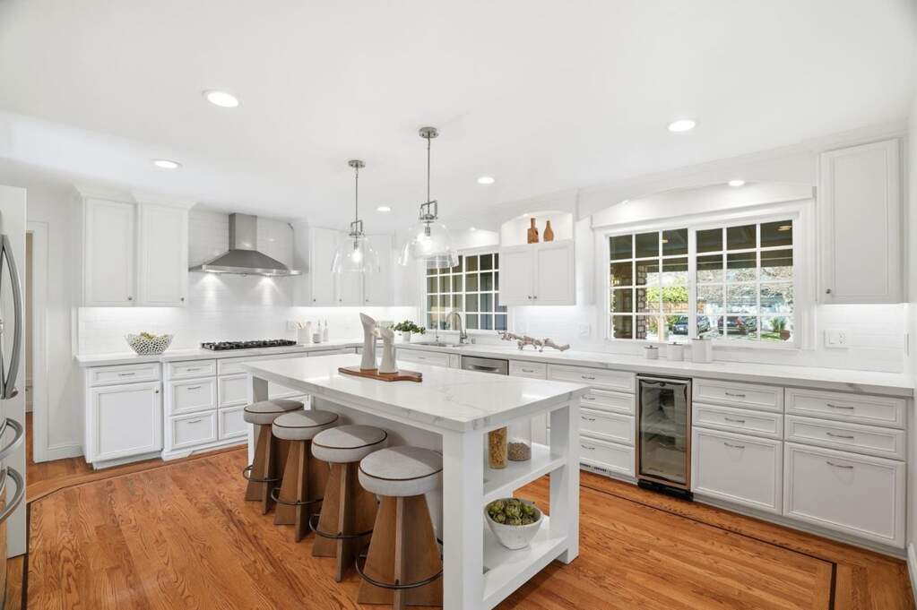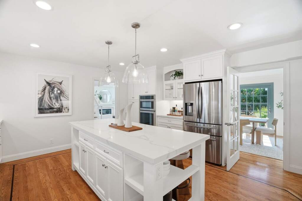 Fully remodeled throughout and perfectly positioned in prestigious Dry Creek Estates, known for its tree-lined streets and underground utilities, this bright home blends elegant entertaining with everyday comfort. The main level features a living room with fireplace and an expansive chefs kitchen with quartz countertops, large center island, gas range, and incredible storage. Formal dining opens directly to the backyard for seamless indoor-outdoor living. The flexible downstairs layout includes two full bathrooms plus a standout den with en-suite bath and kitchenette. French doors lead outside, making it ideal for in-laws, guests, after-pool lounge, or secondary family room. Upstairs offers 4 spacious bedrooms, including a generous primary suite with bonus room perfect for an office or future walk-in closet, plus a newly remodeled hall bath and updated primary bath. Enjoy a private backyard retreat with a pool positioned at the corner to preserve yard space, plus covered patio and lush lawn. Ideally located and assigned to Booksin Elementary, minutes to Downtown Willow Glen and Campbell, with convenient access to major commute routes. Upgrades include owned solar, 200-amp panel, copper plumbing, newer ducting and A/C, and a finished garage with epoxy floors and recessed lights.