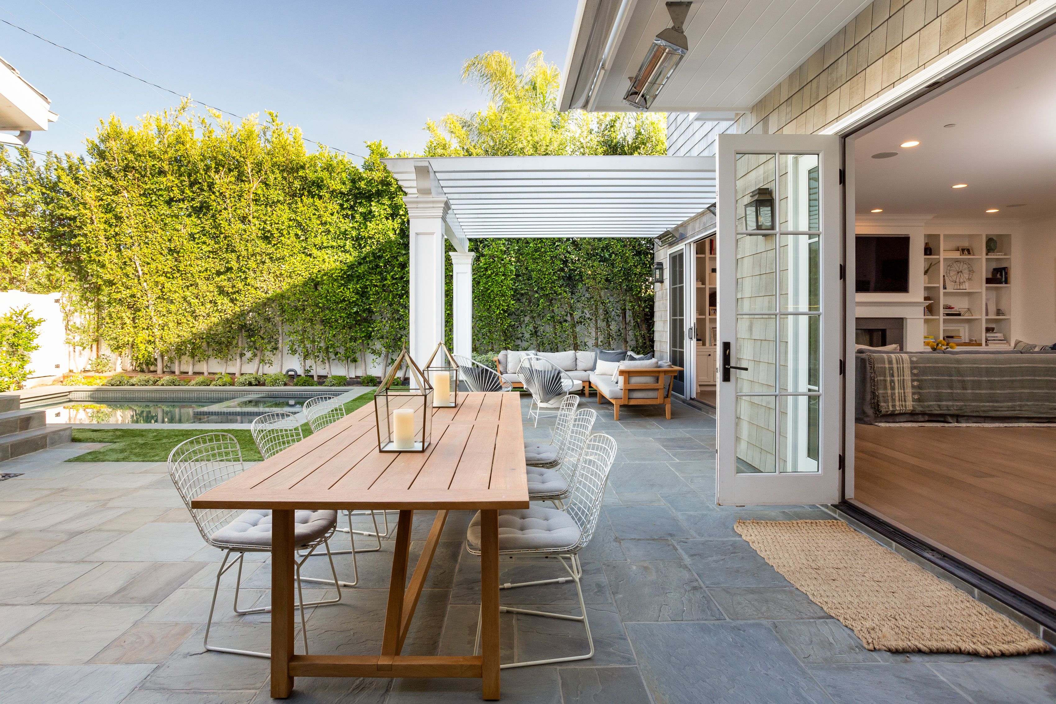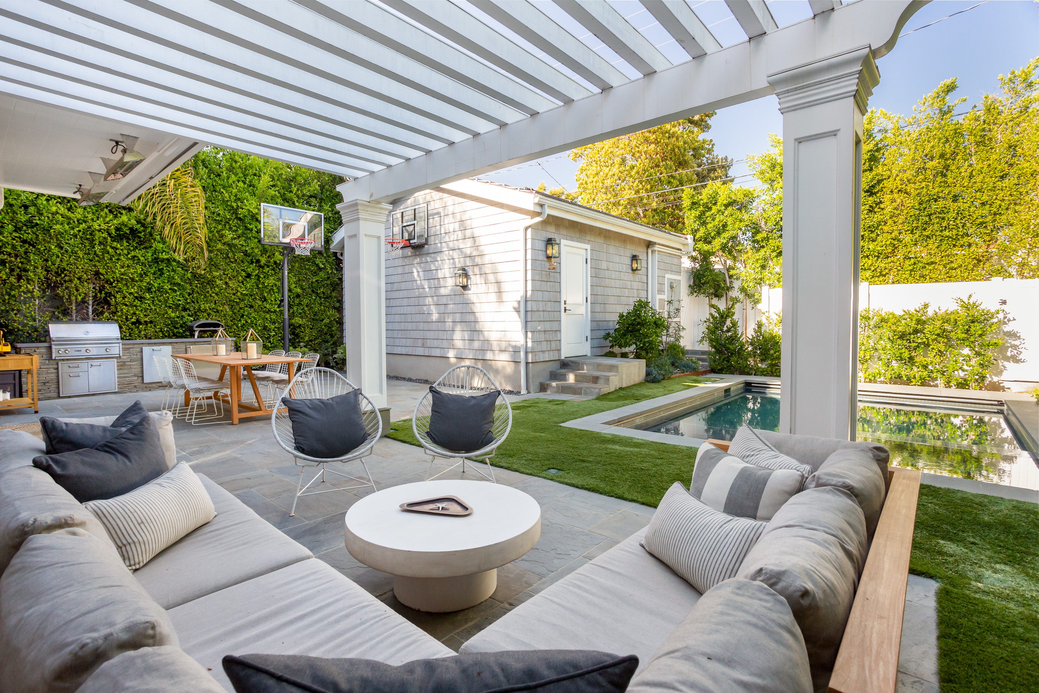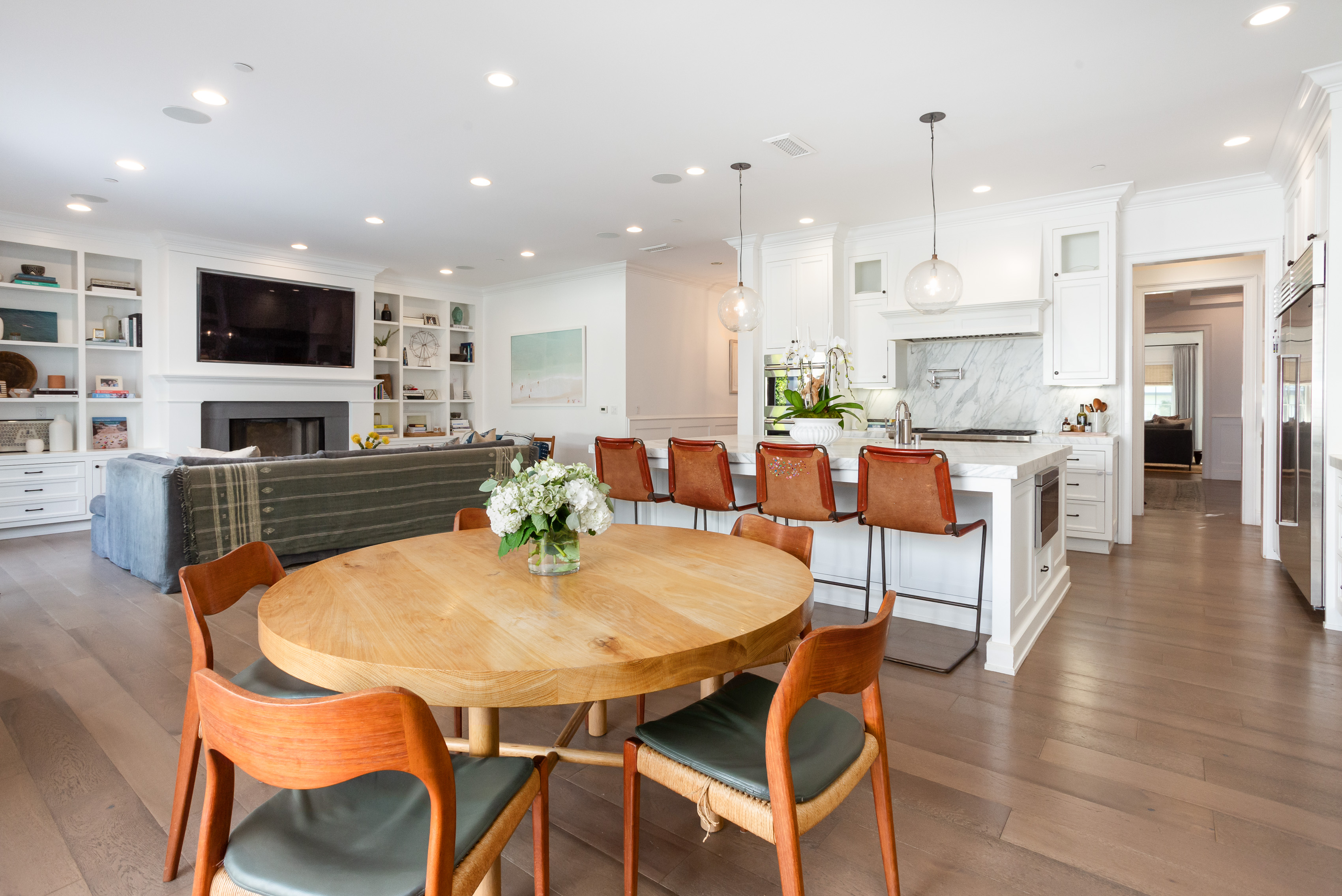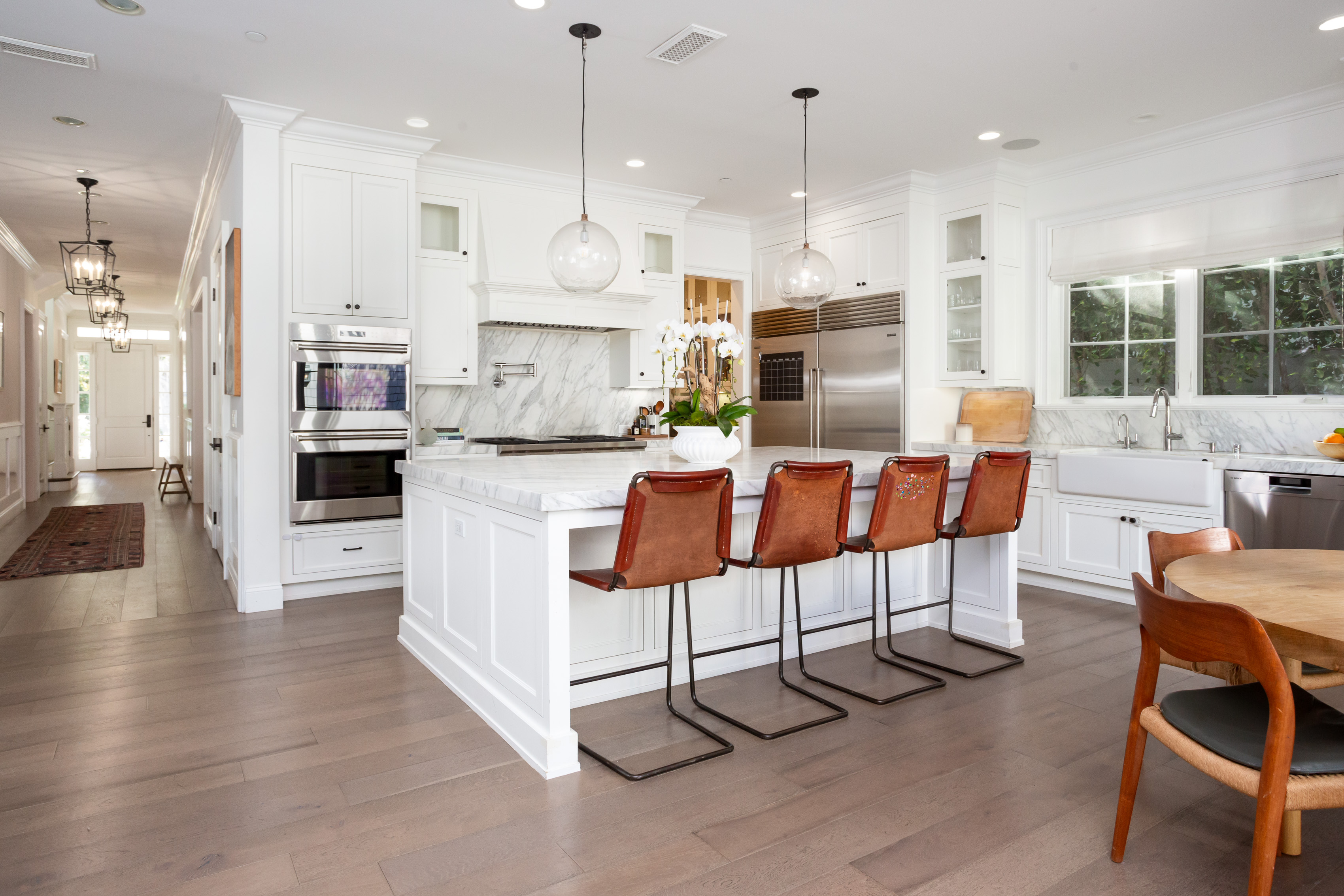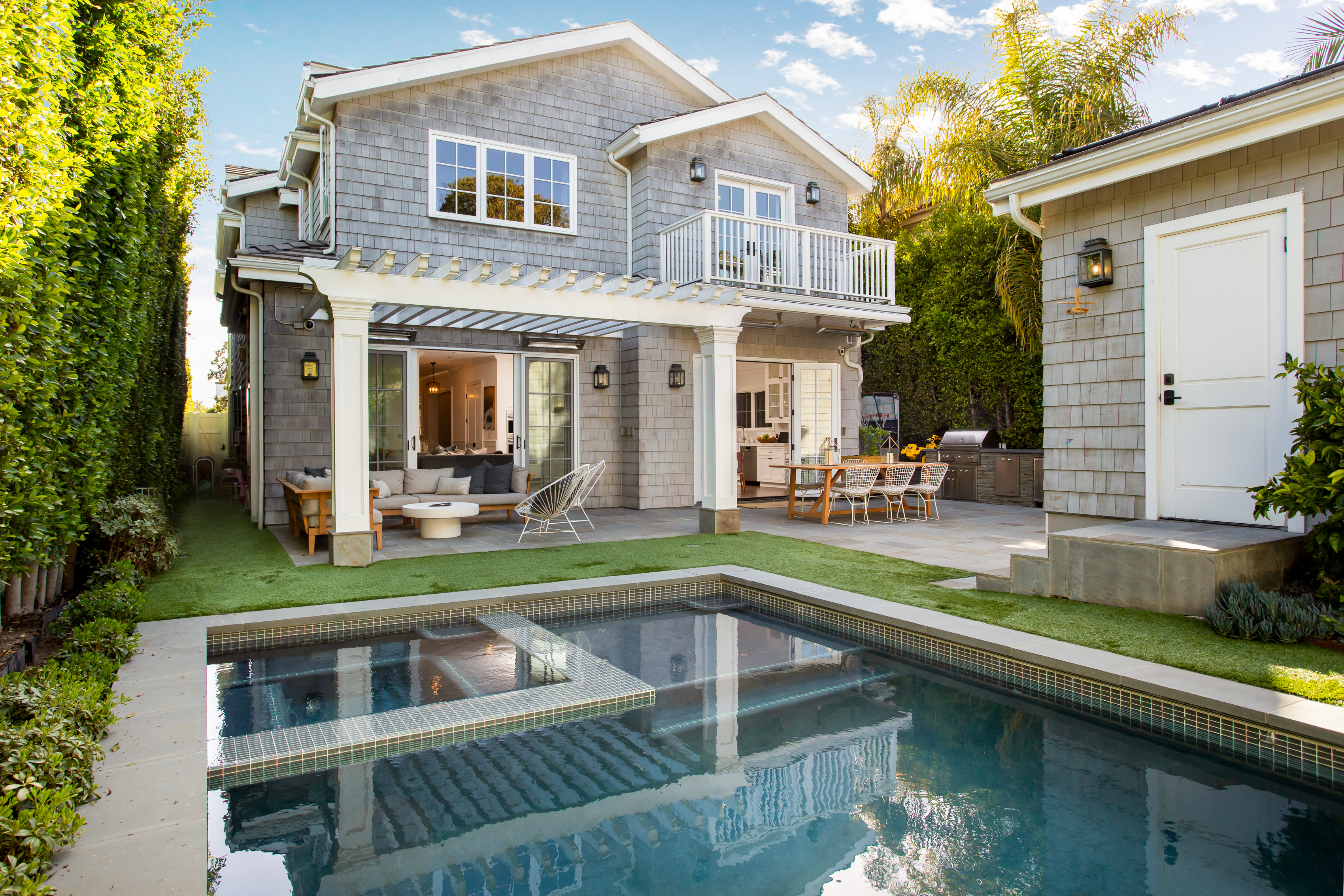 Meticulously crafted by Hal Klein's Fountainhead Homes and Amber Interiors, this stunning custom 5 bedroom 5.5 bath is perfectly situated in prime North of Montana location. Featuring hardwood floors and streaming light throughout. Beautiful formal living room with fireplace and traditional detail. Formal dining room with coffered ceilings and wainscoting. Breezy open plan eat-in kitchen with carrara marble countertops and island, adjacent family room and additional fireplace. Sliding doors open private yard with outdoor kitchen, living room area, and gorgeous pool with spa. Upstairs, a well appointed primary suite includes oversized bath with soaking tub and rain shower. Four additional en-suite bedrooms with custom built-ins and classic high-end tile work and fixtures. Property includes a two car garage and green lawn behind front gate. A short stroll to all of the boutiques and restaurants of Montana Avenue, and an idyllic neighborhood with wide sidewalks and mature trees, only 11 blocks to the bluffs. Offers due Wednesday March 18th at 3 PM. First showing Saturday.