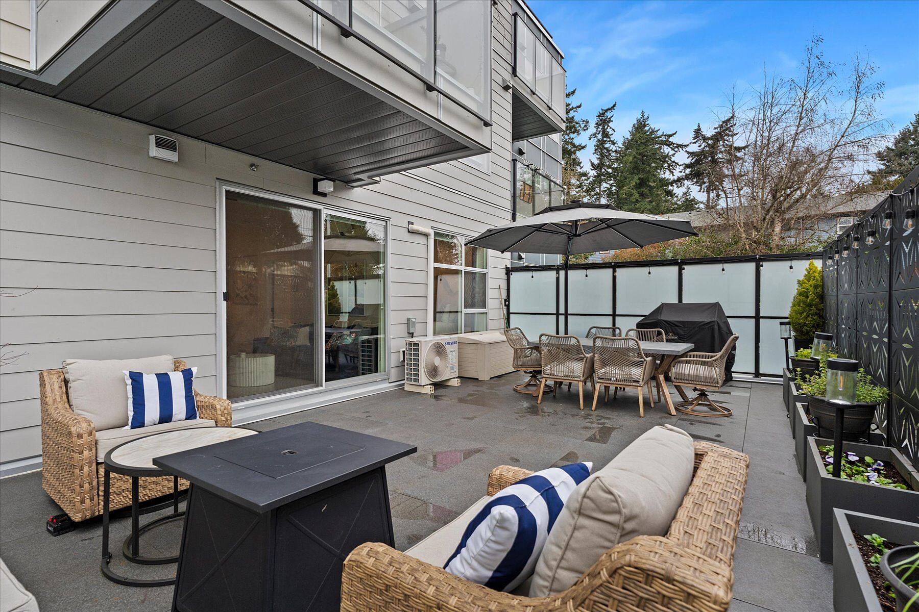 Ultimate Outdoor Living Oasis! Discover this rare two bed two bath and den condo, offering a coveted ground-level lifestyle that feels more like a townhome. The undisputed star of the show is the massive private patio, a year-round outdoor living room perfect for dining, lounging, and gardening, propane BBQ, tables and heaters allowed. Inside, the open concept living provides private separation between the two bedrooms. Enjoy year-round comfort with an efficient heat pump providing both A/C in summer and heat in winter, plus heated floors in the primary bath. A versatile den can be your office, gym, or nursery. This is an unbeatable location, offering exceptional walkability to groceries, shops, and restaurants, direct access to trails. Pet friendly and offers a dog wash and fenced dog run. Includes one parking spot (number six) and Storage Unit (number thirteen), with the option to rent a second spot. Move-in ready with fresh paint and modern comforts, this is a must-see home.