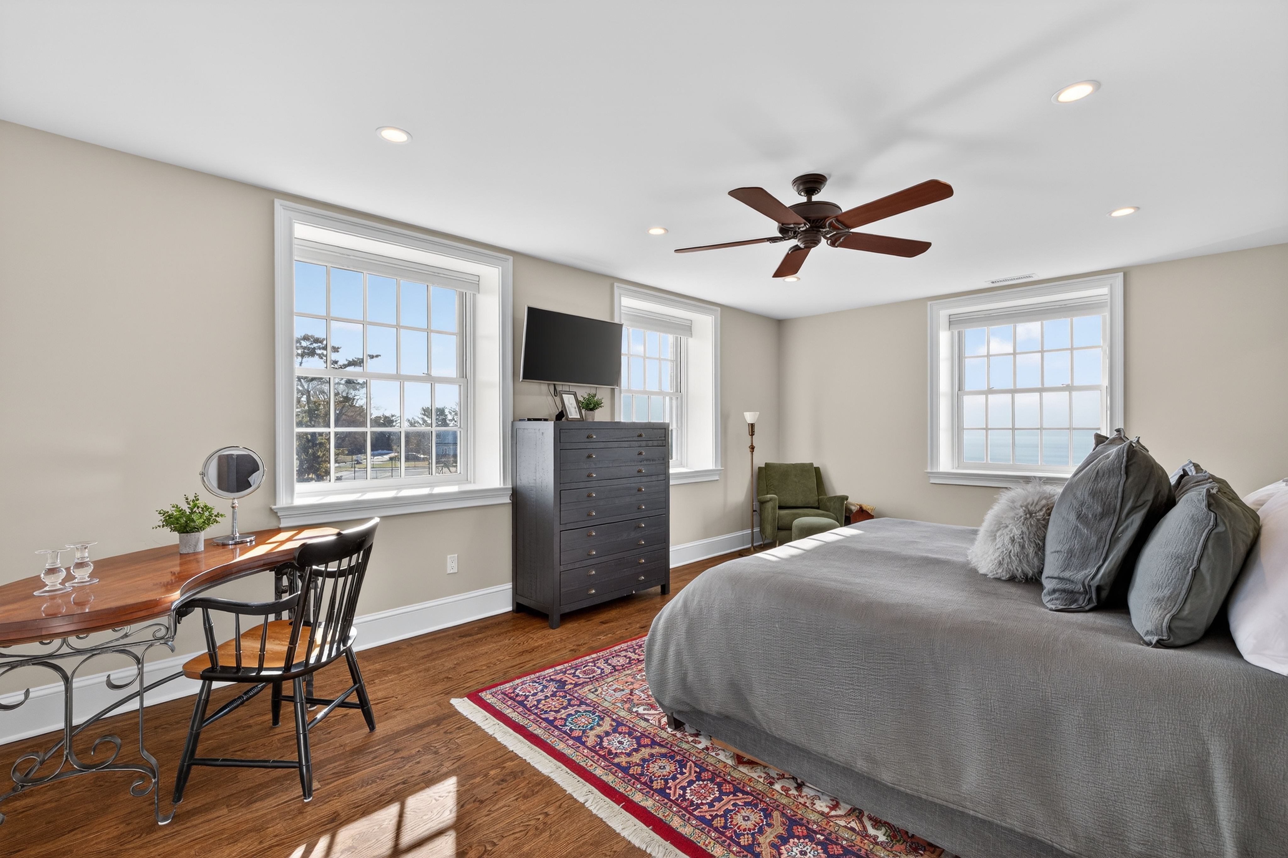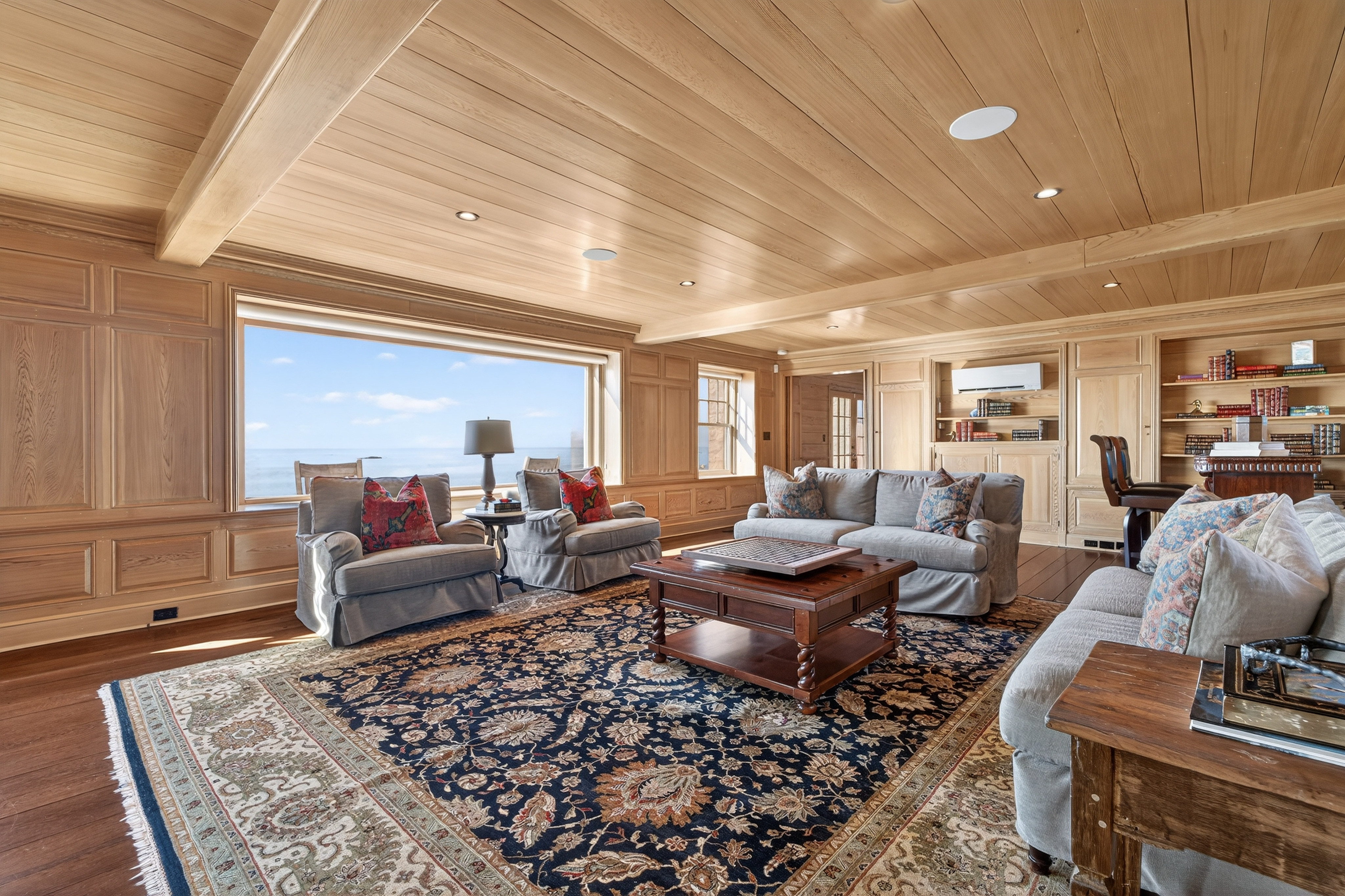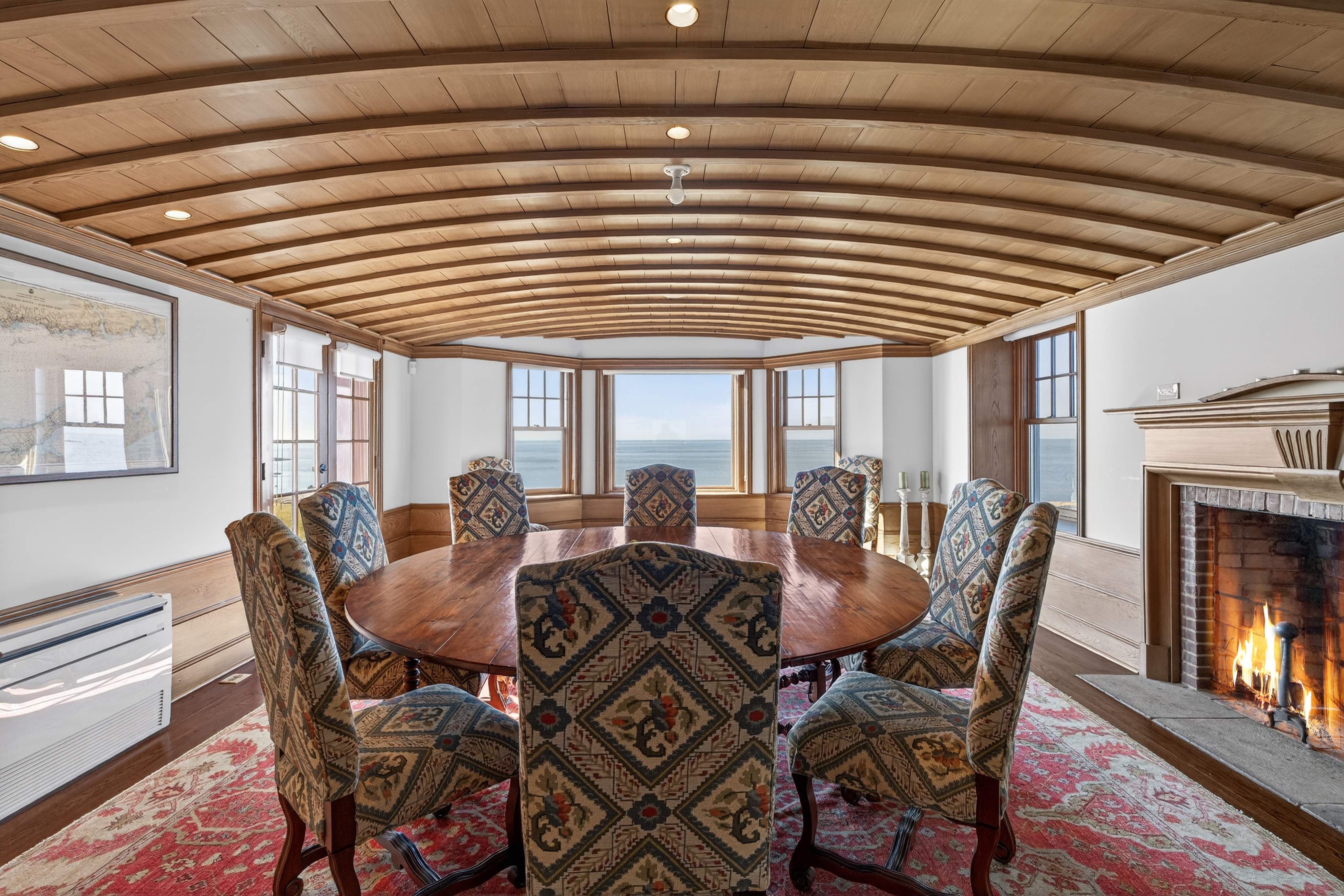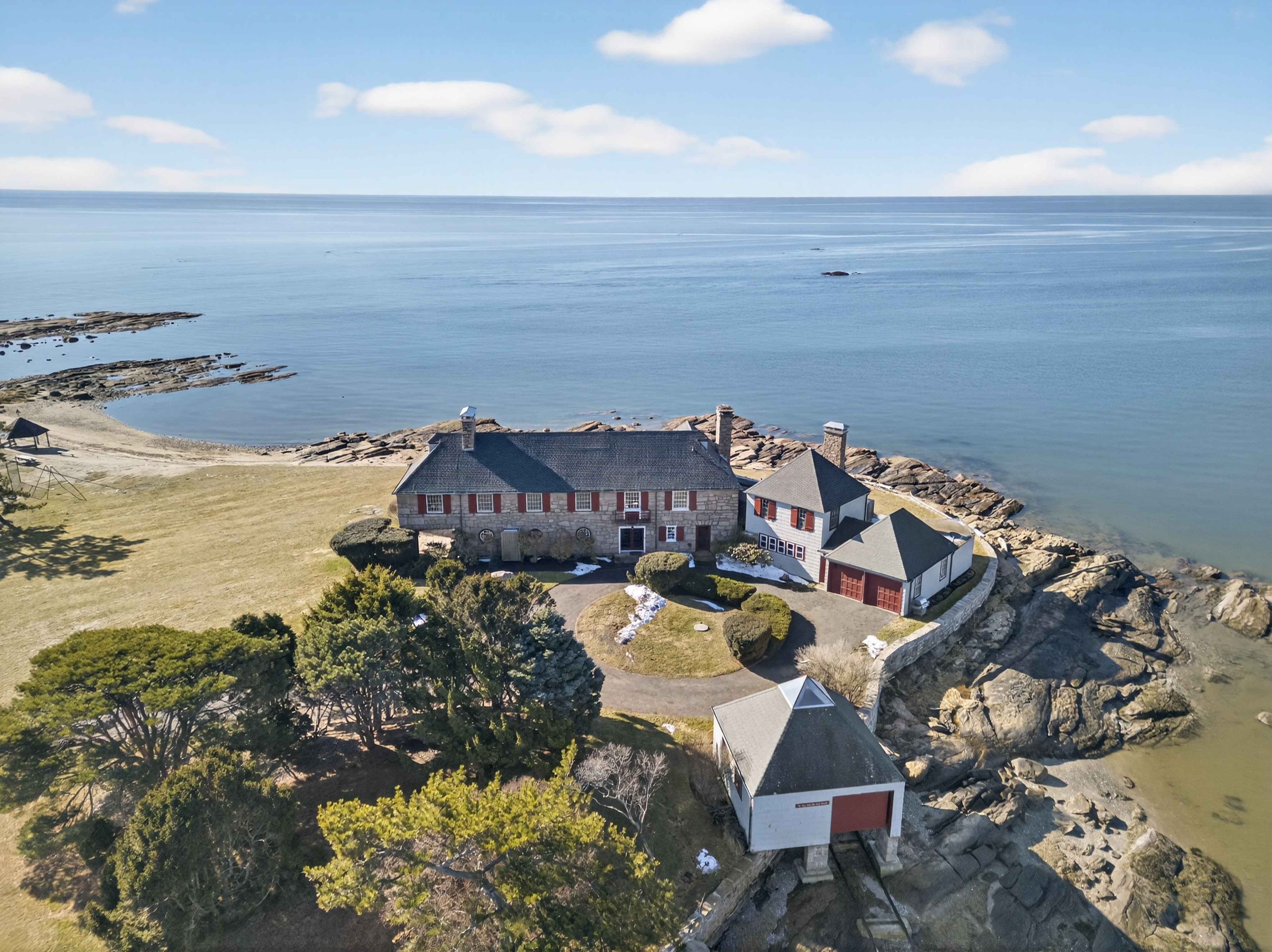 Where New England architecture meets timeless elegance! Experience the pinnacle of shoreline living in this spectacular waterfront estate, perfectly positioned on a private, peninsula-like setting in Sachem's Head community. Boasting breathtaking, panoramic views of Long Island Sound, this 1930s residence is a masterwork of historic character and unique architectural artistry. The home's rich heritage is reflected in its exquisite details, from the enduring beauty of Stony Creek Granite and warm Pecky Cypress woodwork, to the original "porthole" windows in the grand family room. In the formal dining room, a distinctive ribbed ceiling, designed to evoke the overhead of a classic ship's cabin, creates an unforgettable atmosphere for entertaining. The heart of the home features a generous galley kitchen that balances functionality with style, offering abundant cabinetry, expansive counter space, and dining area with plenty of windows making sure no view is missed. Retreat to the second floor to find six spacious bedrooms, each offering its own unique perspective of the water, while the finished third-floor "flex" space serves as an ideal game room or private sanctuary. Spread across two manicured acres, enjoy relaxed seaside living with multiple sun porches and expansive patio for gatherings. Take advantage of the Vineyard Place Association amenities, all while being just a short drive from charming downtown Guilford!
