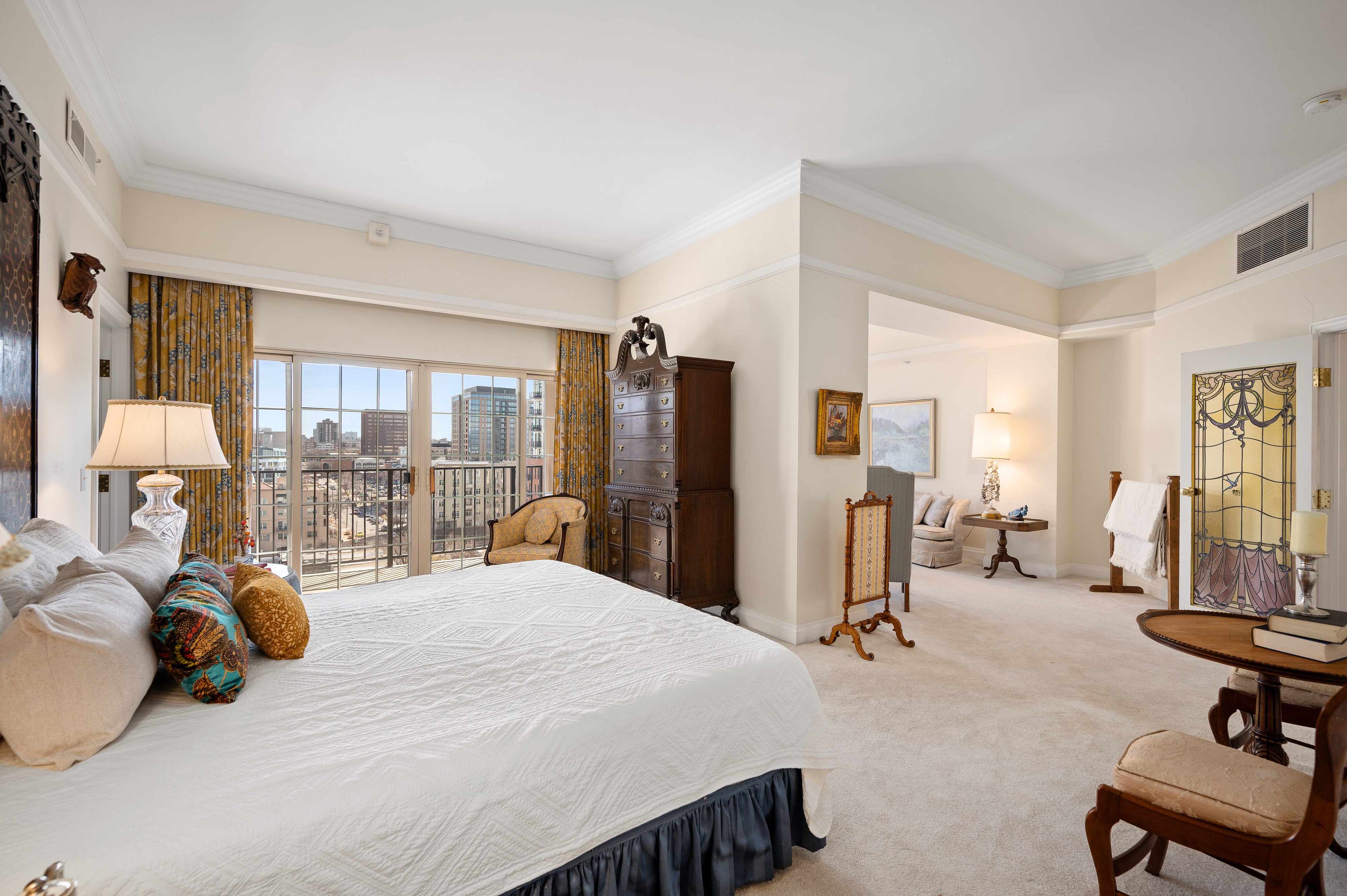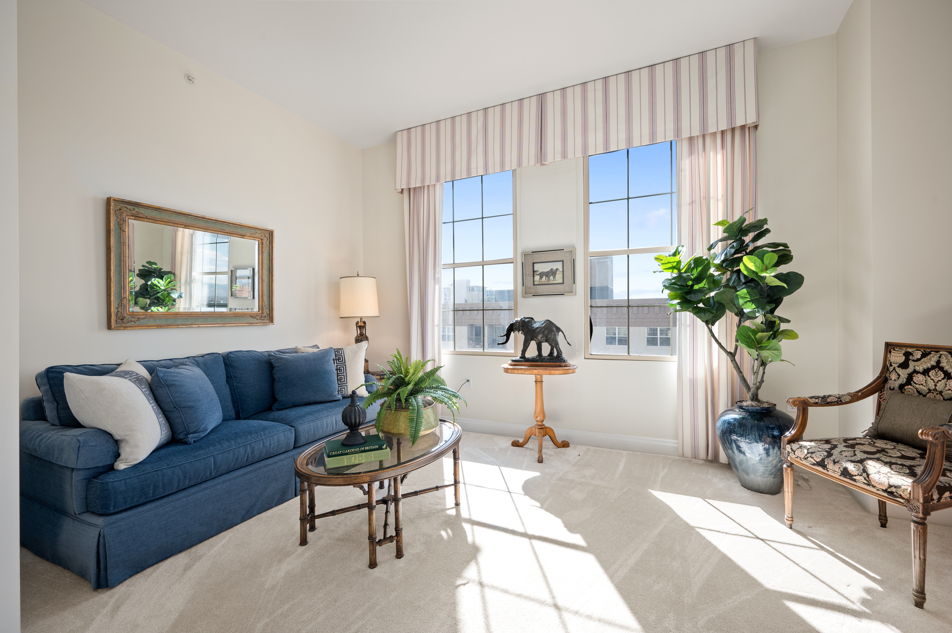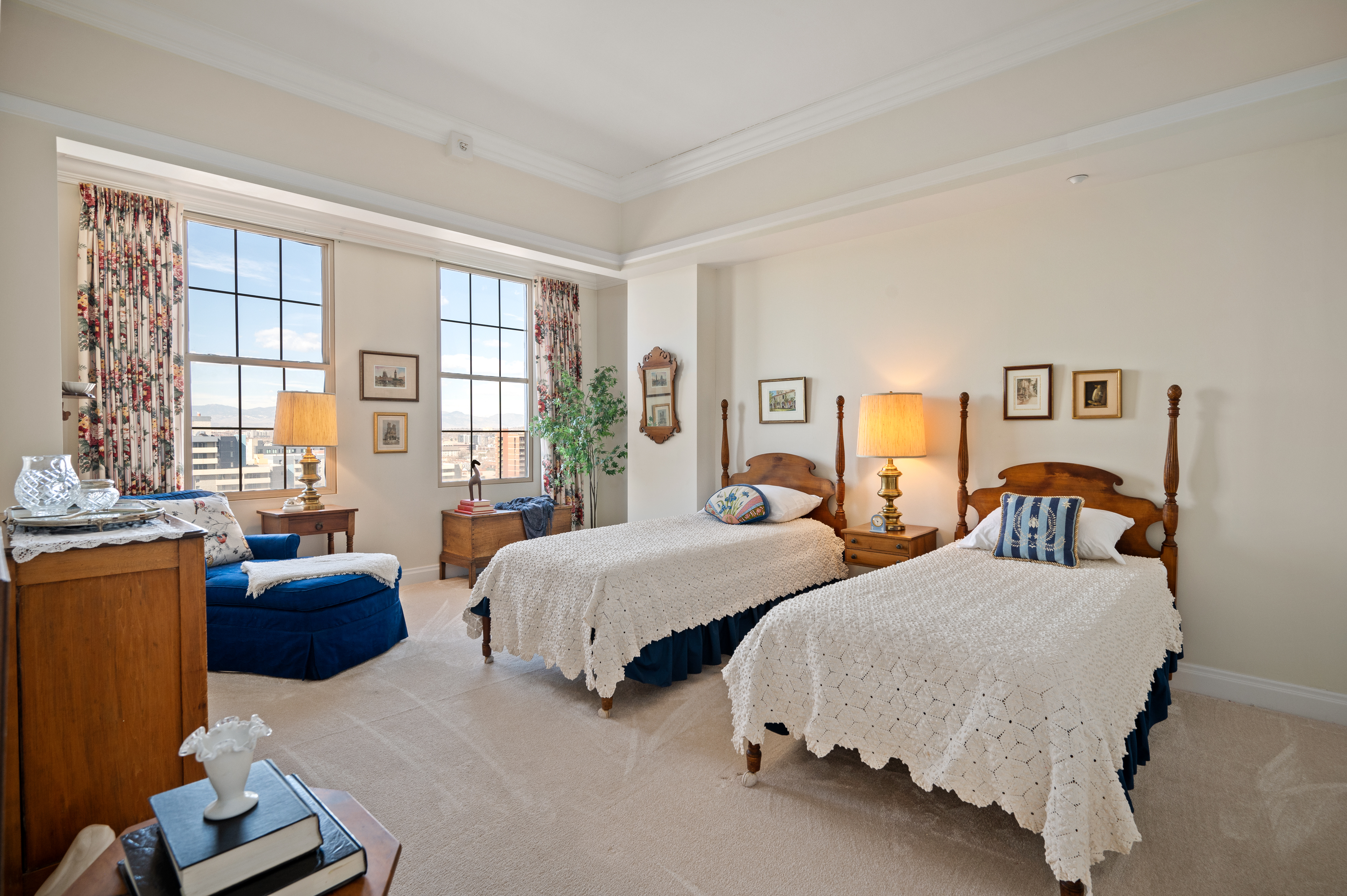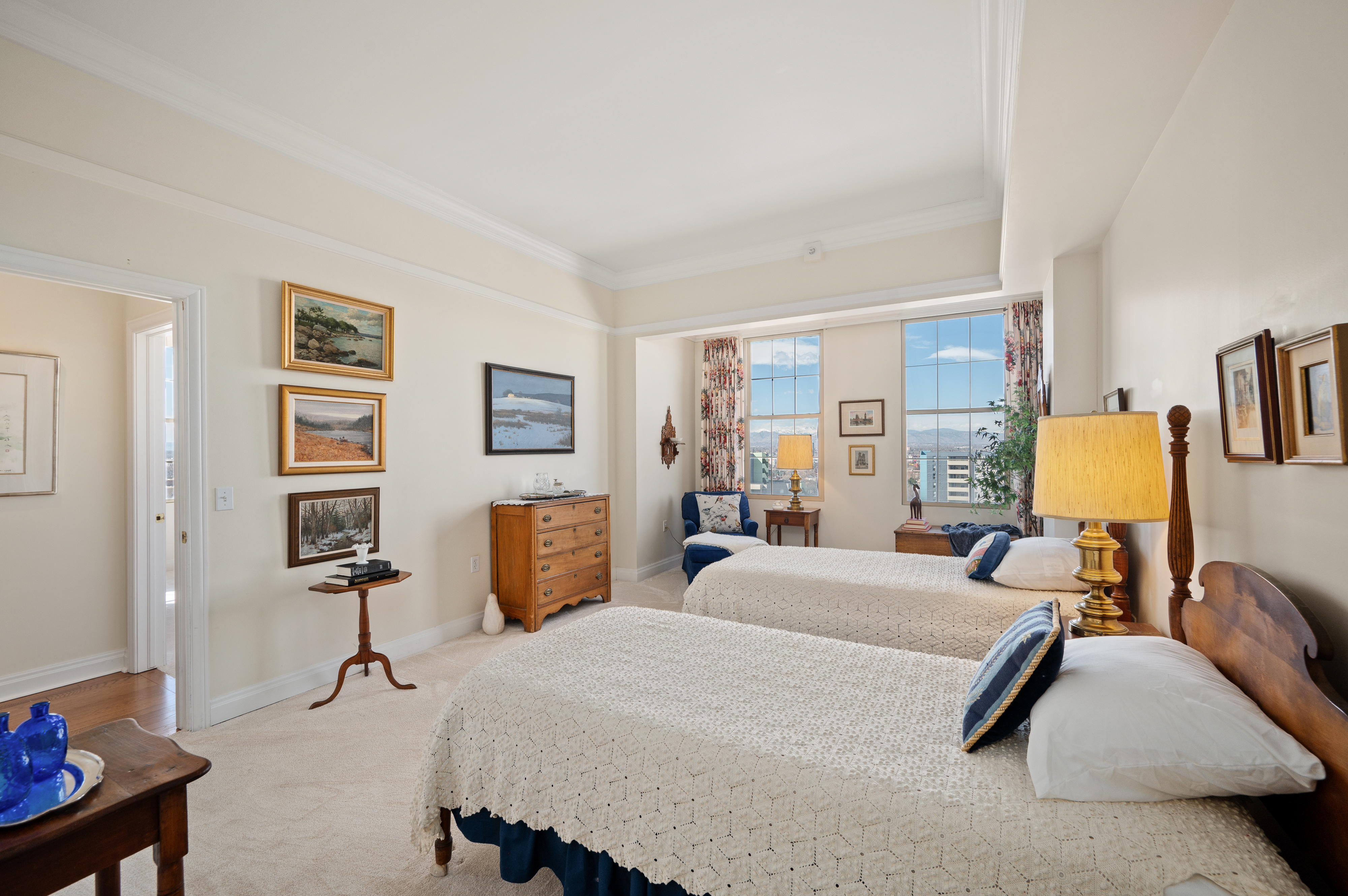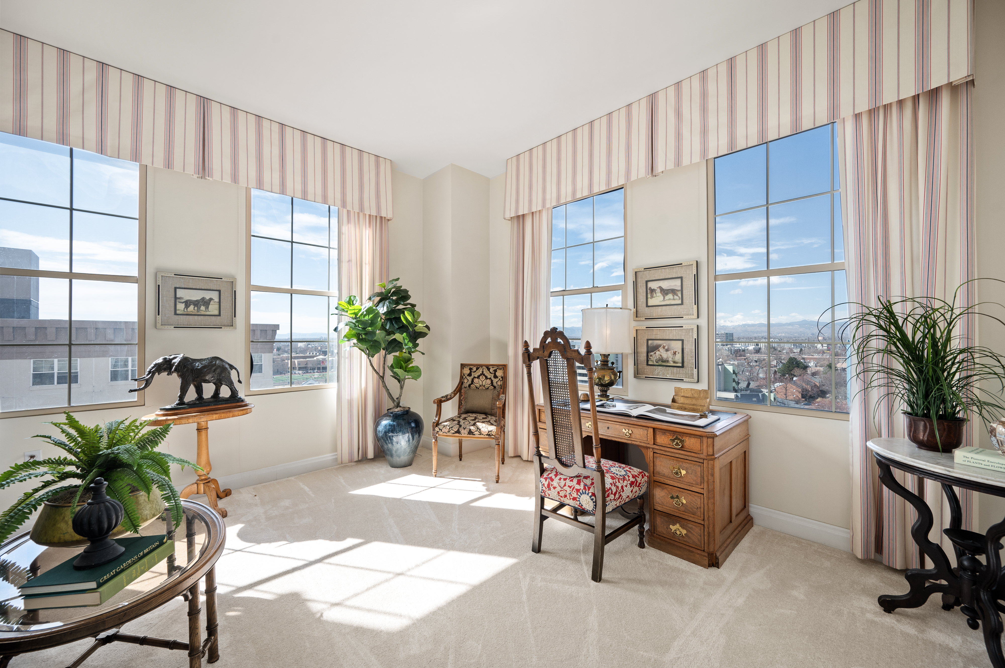 Brilliantly elegant 10th floor end-unit in the heart of The Golden Triangle. Luxury abounds in this pristinely detailed unit with high-end design elements throughout, including built ins, custom crown-molding and trim, floorplan modifications to create tastefully defined living spaces, and lofty mountain and city views. The Belvedere stands as a modern example of classic and exquisite design, and this unit matches the vibe of the building perfectly, melding timeless luxury living with modern conveniences. Enjoy two new HVAC heat pump units, newer hardwood flooring, high-end carpet, two balconies, and 270° views from 3 sides of the building. Spectacular primary suite with french doors, 5-piece bath, several closets, a private library/sitting area, and sliding doors to a private balcony. The grand light-filled living room is anchored by a stately fireplace. The formal dining room connects to the kitchen and boasts inspiring views and sliding doors to a large balcony. Two additional bedrooms, another 3/4 bath, and a second study/office/sitting area complete the floorplan. The building roof was recently replaced. This unit transfers with 2 garage parking spaces and 2 combined storage cages. Walkable to top-tier museums, restaurants, Denver Central Library, Downtown, many shops, and just steps from the Cherry Creek bike path. Welcome home to a sparkling and sophisticated retreat, truly above it all.