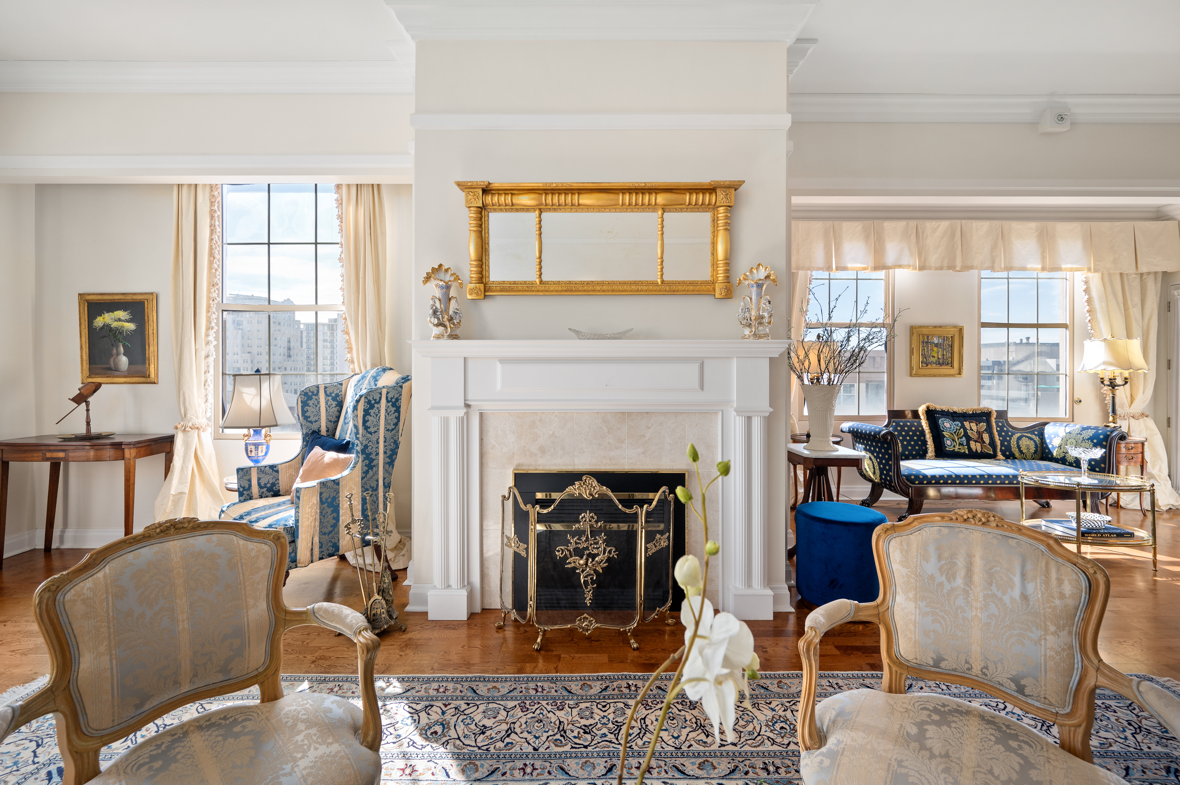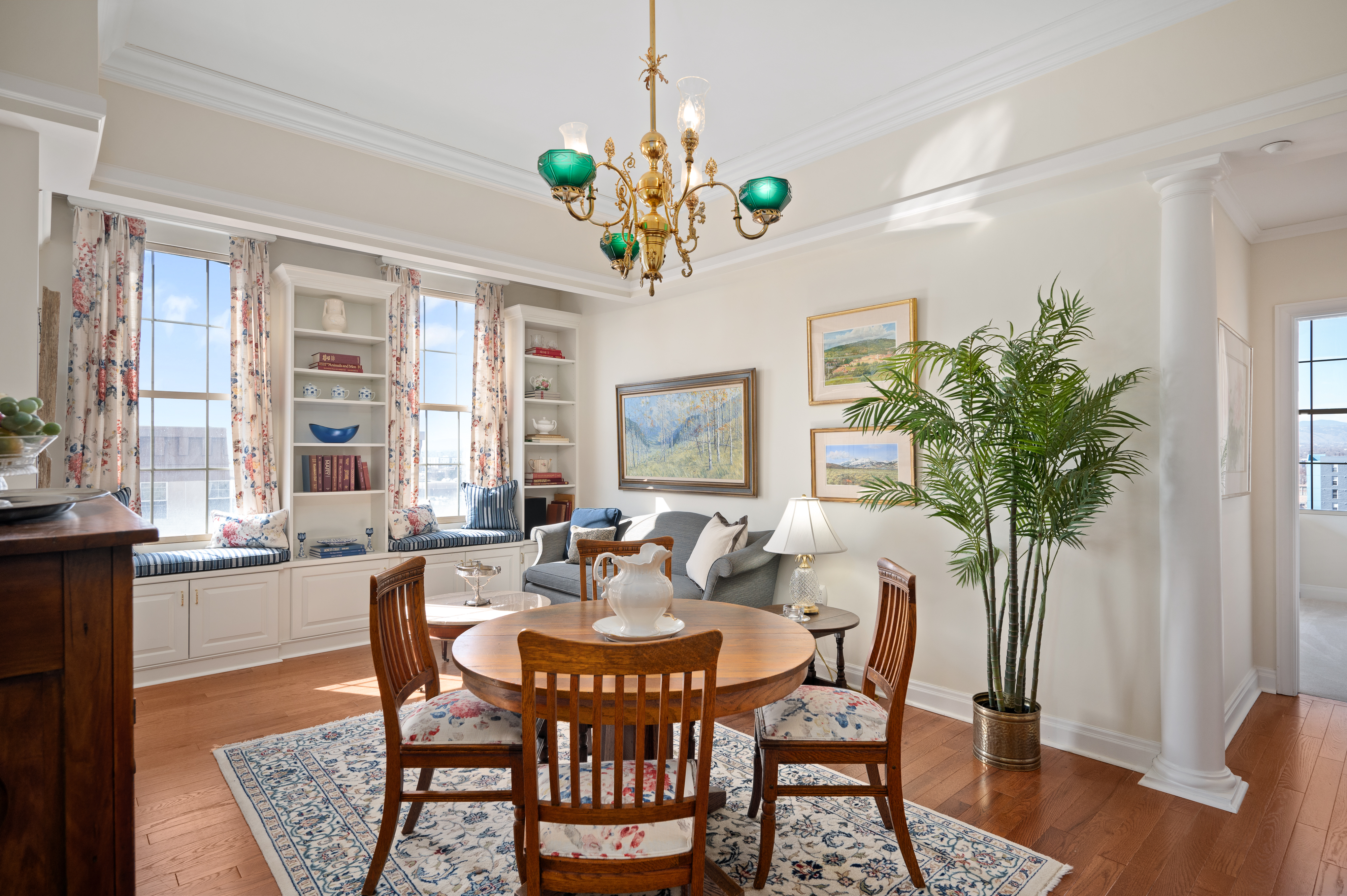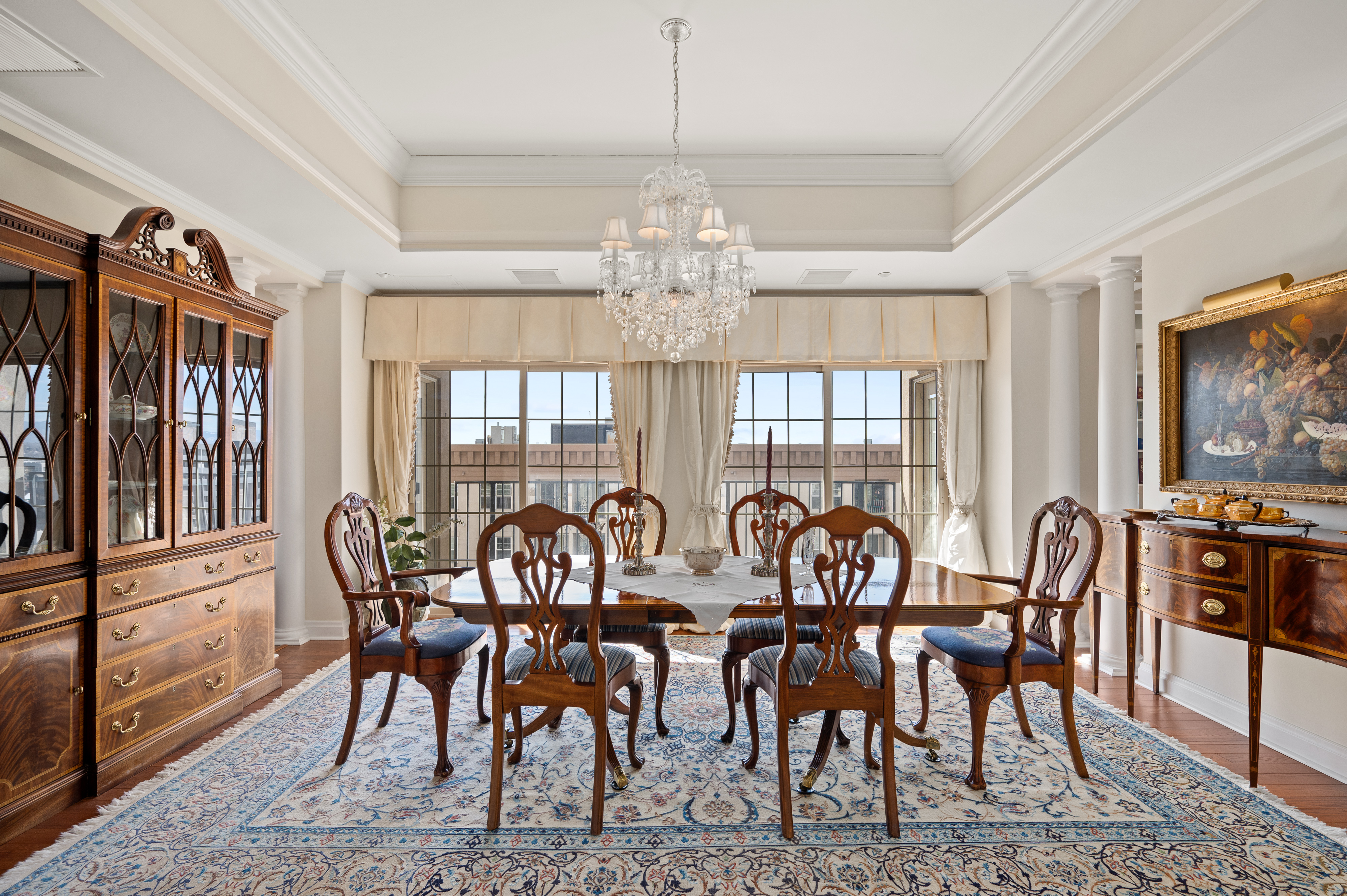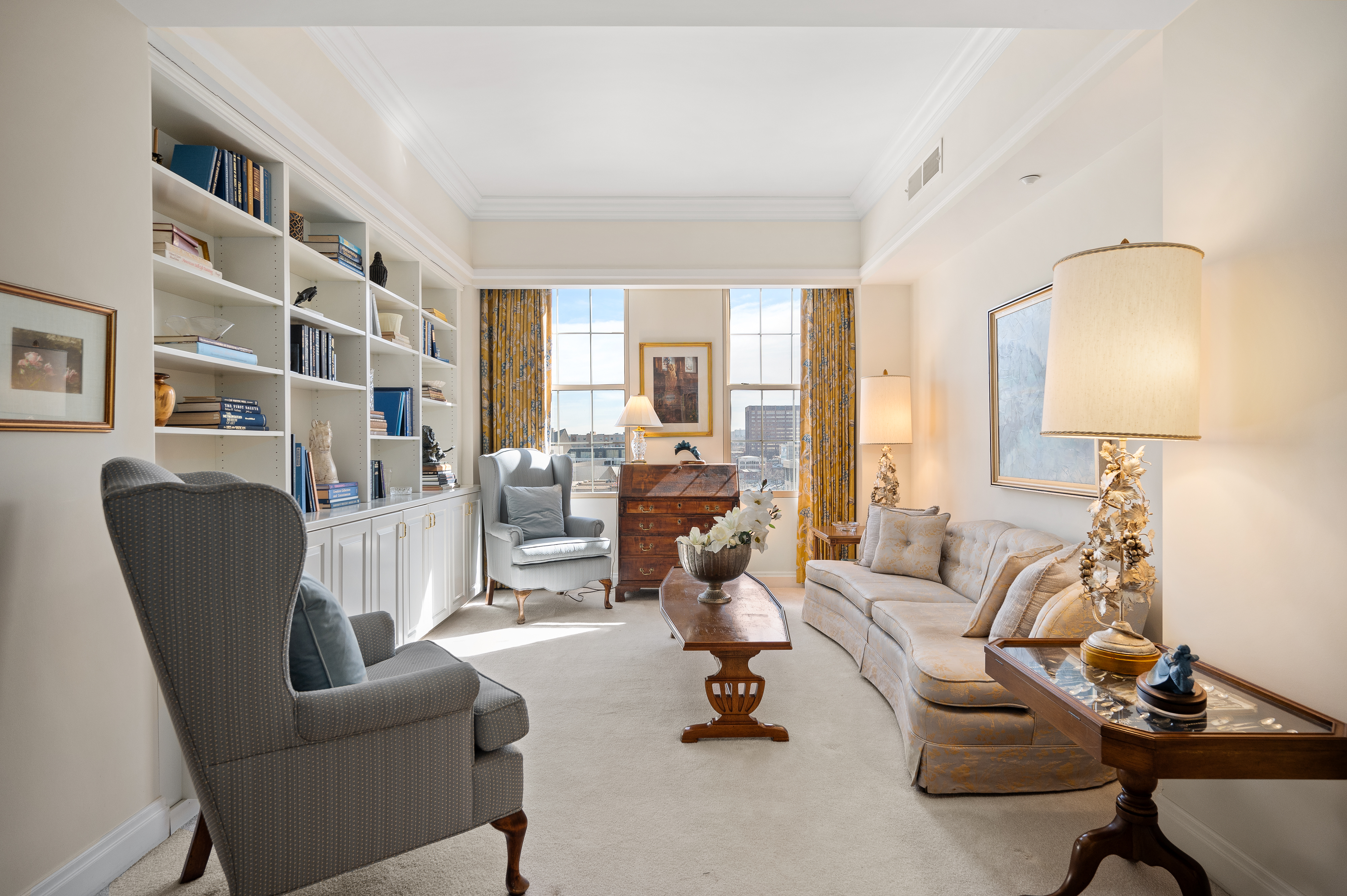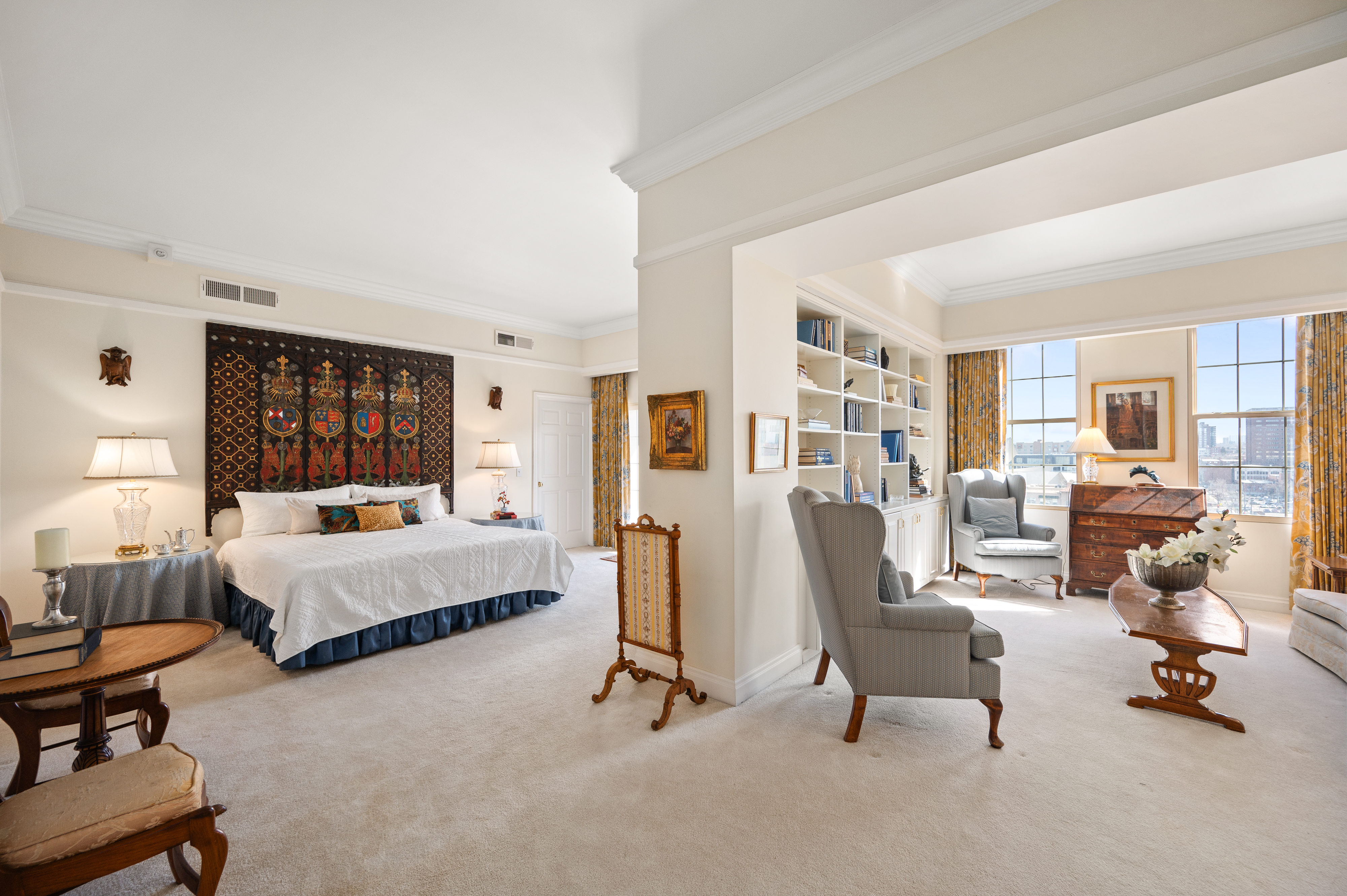 Brilliantly elegant 10th floor end-unit in the heart of The Golden Triangle. Luxury abounds in this pristinely detailed unit with high-end design elements throughout, including built ins, custom crown-molding and trim, floorplan modifications to create tastefully defined living spaces, and lofty mountain and city views. The Belvedere stands as a modern example of classic and exquisite design, and this unit matches the vibe of the building perfectly, melding timeless luxury living with modern conveniences. Enjoy two new HVAC heat pump units, newer hardwood flooring, high-end carpet, two balconies, and 270° views from 3 sides of the building. Spectacular primary suite with french doors, 5-piece bath, several closets, a private library/sitting area, and sliding doors to a private balcony. The grand light-filled living room is anchored by a stately fireplace. The formal dining room connects to the kitchen and boasts inspiring views and sliding doors to a large balcony. Two additional bedrooms, another 3/4 bath, and a second study/office/sitting area complete the floorplan. The building roof was recently replaced. This unit transfers with 2 garage parking spaces and 2 combined storage cages. Walkable to top-tier museums, restaurants, Denver Central Library, Downtown, many shops, and just steps from the Cherry Creek bike path. Welcome home to a sparkling and sophisticated retreat, truly above it all.