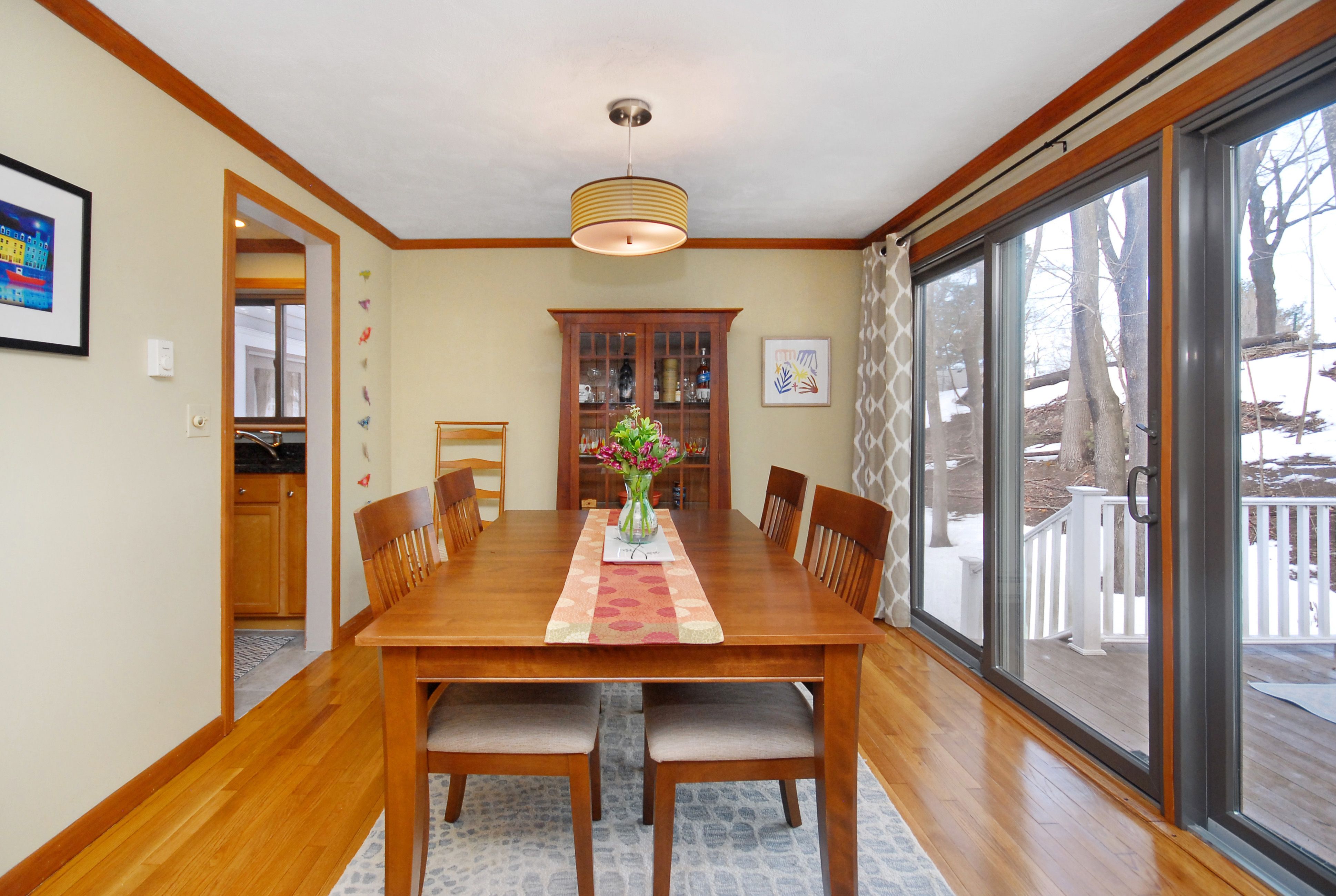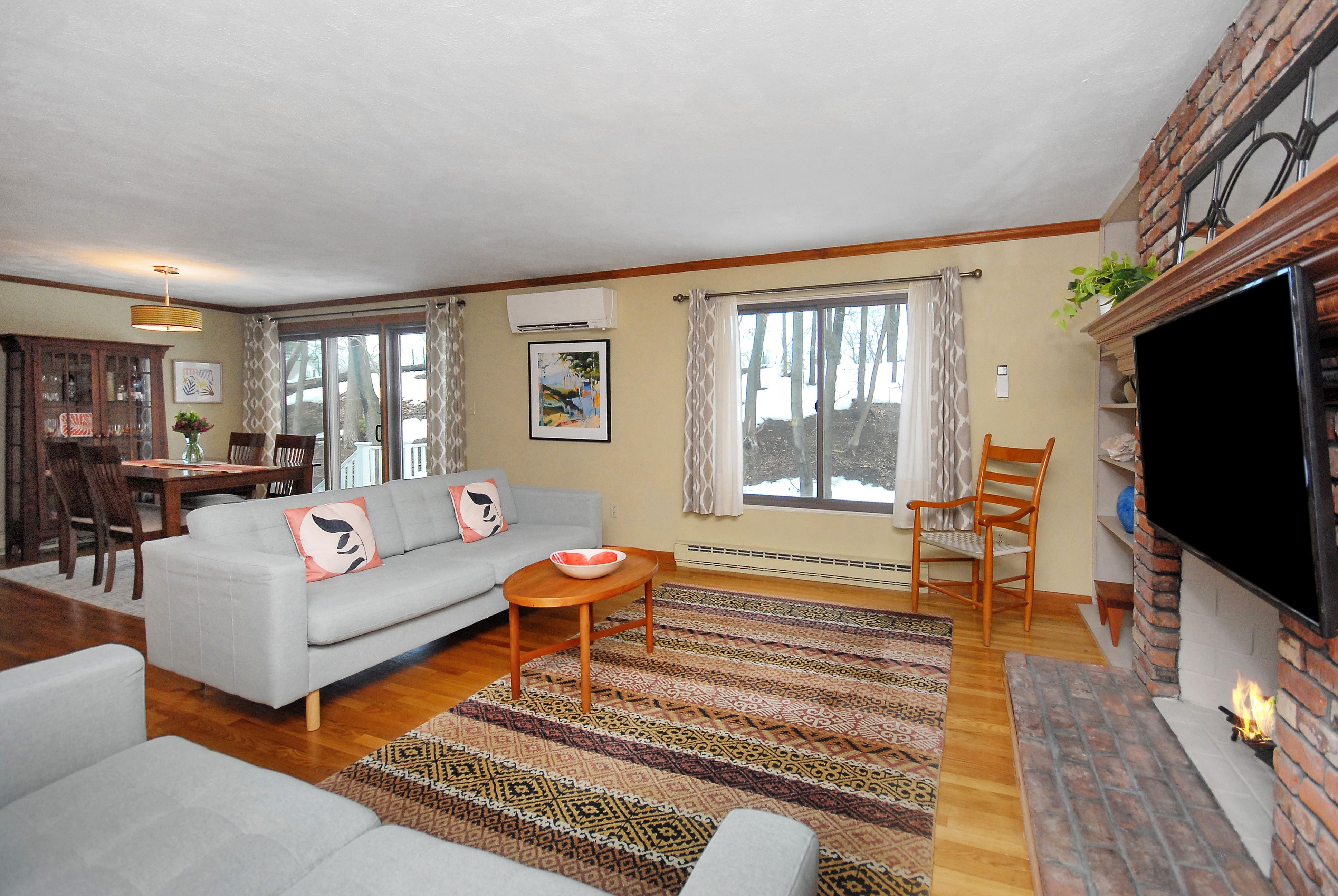 Impressive Three level West Concord Village Townhouse near the train, boutiques, Fowler library, sumptuous restaurants and Rideout playground. This Sunfilled home in impeccable condition has a brick wood burning fireplace, two oversized picture windows, hardwood floors, and is enhanced by the nearby dining alcove with glass slider leading to an extra-large private deck. Sunny, sunny, sunny. Nearby is an up-scale kitchen with stainless steel appliances, warm granite counters, and plenty of attractive cabinetry. The second level spacious primary bedroom has 2 closets, 2 picture windows with sunny views, the second bedroom is perfectly sized with tree top views. Nearby is a beautiful full bath. You'll appreciate the Dedicated laundry room. The lower-level foyer has a handyman workshop closet, a large family room with 2 closets, and an office/studio. Both lower-level rooms have new carpeting & freshly painted. This home feels like a single-family with lots of room to spread out.