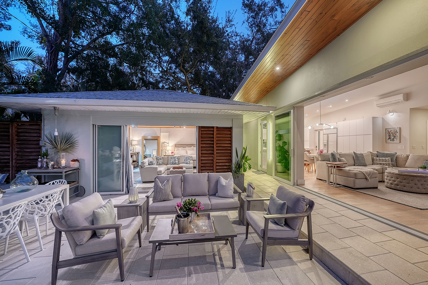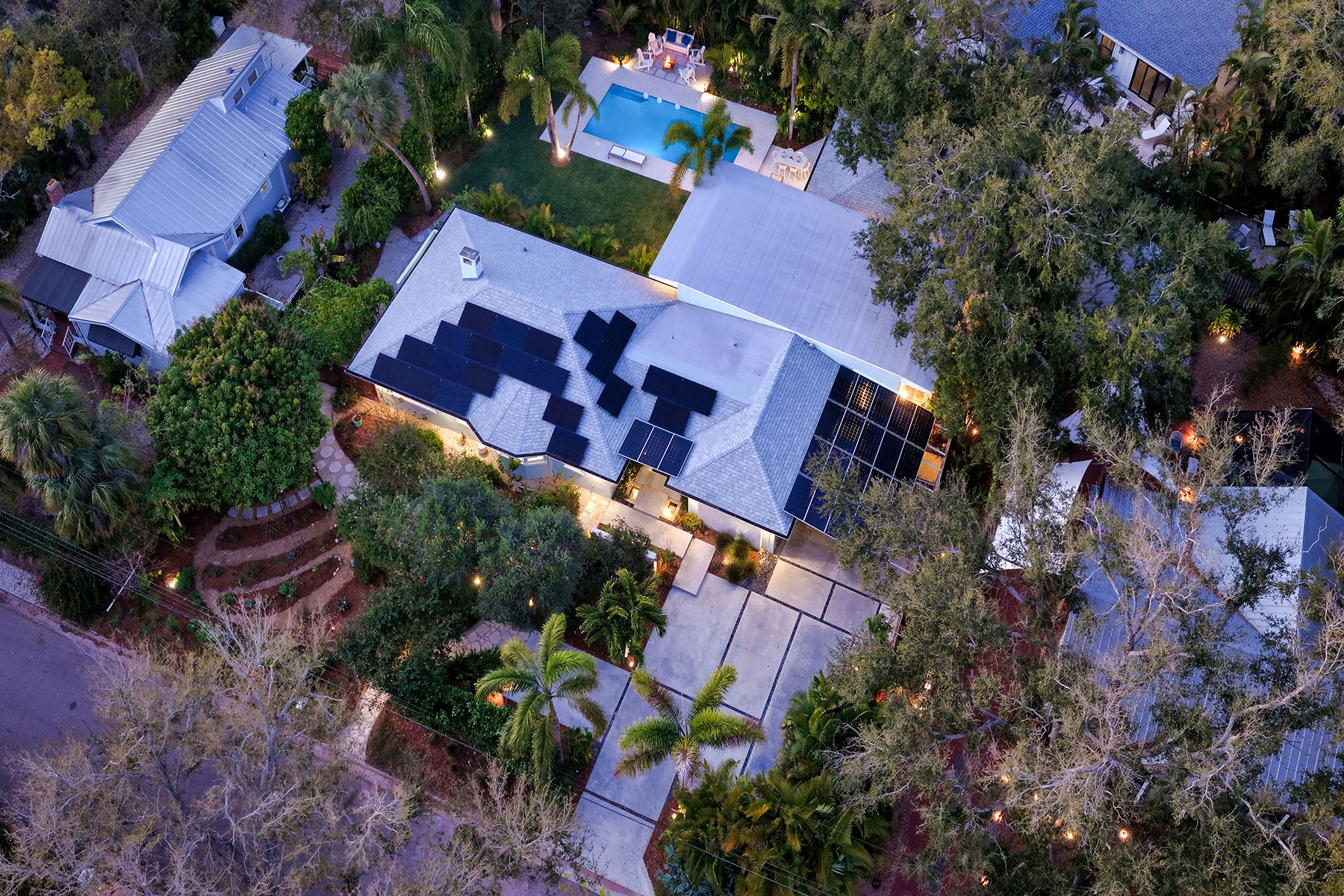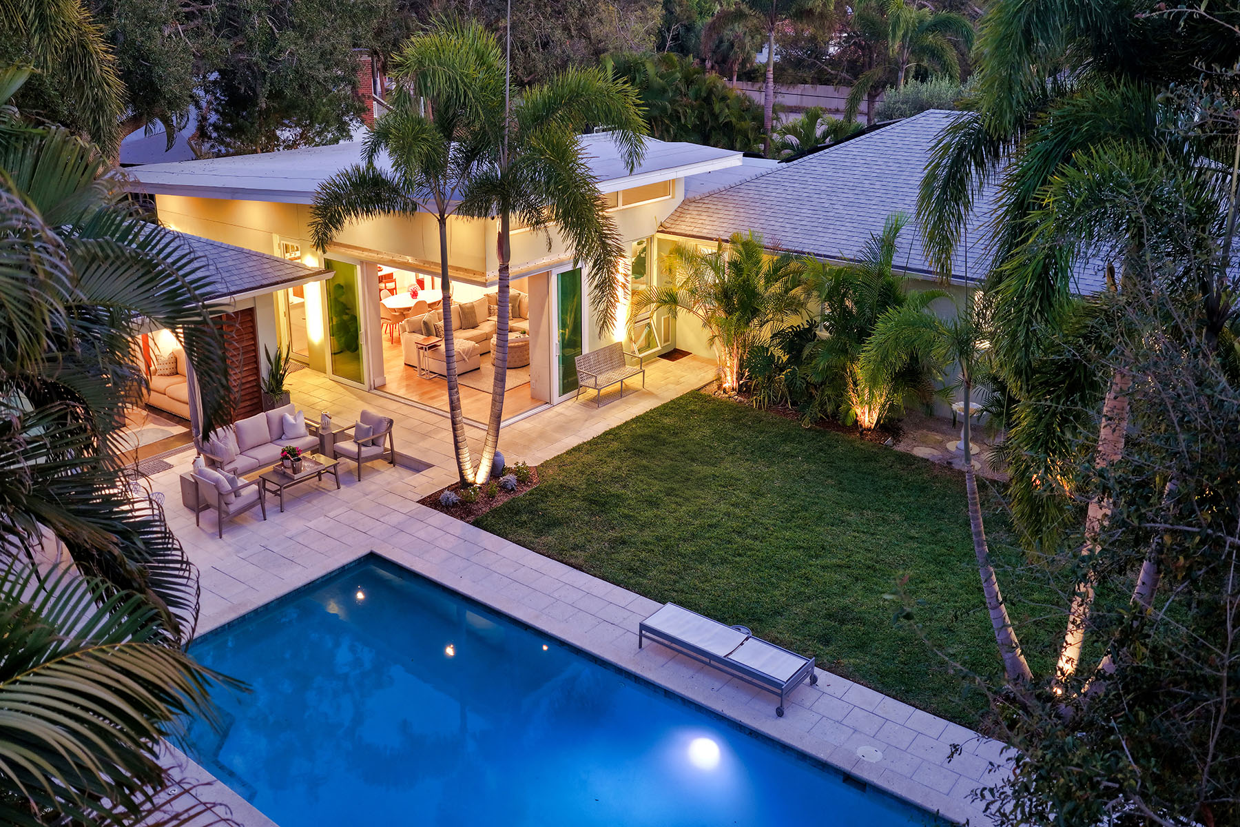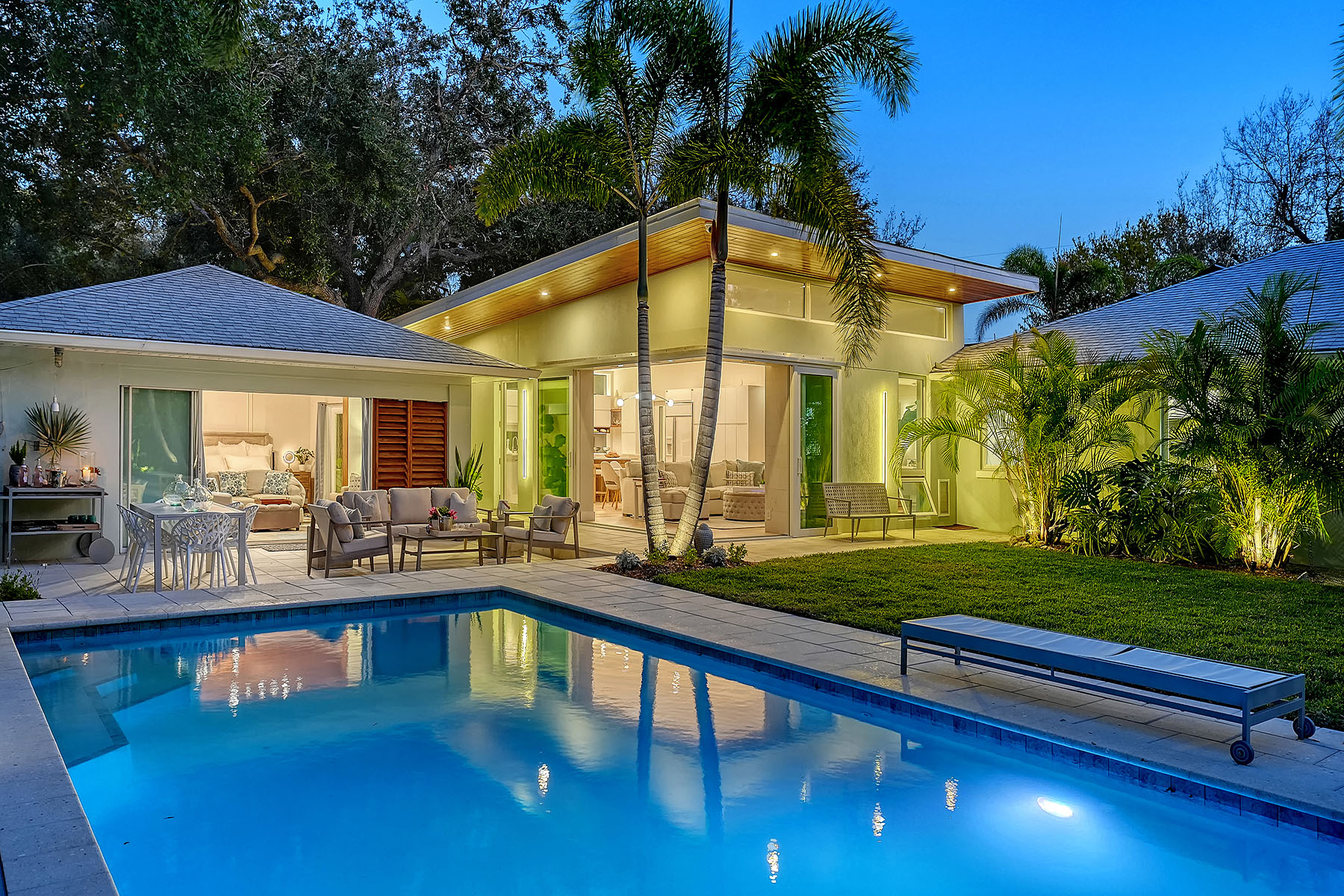 If you've been searching for a Sarasota West of Trail oasis, quiet, private, accessible and beautifully updated, this McClellan Park residence brings together the features discerning West of Trail buyers value most, a large .34-acre lot, a fully renovated home with a 2024 addition, a detached guest house, a heated saltwater pool and energy independence, all on a private dead-end street minutes from the best of Sarasota. Originally built with timeless character, this in-city sanctuary has undergone a comprehensive back-to-studs renovation and is up to Florida building code, with an official effective build date of 2013. A classic foundation, refined with modern upgrades and standards. The main home spans 3,100 square feet with three bedrooms and three baths, fully customized with all details valued by today's buyers. Bonus rooms include an office/den, plus a sitting room in the primary suite. The striking 2024 addition, designed by Jimmy Thornton, features an open-concept great room, dining and kitchen with zero-corner, fully pocketing sliding glass doors, a dramatic architectural detail that opens the living space completely to the pool and outdoor areas. The kitchen is a showpiece. It features high ceiling, super-organized European cabinetry with illuminated interiors, high-profile quartz and marble countertops, a glass window backsplash, and clerestory windows. Custom walnut open shelving adds artistic flair. Appliance garages, interior drawers, a workstation sink with two faucets and an oversize eat-in island add high-end functionality. The outdoors is incredibly lush and functional for an in-town location. Outdoor living rooms, fruit trees, trellises, native flowers and an expansive food garden, plus a treehouse for charm and fun. A heated saltwater pool anchors the backyard, while the detached guest house adds flexibility for recreation, home office, studio or guests.