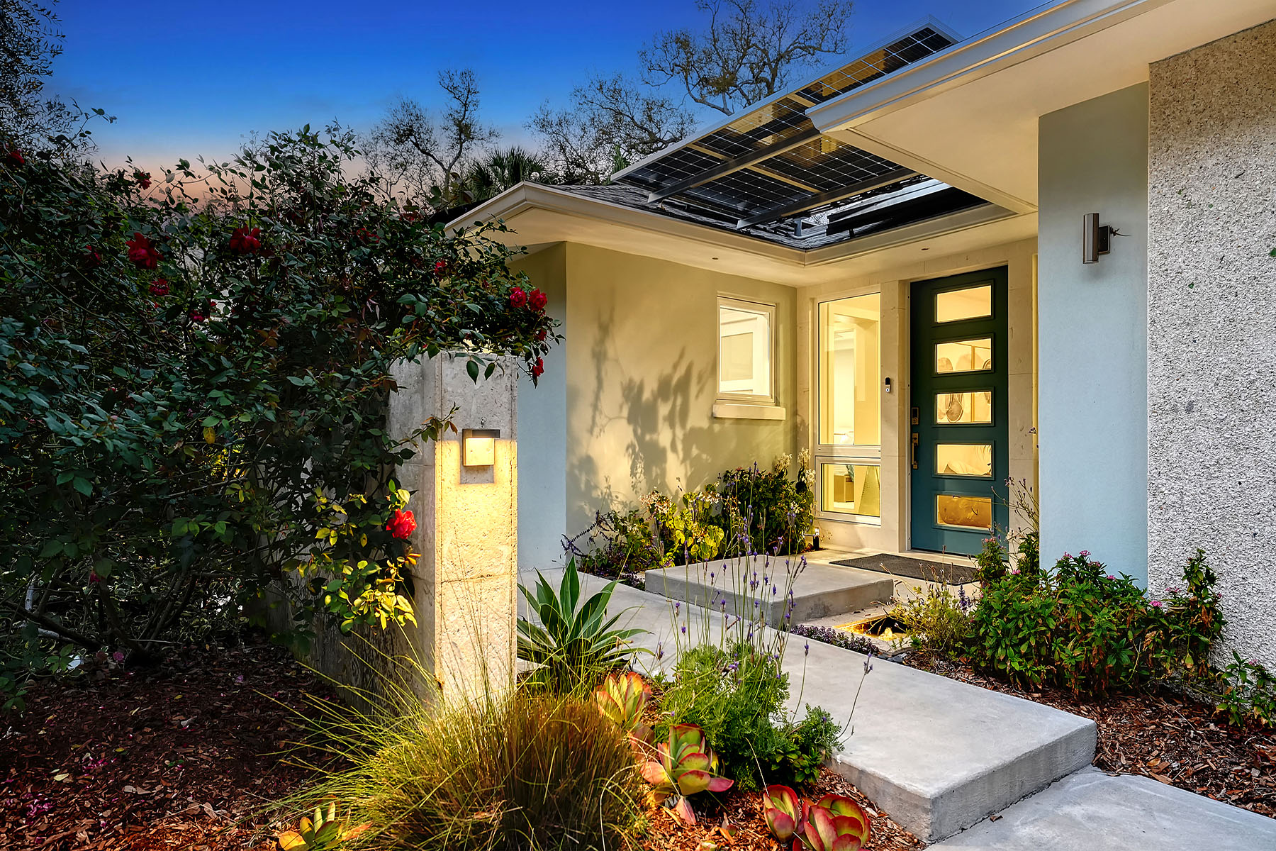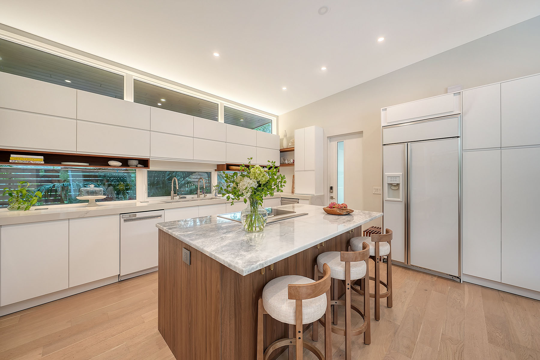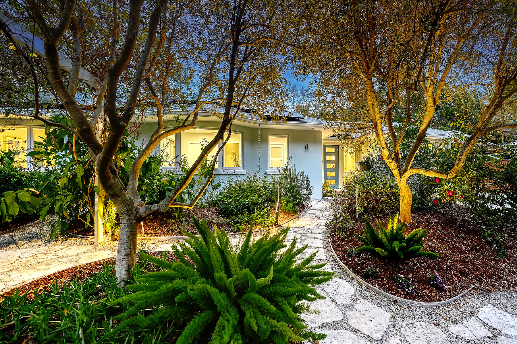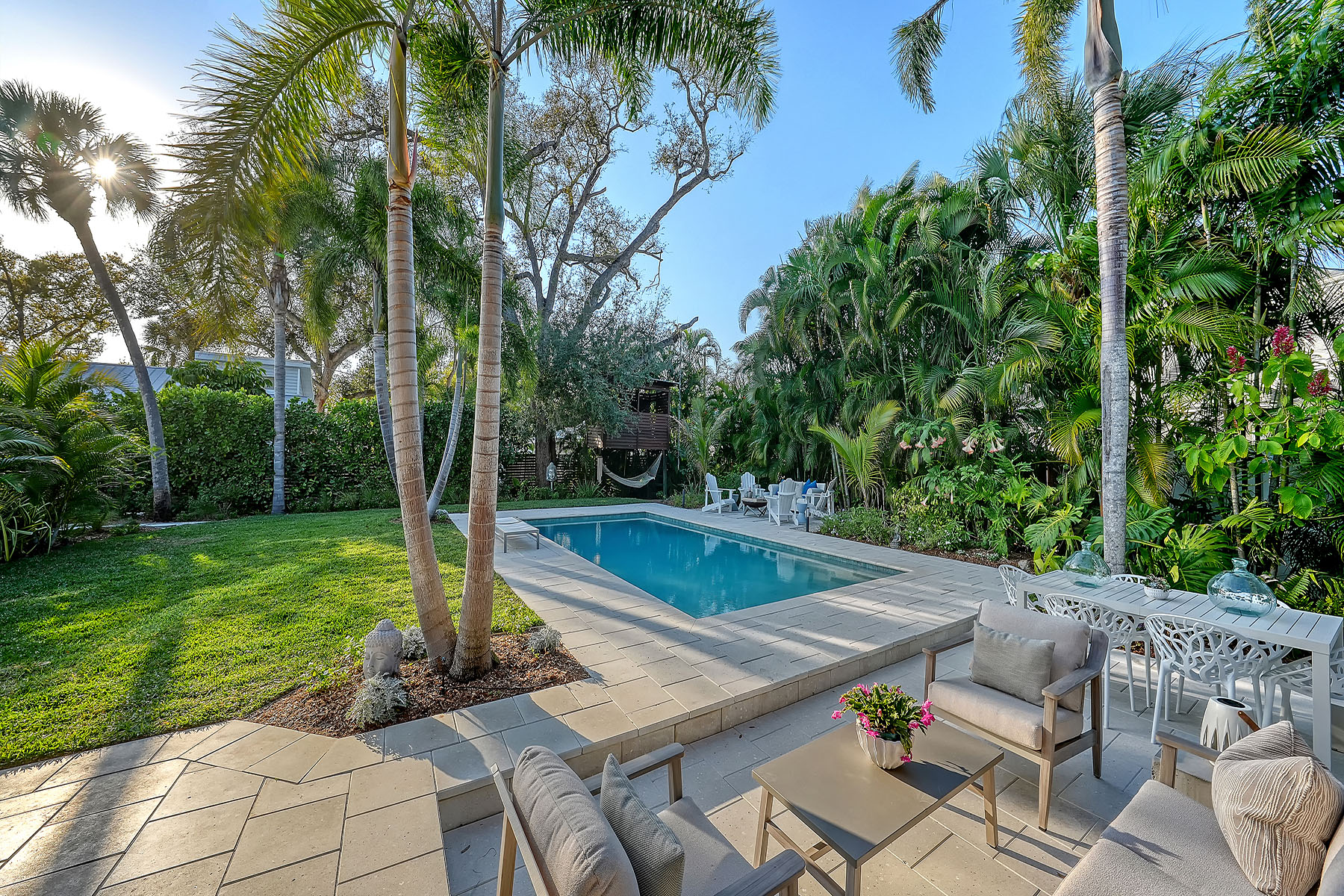 If you've been searching for a Sarasota West of Trail oasis, quiet, private, accessible and beautifully updated, this McClellan Park residence brings together the features discerning West of Trail buyers value most, a large .34-acre lot, a fully renovated home with a 2024 addition, a detached guest house, a heated saltwater pool and energy independence, all on a private dead-end street minutes from the best of Sarasota. Originally built with timeless character, this in-city sanctuary has undergone a comprehensive back-to-studs renovation and is up to Florida building code, with an official effective build date of 2013. A classic foundation, refined with modern upgrades and standards. The main home spans 3,100 square feet with three bedrooms and three baths, fully customized with all details valued by today's buyers. Bonus rooms include an office/den, plus a sitting room in the primary suite. The striking 2024 addition, designed by Jimmy Thornton, features an open-concept great room, dining and kitchen with zero-corner, fully pocketing sliding glass doors, a dramatic architectural detail that opens the living space completely to the pool and outdoor areas. The kitchen is a showpiece. It features high ceiling, super-organized European cabinetry with illuminated interiors, high-profile quartz and marble countertops, a glass window backsplash, and clerestory windows. Custom walnut open shelving adds artistic flair. Appliance garages, interior drawers, a workstation sink with two faucets and an oversize eat-in island add high-end functionality. The outdoors is incredibly lush and functional for an in-town location. Outdoor living rooms, fruit trees, trellises, native flowers and an expansive food garden, plus a treehouse for charm and fun. A heated saltwater pool anchors the backyard, while the detached guest house adds flexibility for recreation, home office, studio or guests.