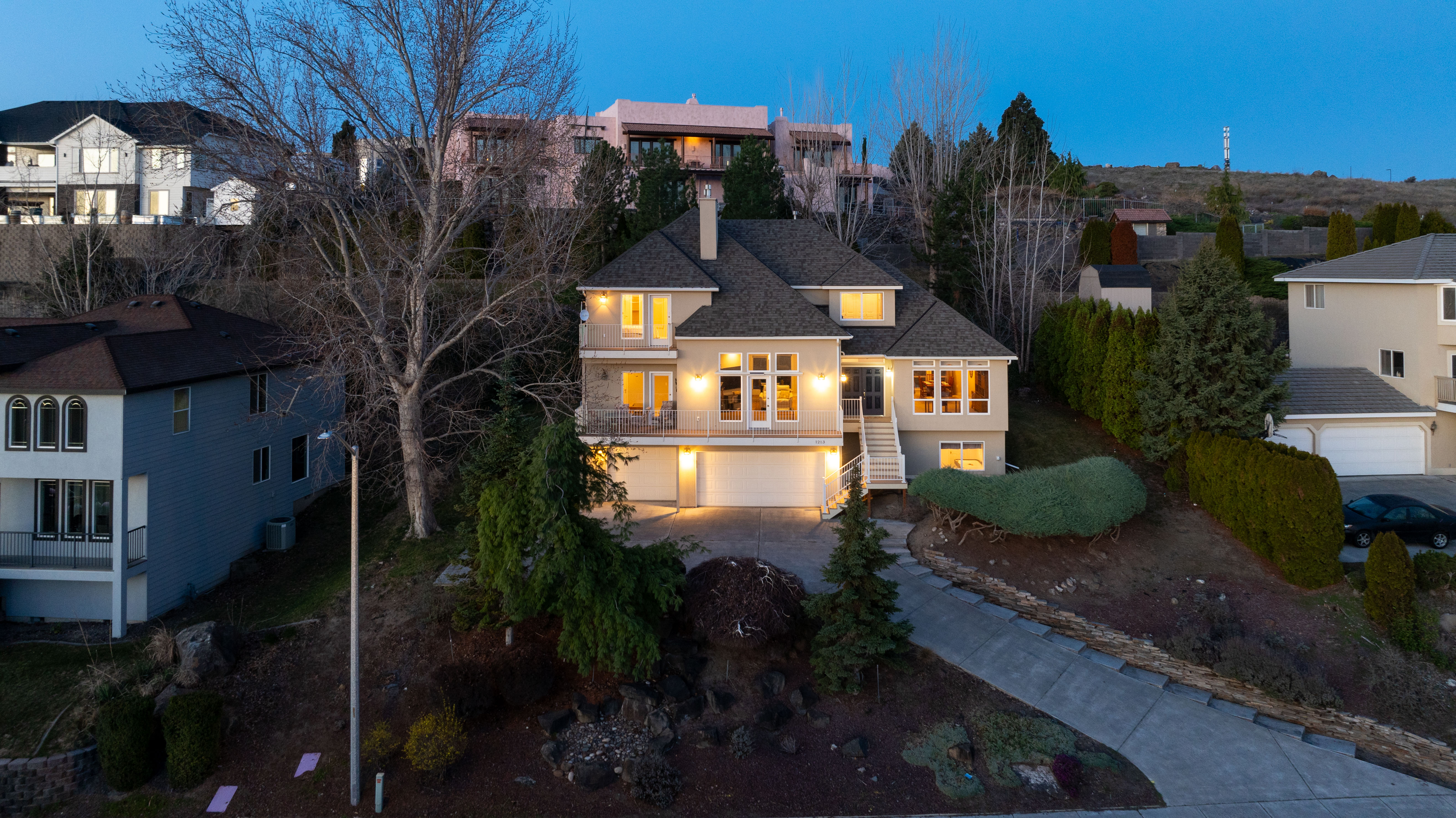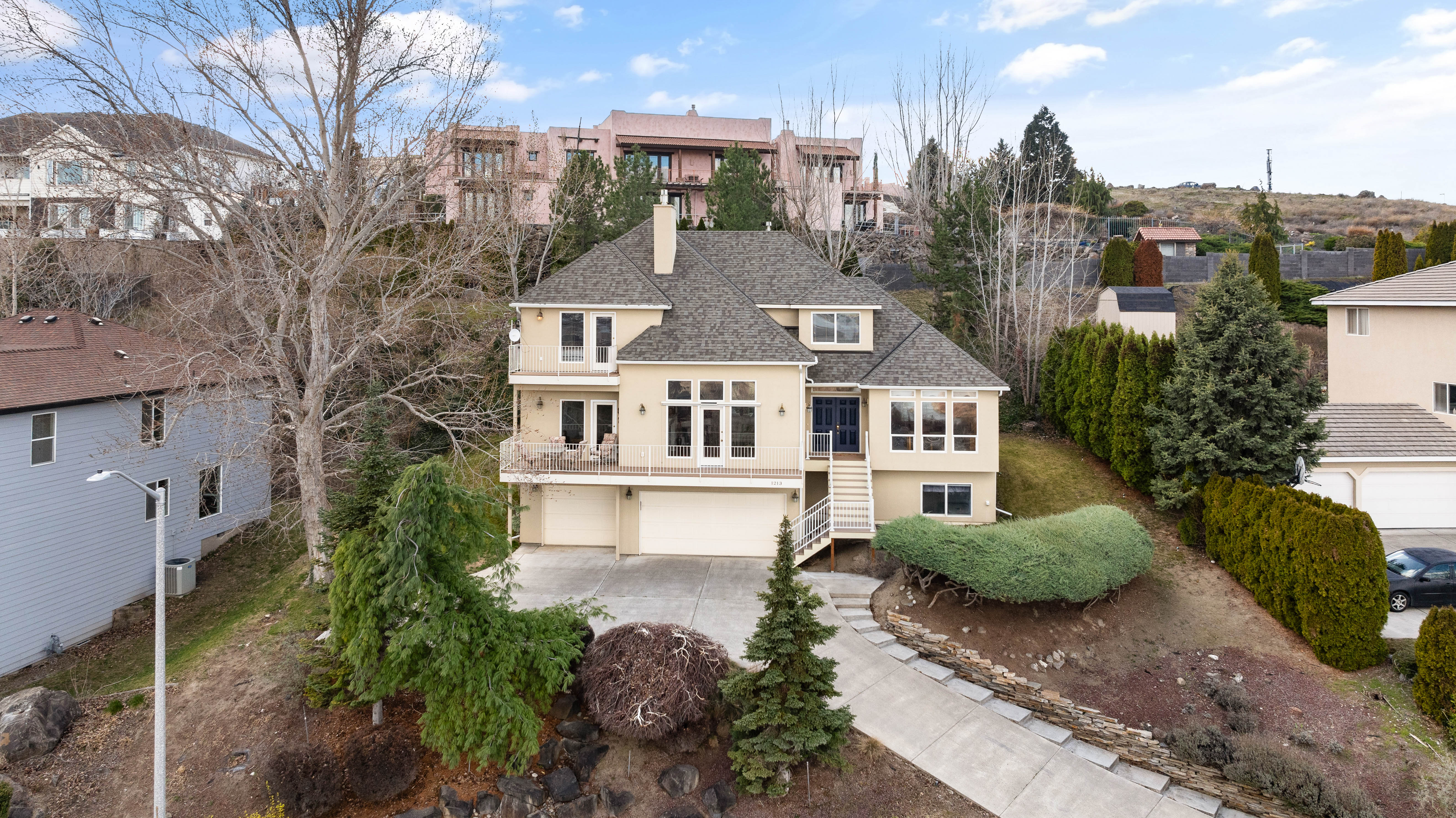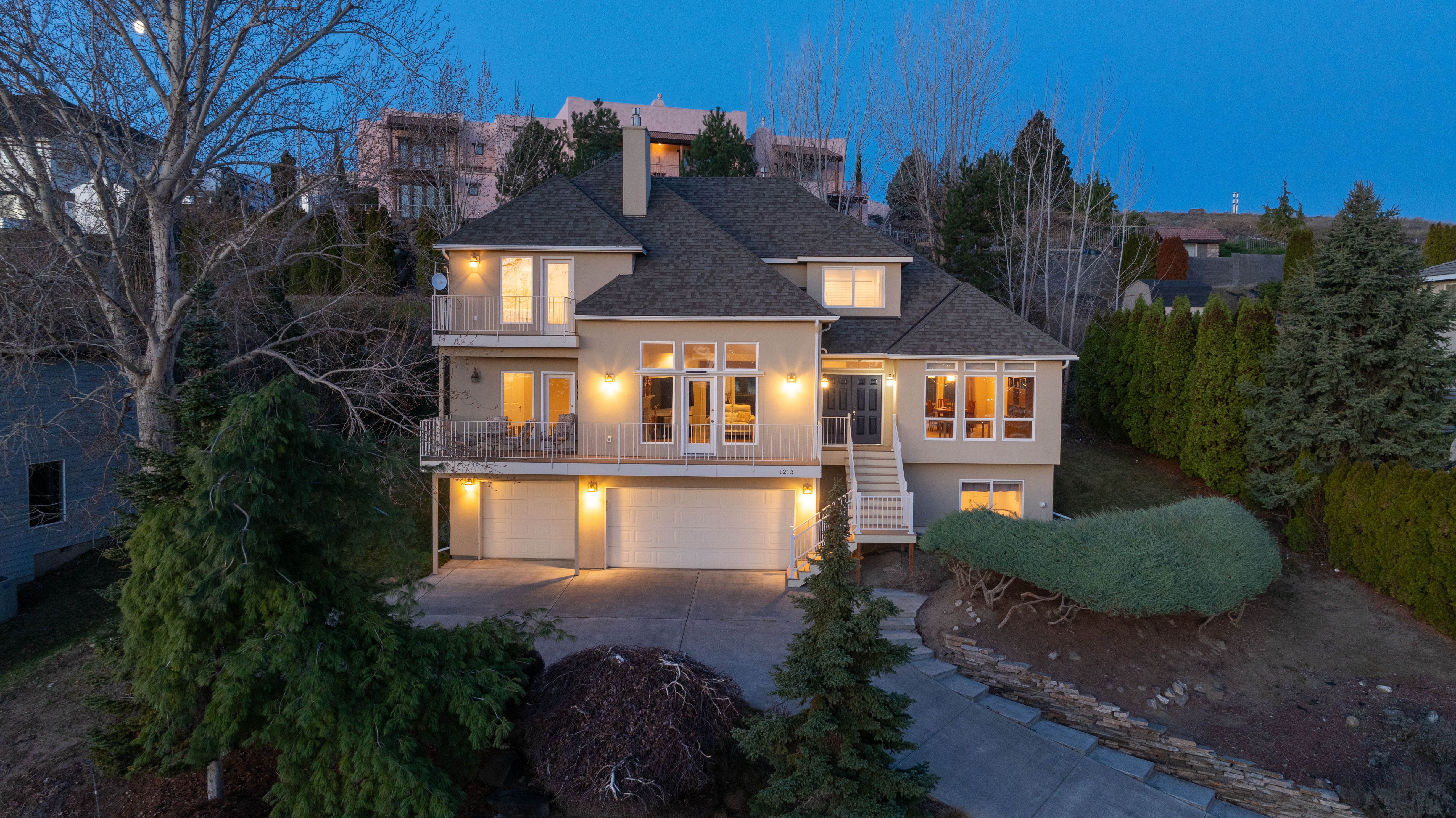 Elevated above the city with breathtaking panoramic views of both the Yakima and Columbia Rivers, this exceptional Richland residence offers an impressive blend of space, privacy, and unforgettable scenery. Spanning 3,707 square feet across three thoughtfully designed levels, the home features 4 bedrooms, a private den, and 4 bathrooms, providing versatility for both everyday living and elegant entertaining. Rich bamboo flooring flows through the living spaces, while the updated kitchen serves as a stylish and functional centerpiece for gatherings with family and friends. Outdoor living is truly a highlight of this home. The expansive front deck captures sweeping river views, creating the perfect setting for morning coffee or sunset evenings. In contrast, the large rear deck is tucked into mature landscaping, offering a peaceful and private retreat for entertaining or relaxing. Practical luxury continues with dual HVAC systems for year-round comfort, a spacious 3-car garage complete with workbench, and an oversized driveway providing ample parking for guests. The home’s stucco exterior and commanding presence enhance its curb appeal while the multi-level design maximizes both living space and spectacular views. A rare opportunity to enjoy space, privacy, and iconic river views in one of Richland’s most desirable settings.