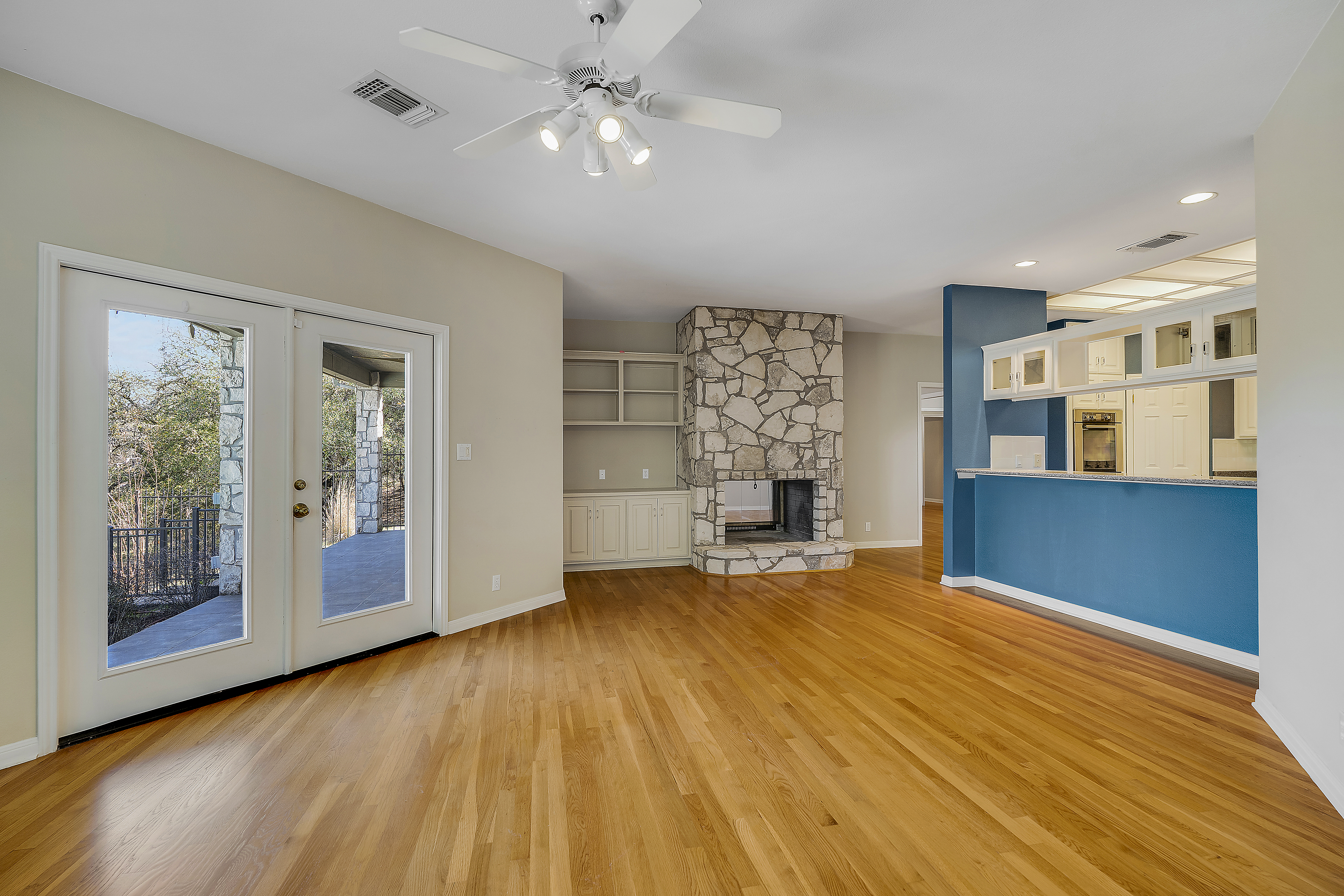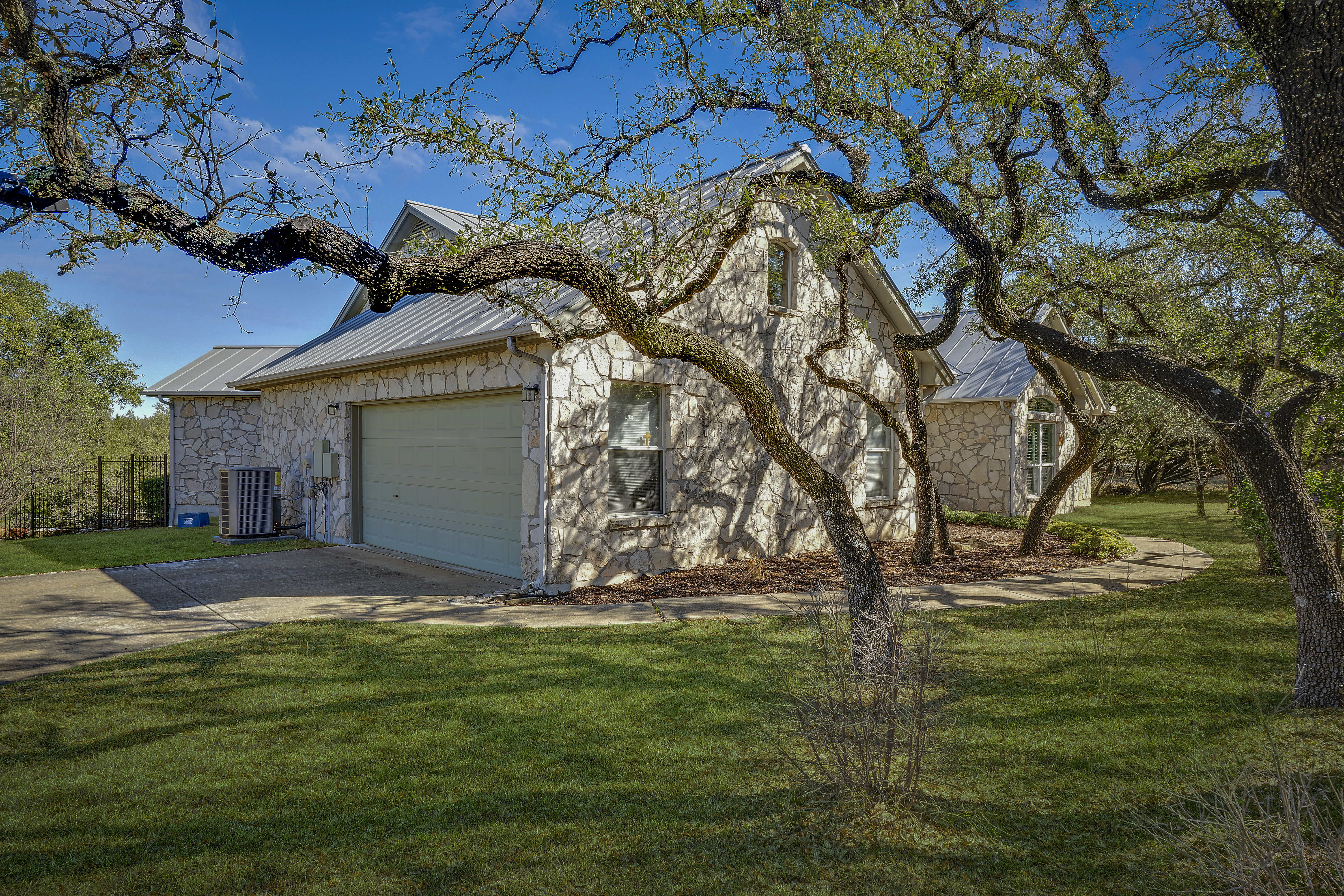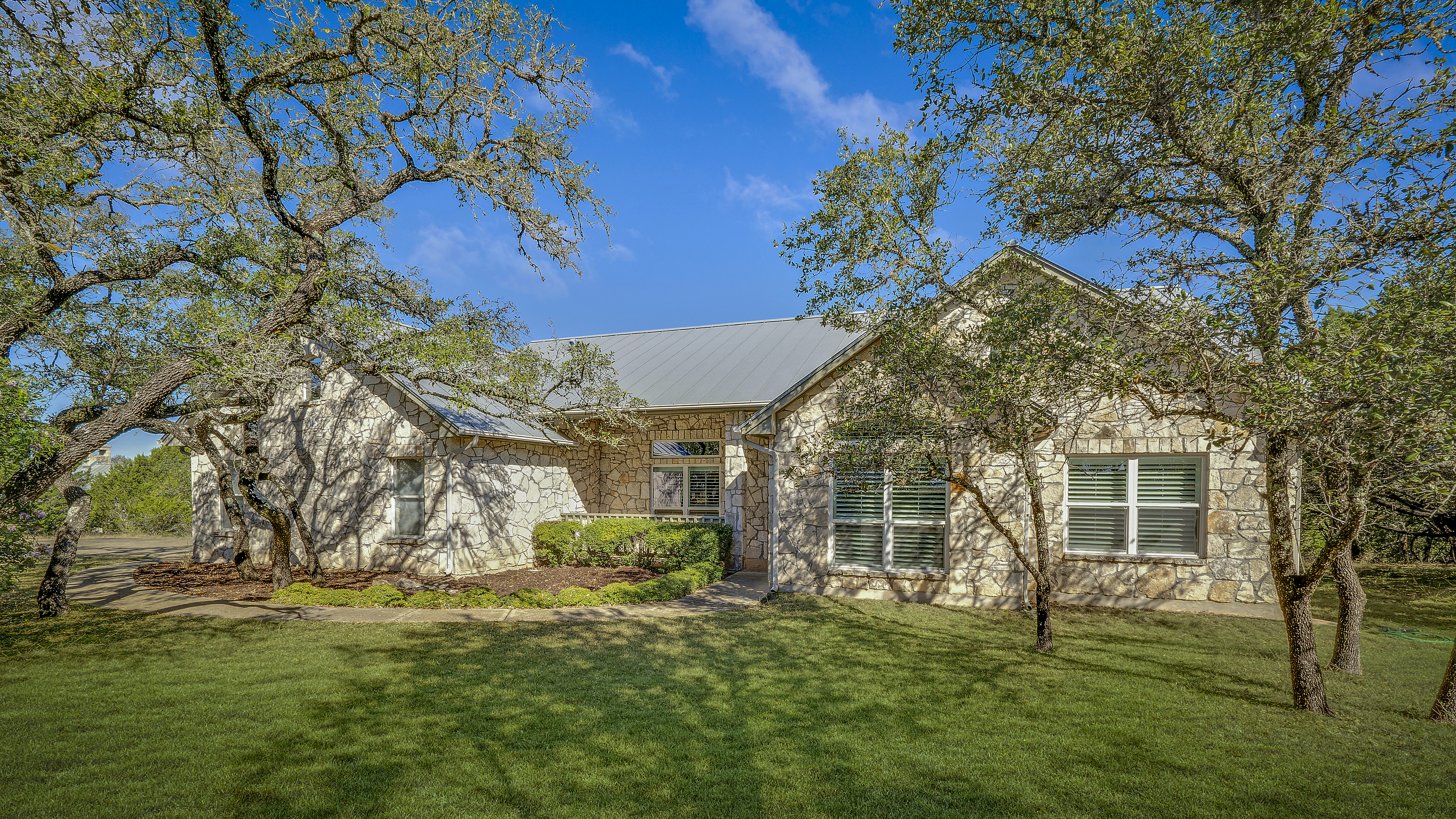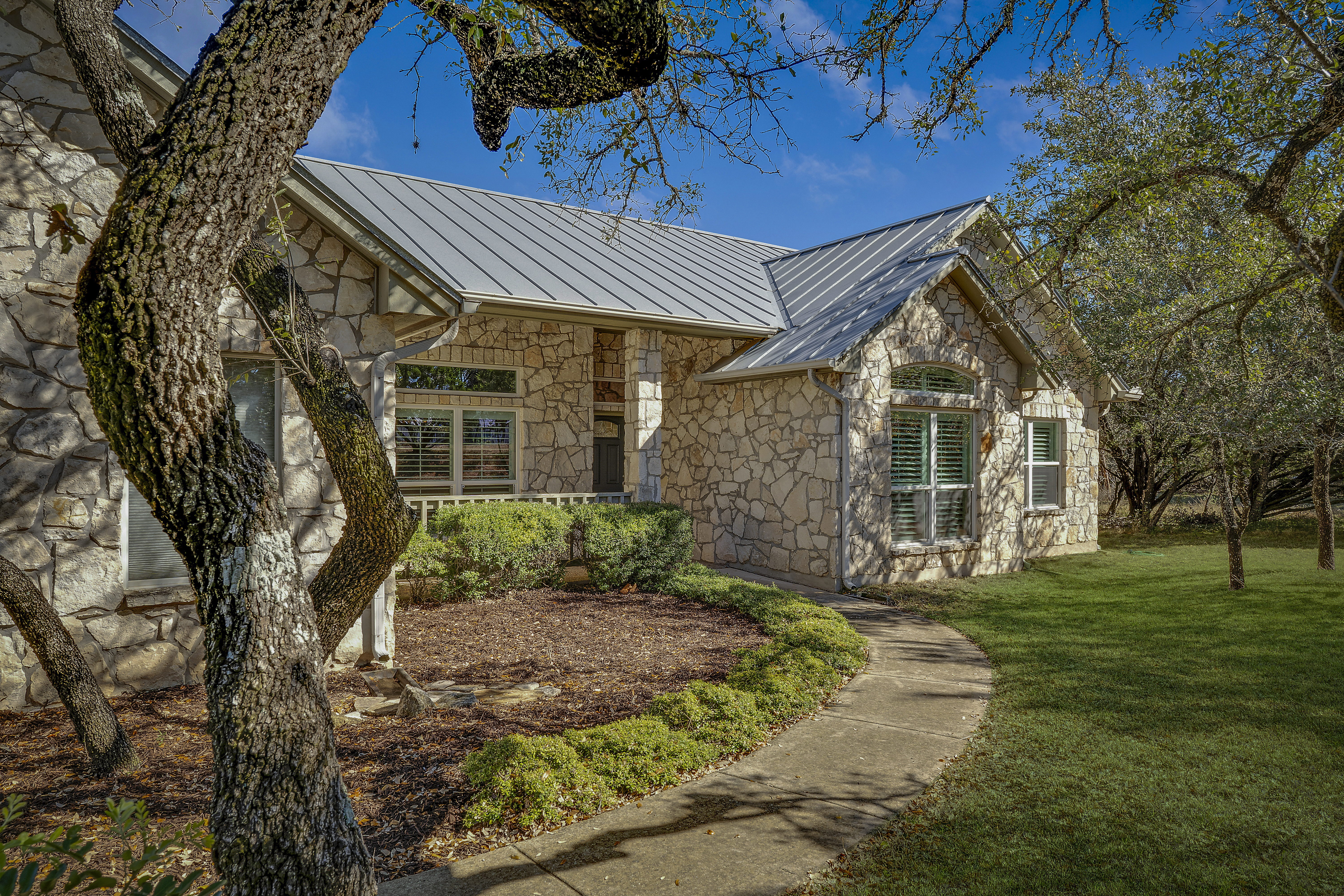 Nestled on 2.5 beautifully treed acres in Fair Oaks Ranch, this charming one-story stone home with a metal roof offers privacy, comfort, and wonderful Hill Country living. A welcoming covered front porch sets the tone, while the spacious covered back porch overlooks the sparkling pool and spa and the peaceful, tree-filled backyard. Inside, the home features 4 bedrooms and 2.5 baths with two inviting living areas. A striking dual-sided fireplace creates a warm focal point between the family room and living room, and the kitchen is open to the family room, making it ideal for everyday living and entertaining. The kitchen is well appointed with Bosch appliances and enjoys beautiful views of the backyard. Large windows bring in natural light and showcase the scenic outdoor setting from the living areas and the spacious primary suite. The primary bedroom features bamboo floors and an updated spa-like bath with separate tub and shower, separate vanities, and a walk-in closet. Additional highlights include custom built-ins in the living, family, and dining rooms, plantation shutters, and updated Pella windows throughout. Located within walking distance to the neighborhood park and served by highly regarded Boerne ISD, this special property combines serene acreage living with comfort, style, and convenience.