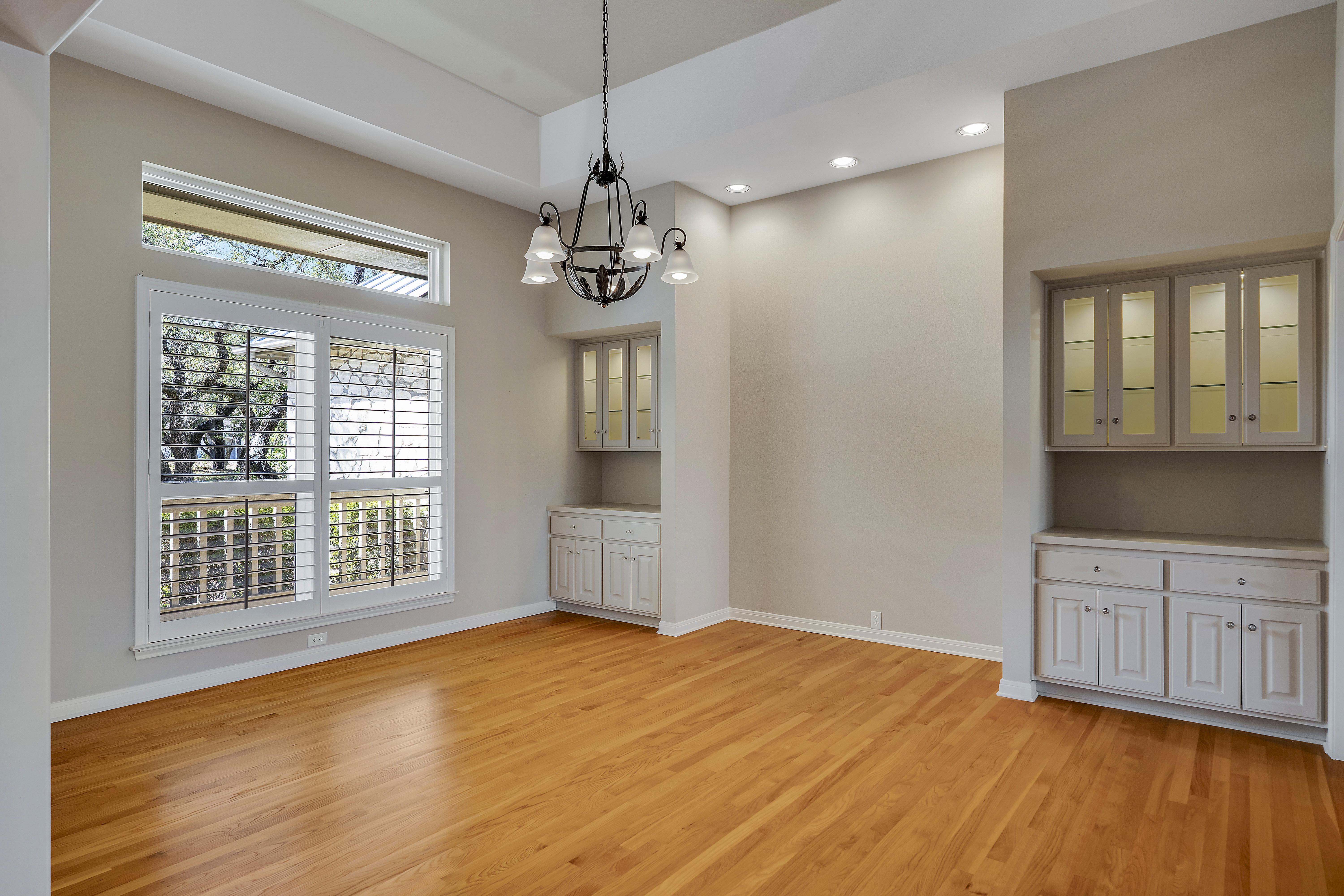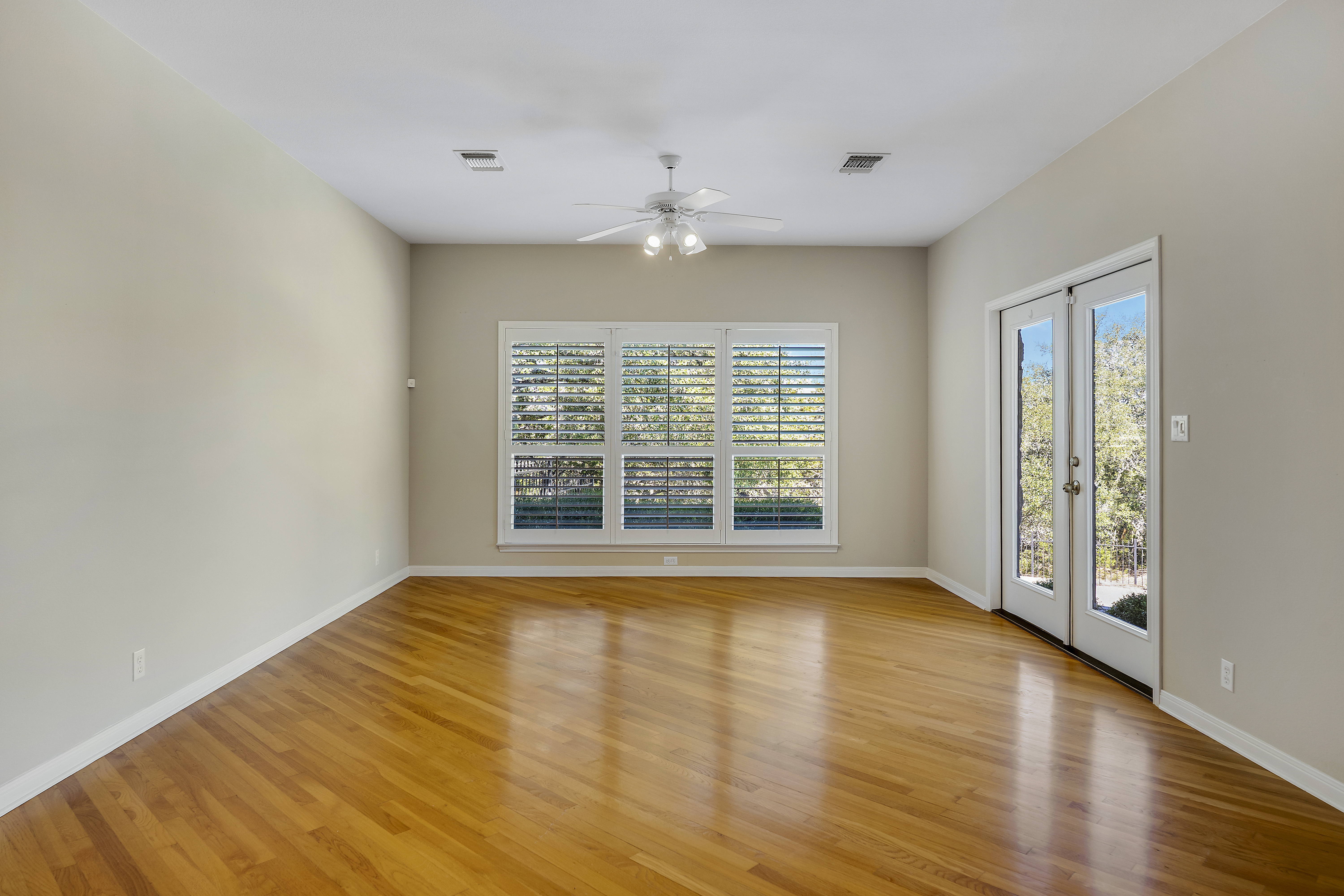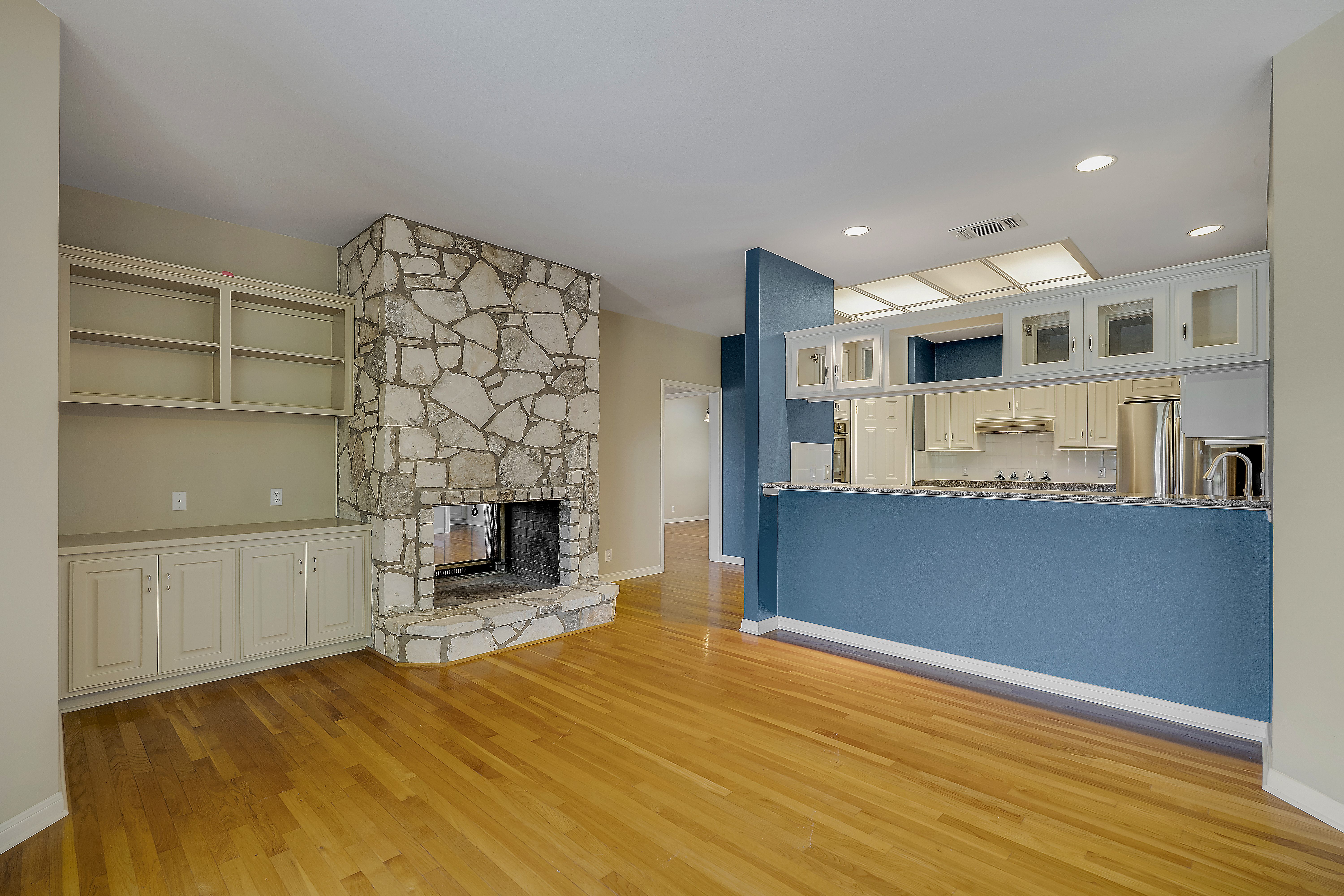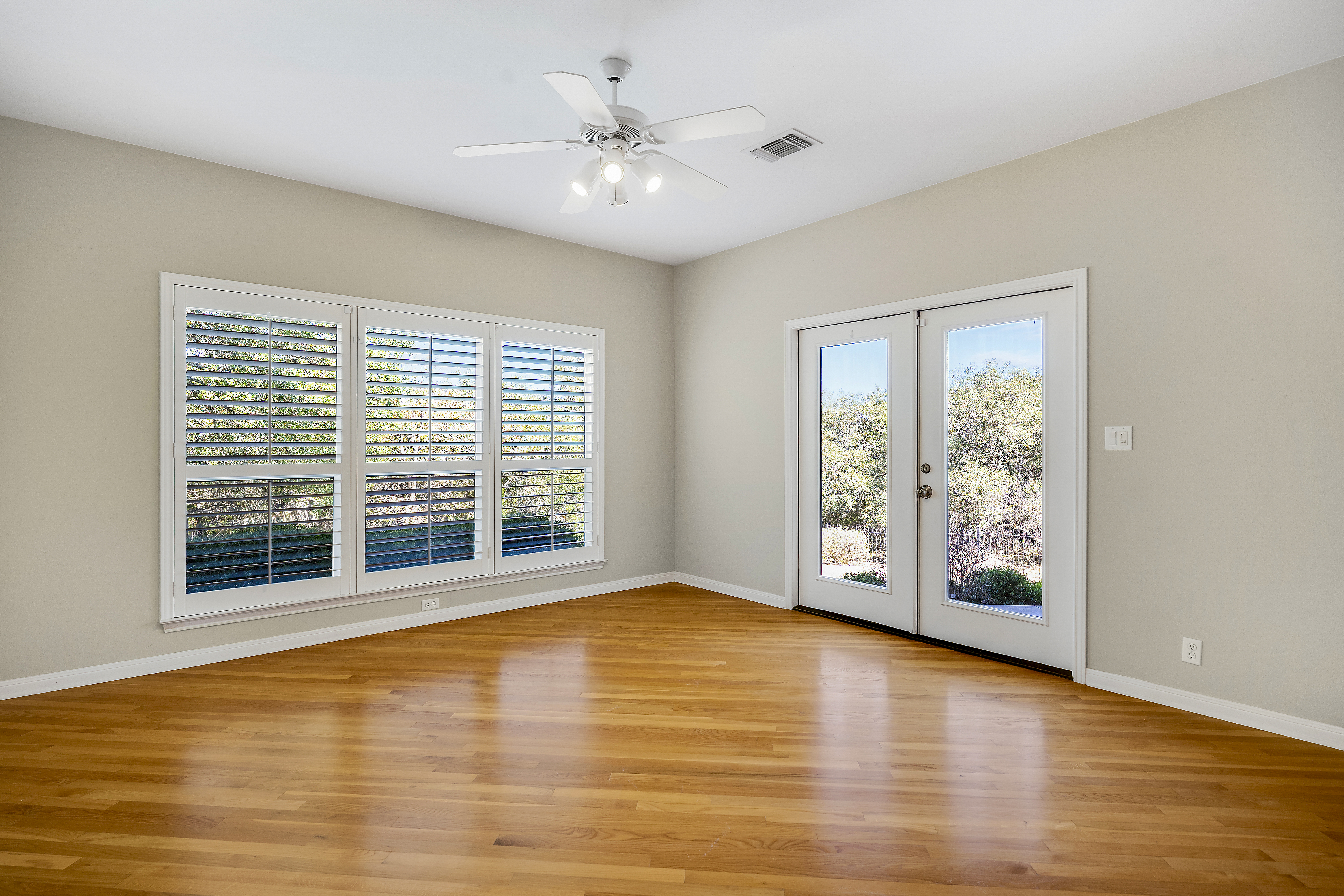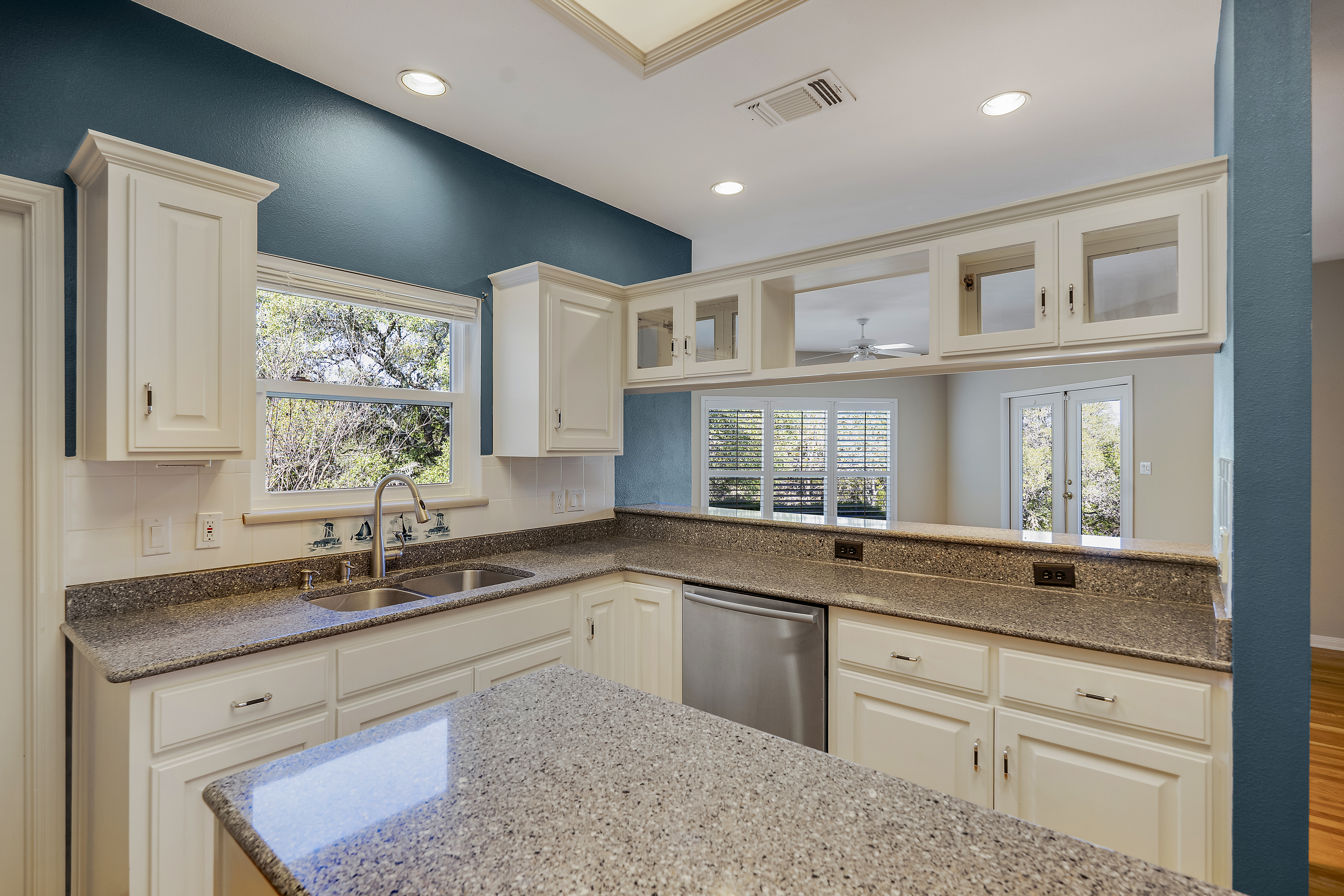 Nestled on 2.5 beautifully treed acres in Fair Oaks Ranch, this charming one-story stone home with a metal roof offers privacy, comfort, and wonderful Hill Country living. A welcoming covered front porch sets the tone, while the spacious covered back porch overlooks the sparkling pool and spa and the peaceful, tree-filled backyard. Inside, the home features 4 bedrooms and 2.5 baths with two inviting living areas. A striking dual-sided fireplace creates a warm focal point between the family room and living room, and the kitchen is open to the family room, making it ideal for everyday living and entertaining. The kitchen is well appointed with Bosch appliances and enjoys beautiful views of the backyard. Large windows bring in natural light and showcase the scenic outdoor setting from the living areas and the spacious primary suite. The primary bedroom features bamboo floors and an updated spa-like bath with separate tub and shower, separate vanities, and a walk-in closet. Additional highlights include custom built-ins in the living, family, and dining rooms, plantation shutters, and updated Pella windows throughout. Located within walking distance to the neighborhood park and served by highly regarded Boerne ISD, this special property combines serene acreage living with comfort, style, and convenience.