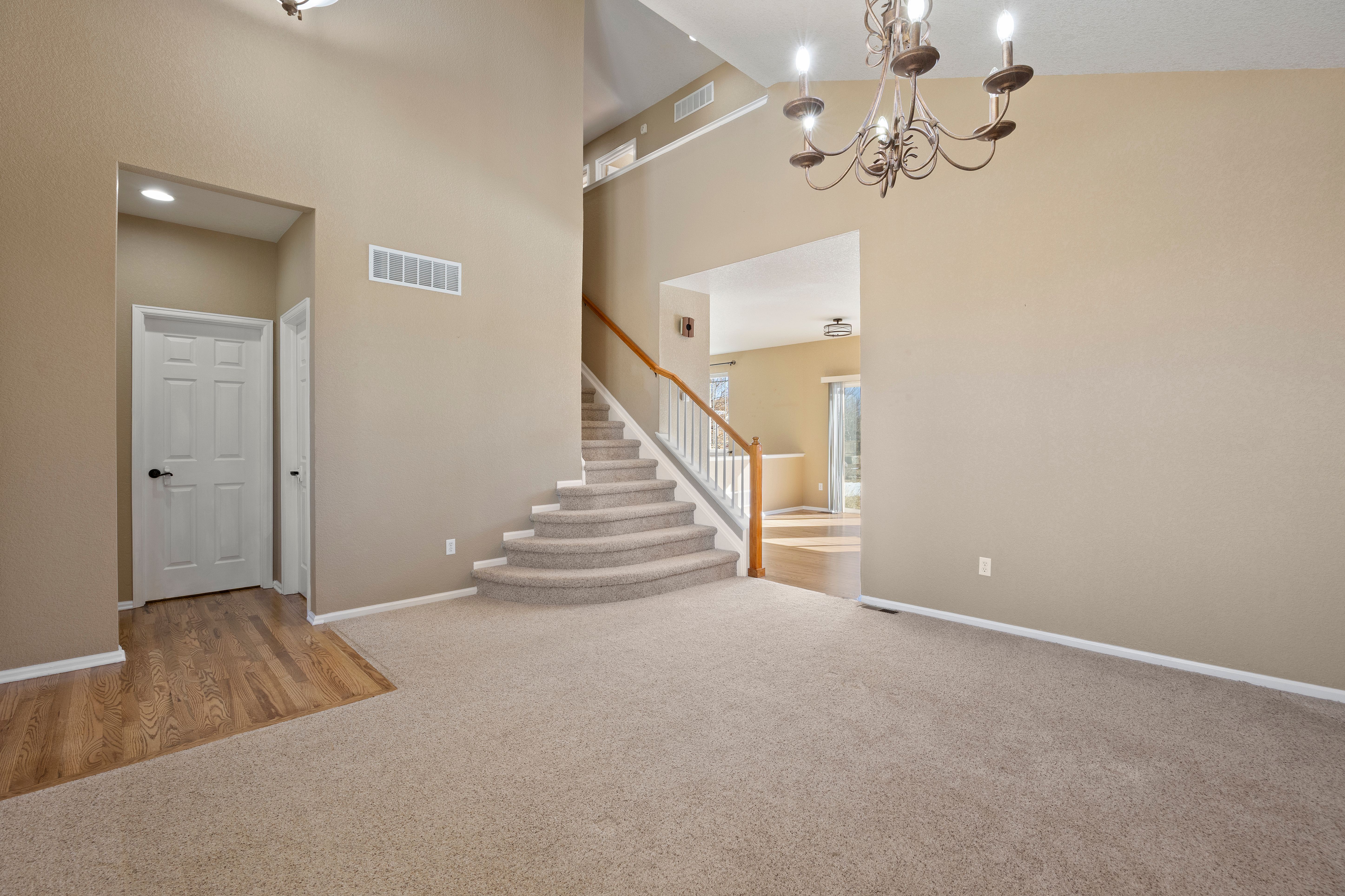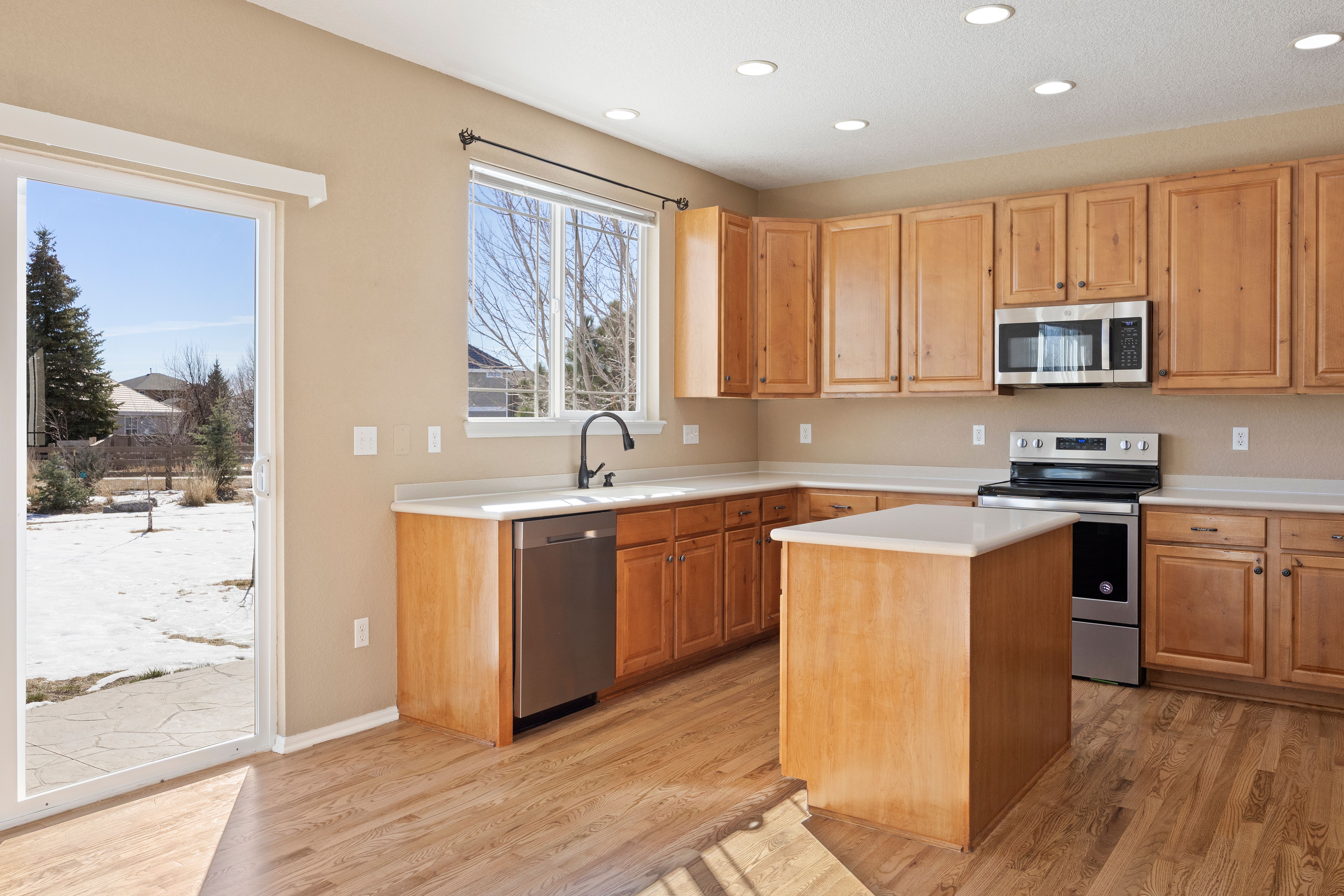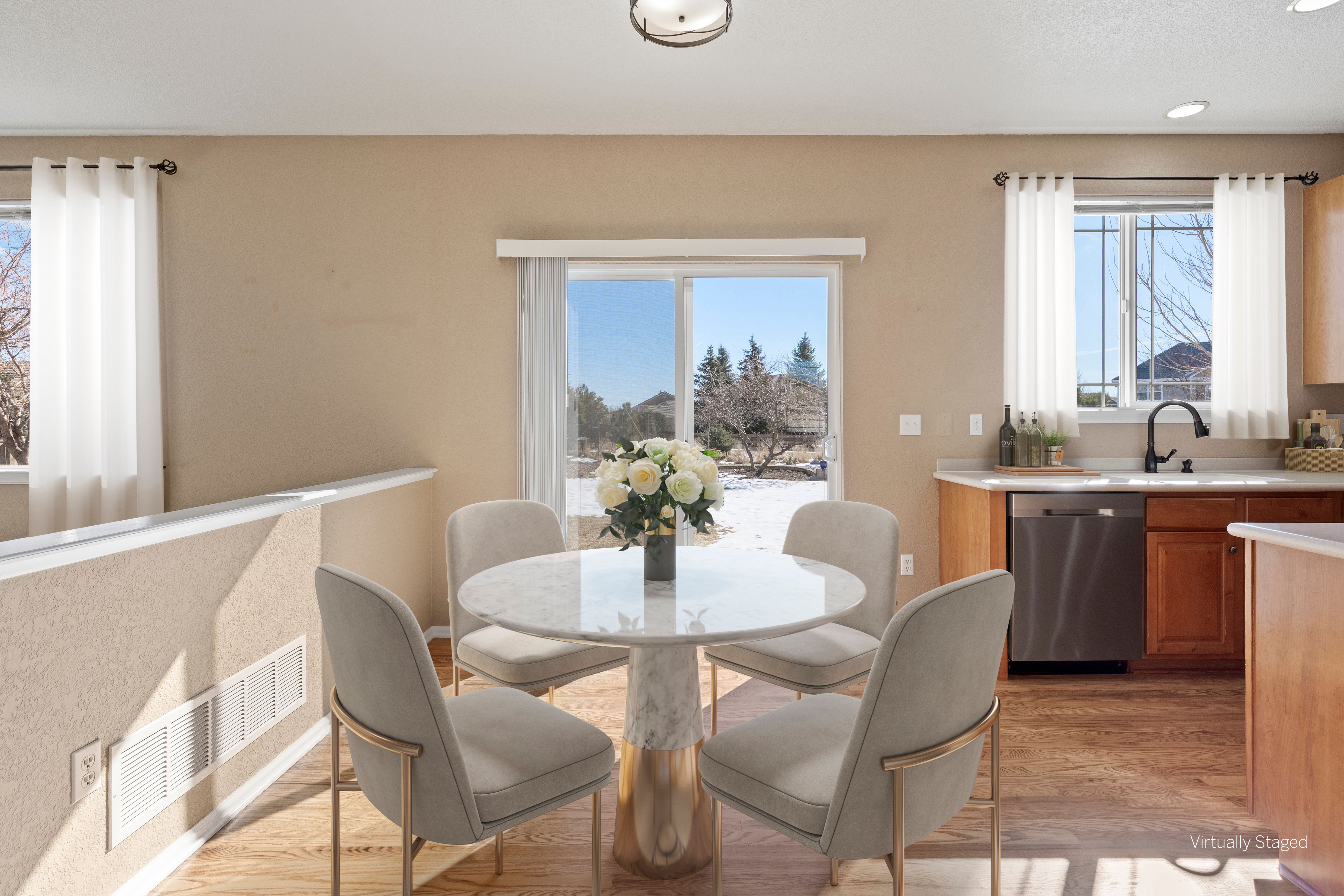 Unlike every other home, this two story, five-bedroom home is set on a rare, half-acre cul-de-sac lot. Defined by the huge custom-landscaped backyard, an upper floor that brings together four of the home’s bedrooms with mountain views, and a flexible main-floor bedroom or office, this home delivers space to live and play. As you enter, a front room with 18’ ceilings sets the tone, flowing through the sunlit eat-in kitchen into the cozy living room. The kitchen is complete with hardwood floors, stainless-steel appliances, and a sliding door walkout to the patio, and the living room gathers around a stone fireplace with fresh carpet. A flexible bedroom sits just around the corner, with an ensuite, creating options for an office or guest space. The upper level completes the picture with the other four bedrooms, including the primary bedroom with mountain views beyond, dual walk-in closets, and a relaxing ensuite with walk-in shower and soaking tub. Each secondary bedroom offers a newer ceiling fan, and the shared bathroom is complete with granite countertops and a tub/shower with detachable showerhead. In the finished basement, built in features offer storage, and carpet connects a flexible space ready for cozy movie nights or early fitness mornings. Whether spotting wildlife on the trail just behind the home or walking less than a mile to nearby schools and parks, here, convenience meets Colorado lifestyle in Castlewood Ranch.