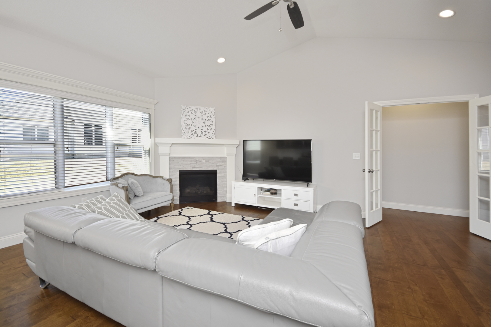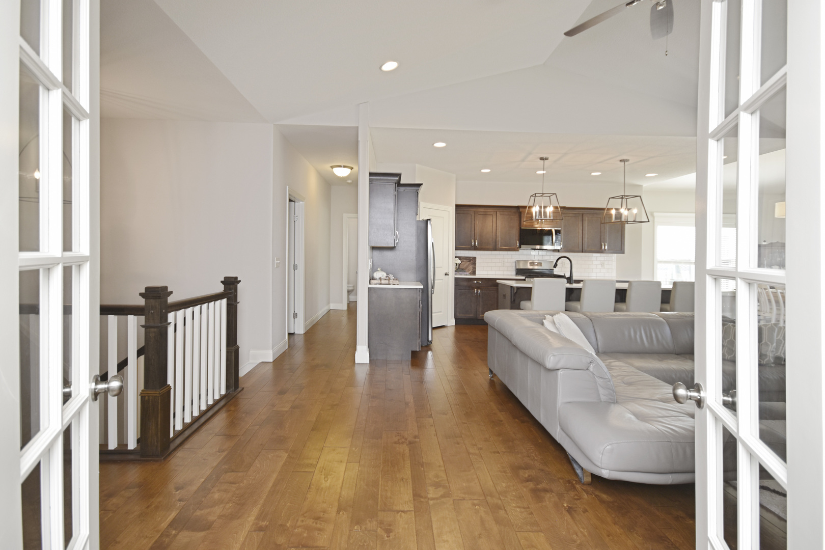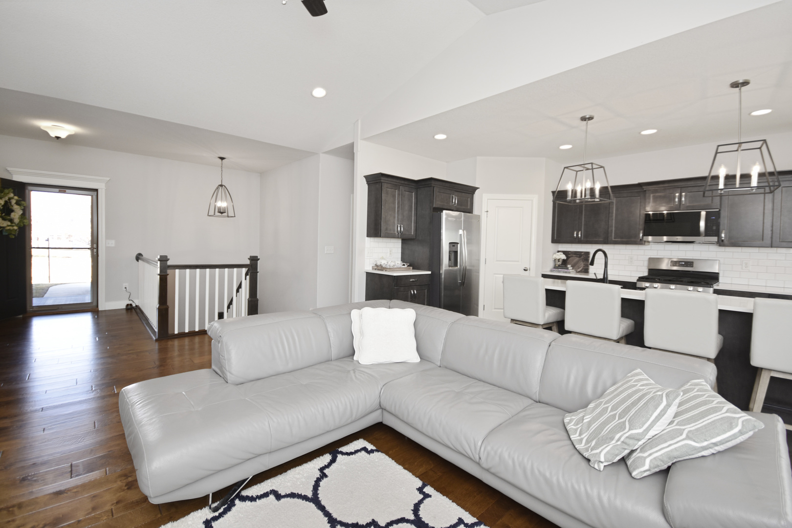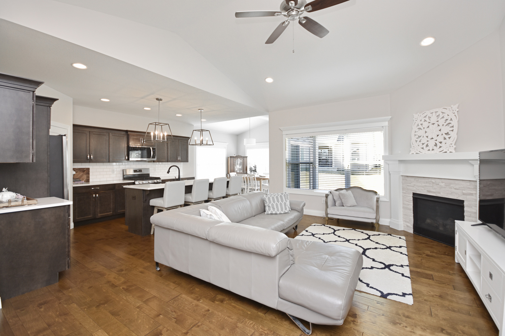Located in the highly sought-after Liberty on the Lakes subdivision in Savoy, this beautifully designed ranch home offers the perfect combination of style, functionality, and thoughtful craftsmanship. Built by Signature Homes, the popular Dorset model features a bright, open-concept layout that is perfect for everyday living and entertaining. The main living area flows effortlessly into the well-appointed kitchen featuring ebony custom cabinetry with soft-close drawers, quartz countertops, chrome hardware, a farmhouse sink, subway tile backsplash, and elegant pendant lighting. A walk-in pantry provides additional storage and convenience, while all stainless steel kitchen appliances remain, making this kitchen truly move-in ready. The private primary suite offers a relaxing retreat with designer carpet, boutique mirrors, wood plank tile accents, and a beautifully finished tiled shower. Two additional bedrooms are tucked behind French doors and share a convenient Jack-and-Jill bath, creating an ideal setup for guests. The finished lower level expands the home's functionality with a spacious family room, a fourth bedroom, and ample storage space. Several thoughtful upgrades have been added by the seller, including custom-installed window blinds throughout, epoxy-coated garage flooring, and a front storm door that allows additional natural light into the home. The property also includes a passive radon mitigation system and a backup sump pump with alarm for added peace of mind. Outside, the home's curb appeal shines with Twilight Shadow siding, custom brick detailing, and refined masonry accents. An oversized sliding door leads to the outdoor living space, creating a perfect area for relaxing or entertaining. Designer-selected finishes, premium trim and casing, and a striking split-face stone fireplace surround complete this beautifully crafted home in one of Savoy's most desirable neighborhoods.