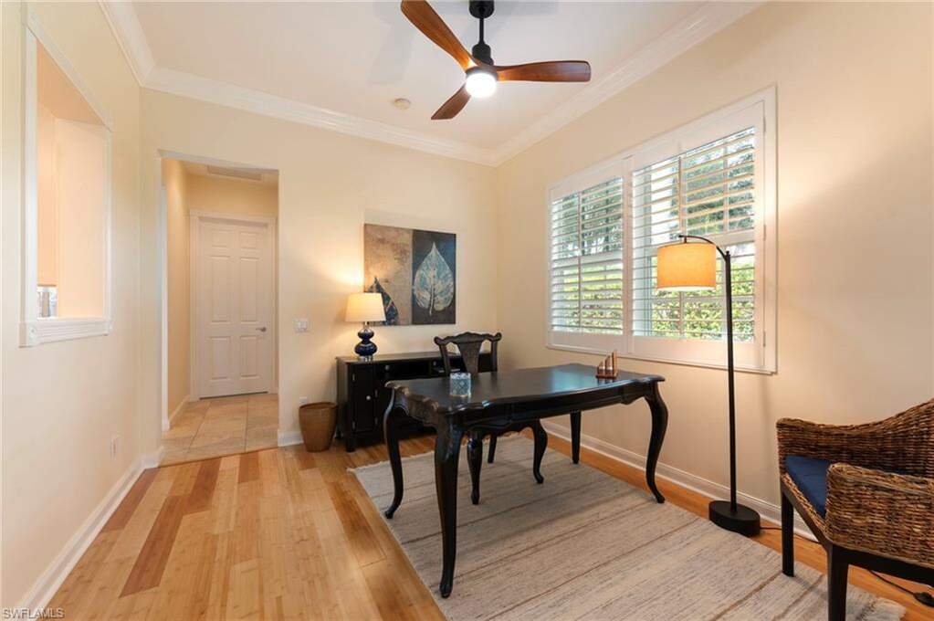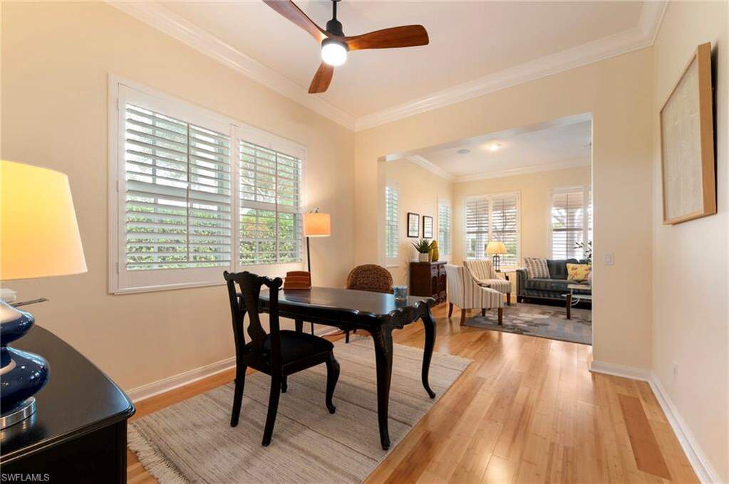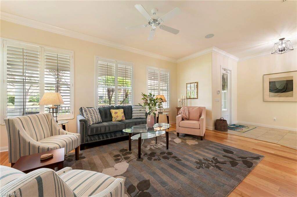 This steel-reinforced poured concrete construction home is ideally located close to the community entrance and just a short walk to the Town Center Amenity Area. Turnkey furnished on a corner homesite, this home already features many of the major upgrades buyers appreciate. Recent improvements include a new water heater (2024), new A/C with Wi-Fi thermostat controls (2022), new range, microwave, and dishwasher, washer & dryer (2022), and a counter-depth stainless refrigerator (2023). The large, inviting front porch sets the tone as you arrive, while the glass-panel front door fills the foyer with natural light. Inside, the gourmet kitchen features shaker style cabinet doors, a new sink and countertop, and an open layout ideal for entertaining. The home also includes new light fixtures inside and out, lighted ceiling fans with independent controls, and built-in Bluetooth speakers throughout the home, allowing you to enjoy music seamlessly in multiple living spaces. The thoughtful layout offers privacy and flexibility. Two bedrooms and a full bath are located toward the front of the home, while a separate suite with its own entrance sits on the right side-ideal for guests or multigenerational living. The Owner's retreat at the rear of the home offers impact slider access to the pool deck, four closets, and an expansive double-sided bathroom. Two separate living areas ensure everyone can enjoy their own space-because not everyone likes the same programs. Outdoor living is exceptional with a custom saltwater heated pool installed in 2024, surrounded by a screen enclosure with full-view panels. The pool features a waterfall feature and Pentair smartphone-controlled system, while the pool deck showcases a French-design paver pattern. Storm protection is also well addressed with impact-resistant windows on the rear and side of the home, along with electric lanai shutters that make storm preparation simple. Residents of VillageWalk enjoy a wide array of amenities including pickleball, tennis, bocce, resort and lap-style pools, spa, restaurant, hair salon, bagel shop, and a full-time activities director who plans an active social calendar. The southern border of the community is home to the famous butterfly gardens, and with 22 miles of sidewalks, riverwalks, and pedestrian bridges, there are endless opportunities to enjoy the outdoors and stay active.