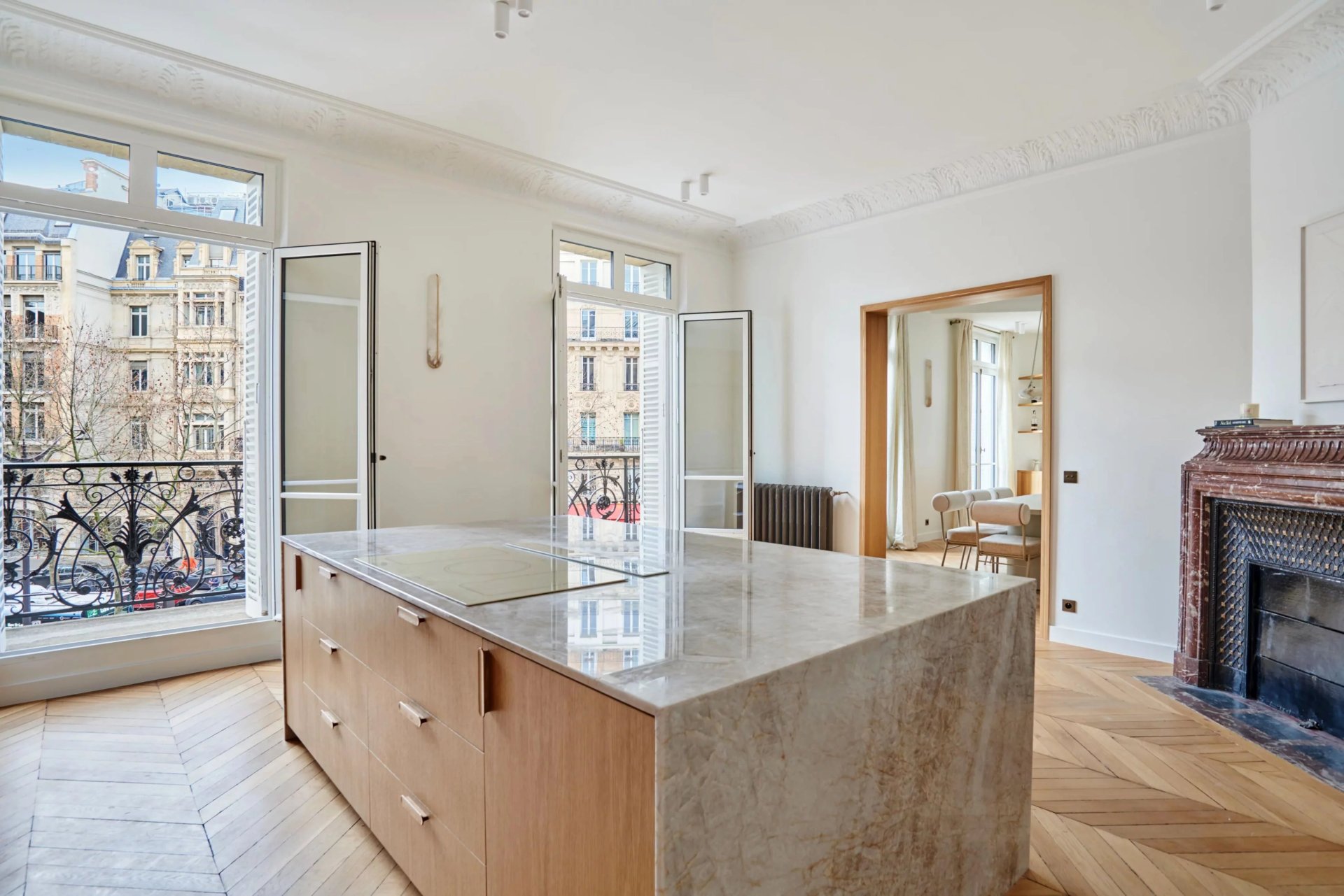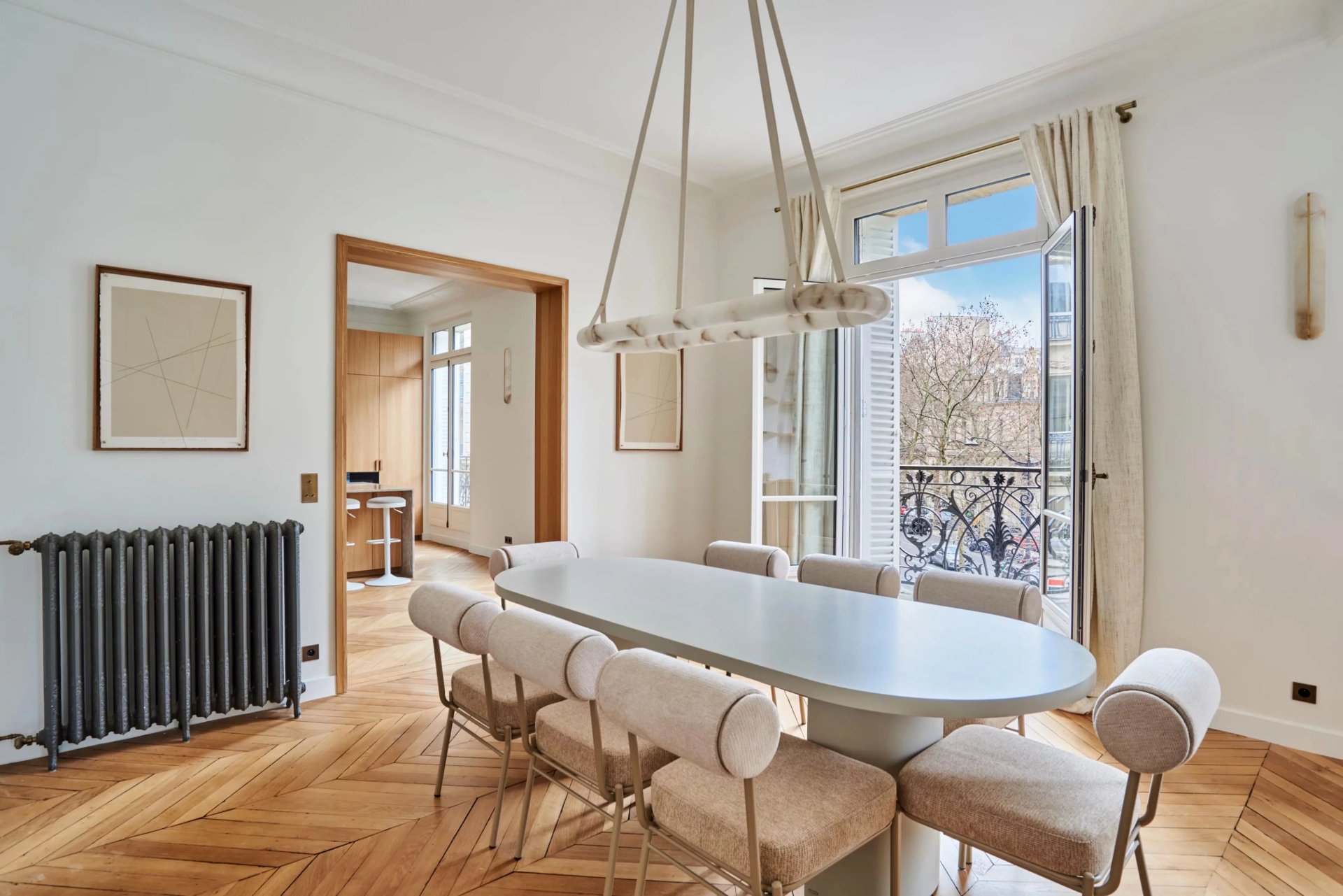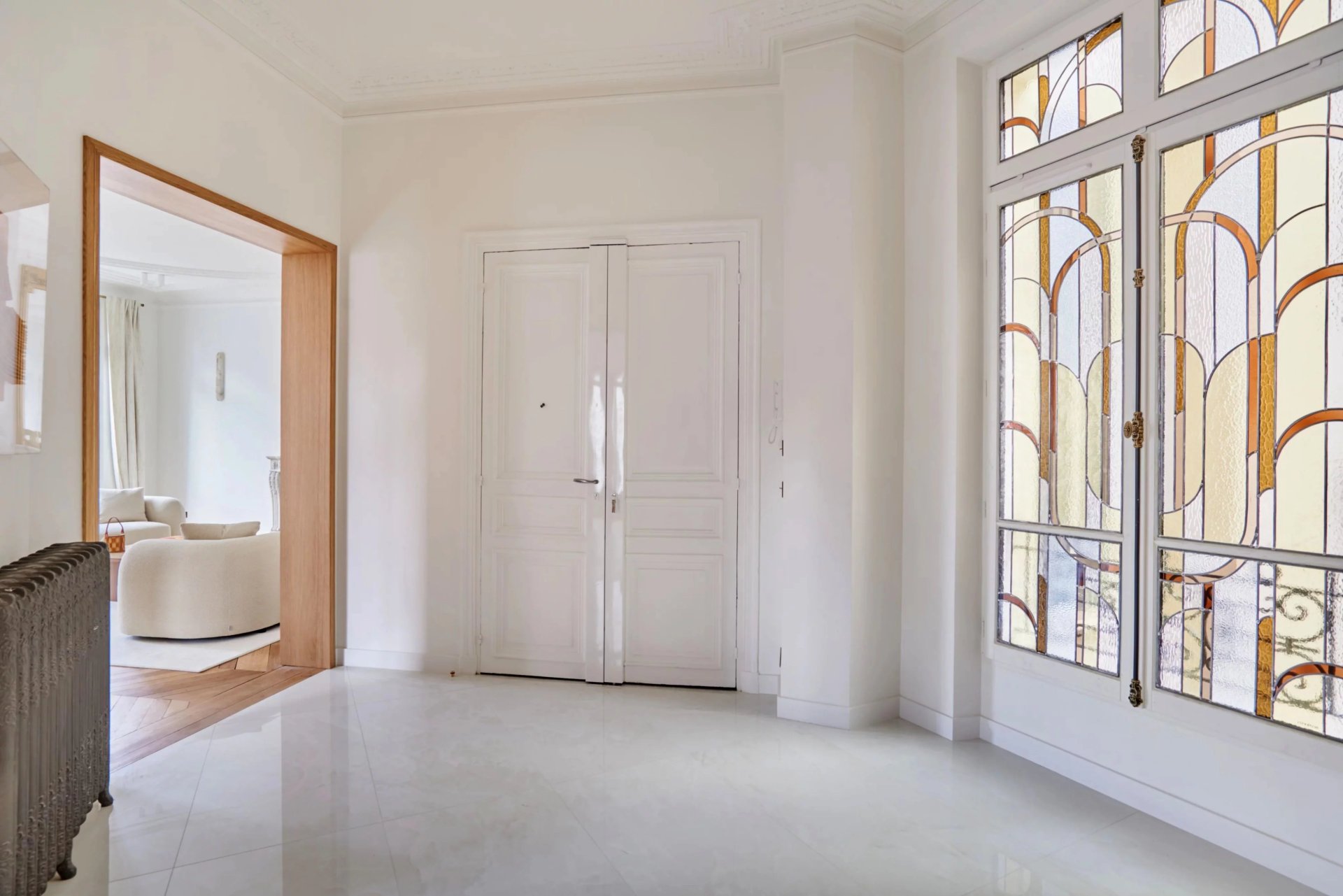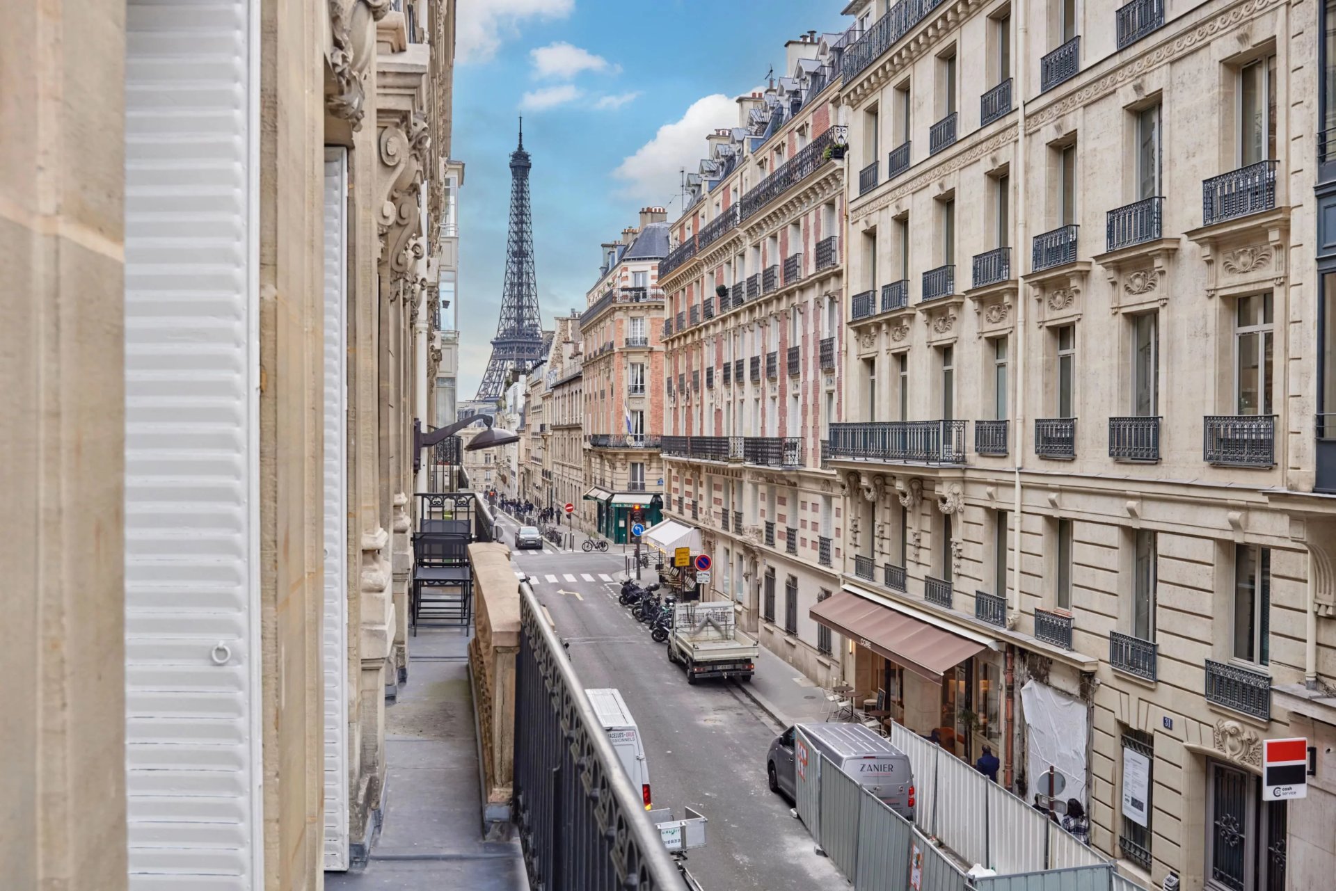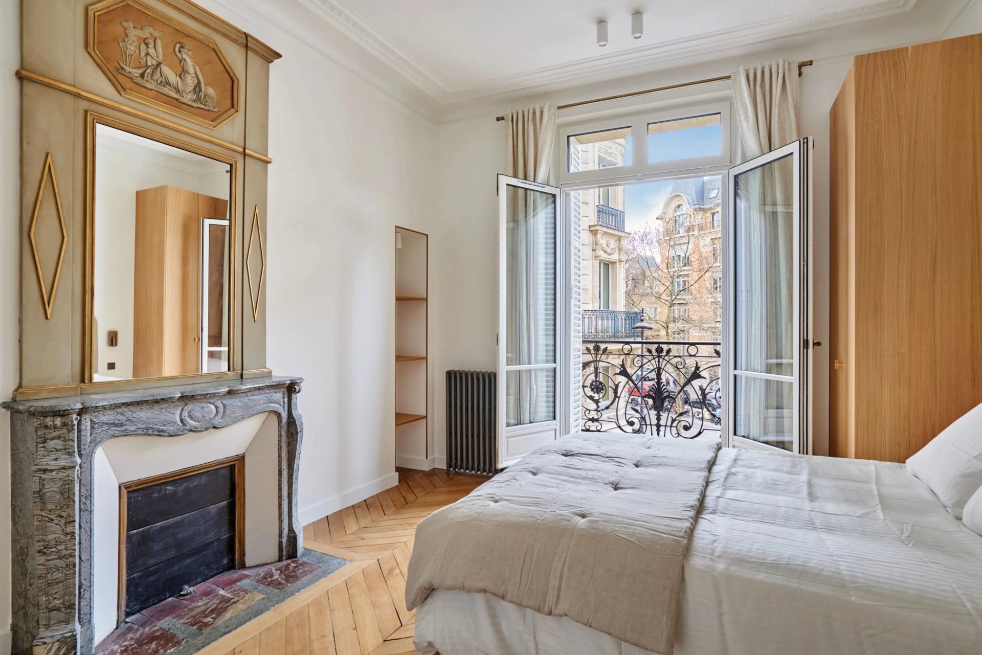 This elegant air-conditioned apartment on the 2nd floor of a fine early 20th century building located a stone's throw from Place du Trocadéro benefits from balconies enjoying views of the Eiffel Tower and the Arc de Triomphe. Meticulously renovated throughout by an interior decorator, it includes a spacious living/reception room, dining room and kitchen bathed in sunshine and featuring high ceilings, a master suite with a bathroom and dressing room, three further suites each with bathrooms, and a utility room.