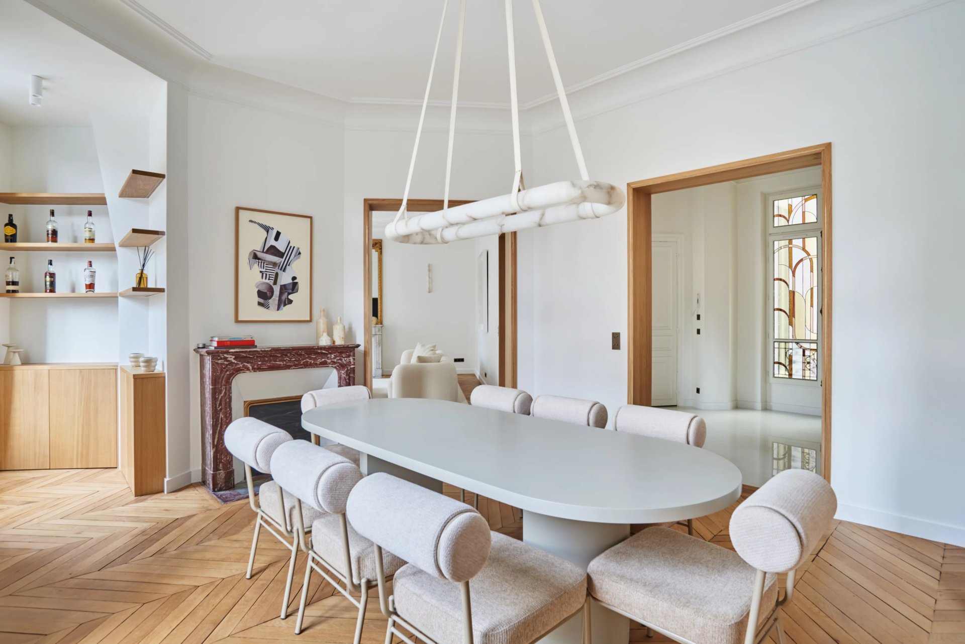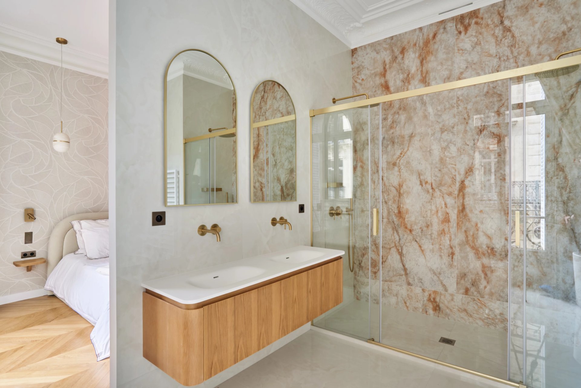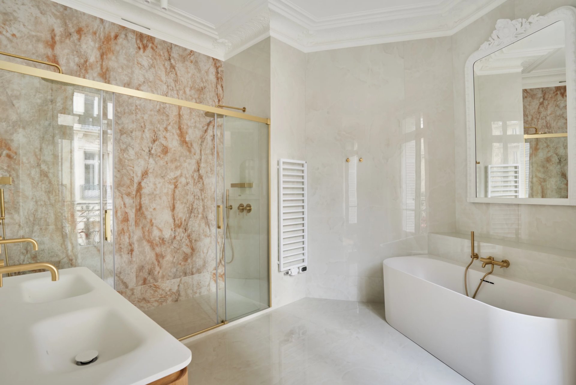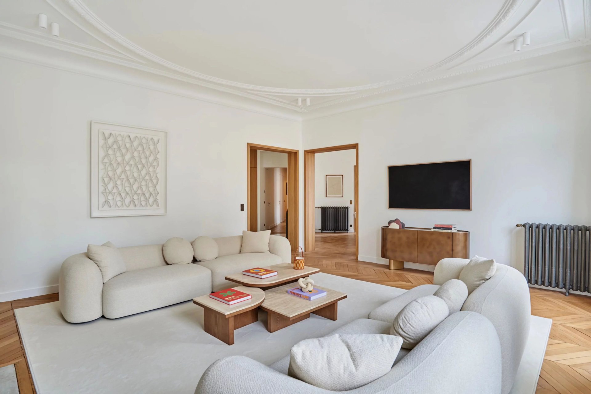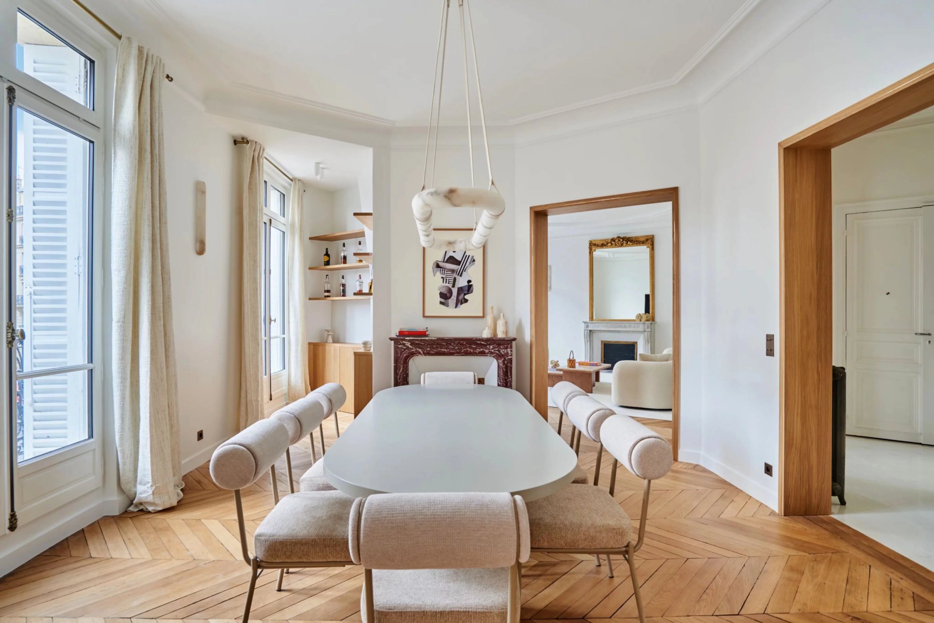This elegant air-conditioned apartment on the 2nd floor of a fine early 20th century building located a stone's throw from Place du Trocadéro benefits from balconies enjoying views of the Eiffel Tower and the Arc de Triomphe. Meticulously renovated throughout by an interior decorator, it includes a spacious living/reception room, dining room and kitchen bathed in sunshine and featuring high ceilings, a master suite with a bathroom and dressing room, three further suites each with bathrooms, and a utility room.