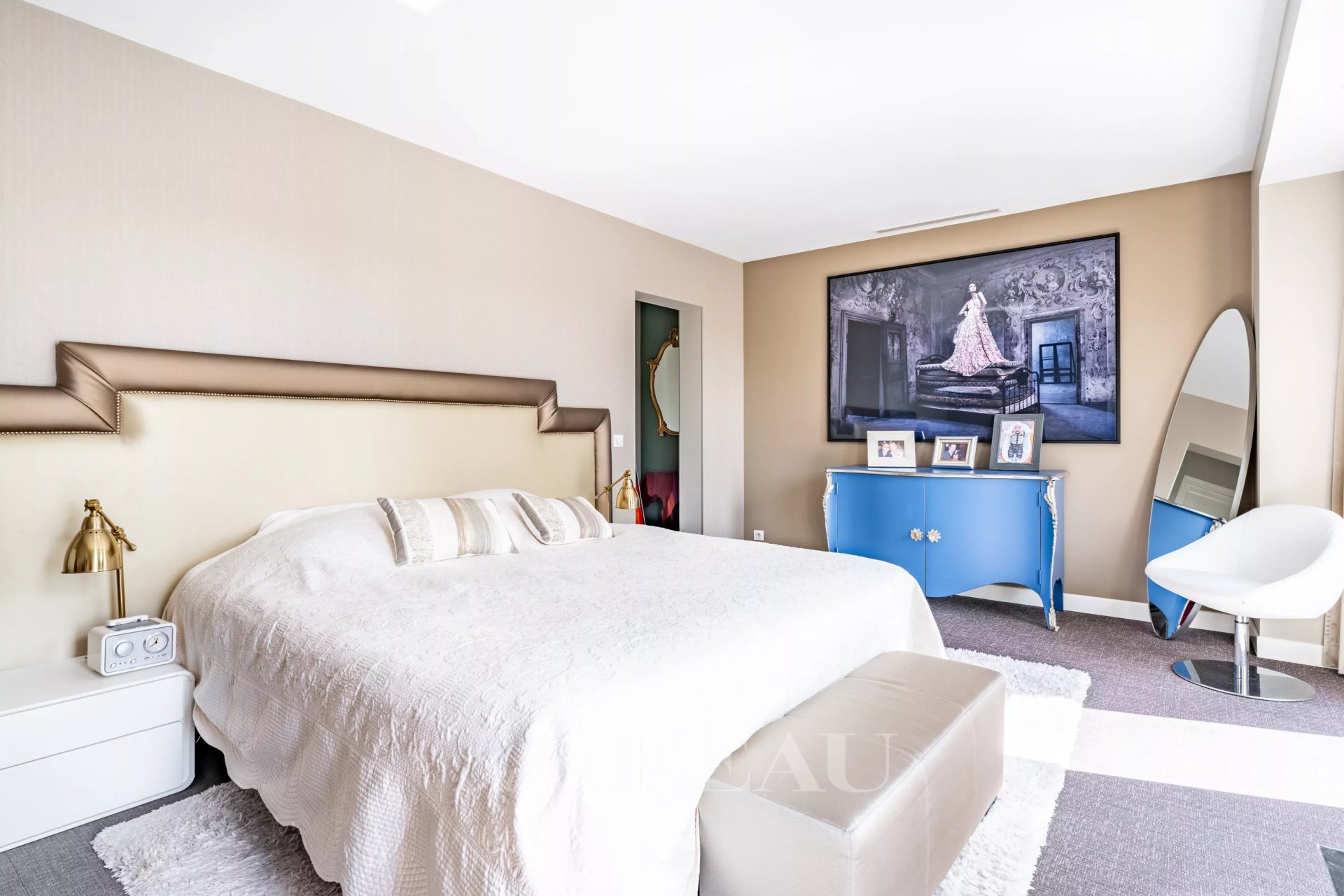 A few steps lead to a guest bedroom with a bathroom and wc, a mezzanine study, and a passage accessing the garden.