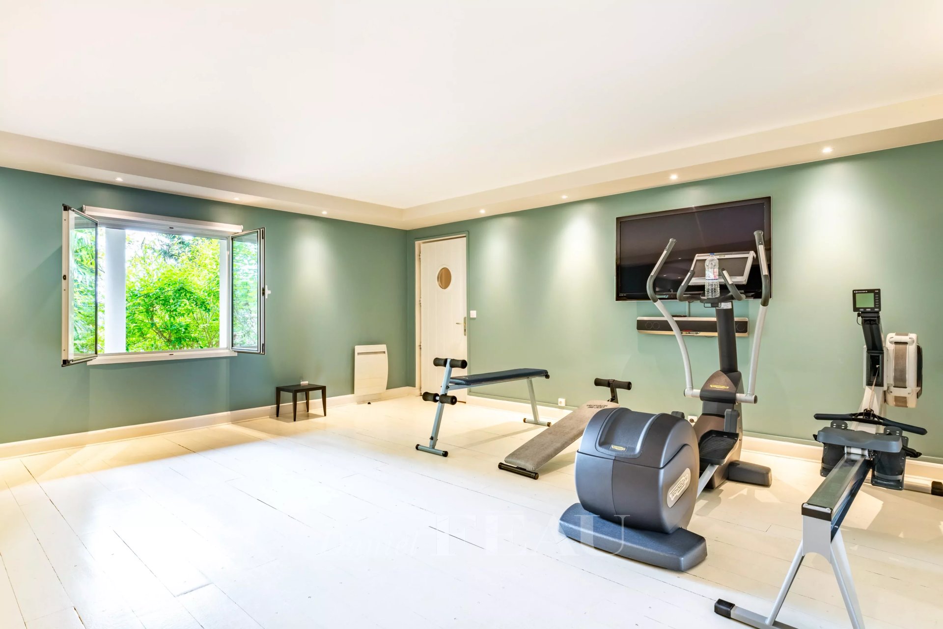 The garden-level basement comprises a large garage, a home cinema, a fitness room, a self-contained studio apartment with a shower room, and ample fitted storage space.