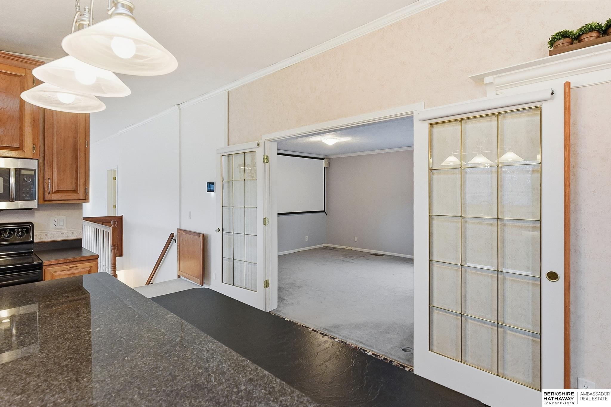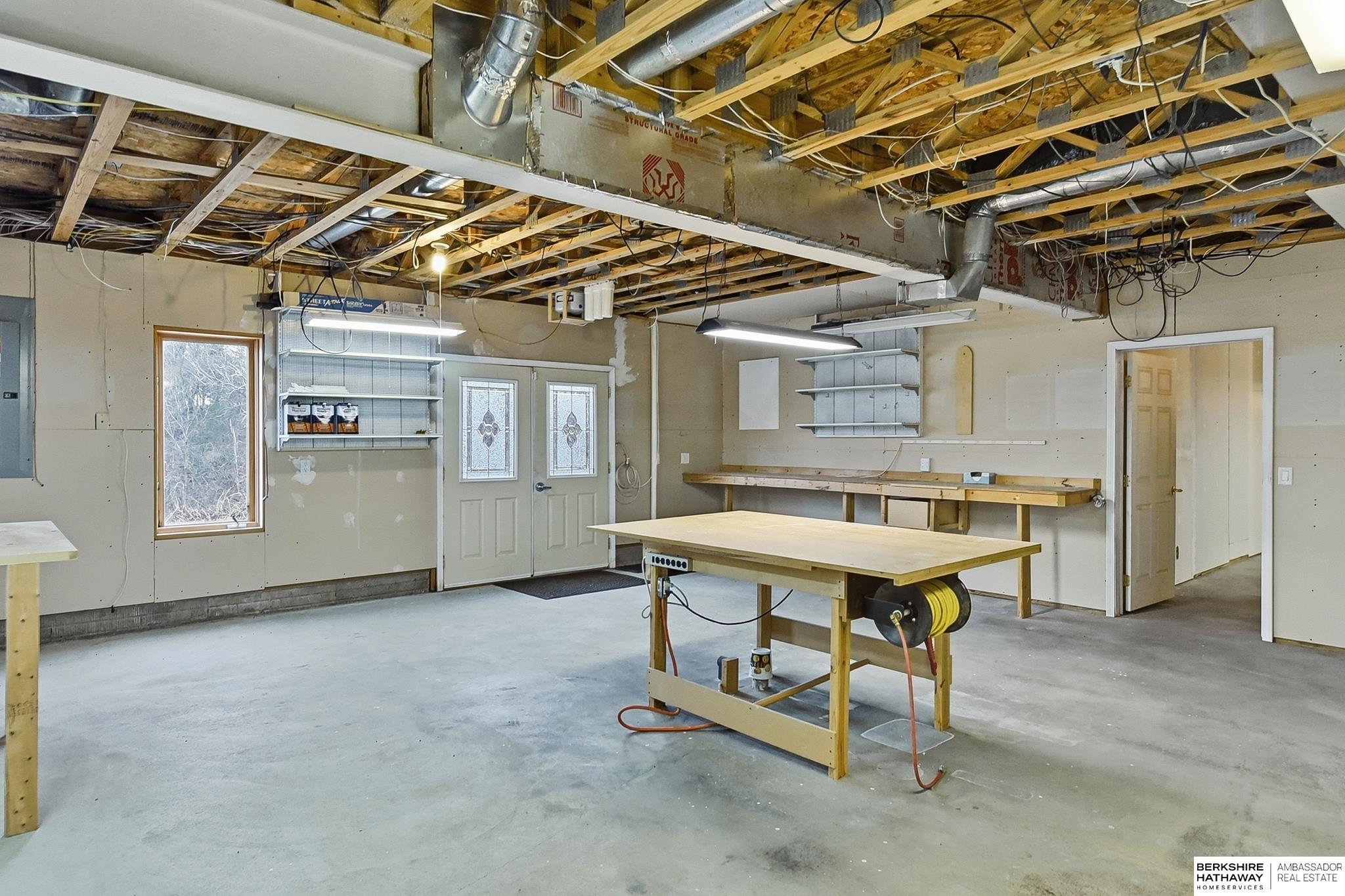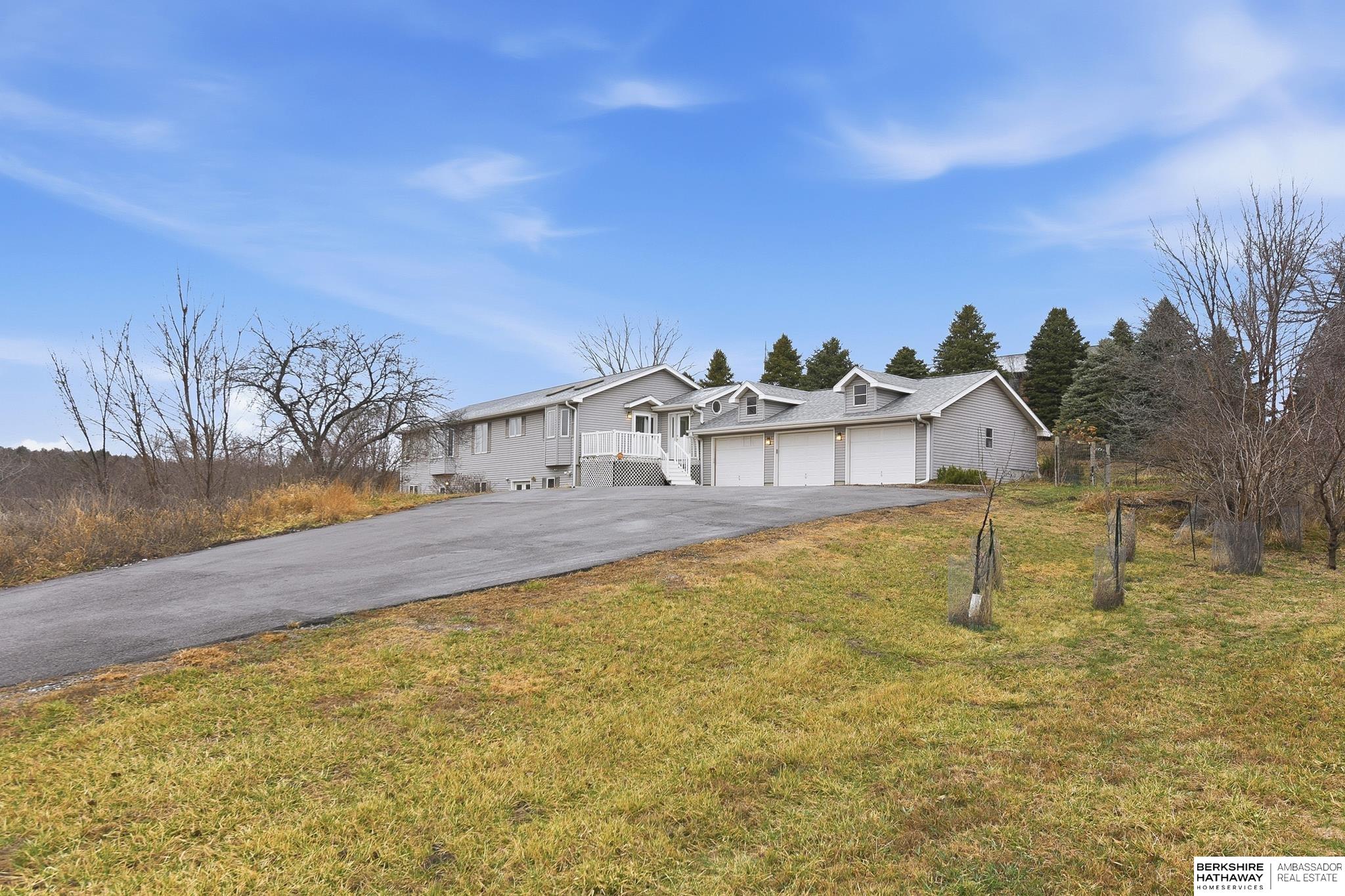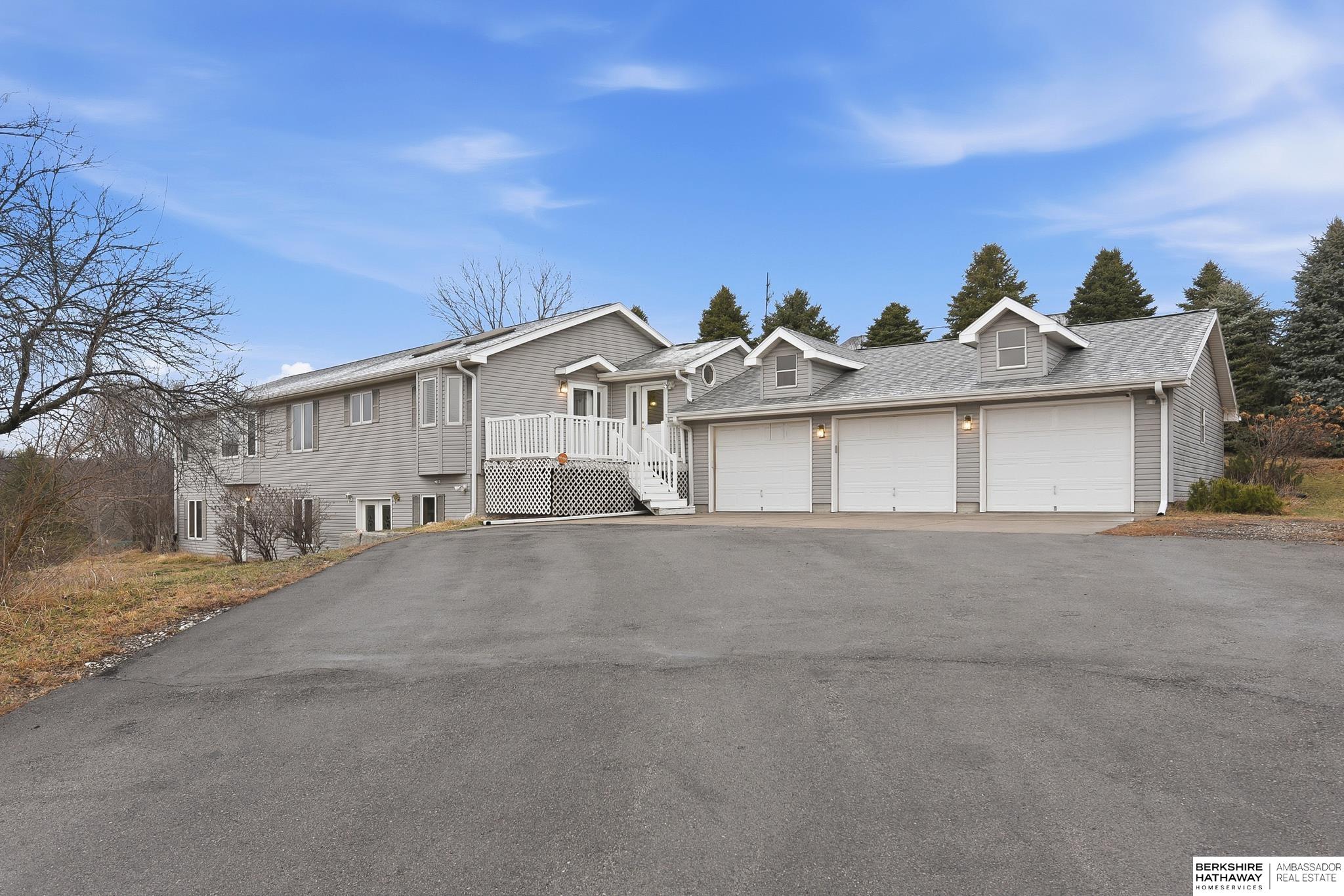 Enjoy peaceful living on 1.5 scenic acres with elevated views of beautiful trees and frequent visits from wildlife. This inviting ranch-style home offers 3 beds, 4 baths, and a 3-car garage, designed for comfortable living and flexible spaces. One of the home's incredible features is the climate controlled 25x25 indoor workshop with exterior double doors - ideal for woodworking, hobbies, projects, or storage. The kitchen features custom cherry cabinetry and flows easily into the main living areas. A spacious main-level family room could also serve as a home office or additional bedroom if desired. Convenient mudroom and main-floor laundry with half bath. The home offers added peace of mind with private well, septic, propane, and whole-house electrical EMP shield protection, with generator interlock connection. New roof 2025! Unique opportunity to update and personalize for potential added equity. Fantastic location near recreation with an easy commute and just 30 minutes to Offutt AFB.