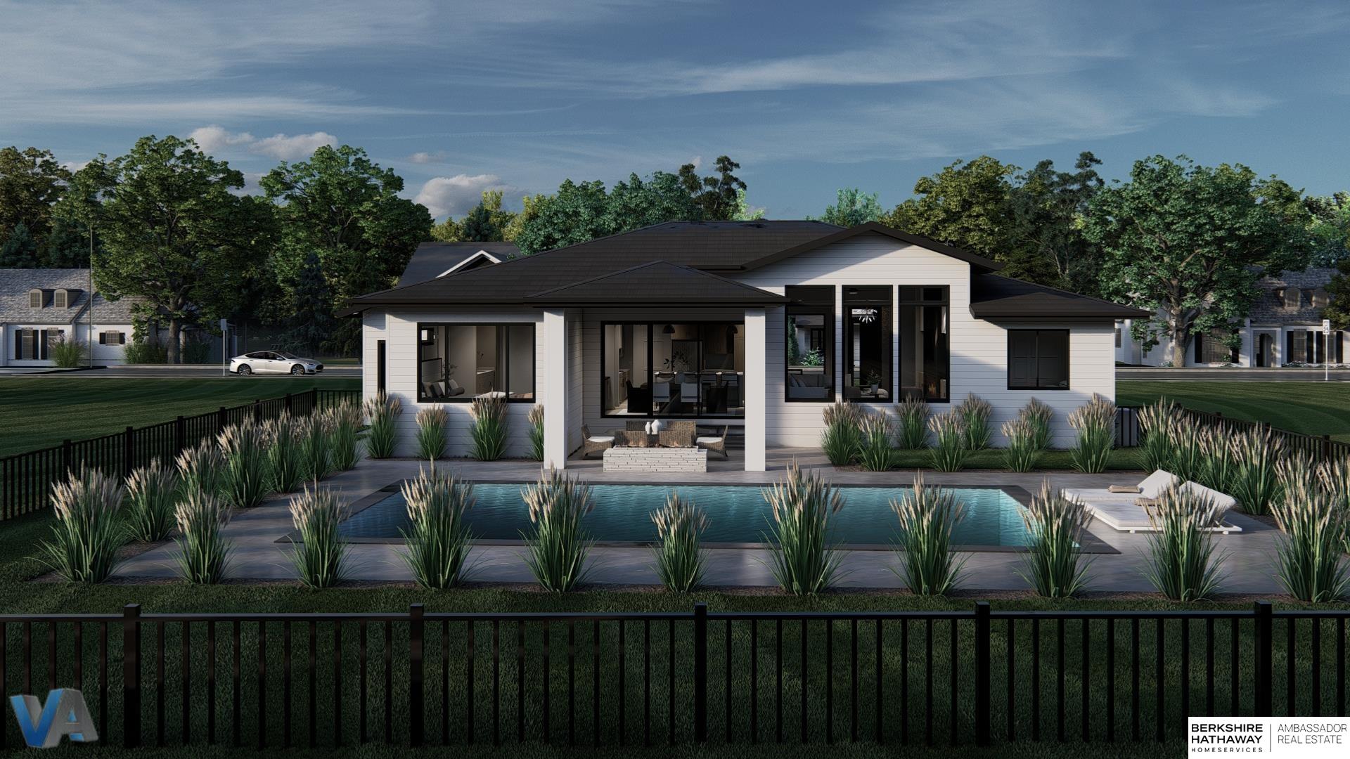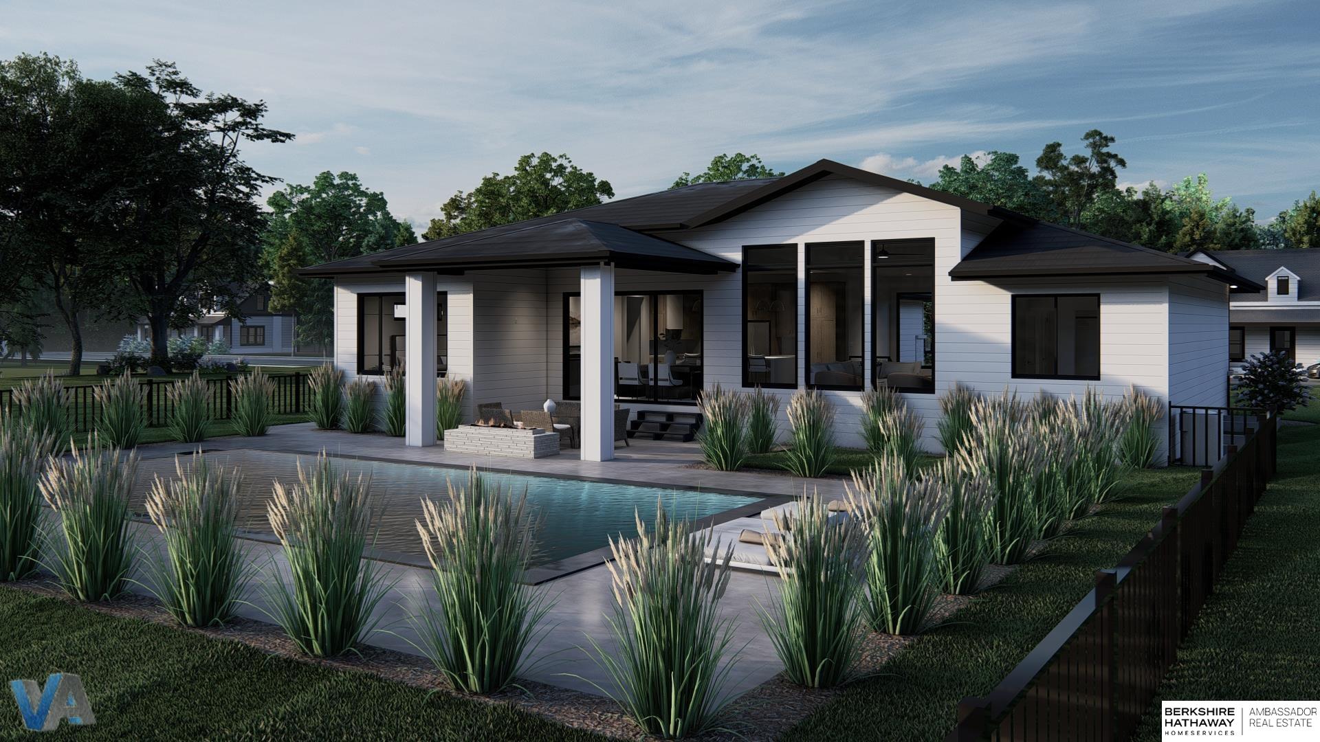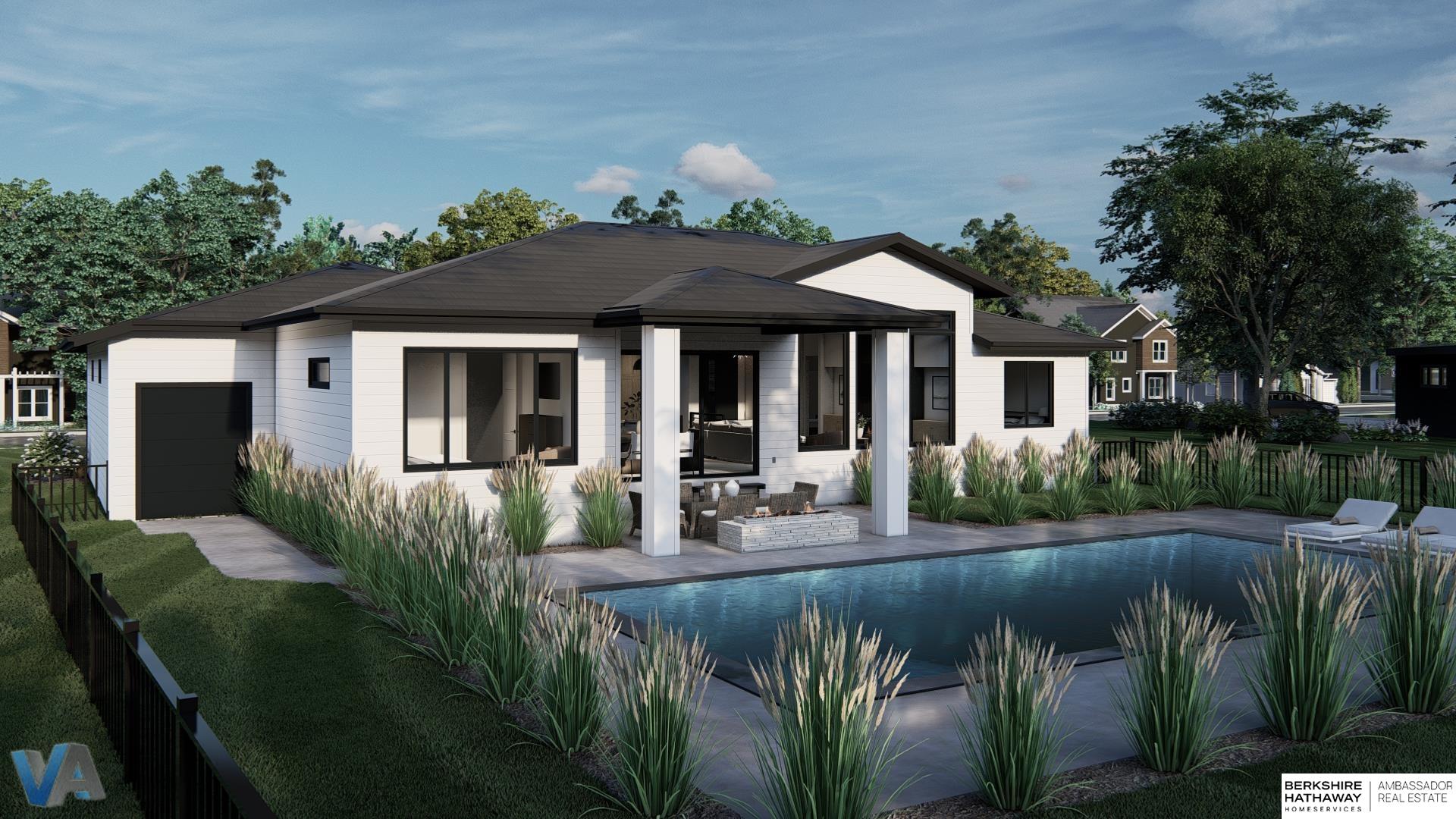 Exceptional Elkhorn Ranch with stunning pool offering 5 bedrooms (Plus theater Room), 3.5 bathrooms, and a 4-car insulated garage. The striking exterior features an in-ground pool with landscaping and an oversized covered patio with a gas fire pit, perfect for entertaining. Inside, the main level showcases LVP flooring, a stunning barrel ceiling in the chef's kitchen, an oversized quartz island, GE Caf appliances, and a hidden walk-in pantry with quartz prep space. The great room is anchored by a dramatic 74" electric fireplace with tile extending to the ceiling. Two spacious guest bedrooms share a full bath, while the private primary suite features a luxurious, tiled, walk-in shower and designer fixtures. Oversized black Andersen 100 windows flood the home with natural light and scenic views. The finished lower level boasts a rec room with fireplace, full wet bar, two additional bedrooms, bath, and versatile flex/theatre space.