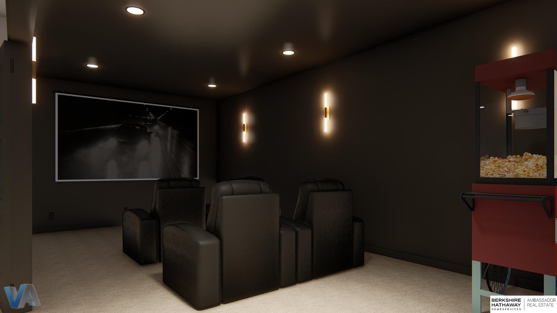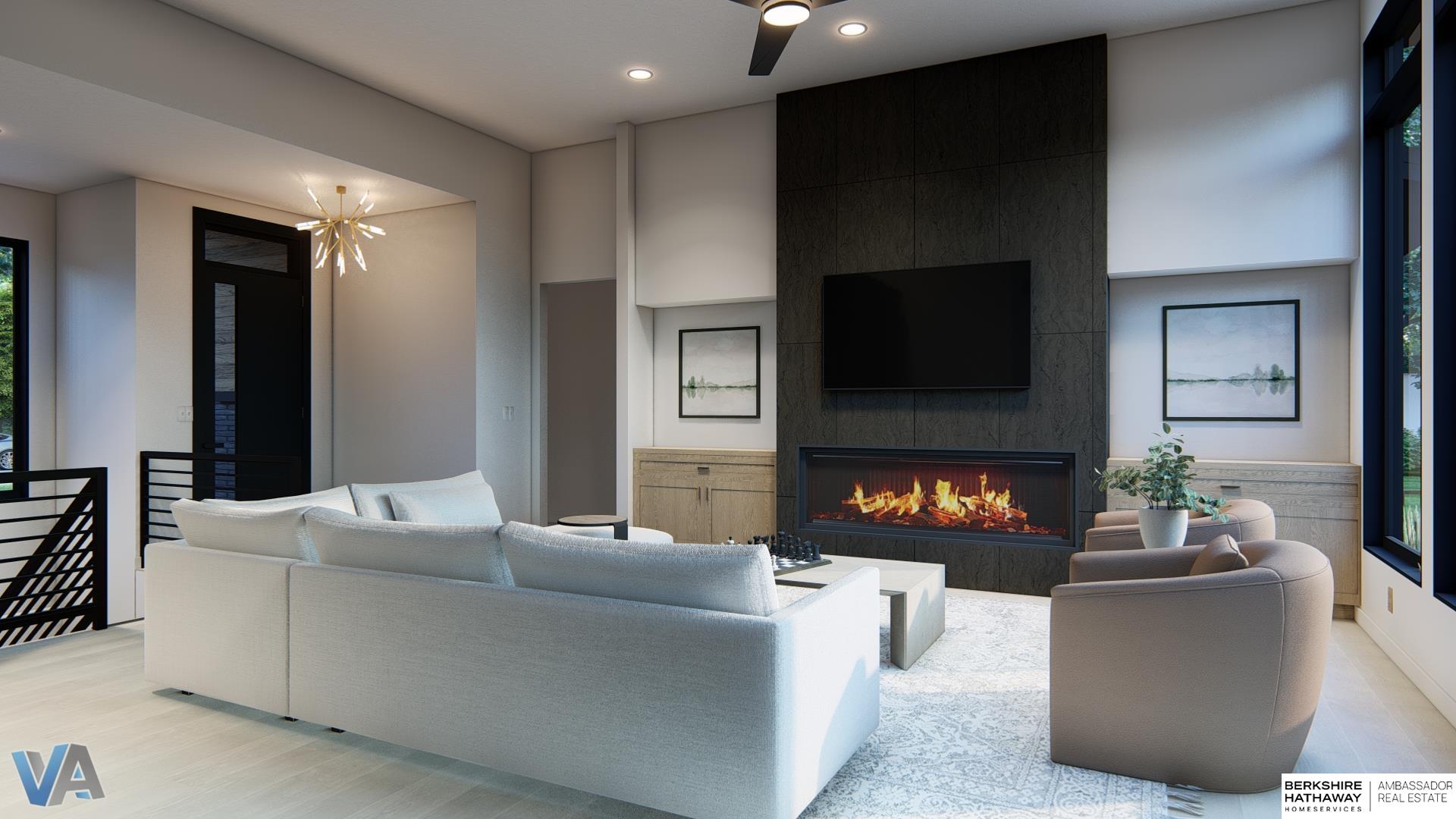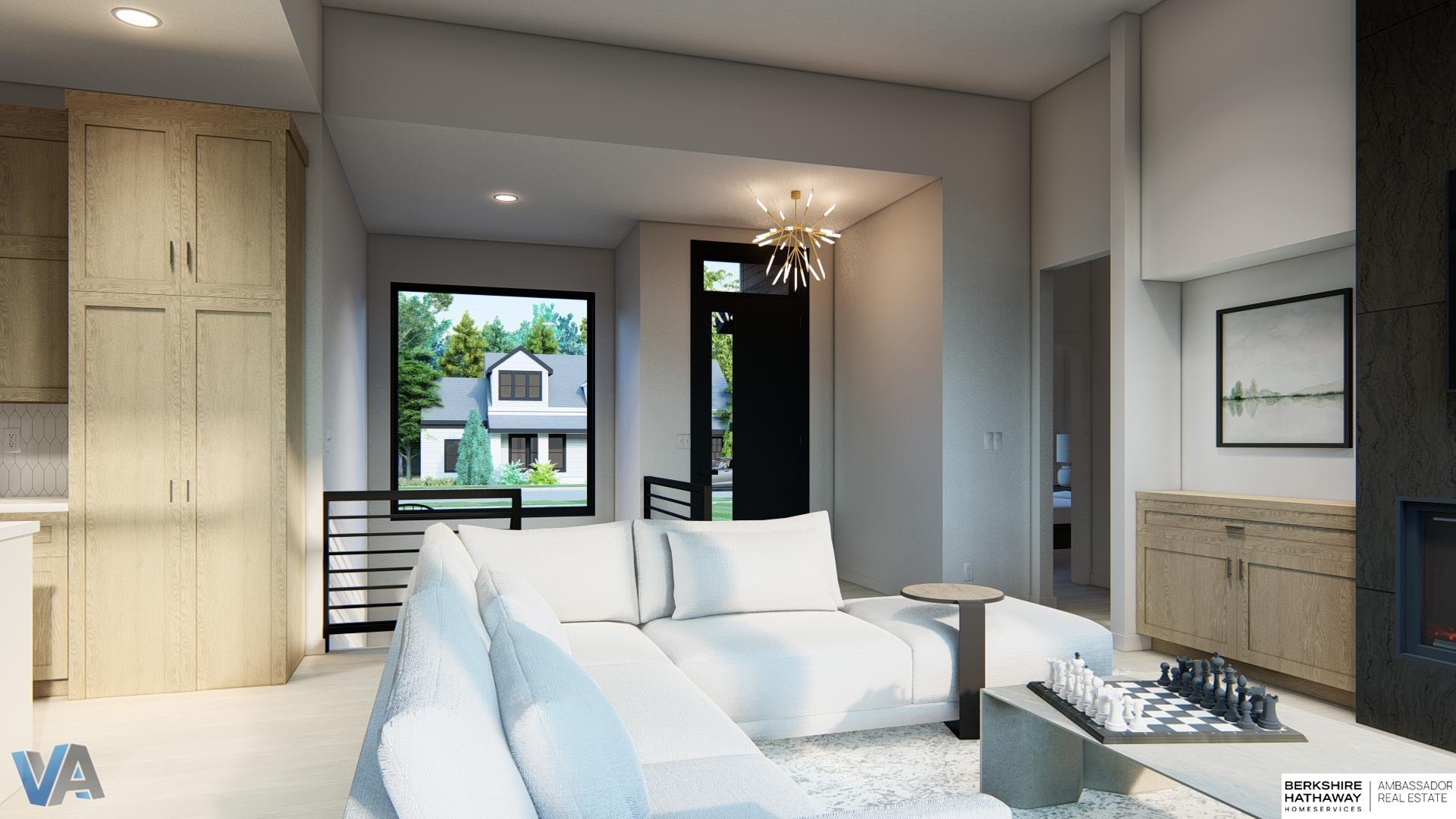 Exceptional Elkhorn Ranch with stunning pool offering 5 bedrooms (Plus theater Room), 3.5 bathrooms, and a 4-car insulated garage. The striking exterior features an in-ground pool with landscaping and an oversized covered patio with a gas fire pit, perfect for entertaining. Inside, the main level showcases LVP flooring, a stunning barrel ceiling in the chef's kitchen, an oversized quartz island, GE Caf appliances, and a hidden walk-in pantry with quartz prep space. The great room is anchored by a dramatic 74" electric fireplace with tile extending to the ceiling. Two spacious guest bedrooms share a full bath, while the private primary suite features a luxurious, tiled, walk-in shower and designer fixtures. Oversized black Andersen 100 windows flood the home with natural light and scenic views. The finished lower level boasts a rec room with fireplace, full wet bar, two additional bedrooms, bath, and versatile flex/theatre space.