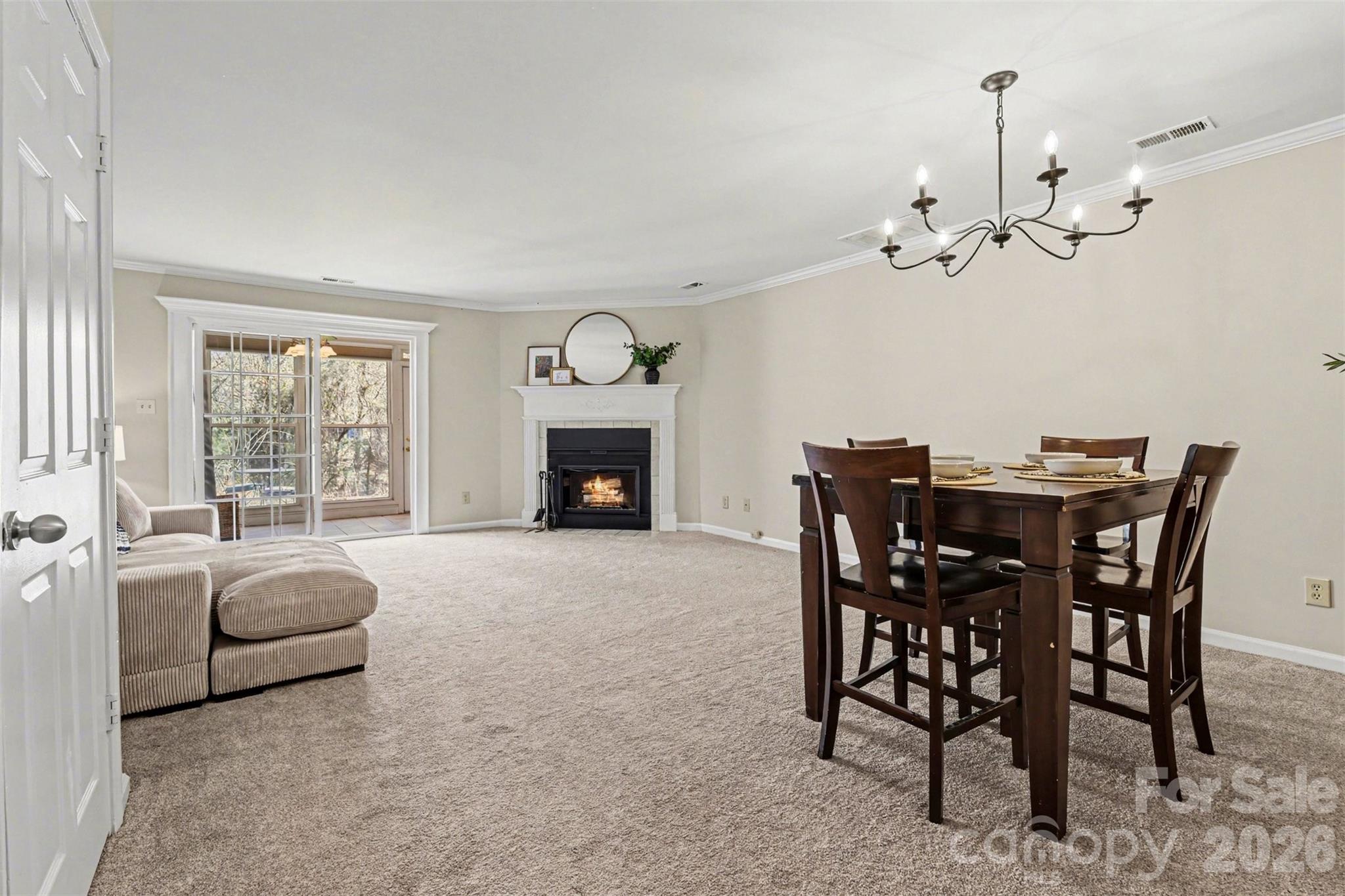 Well-maintained brick-faced end unit in the heart of South Charlotte with a convenient ground-level entry. Fresh, inviting, and a price hard to find in this location. Step inside to a welcoming foyer that opens to the main living area and spacious kitchen. The kitchen offers abundant countertop space plus flexible room for a breakfast table, coffee bar, or plant nook. The spacious living room is bright and inviting with freshly painted walls and a cozy corner fireplace. A wall of glass sliding doors opens seamlessly to the sunroom, creating an airy, light-filled living space that feels both open and connected. The sunroom, highlighted by a skylight, is the perfect place for morning coffee, a good book, or entertaining while overlooking the peaceful garden setting. Upstairs you'll find two spacious primary bedroom suites, each with generous closet space and a private attached bath. The laundry closet located on the upper level for everyday ease. Don't miss the endless storage opportunities throughout! Conveniently nestled up to McMullen Creek Greenway, it's quick access to daily walking trails, biking, or dog walking. Dunhill Court is a charming, smaller community with its own private parking lot and plenty of guest spaces. Quick access to shopping, dining, hospitals, highways, and everyday conveniences makes this location hard to beat.