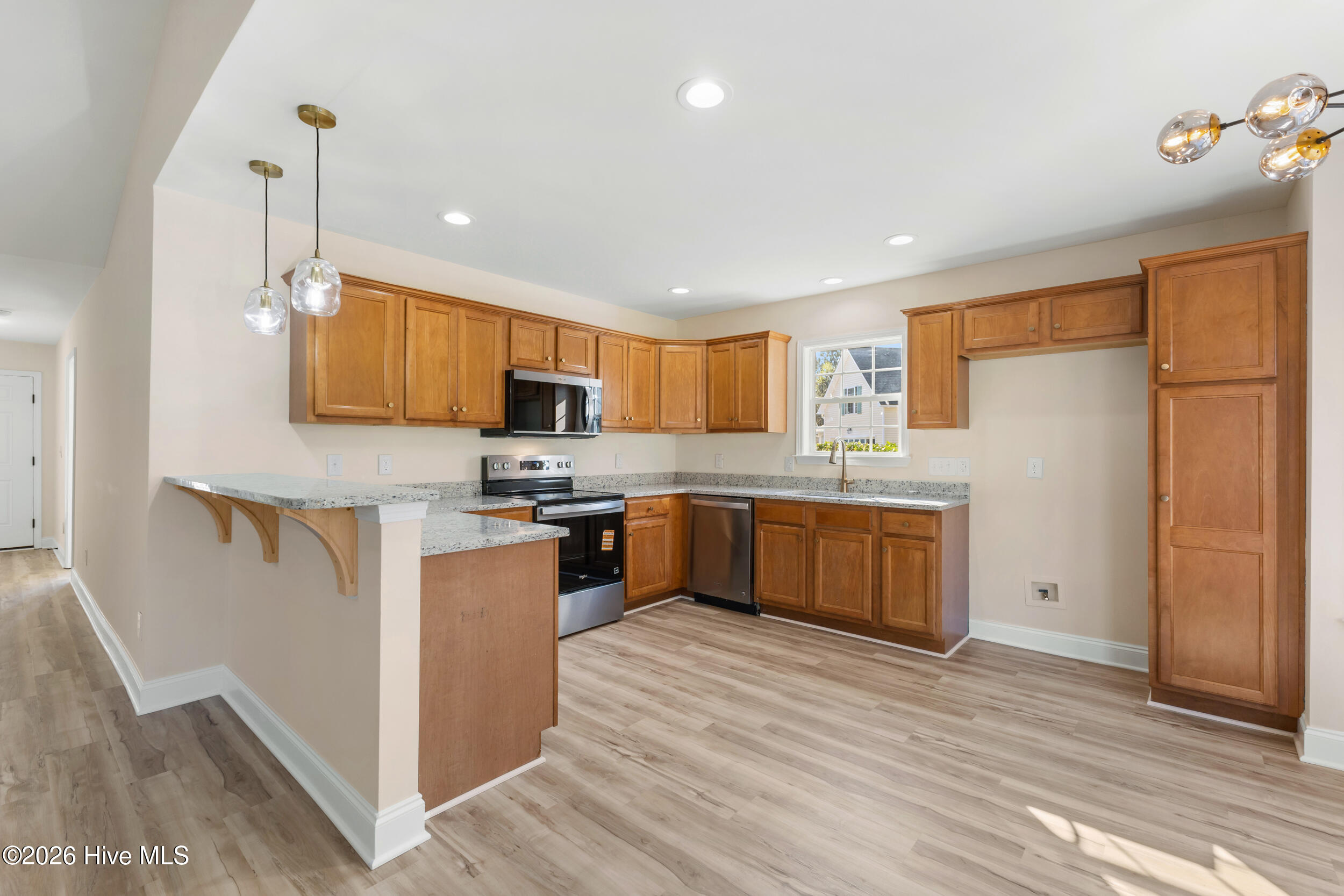 Welcome to 1035 Stony Woods Drive in Leland, a beautifully renovated home offering modern upgrades, thoughtful improvements, and move-in ready convenience just minutes from Wilmington. This property has been extensively refreshed inside and out, combining stylish finishes with important mechanical updates that today's buyers appreciate. One of the most valuable improvements is the brand new roof installed in 2026, providing peace of mind and long-term durability. Inside the home you'll find new Kitty Hawk 20 mil luxury vinyl plank flooring, new carpet, and fresh Alabaster paint throughout the entire interior including ceilings, creating a bright and cohesive feel throughout the home. The kitchen has been upgraded with new granite countertops, champagne bronze cabinet hardware, and a champagne bronze kitchen faucet that complements the updated design. Cabinets feature soft-close functionality, and the kitchen plumbing has been updated with a new garbage disposal, P-traps, shut-off valves, escutcheons, and supply lines, providing both cosmetic and functional improvements. Both bathrooms have been updated with modern finishes and upgraded plumbing. The primary bathroom features matte black Moen tub and shower trim, upgraded drain and overflow components, dual matte black vanity faucets, and new push-up drains along with new plumbing connections beneath the vanity. The guest bathroom has also been refreshed with a new matte black vanity faucet, updated tub and shower trim, and a newly installed toilet. Additional improvements throughout the home include new ceiling fans, new interior and exterior light fixtures, new outlets and light switches, new thermostats for both levels, new smoke detectors, and updated HVAC vent covers. The garage has been freshly painted and upgraded with modern hexagon ceiling lighting and a keyless entry pad, creating a clean and functional space. Outside, the property features new landscaping with azaleas, roses, and fresh mulch along with a new mailbox, enhancing curb appeal. Located in Leland, one of the fastest growing areas in coastal North Carolina, this home offers convenient access to downtown Wilmington, shopping, dining, and major commuter routes along Highway 17. Residents enjoy proximity to Brunswick Forest, Leland Town Center, golf courses, parks, and area beaches including Wrightsville Beach, Oak Island, and Carolina Beach. With extensive updates, modern finishes, and a brand new roof in 2026, this home offers the perfect combination of style, comfort, and location.