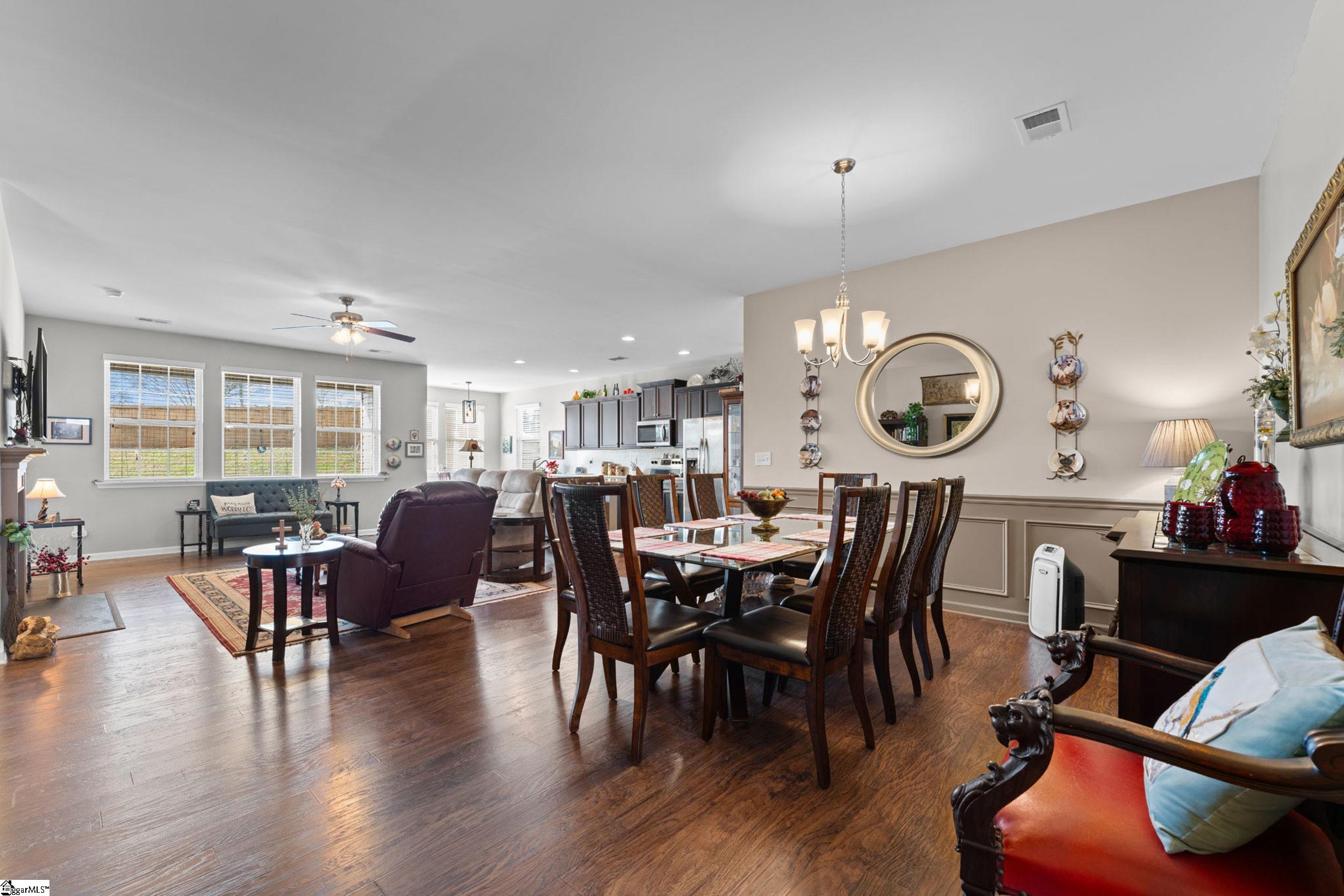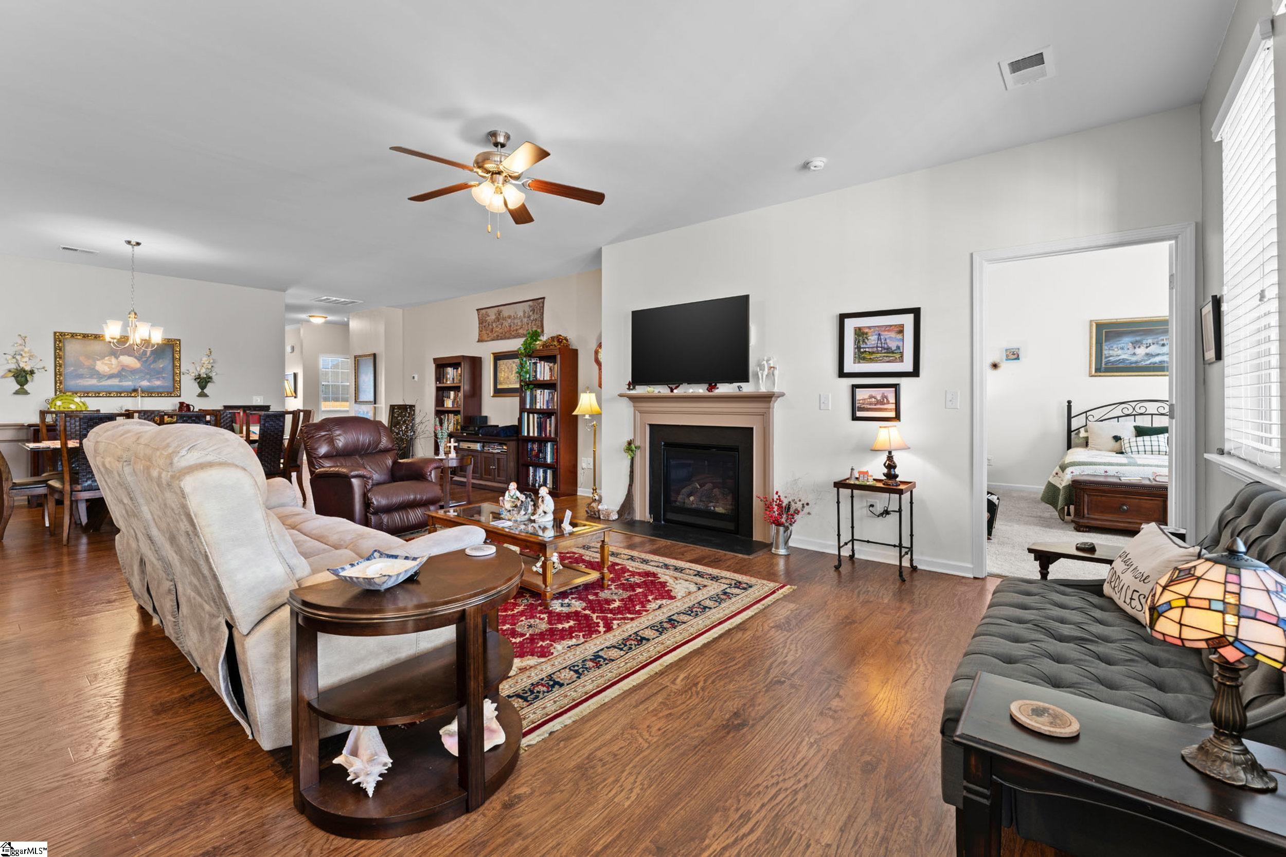 Move-in ready single-story living zoned for the sought after Spartanburg District 5 schools. The open-concept floor plan with defined living spaces offers the best of both worlds - connection and functionality making it easy to host friends, entertain family, or enjoy everyday moments together. The welcoming foyer opens to a sunny-filled great room with gas-log fireplace, a spacious dining area that comfortably seats eight, and a bright kitchen featuring a large island ideal for seating and serving. The kitchen boasts granite countertops, tile backsplash, rich, dark cabinetry, recessed lighting, a full stainless-steel appliance package, pantry closet, and a cozy breakfast nook for casual meals. Two secondary bedrooms share a generous hall bath with tub/shower combo. The primary suite offers a vaulted ceiling, walk-in closet, and a private bath with dual sinks, garden tub, and separate shower. A large walk-in laundry room is conveniently located off the kitchen with direct access to the two-car garage, offering plenty of storage for shoes, backpacks, and everyday essentials. Enjoy outdoor living in the fully fenced backyard with a covered patio, grilling patio, and a spacious yard with room for gardening, playsets, and pets. Neighborhood amenities include a clubhouse, pool, sidewalks, and streetlights - perfect for jogging and dog walking. Ideally located less than 10 minutes from downtown Greer and downtown Lyman/Duncan, and under 20 minutes to GSP International Airport and BMW. A prime location and thoughtfully designed layout make this home a must-see - schedule your showing today!