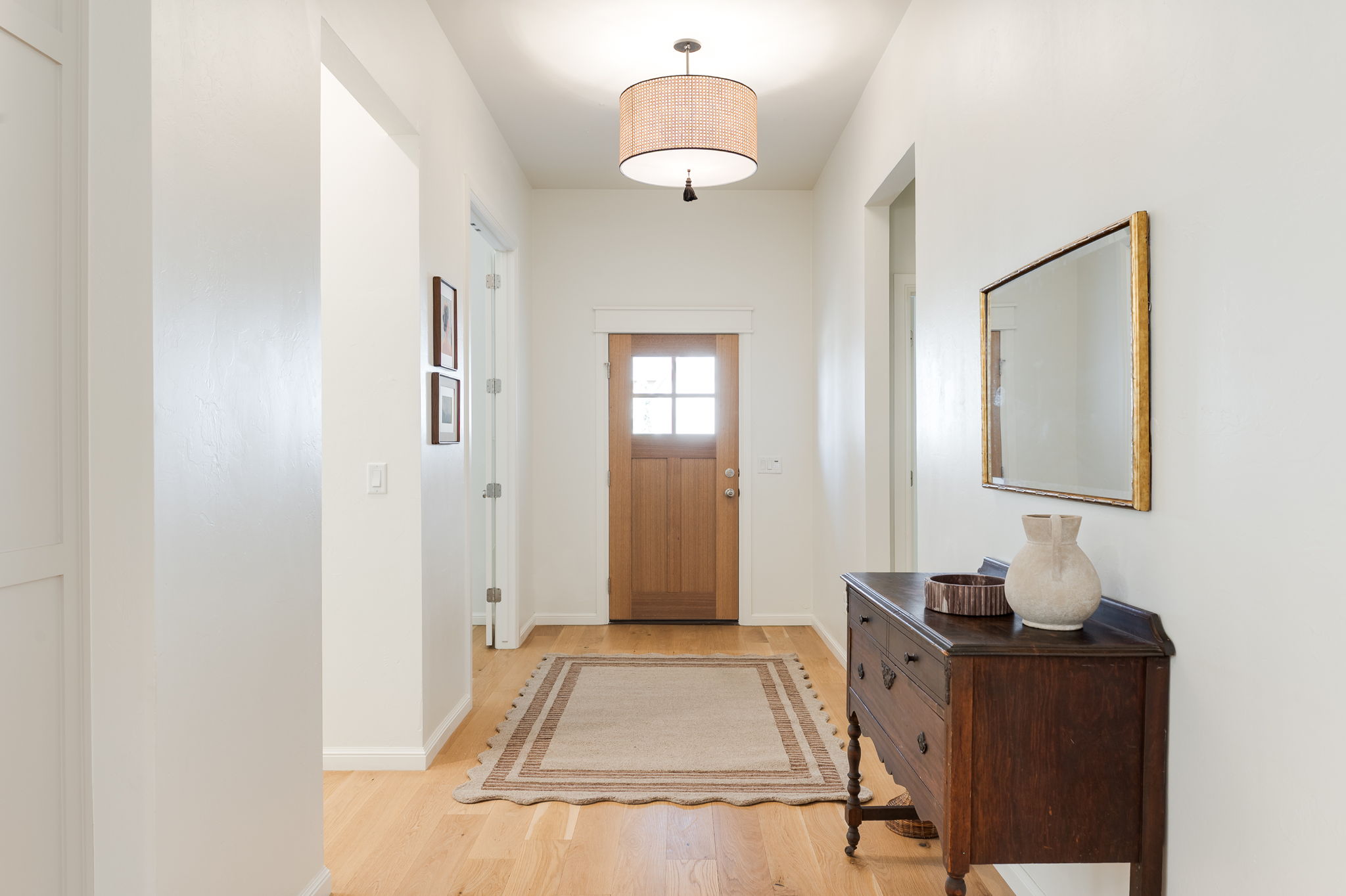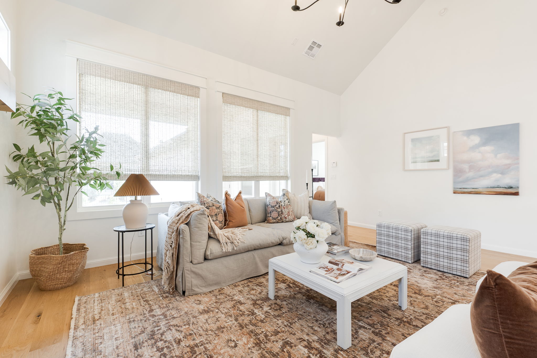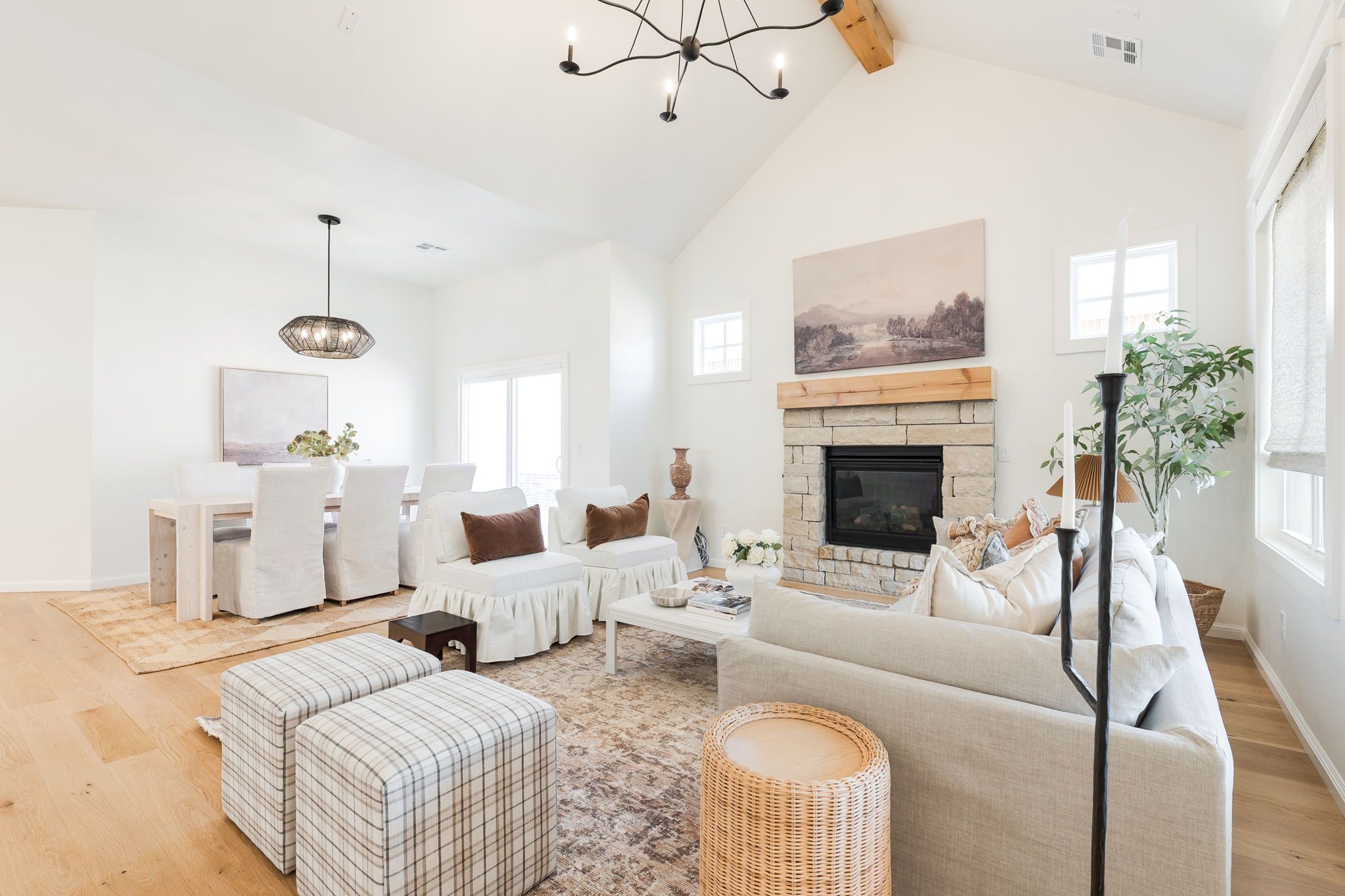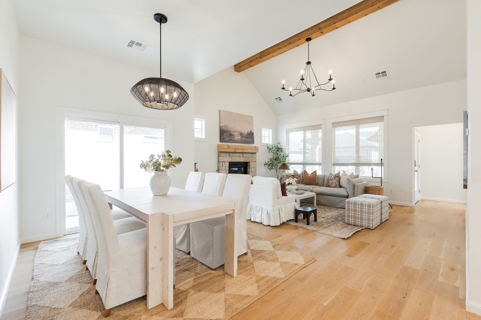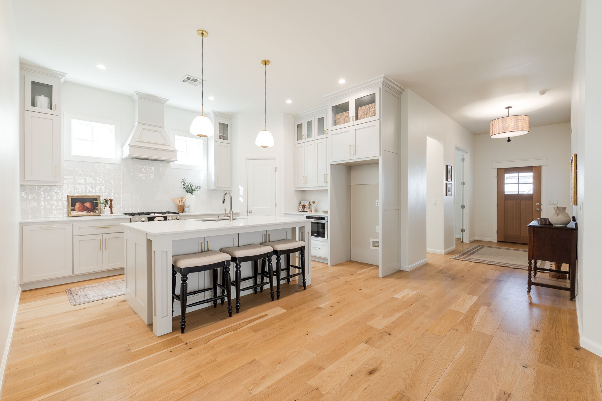 Welcome to 1816 Plaza District Dr, a charming white-painted Tudor-style home built in 2021 and perfectly nestled in Town Square, one of Edmond's most vibrant communities. With its storybook curb appeal and inviting front porch, this home immediately feels warm, stylish, and thoughtfully designed. Inside, you’ll find beautiful light wood floors throughout and an open, light-filled layout with incredible ceiling height. The kitchen is the heart of the home, featuring a large island, quartz countertops, brushed brass hardware, and abundant workspace, perfect for entertaining or everyday living. The living area centers around a stunning stone fireplace, creating a cozy yet elevated space. Just off the entry is a versatile room with French doors, ideal for a home office, playroom, or second living space. The layout offers great privacy with two secondary bedrooms on one side of the home and a spacious primary suite tucked away on the other. The primary retreat includes dual vanities and an oversized closet. The garage is rear-entry from the alley and connects to the home via a covered walkway, adding both charm and convenience. Beyond the home itself, you’ll love being part of this incredible neighborhood with amenities that include a community gym, pool, and regular neighborhood gatherings, creating a true sense of community in the city of Edmond.