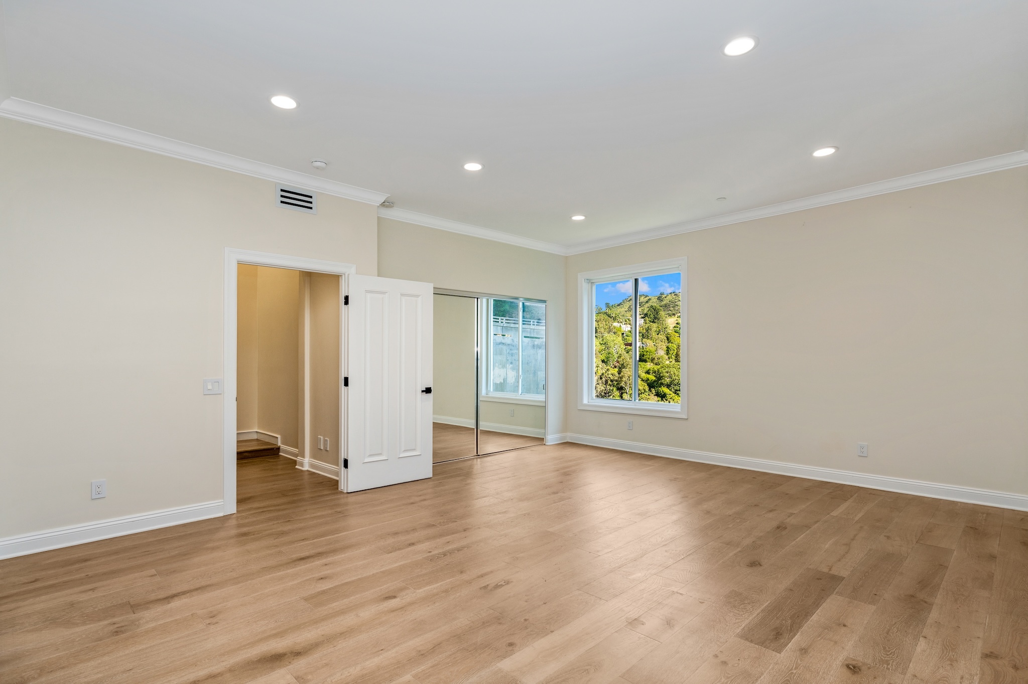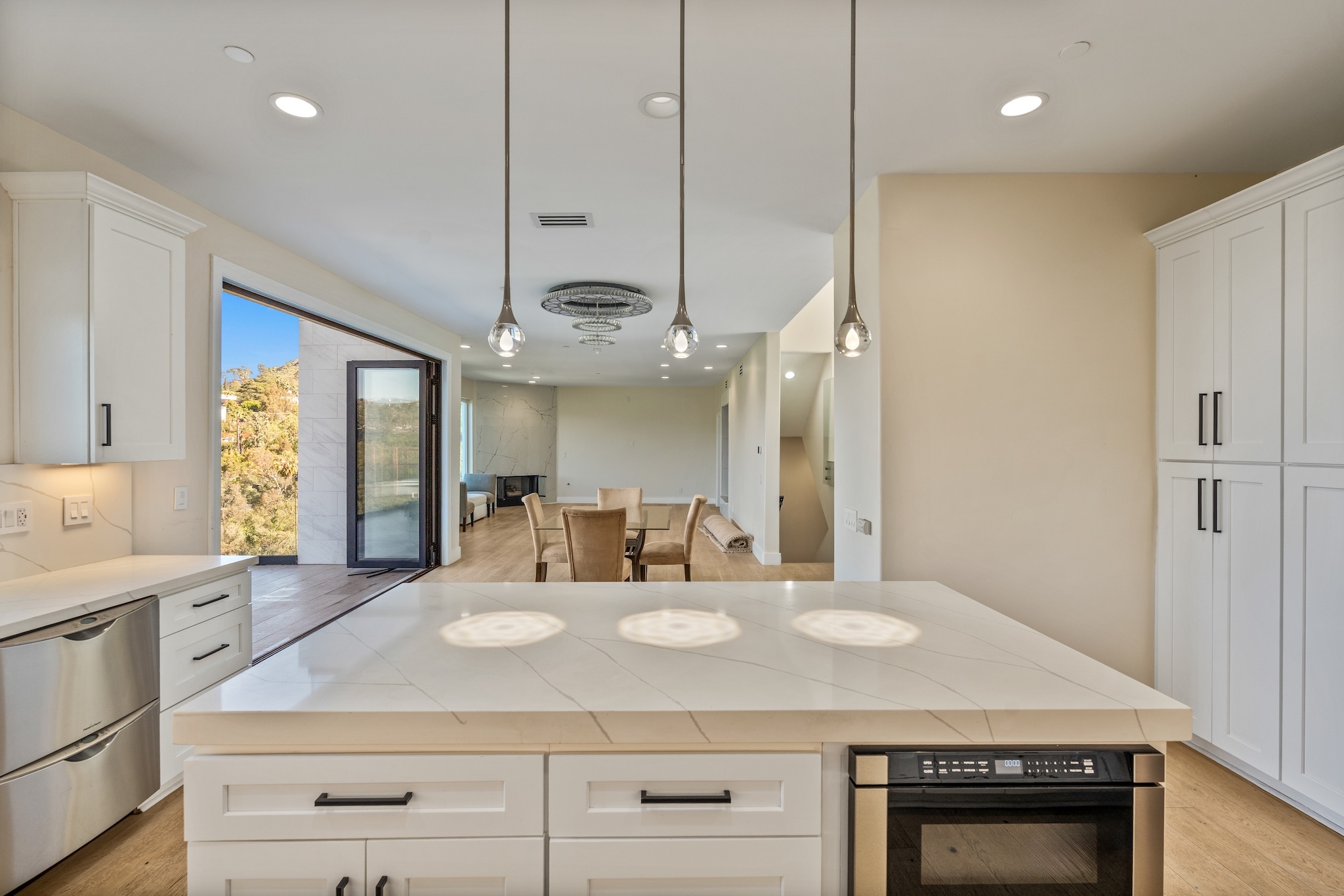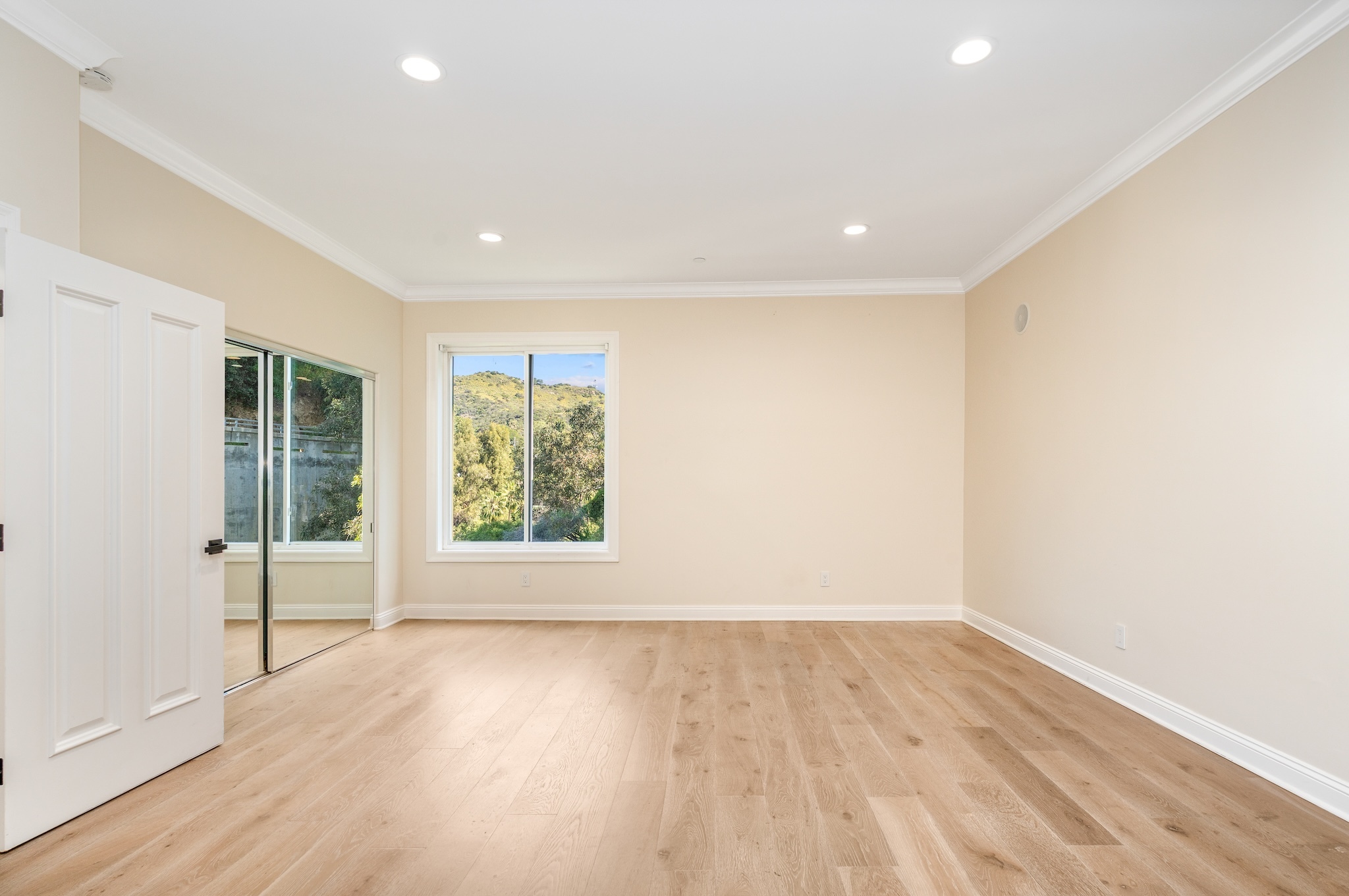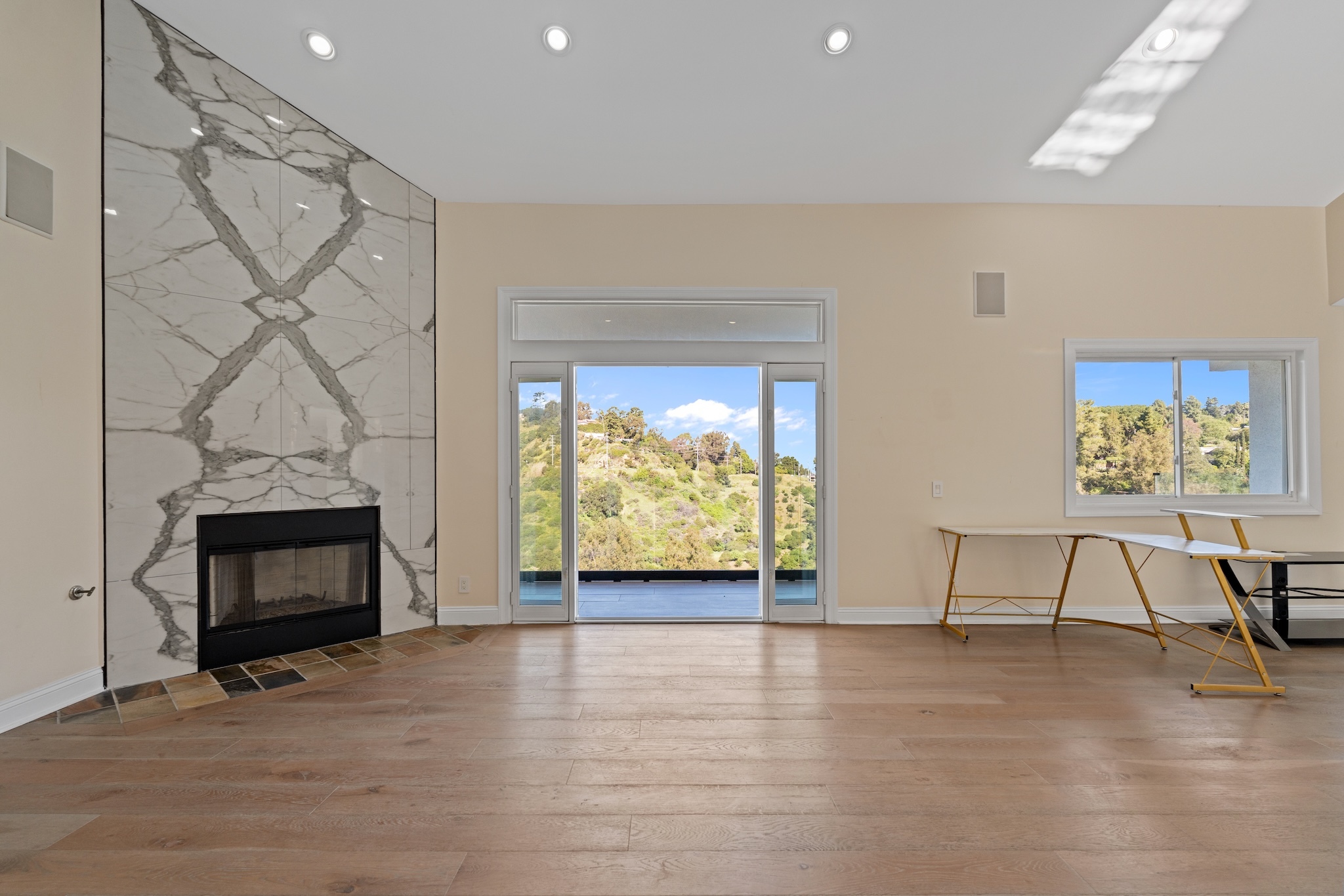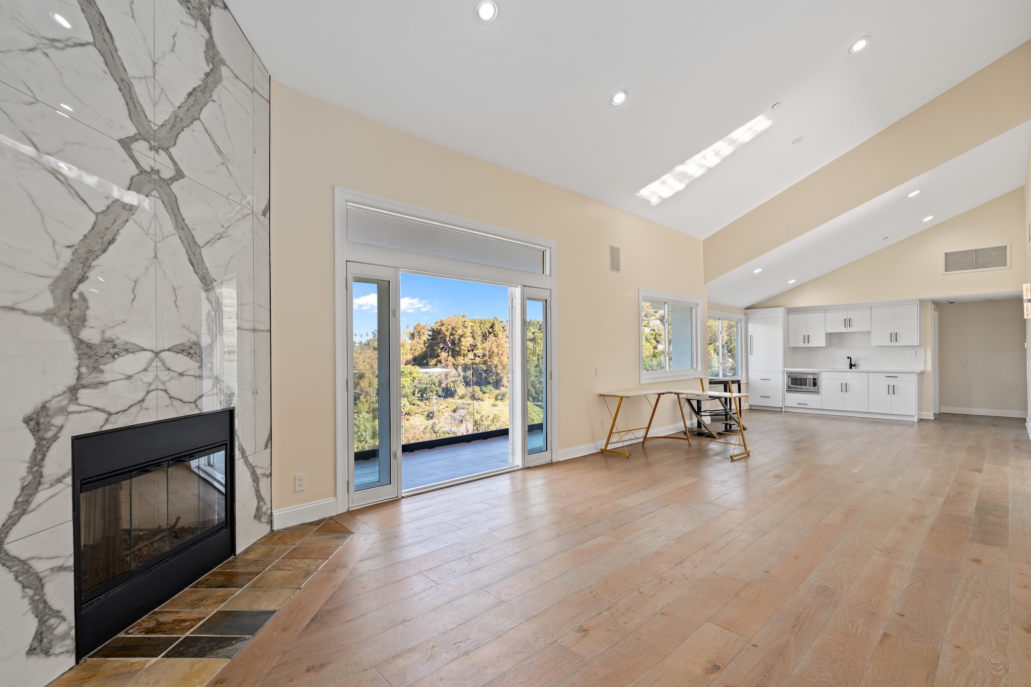 Hidden along a private road off Woodrow Wilson Drive near Mulholland, this Hollywood Hills home for sale offers exceptional privacy, scale, and sweeping canyon and hillside views. Spanning nearly 5,000 square feet, this five-bedroom Hollywood Hills residence combines architectural volume with a flexible layout designed for both entertaining and comfortable everyday living. Inside, soaring ceilings and wide-plank oak floors create a warm, contemporary atmosphere. The chef's kitchen features stone countertops, custom cabinetry, wine refrigeration, and generous prep space, ideal for both casual dining and hosting. A versatile split-level loft provides additional living flexibility and can function as a home office, creative studio, media room, gym, or guest suite, complete with its own kitchen and bath. Spa-inspired bathrooms, integrated smart home systems, surround sound, and security features enhance convenience and comfort throughout the home. Located within the highly desirable Carpenter Community Charter School District, this Hollywood Hills property near West Hollywood is just minutes from major film and television studios, Sunset Strip dining and nightlife, and offers convenient access to both the Westside and the San Fernando Valley. Combining privacy, expansive living space, canyon views, and a premier Hollywood Hills location, this hillside retreat presents a rare opportunity in one of Los Angeles' most sought-after residential neighborhoods.