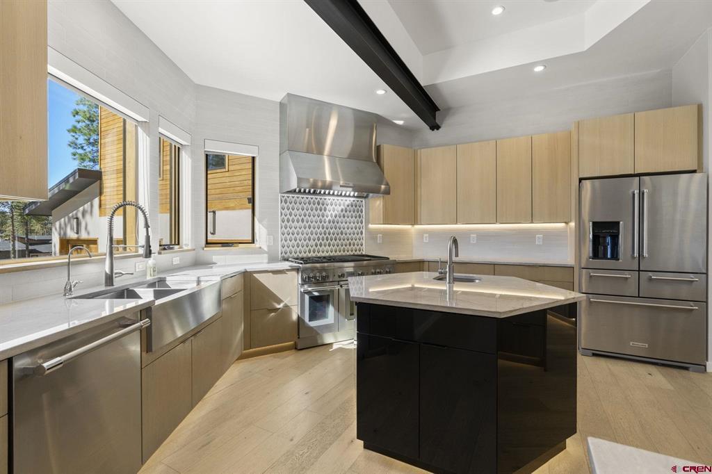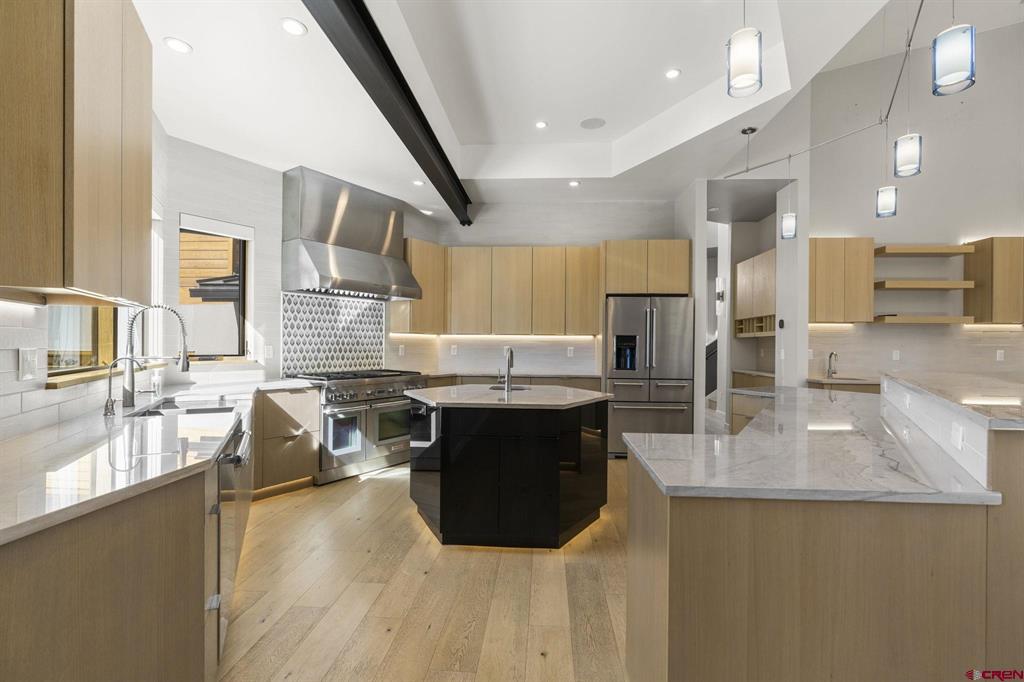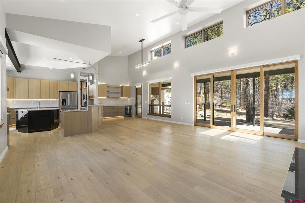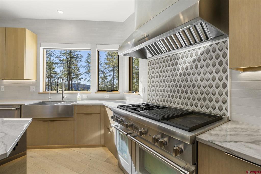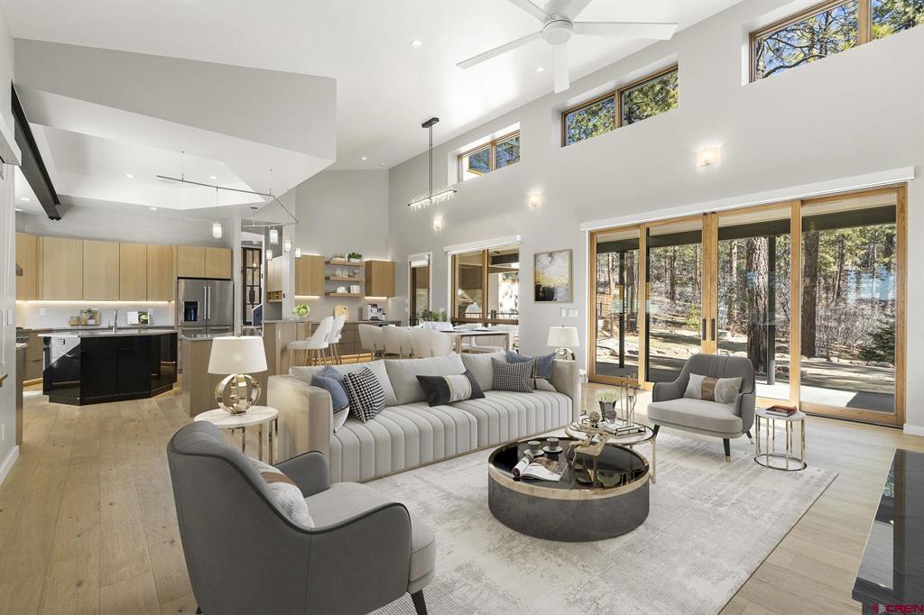Exceptional mountain-modern residence in coveted Edgemont Highlands - just 6 miles to downtown Durango. This thoughtfully designed five bedroom, six bath home is built and finished to a meticulous standard, offering elevated indoor/outdoor living, smart-home automation, and premium chef-grade amenities. This home is has hiking trails, river fishing rights, beautiful views and sits on a gorgeous landscaped lot that backs up to open space. Gourmet kitchen and service areas: Thermador 60" 4-burner gas range with griddle and grill, Taj Mahal quartzite counters, CuisineArt fridge, butler's pantry with refrigerated drawers, wet bar with wine cooler, and a commercial-grade outdoor kitchen featuring a Lynx grill, pizza oven and alfresco prep station. A convenient kitchenette in the guest suite adds flexibility for visitors or long-term stays. Entertainment & comfort: Two Napoleon fireplaces (LVX38N-1) with full LED color control, Sonos whole-home audio integrated via ELAN, and designer lighting by Hammerton, Hubbardton Forge and Visual Comfort. Relax on three flagstone patios, soak in the 5-6 person Jacuzzi hot tub, enjoy an outdoor gas fireplace (Lumacast Aura), or rinse off in the outdoor shower. Extensive natural stone and handcrafted plaster finishes lend warmth and character throughout. Smart, secure, and efficient: Fully integrated Lutron system, Phylos automatic water shutoff controllable by phone, solar integration (SolarEdge/Shaw), hard-wired 4-room split AC, reverse osmosis drinking water, whole-house Pentair Fleck 5810 water softener, built-in Caslero Topaz RSC+ fire rated safe, and steam Kohler shower for spa-like luxury. Practical luxury: Two sets of GE washers/dryers (including stackable), custom walk-in closets and storage in bedrooms, exercise room and garage, extra outdoor toy garage with separate entrance, Kolbe Vista-Lux windows, custom metal Agritek fencing, and recent extensive fire mitigation and landscaping by Momentum Tree Experts, True Blue and San Juan Waterworks. There is also a level 2 electrical car charger. Designated open space surrounds the property for privacy and views that are spectacular to sit and enjoy. A turnkey, high-end mountain retreat combining performance systems, refined finishes, and exceptional outdoor amenities - perfect for entertaining, family living, and year-round comfort close to downtown Durango. Contact for private showing.