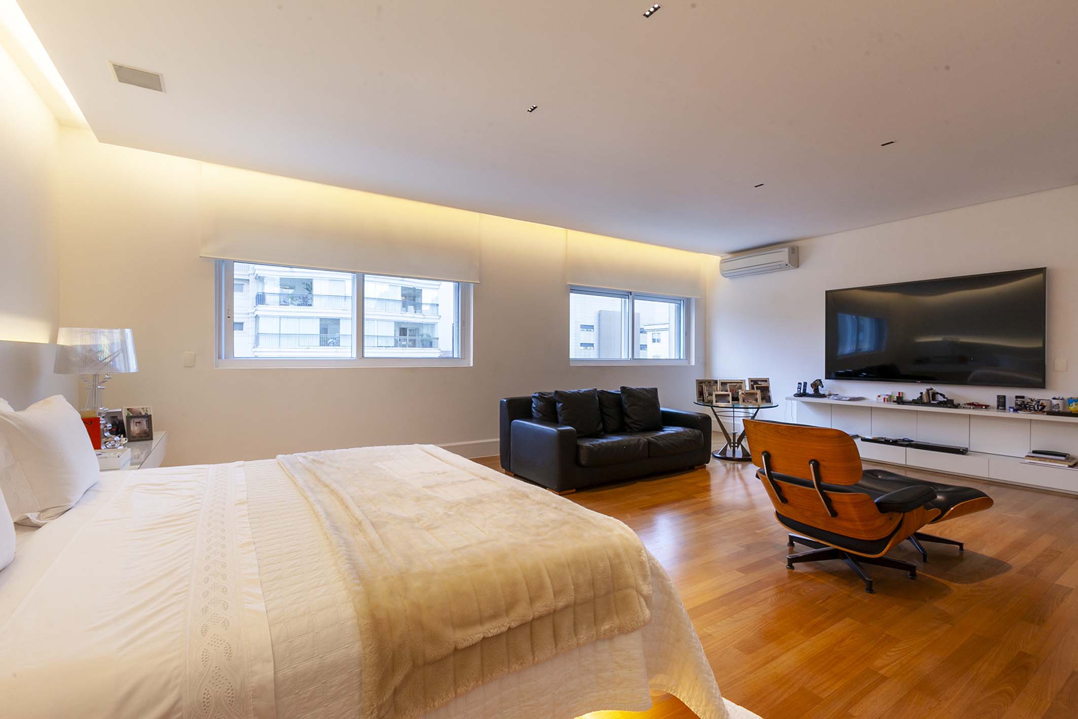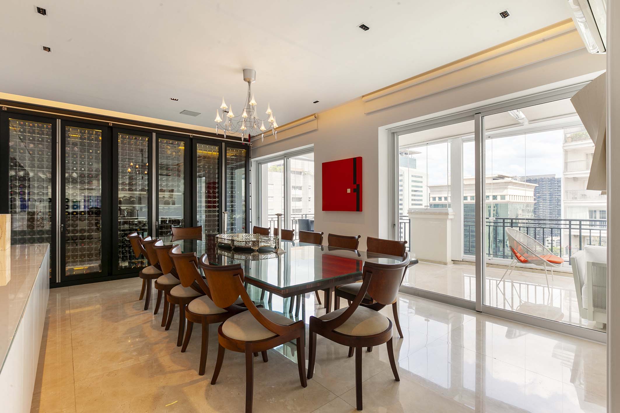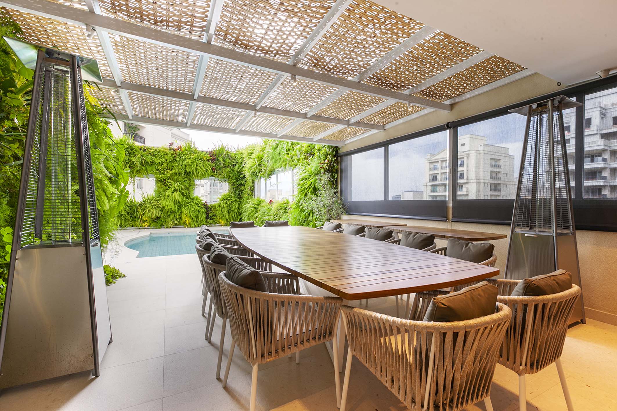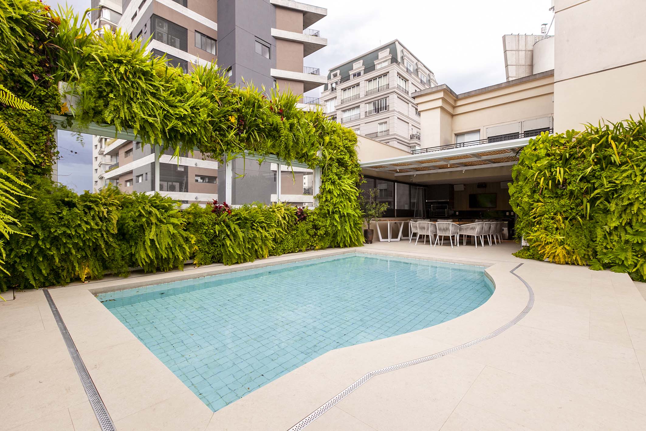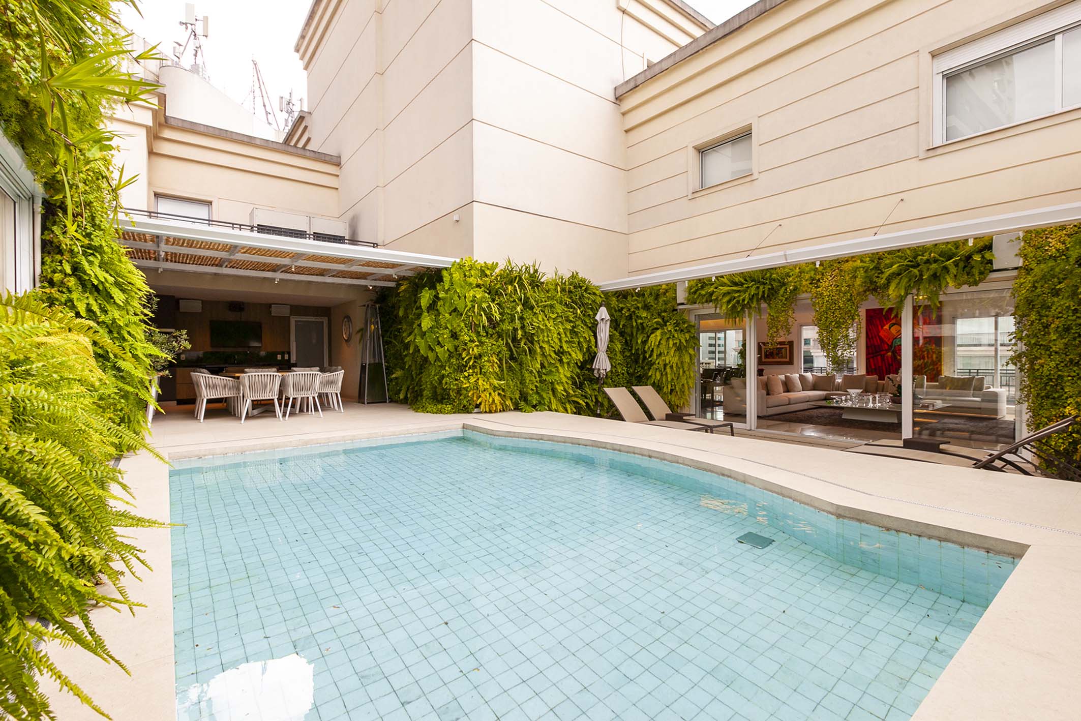 Renovated penthouse featuring a contemporary design and refined finishes. The spacious and bright living area integrates three environments, with a dining room that can be separated by sliding doors. The terrace offers a pleasant space for entertaining and connects to the outdoor area, which includes a pool and a gourmet space surrounded by thoughtfully designed landscaping. The upper floor houses the private area, comprising three suites, with the primary suite featuring a large walk-in closet for the couple and separate bathrooms for him and her. The kitchen, designed with an island and Kitchens cabinetry, combines elegance and functionality, complemented by an independent breakfast room, pantry, and laundry area with a service staircase leading to the upper floor. The residence also includes a linen closet, two staff bedrooms, eight parking spaces, and two storage rooms. The condominium offers an indoor heated lap pool, fitness room, sauna, party lounge, and visitor parking.