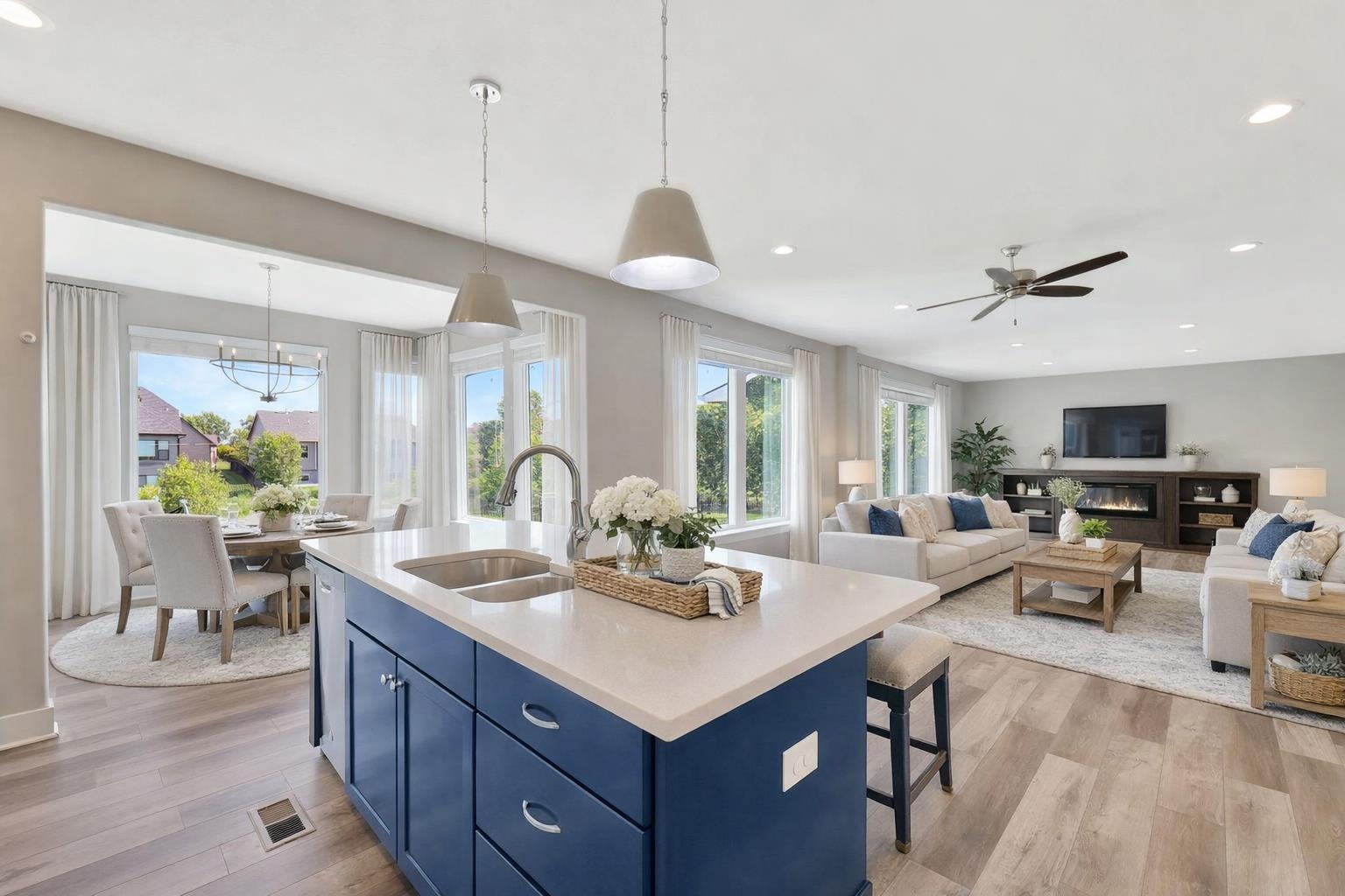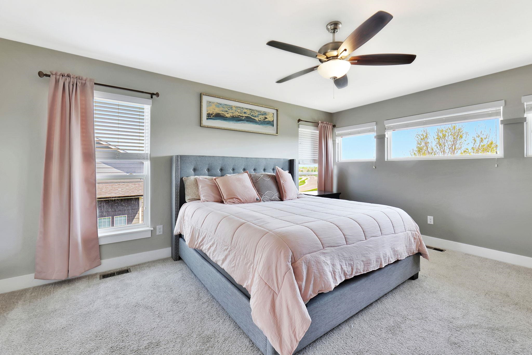 Welcome to this unique two-story home in the beautiful Estancia neighborhood! If you're looking for a newer build with character and a thoughtful layout, this one stands out from the rest. As you step inside, you're greeted by a grand foyer and staircase leading to a spacious upper level featuring a true master suite with double vanities, a large walk-in closet, and a tiled shower, along with two additional bedrooms, a full bath, and a convenient laundry room. The main level boasts a stunning kitchen with quartz countertops, a dining area, and a cozy living room - all offering peaceful views of the pond through large windows. Just a few steps down is a versatile flex room with oversized sliding doors that open to the backyard, perfect for entertaining or relaxing. The finished basement has another family room, bedroom, and full bath. This home has so much space. It goes on and on. Homes like this don't come around often - schedule your private showing today!