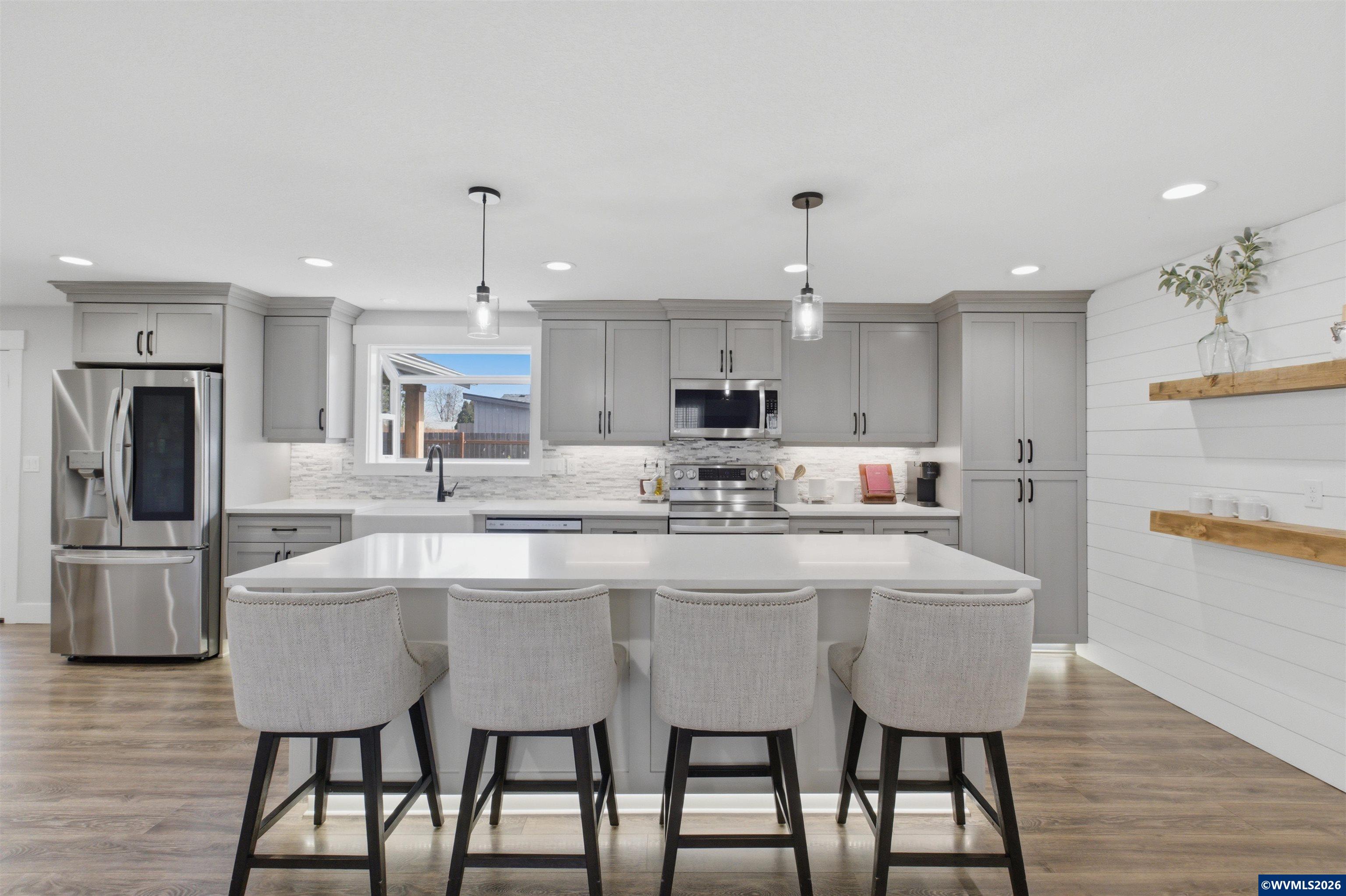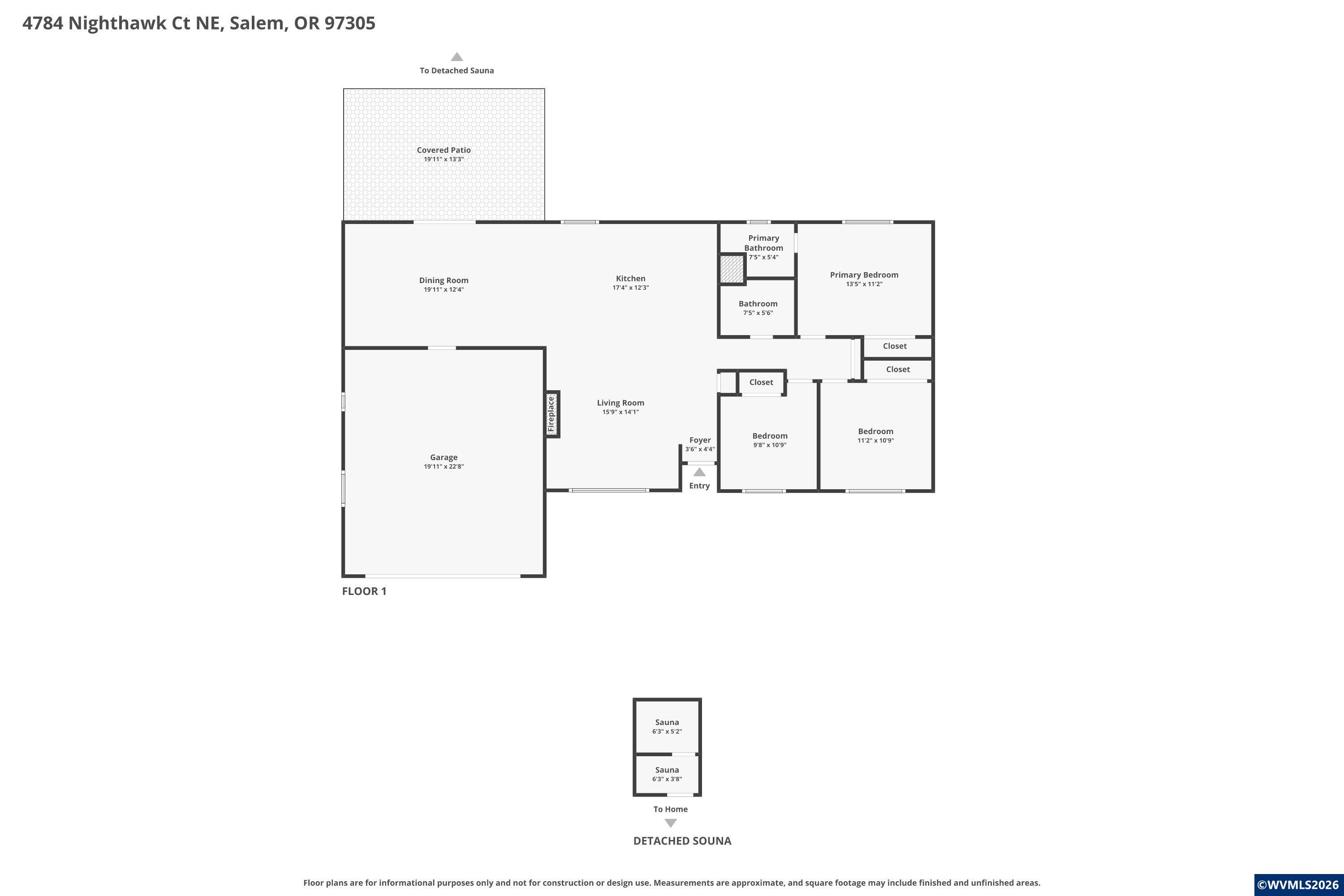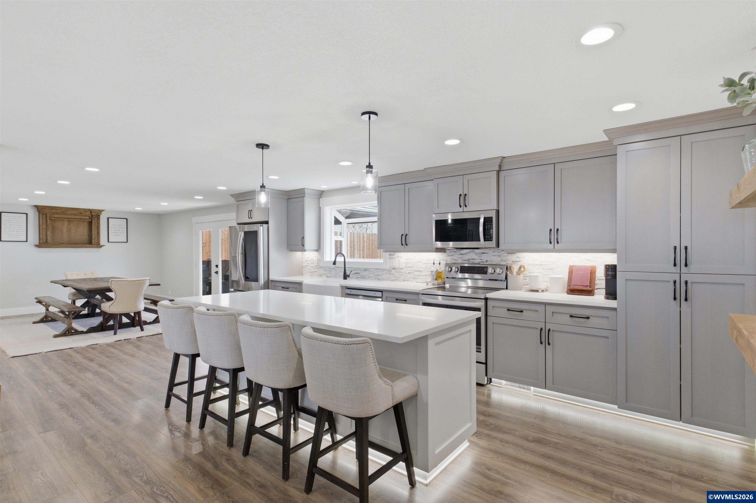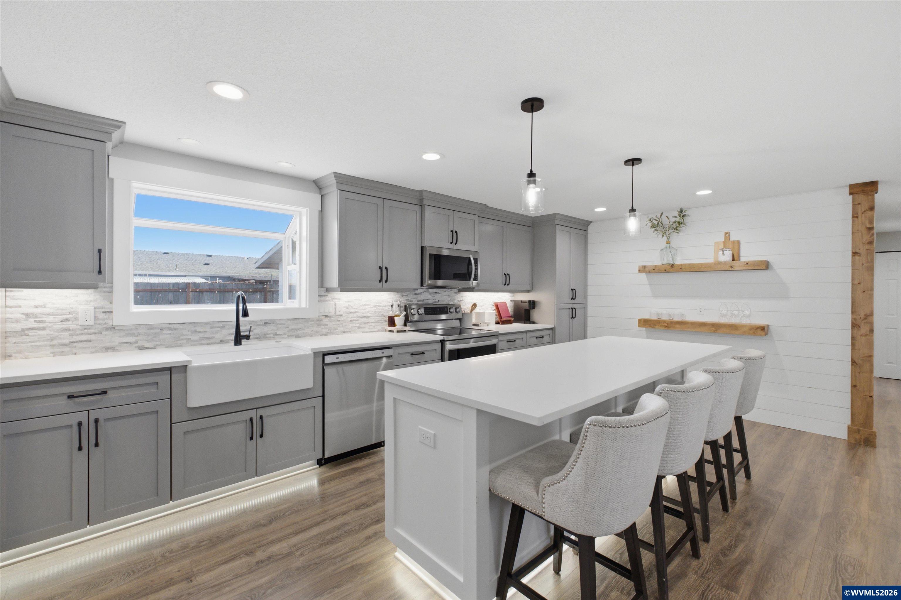 Move in ready and feature rich home in the desirable Jan Ree community of NE Salem, conveniently located near neighborhood parks, local schools, and quick I5 access for easy commuting. Inside, the kitchen is designed for both everyday living and entertaining with a farm style sink, shaker cabinetry, quartz countertops, stone backsplash, under cabinet lighting, and a large island with seating for four. Stainless steel appliances include a glass top range, built in microwave, dishwasher, garbage disposal, and three door refrigerator. A large window above the sink brings in natural light while offering views of the backyard. The living room centers around an electric fireplace with floor to ceiling stone surround and shiplap accents, complemented by a large window that fills the space with light. The dining area features abundant recessed lighting and French doors with expansive glass that open to the backyard. Outdoor living shines with a 13 x 21 covered patio featuring solid beams, tongue and groove detail, and a ceiling fan ideal for relaxing on warm summer evenings. The backyard also includes a dedicated firepit gathering area, raised garden beds, and a 10 x 13 outbuilding with shed space and a unique steam sauna, perfect for unwinding after a long day. The fully fenced backyard also features new side gates and gravel pathway. Recent updates include a new roof (Jan 2026) and new furnace (Nov 2025), adding peace of mind for the next owner. Previous interior and exterior improvements were completed within the last six years. A well appointed property with thoughtful upgrades and outdoor amenities, all in a convenient Northeast Salem location. Do not miss this opportunity to own a move in ready home in the Jan Ree neighborhood.