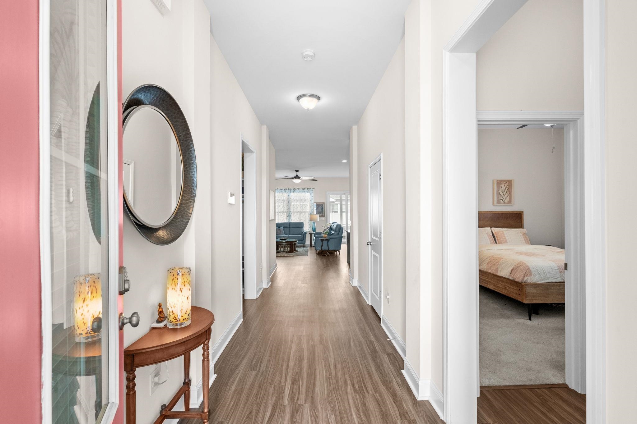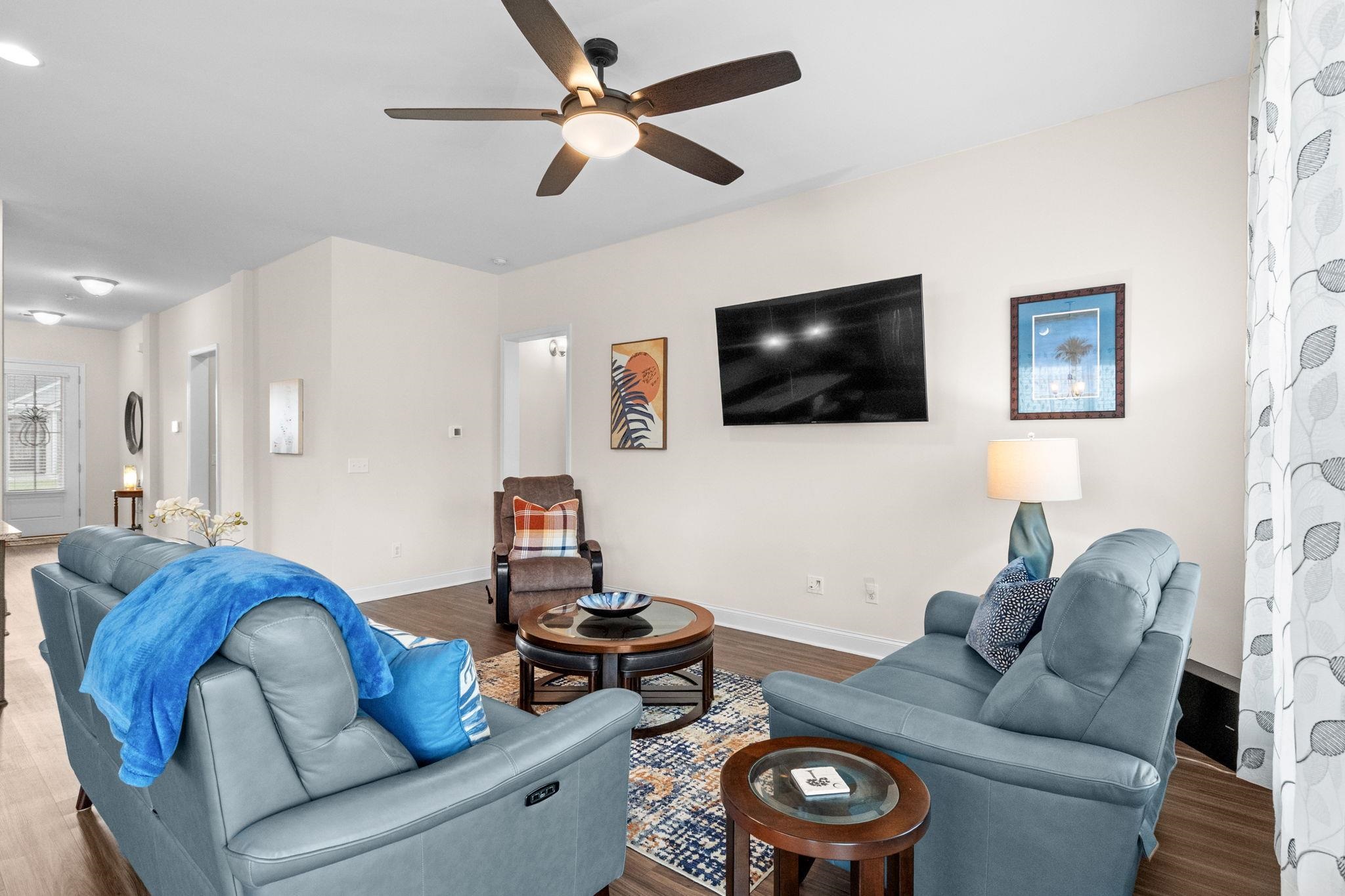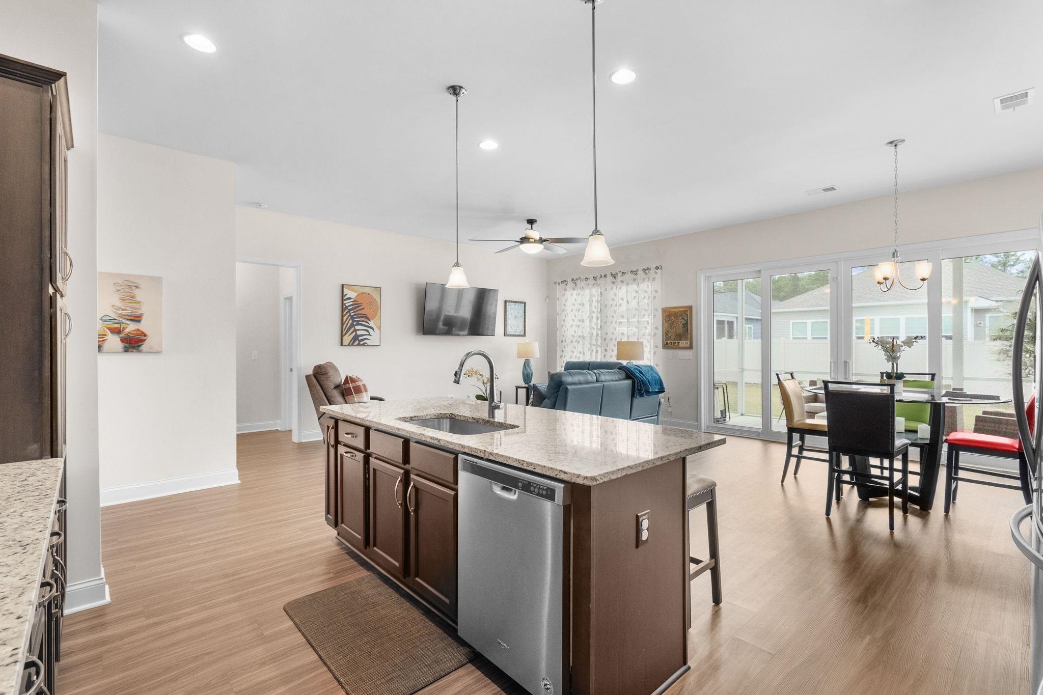 Impeccably maintained and truly turn-key, this 3BR/2BA stunning Austin floor plan by Toll Brothers offers refined coastal living in the highly sought-after Clear Pond community of Carolina Forest. Thoughtfully designed with 10-foot ceilings and luxury vinyl plank flooring throughout the living areas and bedrooms, the home feels both sophisticated and welcoming from the moment you enter. The beautifully appointed kitchen serves as the heart of the home, featuring abundant soft-close cabinetry, pantry storage, a convenient trash drawer, large single-basin stainless steel sink, and an expansive island - perfect for entertaining, casual dining, and everyday living. Designed for effortless indoor-outdoor enjoyment, expansive upgraded two-panel sliding glass doors open to a cozy screened porch, inviting you to relax while overlooking the private backyard. Just beyond, an extended concrete patio with a gas hookup for grilling and space for your own cooking area, creates the perfect setting for gatherings and outdoor dining. The backyard is enhanced with a white vinyl privacy fence, irrigation system, gutters, and freshly installed mulch in front and back yards that adds to the home's inviting curb appeal. The split-bedroom floor plan offers privacy and comfort, with a spacious primary suite retreat featuring a large walk-in wardrobe and an elegant en-suite bath with dual sink vanity and a generously sized shower. Two additional bedrooms, located toward the front of the home, provide comfortable accommodations for guests or family and share a full bath. Additional thoughtful features include a convenient drop zone with cubbies for organization, a large laundry room with Samsung washer and dryer adds extra storage space, and a spacious two-car garage. This natural gas home offers the efficiency and convenience of gas cooking, gas heat, a Rinnai tankless water heater, and a backyard gas line for grilling. Clear Pond is part of the beautiful Carolina Forest master-planned community, ideally located near top-rated schools, shopping, golf, dining, entertainment, and the beaches of Myrtle Beach. Residents enjoy exceptional amenities including a large clubhouse, two outdoor swimming pools, two volleyball courts, a fitness center, two playgrounds, and scenic walking trails around the community's picturesque pond. This beautifully designed home offers the perfect blend of comfort, style, and lifestyle living in one of Myrtle Beach's most desirable communities. Easy to see, make your appt today.