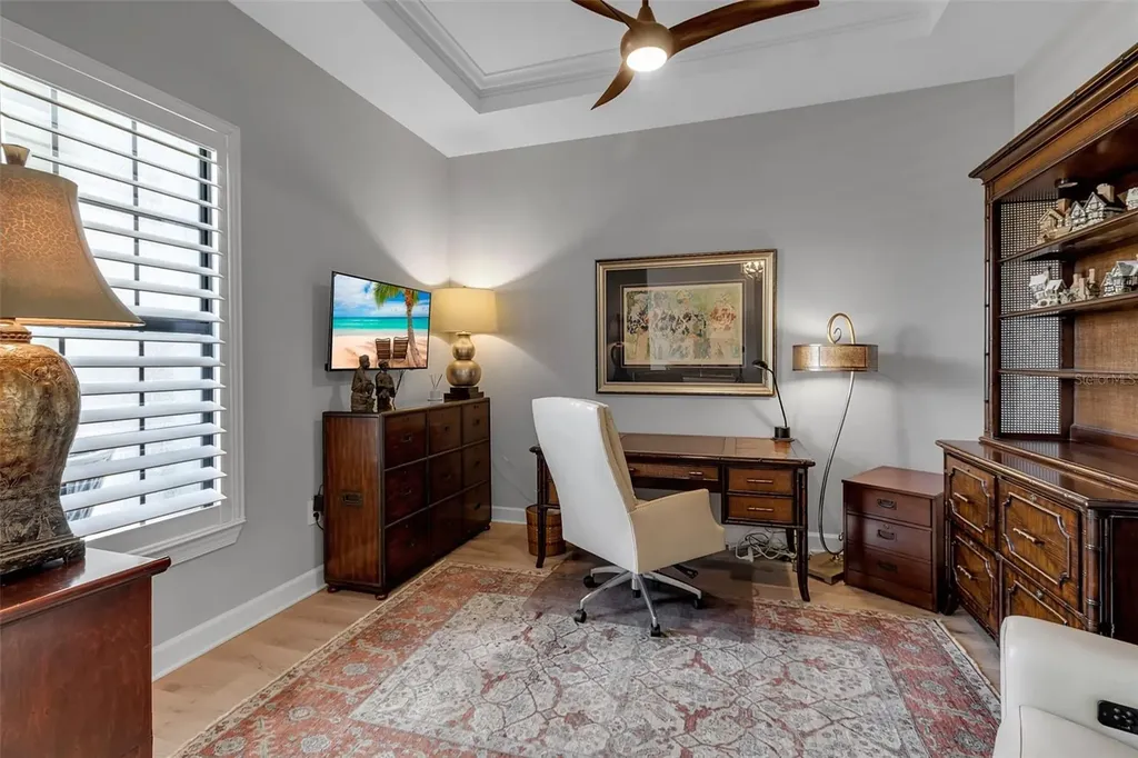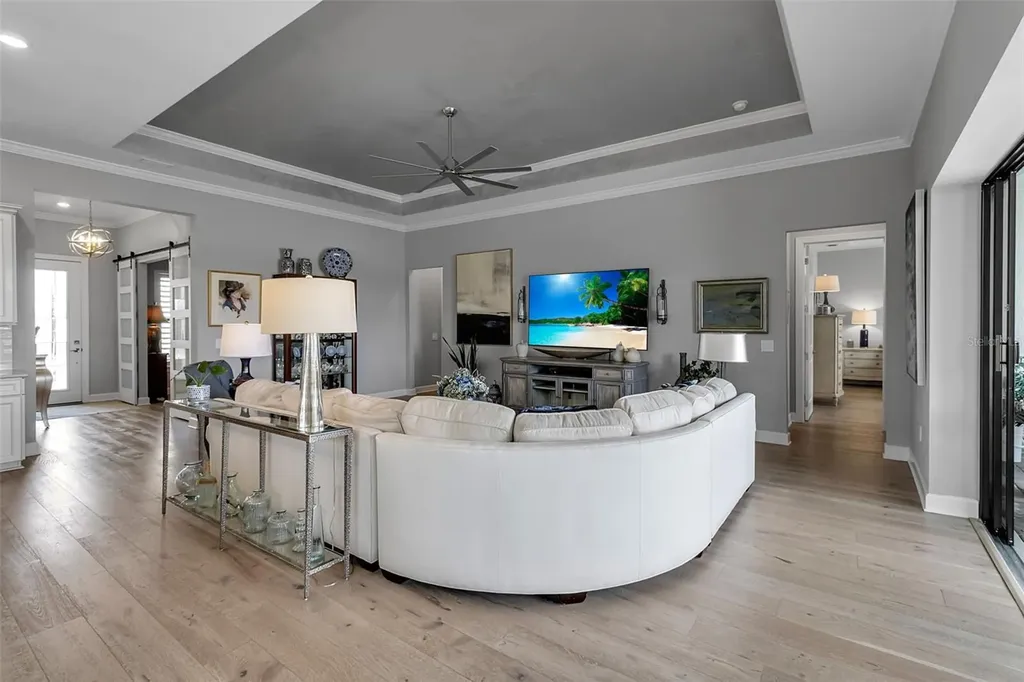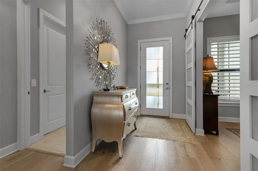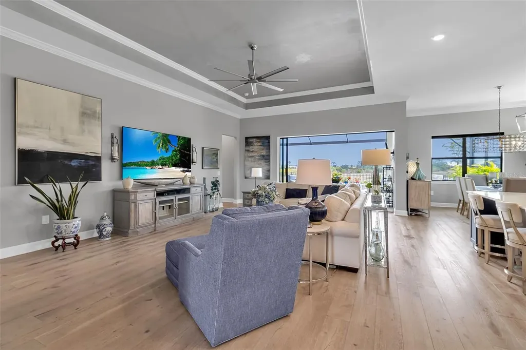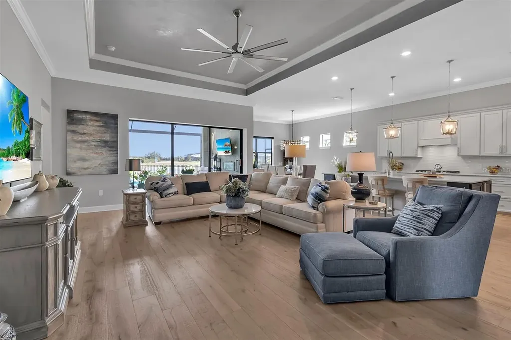 Located in the highly sought-after Talon Preserve on Palmer Ranch, this one-of-a-kind Stellar model offers an exceptional opportunity to own a premium waterfront homesite with serene water views both in the front and rear of the property - a rare and coveted setting. Ideally positioned just a short walk to the clubhouse, this home combines luxury, convenience, and true resort-style living. Featuring over $200,000 in upgrades, every detail has been thoughtfully curated, including a 3-car garage with epoxy floors, engineered hardwood flooring, upgraded tile, crown and trim molding, tall tray ceilings, custom cabinetry, upgraded countertops, designer plumbing fixtures, and premium appliances. The chef's kitchen is a standout with a natural gas stovetop, perfect for cooking enthusiasts. Pocket sliding glass doors open seamlessly to a custom oversized heated pool with a premium panoramic pool enclosure, creating an uninterrupted open water view and effortless indoor-outdoor living. The fenced yard, updated landscaping, utility sink in the laundry room, tankless water heater, and whole-home gas Generac generator add both comfort and peace of mind. Residents of Talon Preserve enjoy an unmatched lifestyle with resort-style amenities including a clubhouse, restaurant bar and grill, pool with splash pad, pickleball and tennis courts, fitness center, game room, playground, and dog park.