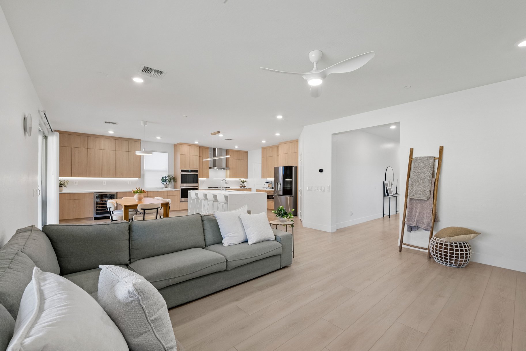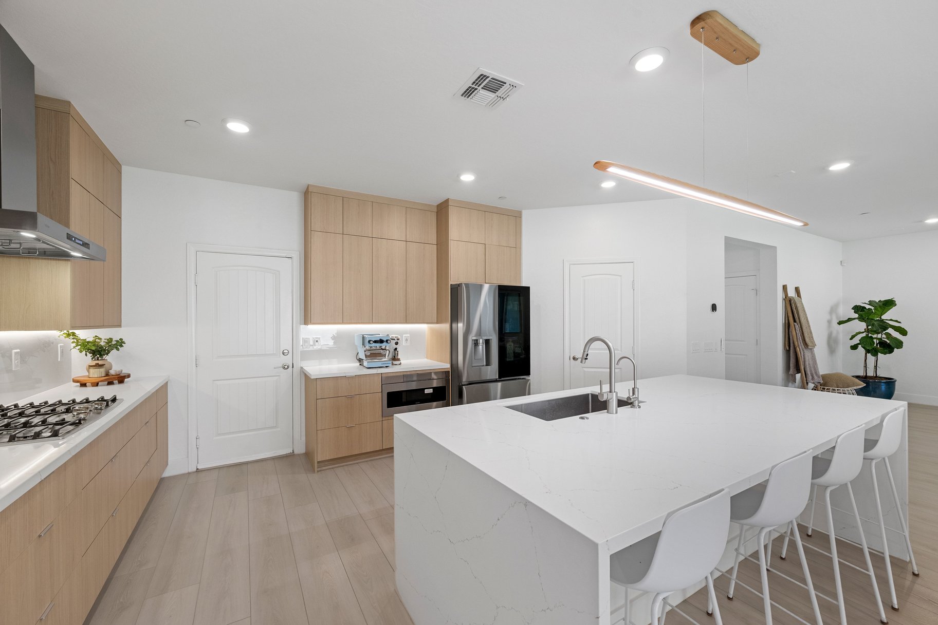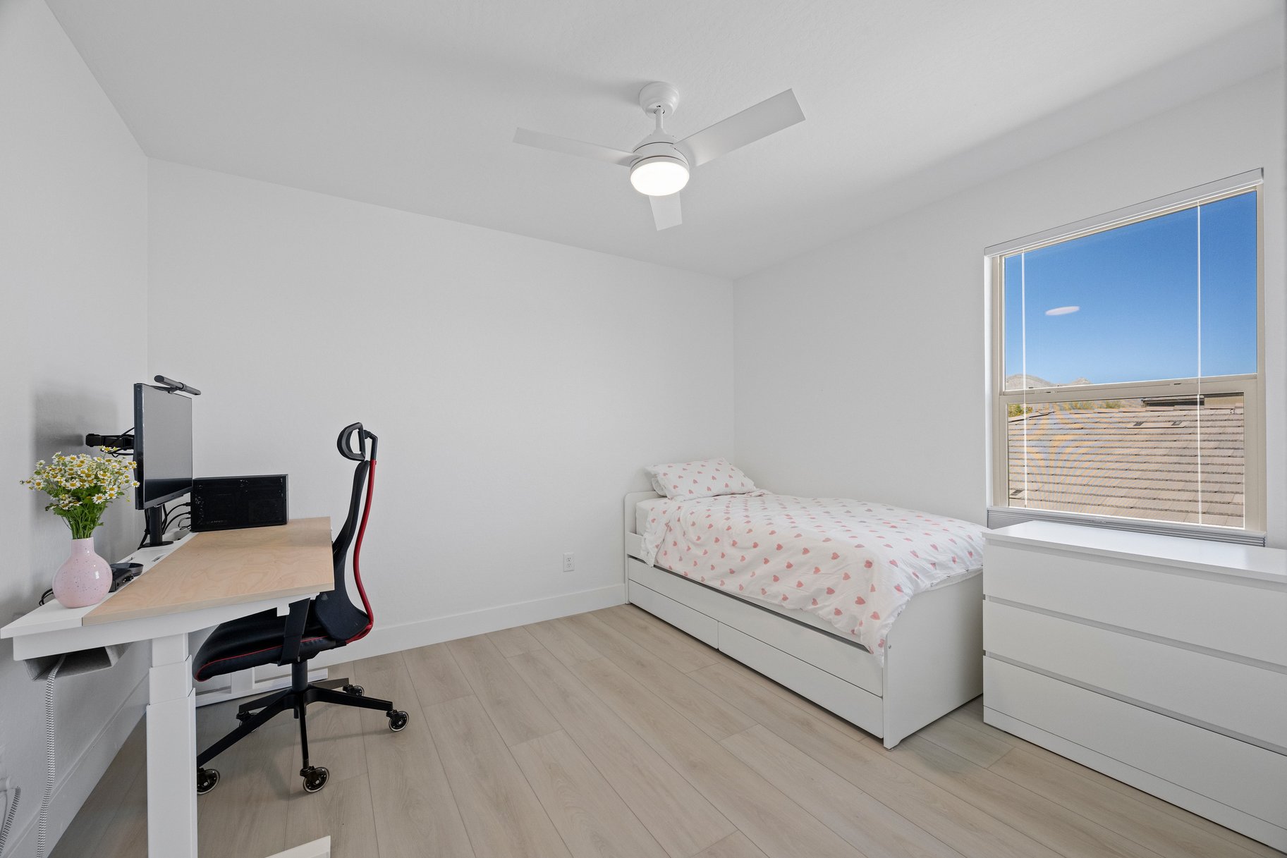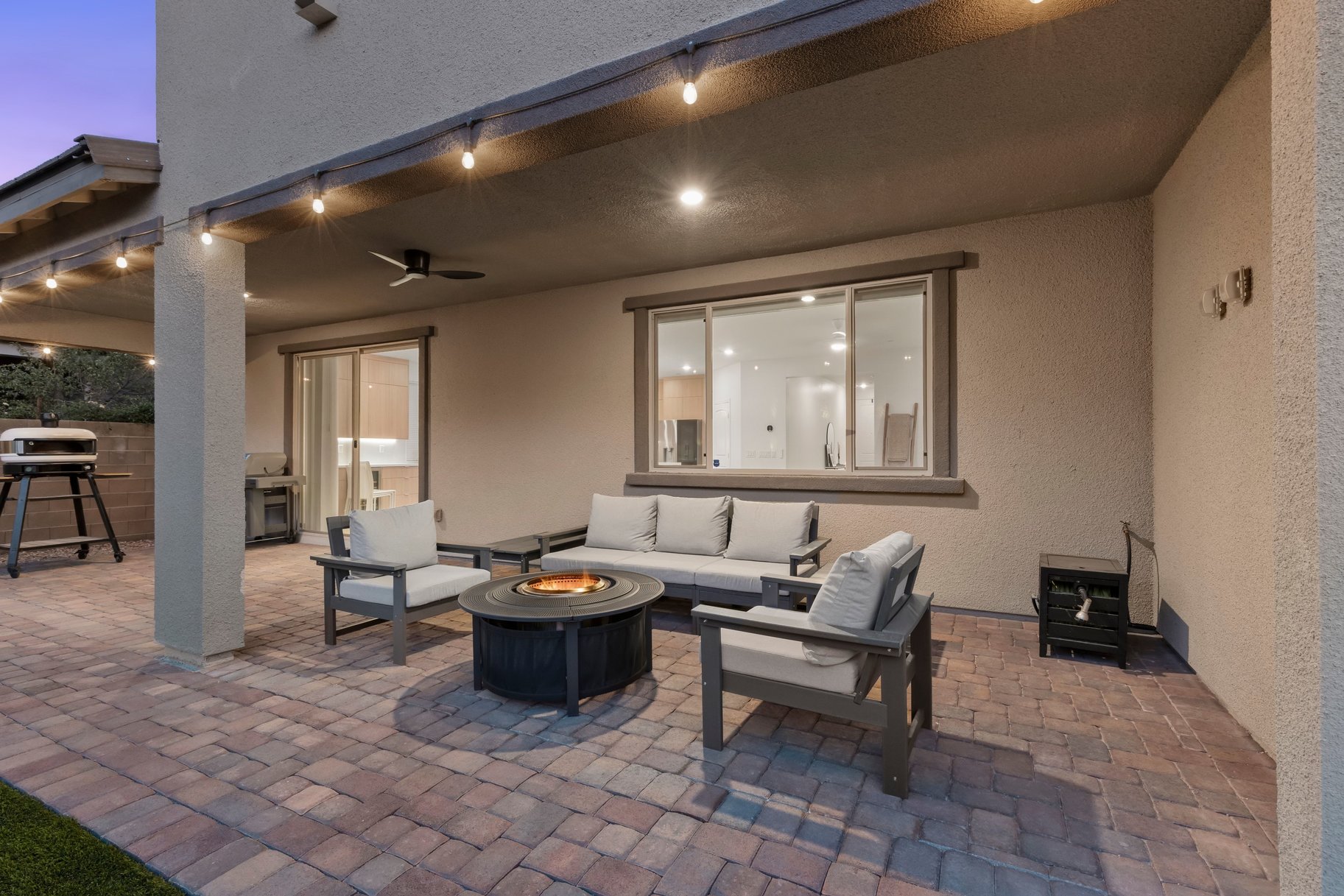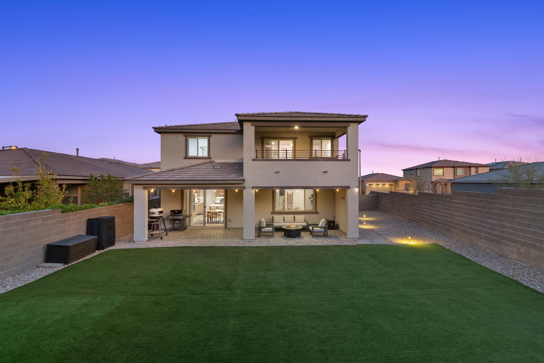 Located in a highly desirable gated community in Summerlin West, this beautifully upgraded two-story home offers 5 bedrooms, 3 baths, a spacious loft, and 2,685 sq ft of thoughtfully designed living space. Over $100K in upgrades elevate the home, including a fully renovated modern kitchen featuring sleek quartz countertops, a striking waterfall-edge island, an oversized 33-inch sink, wine fridge, and elegant designer lighting. The interior is further enhanced with 9-inch luxury vinyl plank flooring and custom blinds throughout. The oversized homesite is adjacent to an easement for extra privacy. Exterior upgrades include extended driveway finished with upgraded pavers, the backyard with Italian cypress trees and cacti. Enjoy breathtaking mountain views from the private backyard and the serene balcony off the primary suite, perfect for morning coffee or sunset relaxation. Ideally located within walking distance to Doral Academy Red Rock and just minutes away from Downtown Summerlin.