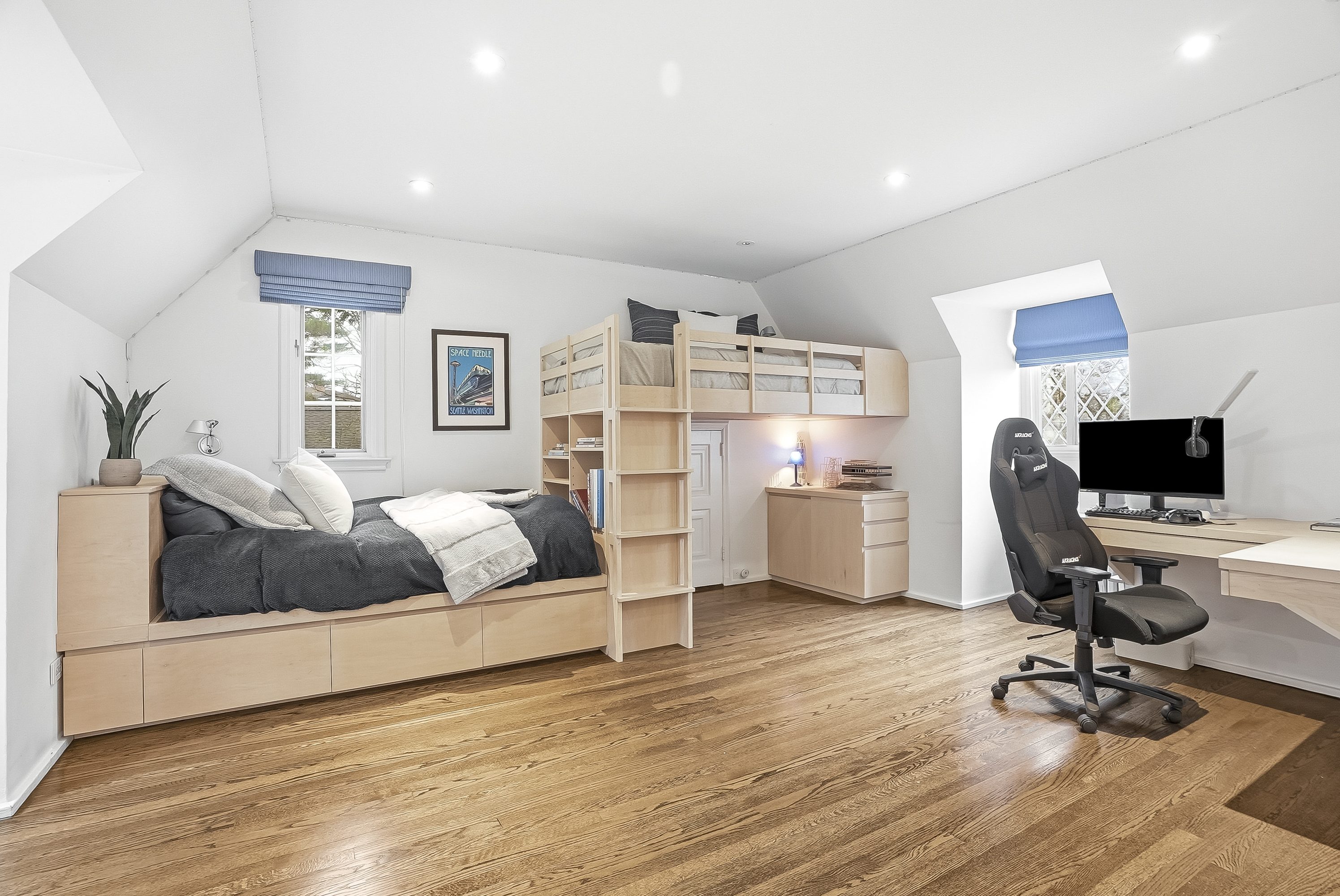 A desirable first-floor bedroom with an en-suite bath offers flexibility for guests, extended family, or a private office. Upstairs, the primary bedroom suite features a walk-in closet, while two additional bedrooms each include charming hideaway rooms and share a hall bath.