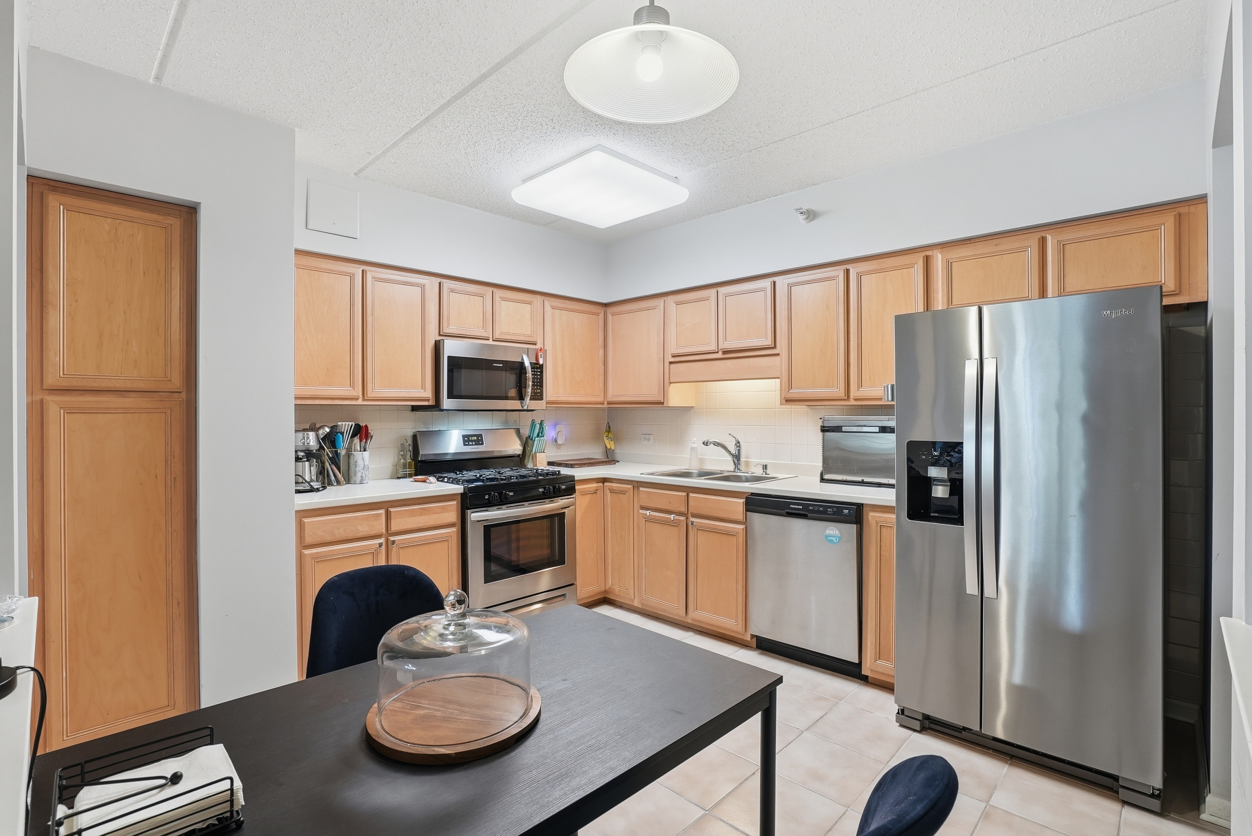 Welcome to this updated 2-bedroom, 2-bathroom condo in the desirable Madison Place community. The bright eat-in kitchen features stainless steel appliances, along with generous cabinet and counter space. The open living/dining area showcases wood laminate flooring and sliding glass doors that lead to a private balcony with serene treetop views-perfect for relaxing or entertaining. Large windows provide abundant natural light in both bedrooms. The spacious primary suite includes a walk-in closet and a private ensuite bathroom with a shower. Additional highlights include: In-unit washer/dryer, Indoor heated garage parking space (#43) and Secure storage unit. Tastefully updated lobby and mailroom, Pet-friendly elevator building. Monthly assessment covers heat, water, cable, and exterior maintenance. Ideally located in downtown Skokie with easy access to the train, buses, schools, parks, dining, cafes, shopping, entertainment, Skokie Public Library, Village hall and post office. Rentals are allowed with cap, making this a great opportunity for homeowners and investors alike.
