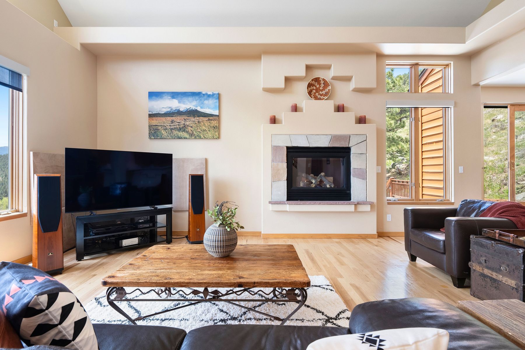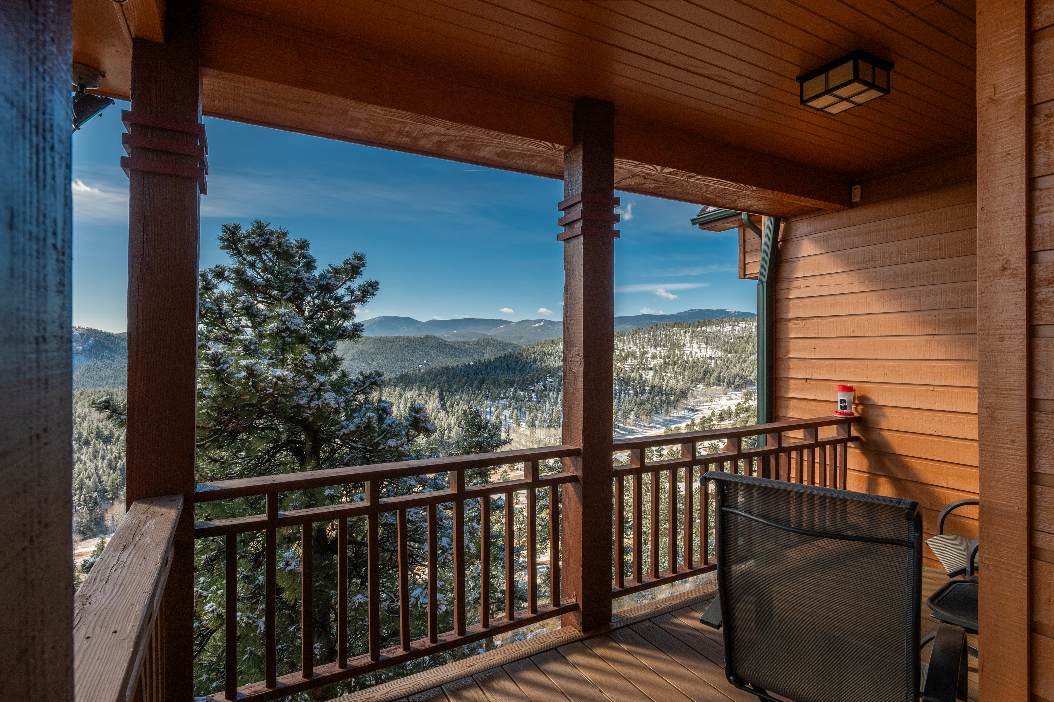 Experience the Colorado dream in this extraordinary home offering panoramic 180° views from snowcapped Mt. Blue Sky to Denver city lights. Situated on 11 acres of pristine mountain land, this property combines serenity and natural beauty with convenient access to Evergreen amenities. The newly updated Elk Meadow Park trailhead is just two minutes away, Bergen Park—with its parks, schools, and retail—is five minutes up the road, and both I-70 and downtown Evergreen are reachable in less than ten minutes.Step inside to a contemporary open design featuring light hickory hardwood flooring and a great room with dramatic floor-to-ceiling windows overlooking rolling hills of pine and aspen. The great room flows into a welcoming dining area with a perfectly framed vista of Mt. Blue Sky. A massive deck extends the living space outdoors, creating an ideal setting for gatherings both formal and informal. The kitchen continues the casually elegant aesthetic with quartz countertops, subway tile backsplash, and warm hickory cabinetry, while a classic walk-in pantry and convenient main-floor laundry add everyday practicality.Upstairs, an airy loft with built-in bookshelves, desktop, and reading nooks provides flexible family space. The spacious primary suite showcases vaulted ceilings, breathtaking Mt. Blue Sky views, and a newly updated bathroom. Two additional bedrooms and a full bath complete the upper level.The walkout lower level offers a family activity room with forested views and new luxury vinyl flooring, along with a fourth bedroom and full bath that create an ideal semi-private guest or multigenerational living area. A spacious dedicated gym and large unfinished storage area add versatility.This meticulously maintained one-owner home was updated in 2024–2025 including a new Class 4 impact-resistant roof, exterior repainting, high-speed satellite internet, and the oversized three-car garage was equipped with a 220v outlet for EV charging.