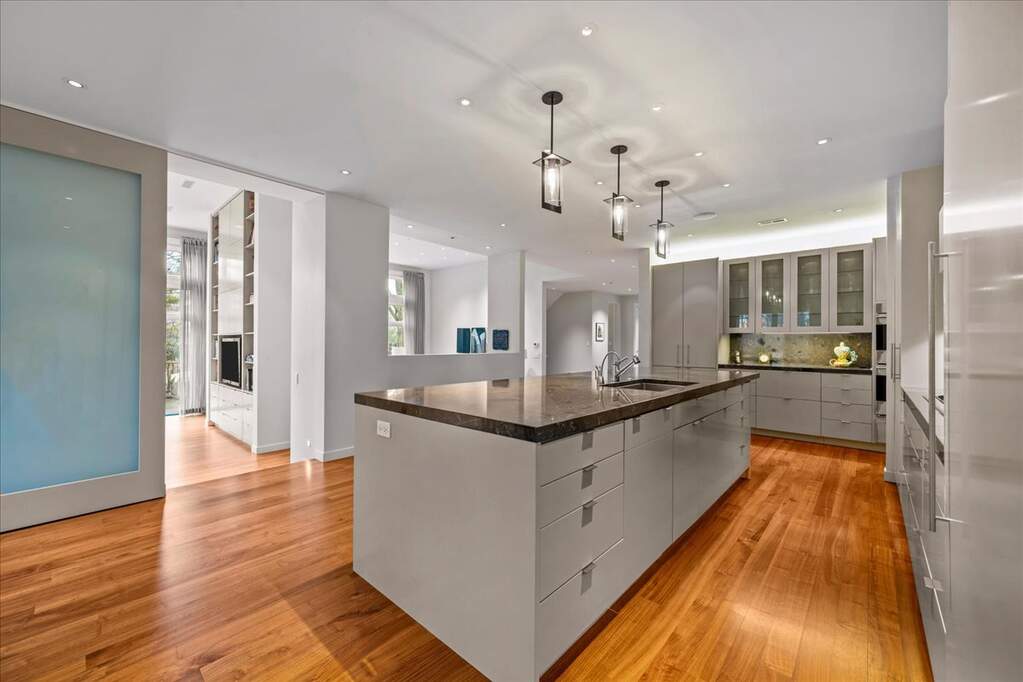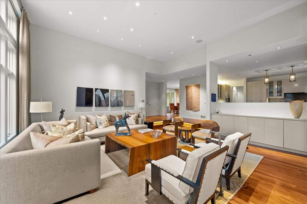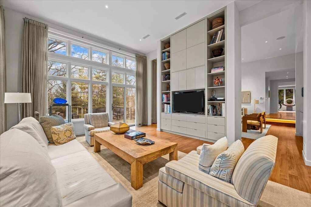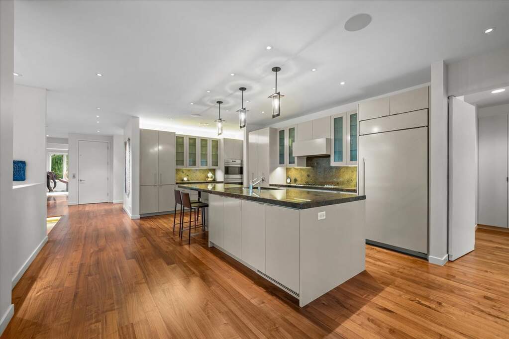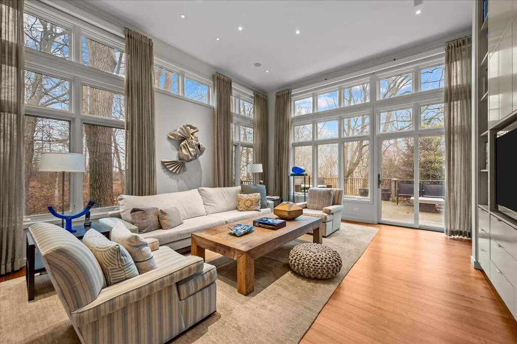This sophisticated contemporary home, located on a private street with stunning wooded views and seasonal lake views, offers the ultimate in understated luxury. Featuring 5 bedrooms, 5 full baths and 3 half baths, this home is appointed with high-end finishes throughout and an open floor plan ideal for entertaining. Designed by art enthusiasts and completely rehabbed down to the studs in 2010, the home showcases thoughtful design elements including an elevator, hardwood floors, custom millwork, soaring ceilings and expansive windows. The first level welcomes you with a large sun-filled foyer that opens to the formal dining room. A dramatic sunken living room with volume ceilings and a wall of windows creates a tranquil and inviting setting. The expansive chef's kitchen features integrated custom-painted wood slab cabinetry, soapstone countertops and backsplash, professional stainless-steel appliances, a spacious island and an eat-in area. The kitchen flows seamlessly into the family room with custom floor-to-ceiling built-ins and sliding doors that open to an Ipe wood deck overlooking the wooded setting and seasonal lake views. A separate caterer's kitchen leads to the mudroom with a half bath, access to a side grilling porch and entry to the heated and air-conditioned three-car garage. A formal powder room for guests completes the main level. The second level features a tranquil primary suite with a sitting room and built-ins, a large bedroom with tray ceiling and custom walk-in closets. Two luxurious primary bathrooms include custom slab cabinetry, heated natural stone floors, natural stone counters, an oversized soaking tub and spacious showers. Three additional bedrooms complete this level - one with an en-suite bath and two that share a Jack-and-Jill bath - along with a convenient second-floor laundry room. The lower level includes a home gym with steam shower, half bath, second laundry room and ample storage. A private guest suite offers a fifth bedroom, kitchenette, full bath and walk-in closet. Lush professionally landscaped front and side yards surround this meticulously maintained contemporary masterpiece, ideally located in prime east Highland Park within walking distance to town and the lake.