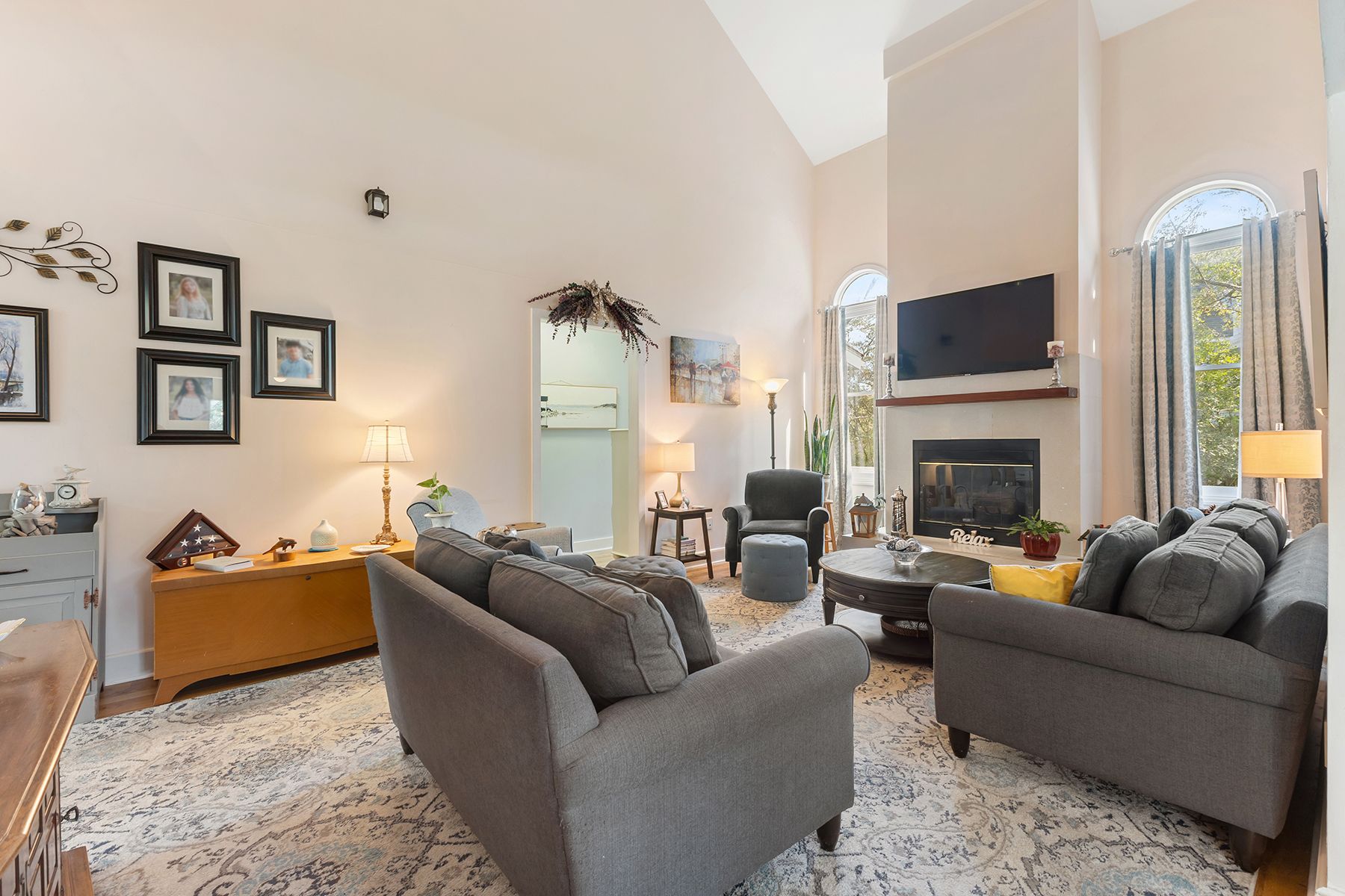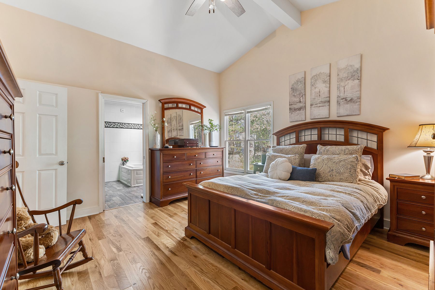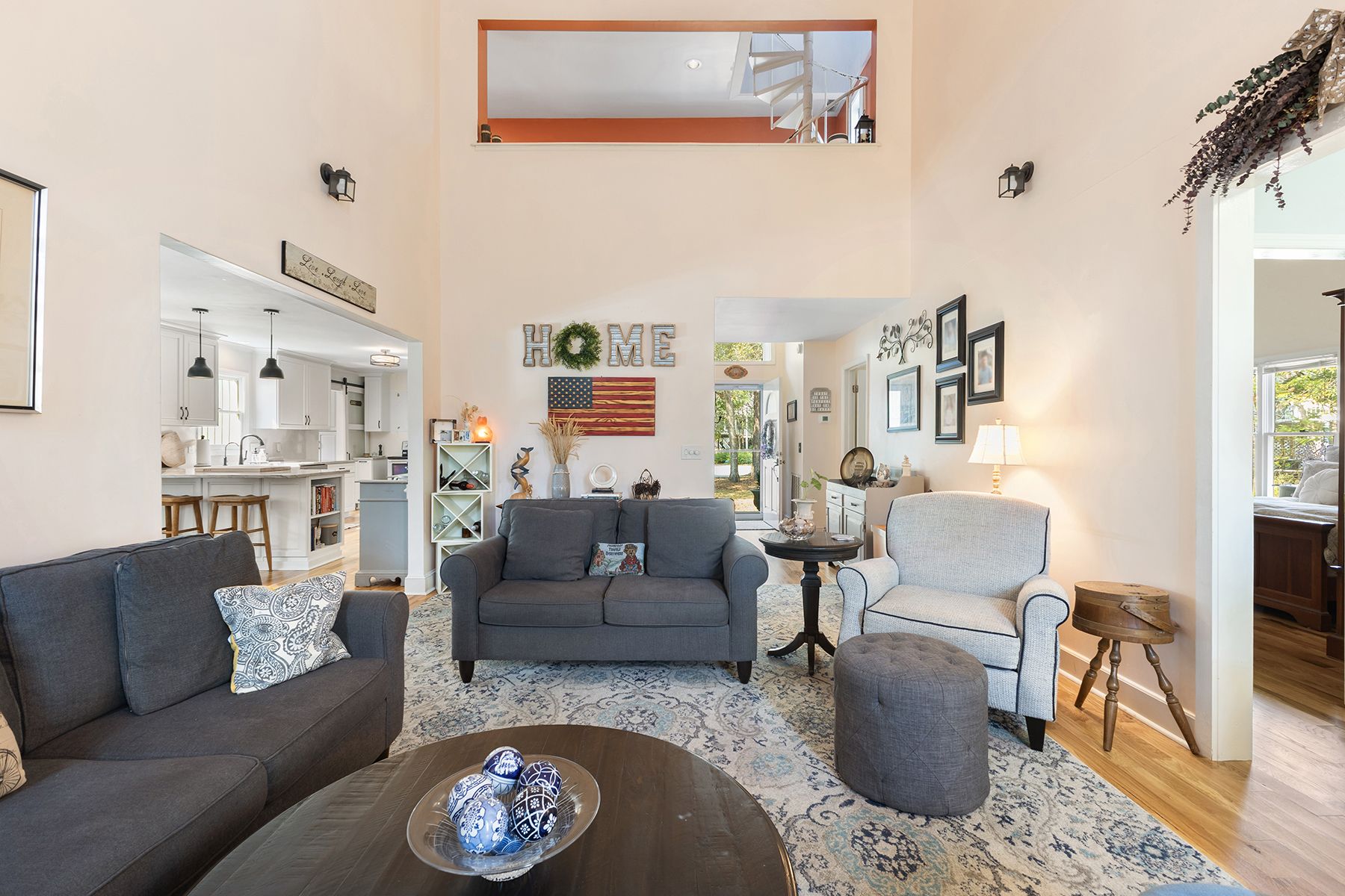 Inside, the 4 bedroom, 3.5 bath home features a bright, welcoming layout with abundant natural light. The main level offers high ceilings throughout, with soaring ceilings in the living room that create an open and spacious feel. The primary suite is conveniently located on the first floor with space for dual walk-in closets. New white oak hardwood floors on the main level add warmth and character while complementing the home's coastal design. Pocket doors and thoughtful architectural details add flexibility and charm throughout.